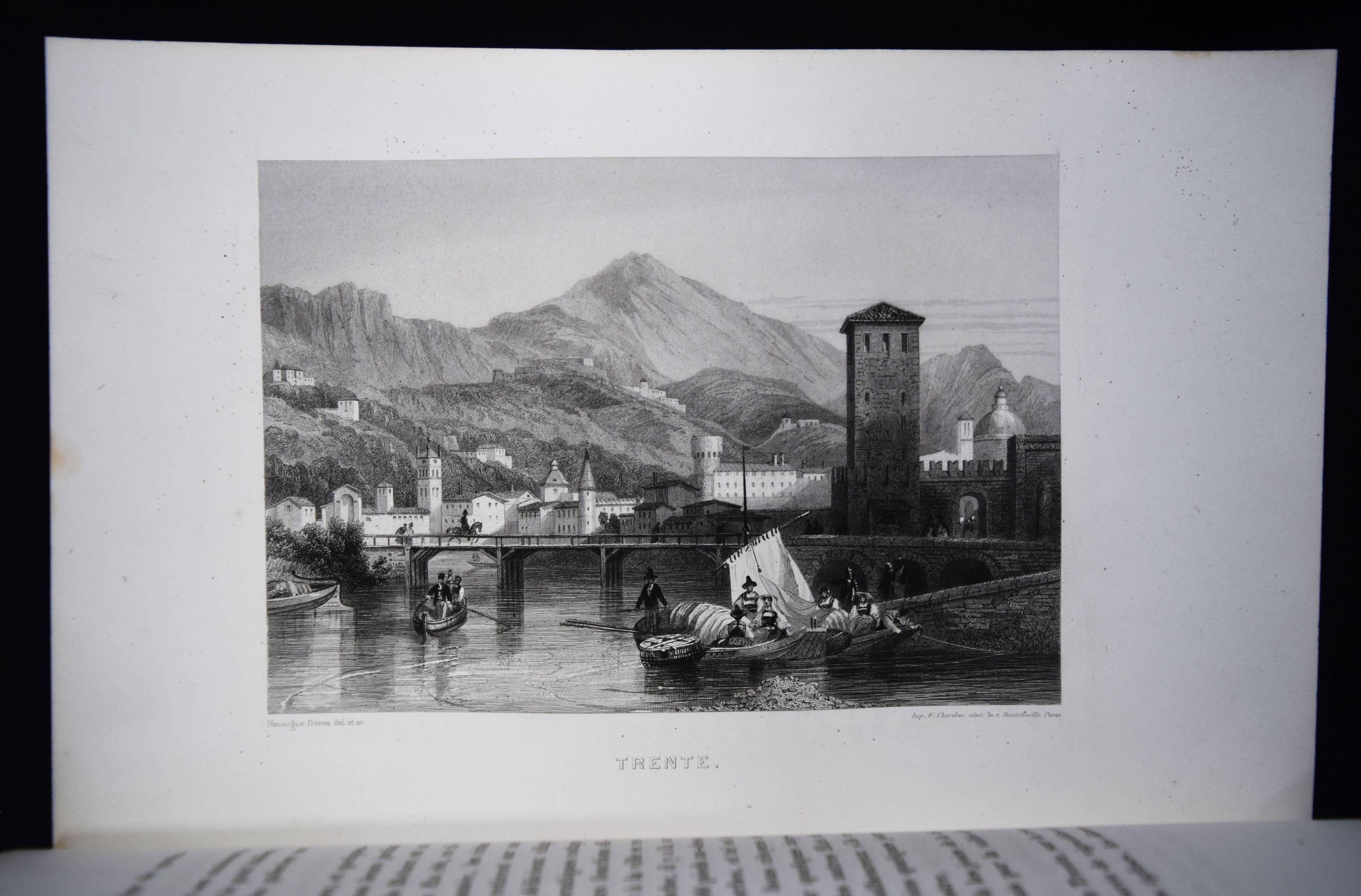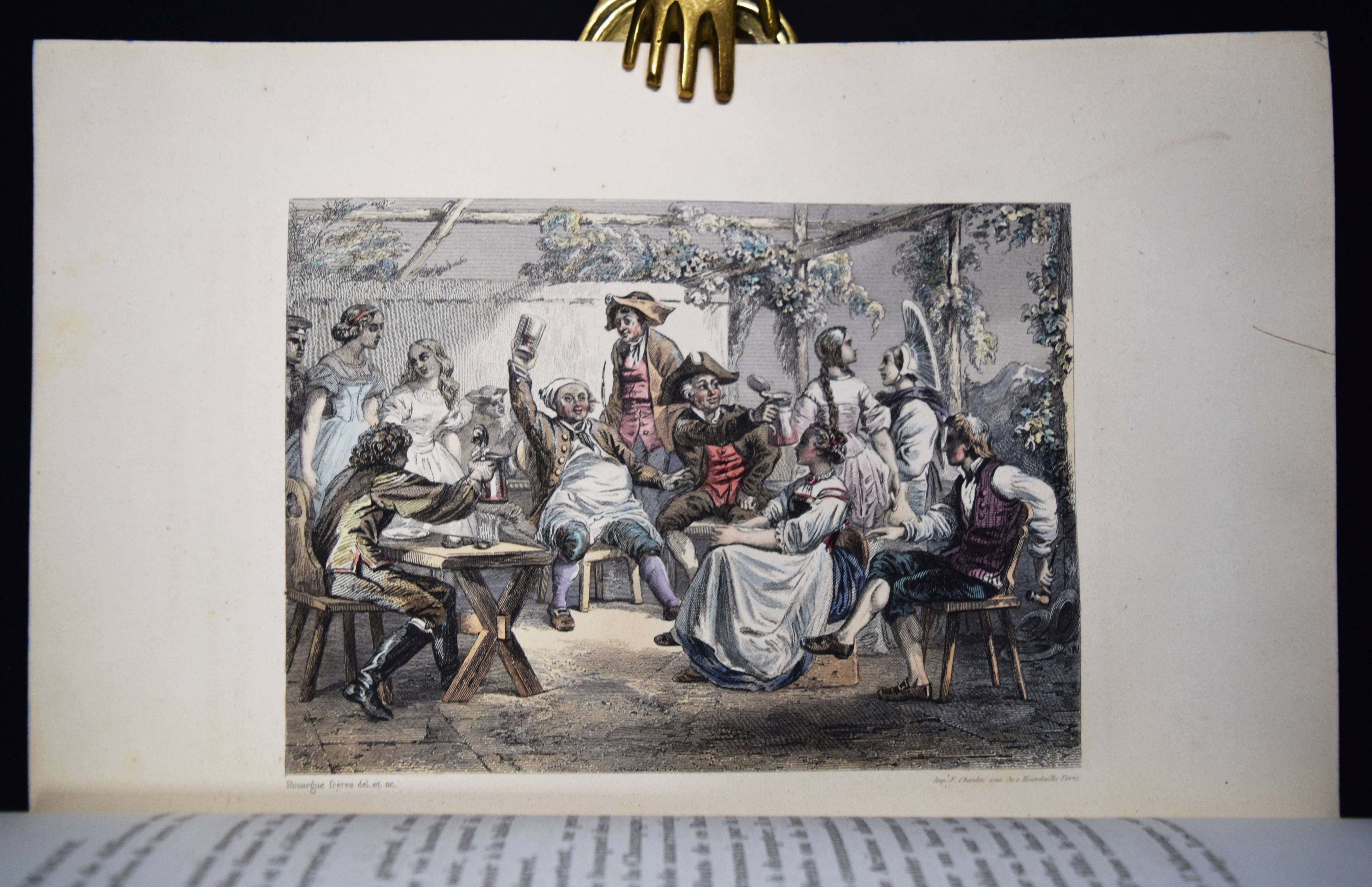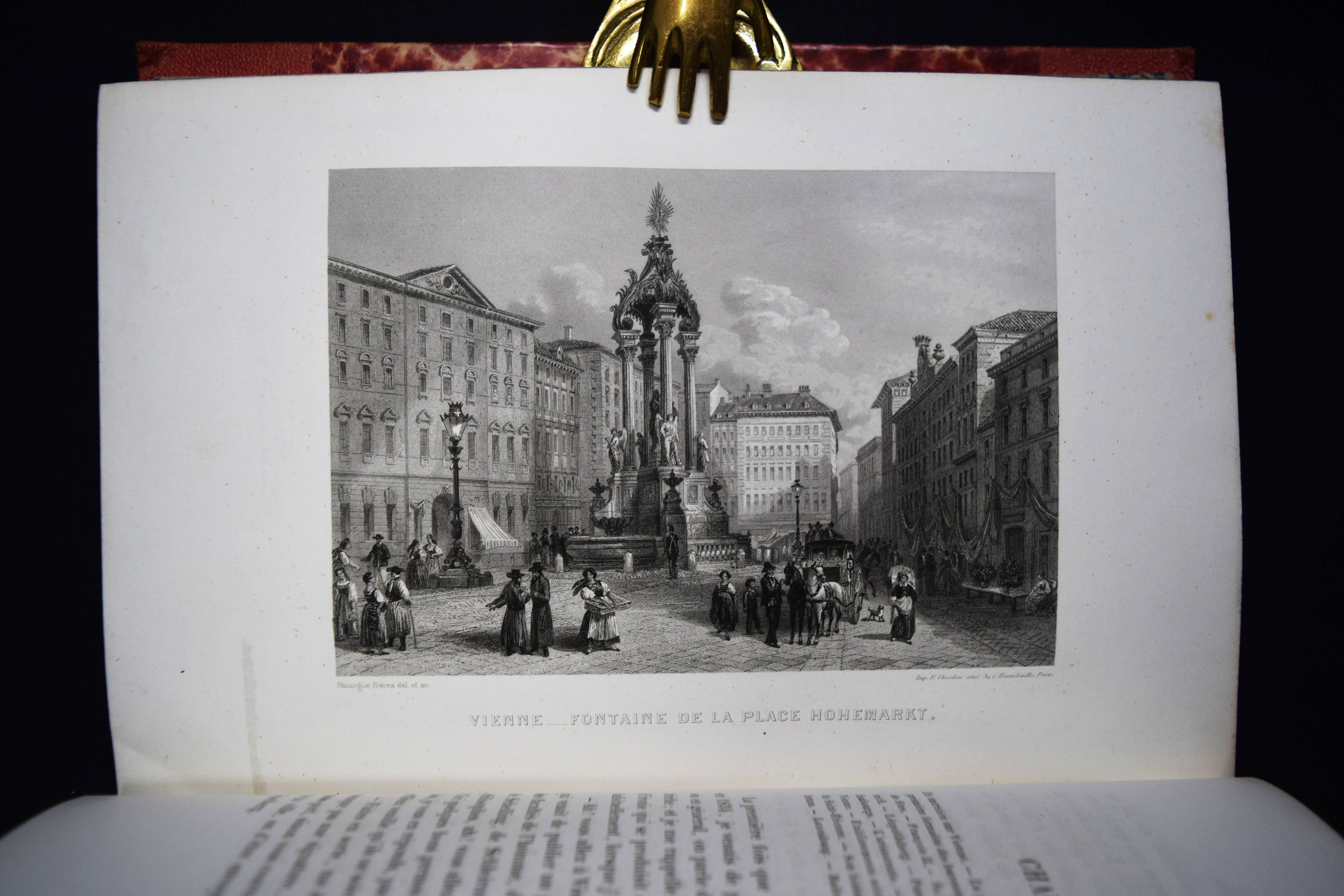 | Marmier, Xavier. Voyage pittoresque en Allemagne. Partie meridionale. – Partie septentrionale. 2 Bände. Paris, Morizot 1859-1860. 4° (26,5 x 16,7 cm.). [2] Bl., 504 SS.; [2] Bl., 516 S. mit 37 Stahlstichtafeln mit Ansichten (20 u. 17) und 7 Holzstichtafeln (4 u. 3, davon 6 kolor.) mit Trachtendarstellungen. Weinrote Orig.-Halb-Maroquinbände mit goldgepr. Rückentiteln, dekorativer Rückenvergoldung und marmoriertem Schnitt. Adams 137 und 138. Vicaire V, 536. – Erste Ausgabe. – Mit Ansichten von Augsburg, Berlin, Breslau, Frankfurt/M, Innsbruck, Karlsruhe, Koblenz, Köln, Lübeck, München, Prag, Salzburg, Ulm, Wien, Würzburg usw. – Der französische Germanist X. Marmier (1808-1892) besuchte bei seiner Deutschlandreise (1832-1835) u. a. Tieck, Schwab, Uhland, Chamisso, Holtei und die Brüder Grimm. „Durch zahlreiche Artikel, mehrere Bücher und durch Übersetzungen der Klassiker wies er sich als bester französischer Kenner des damaligen Deutschland aus und als eine Art Nachfolger der Madame de Stael. Wenn er nicht reiste, hielt er sich meist in Leipzig auf, deren Universität ihm 1839 einen Ehrendoktor verlieh“ (Wikipedia). – Nur vereinzelt leicht braunfleckig, schönes sauberes Exemplar in den dekorativen Verlagseinbänden.
