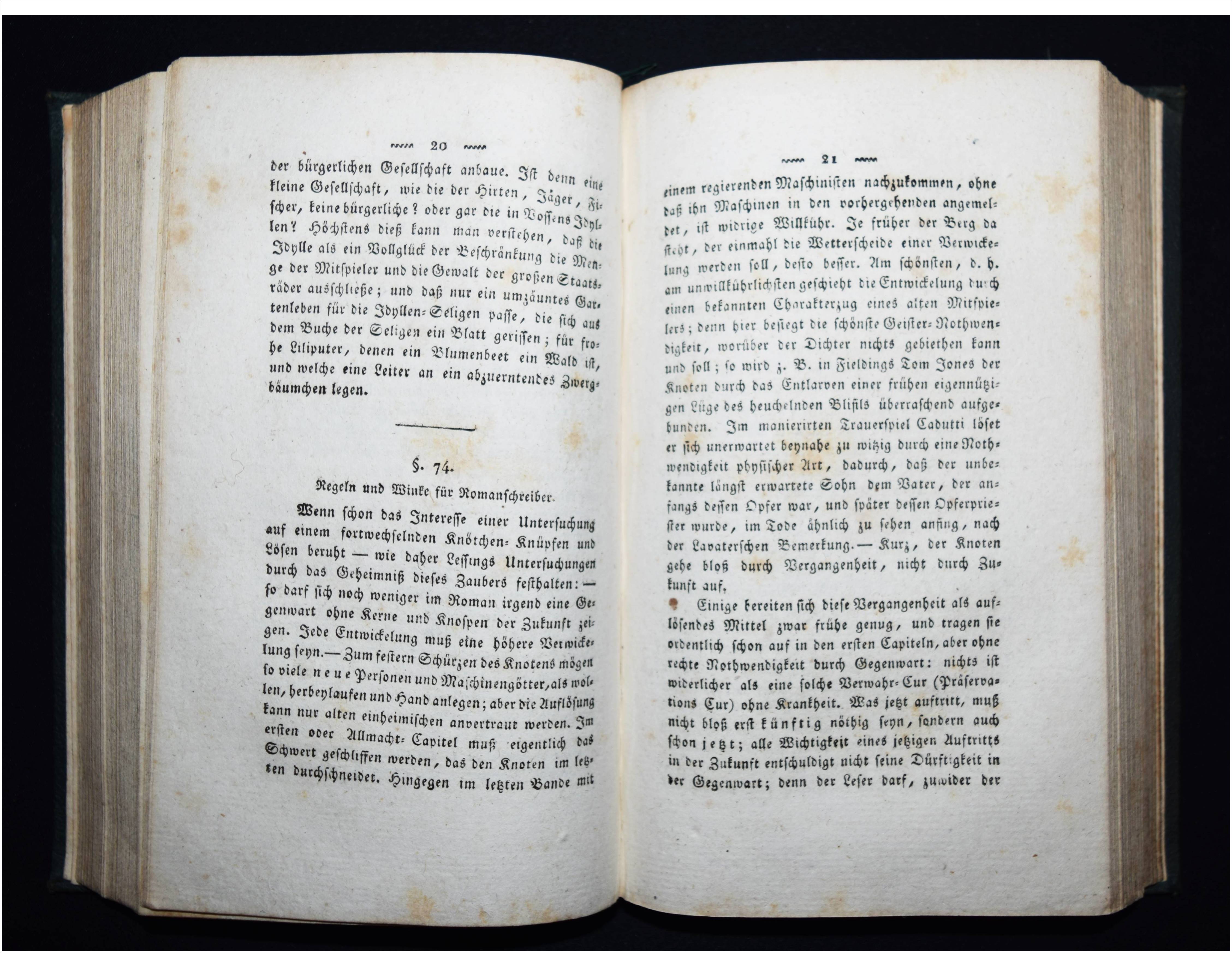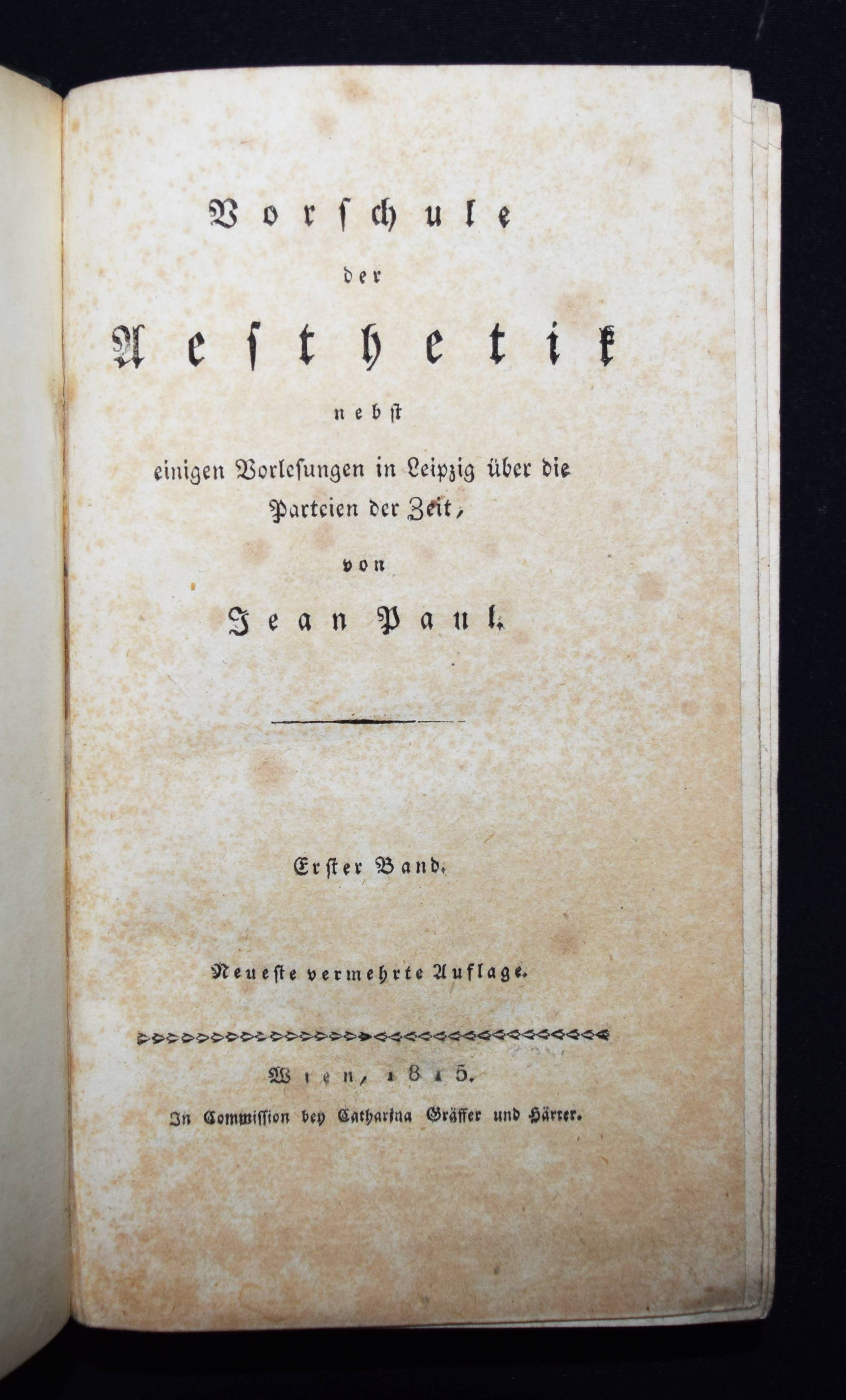 Jean Paul (d. i. Johann Paul Friedrich Richter). Vorschule der Aesthetik. Nebst einigen Vorlesungen in Leipzig über die Parteien der Zeit. Neueste vermehrte Auflage. 2 Bände in 1. Wien, Gräffer & Härter 1815. 8°. XXXII, 318 S.; 2 Bl., 299 S. Ln. d. Zt. mit goldgepr. Rückentitel u. Romantikerverg. Vgl. Berend 18 b. u. Goed. V, 465, 18. – Wiener Nachdruck der erweiterten zweiten Auflage des zuerst 1804 erschienenen Werkes. – Einband etwas berieben, Rücken fleckig, stellenweise etwas stockfl., gutes Exemplar.