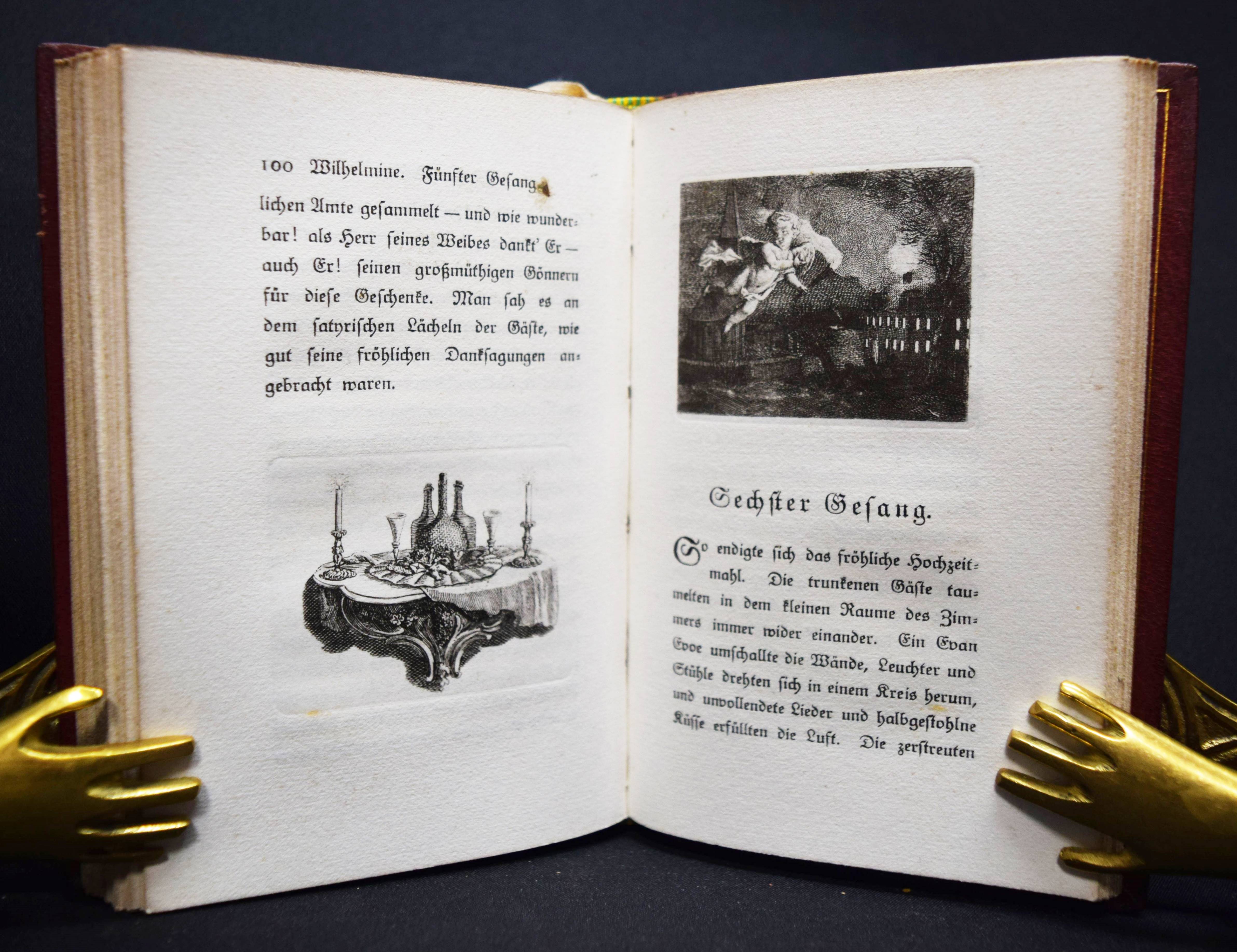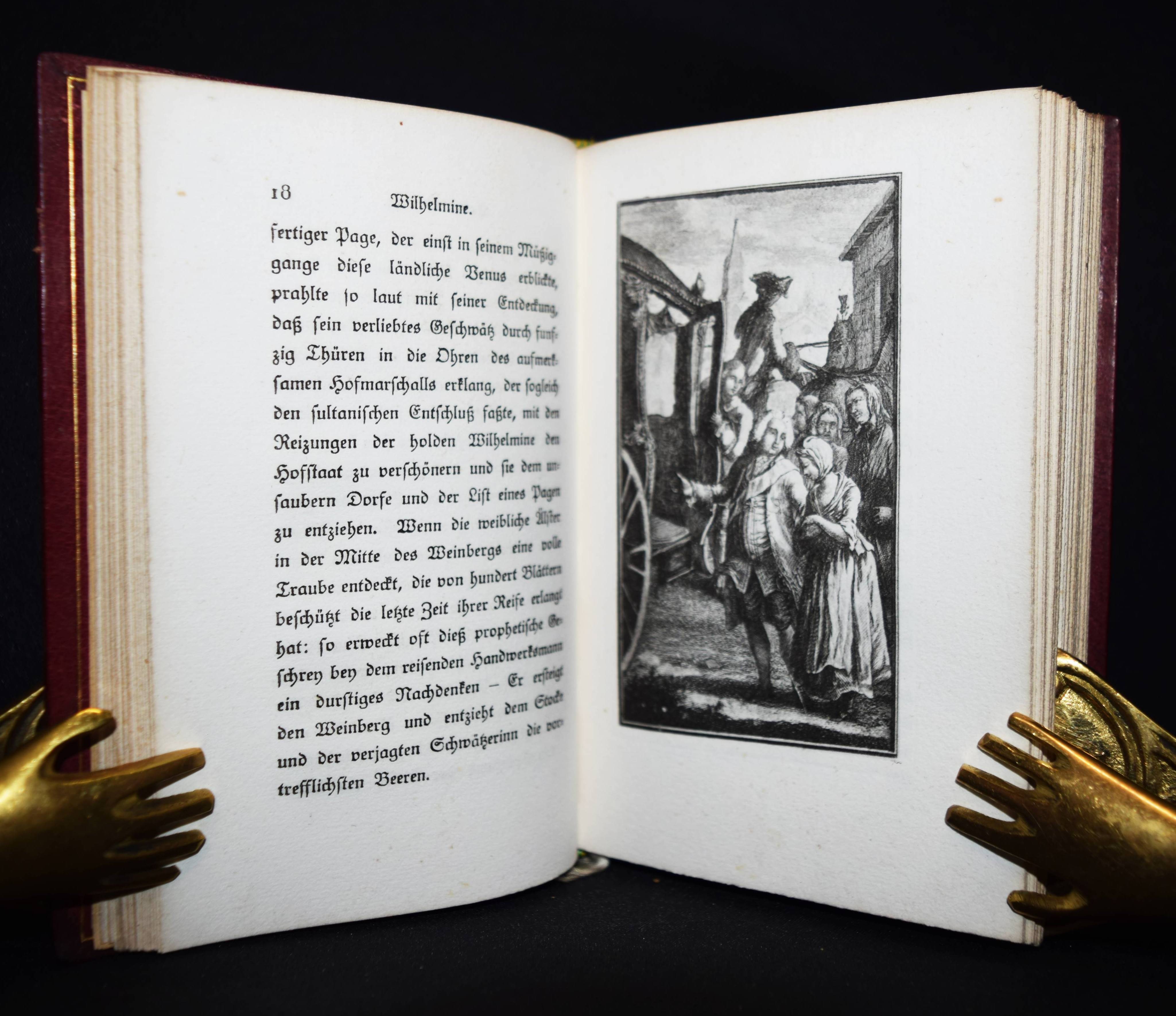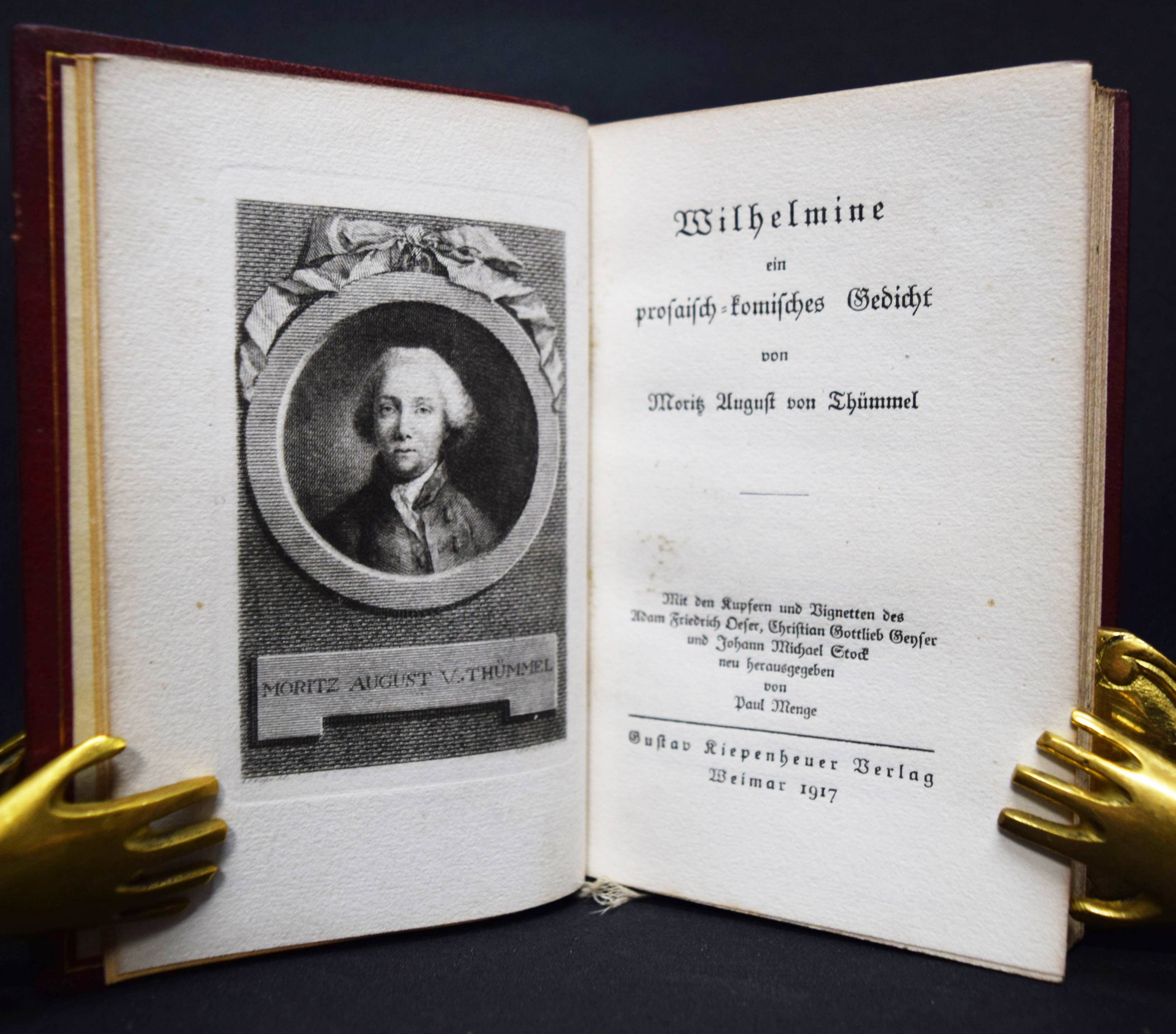 Thümmel, Moritz August v. Wilhelmine. Ein prosaisch komisches Gedicht. Weimar, Gustav Kiepenheuer 1917. Kl.-8° 15 x 10 cm.). XIII, 136 S., [1] Bl. mit Titelvignette, 7 Tafeln u. 12 Vignetten nach Kupferstichen von Johann Michael Stock nach Friedrich Ludwig Oeser. OLdr. mit goldgepr. Rückentitel, Rückenvergoldung, goldgepr. Deckelvignette und Kopfgoldschnitt. Vgl. Goedeke IV/1, 582, 1. Hayn-Gotendorf VII, 648. Lanckoronska-Oehler II, 21. Rümann 1152. – Eines von 125 num. Exemplaren der Vorzugsausgabe in Ganzleder (GA 500 Exemplare). – Bibliophiler Neudruck der ersten illustrierten Ausgabe. – Ein Erfolgsbuch der frühen Goethezeit und gleichzeitig Höhepunkt der komischen Heldengedichte in Prosa. – Exlibris, sehr gutes Exemplar.