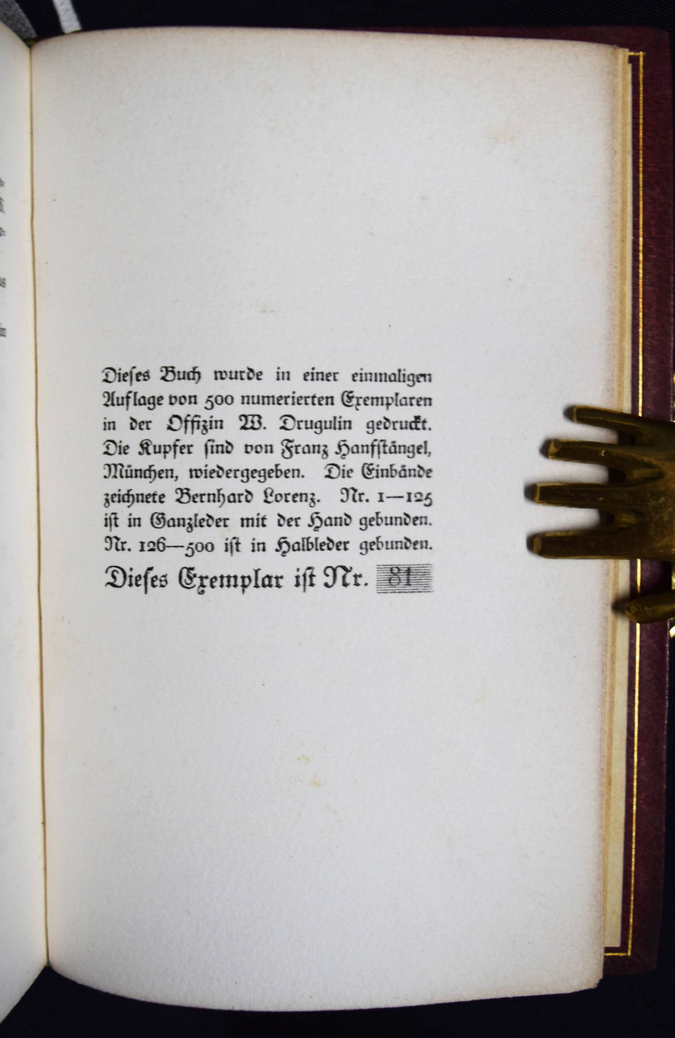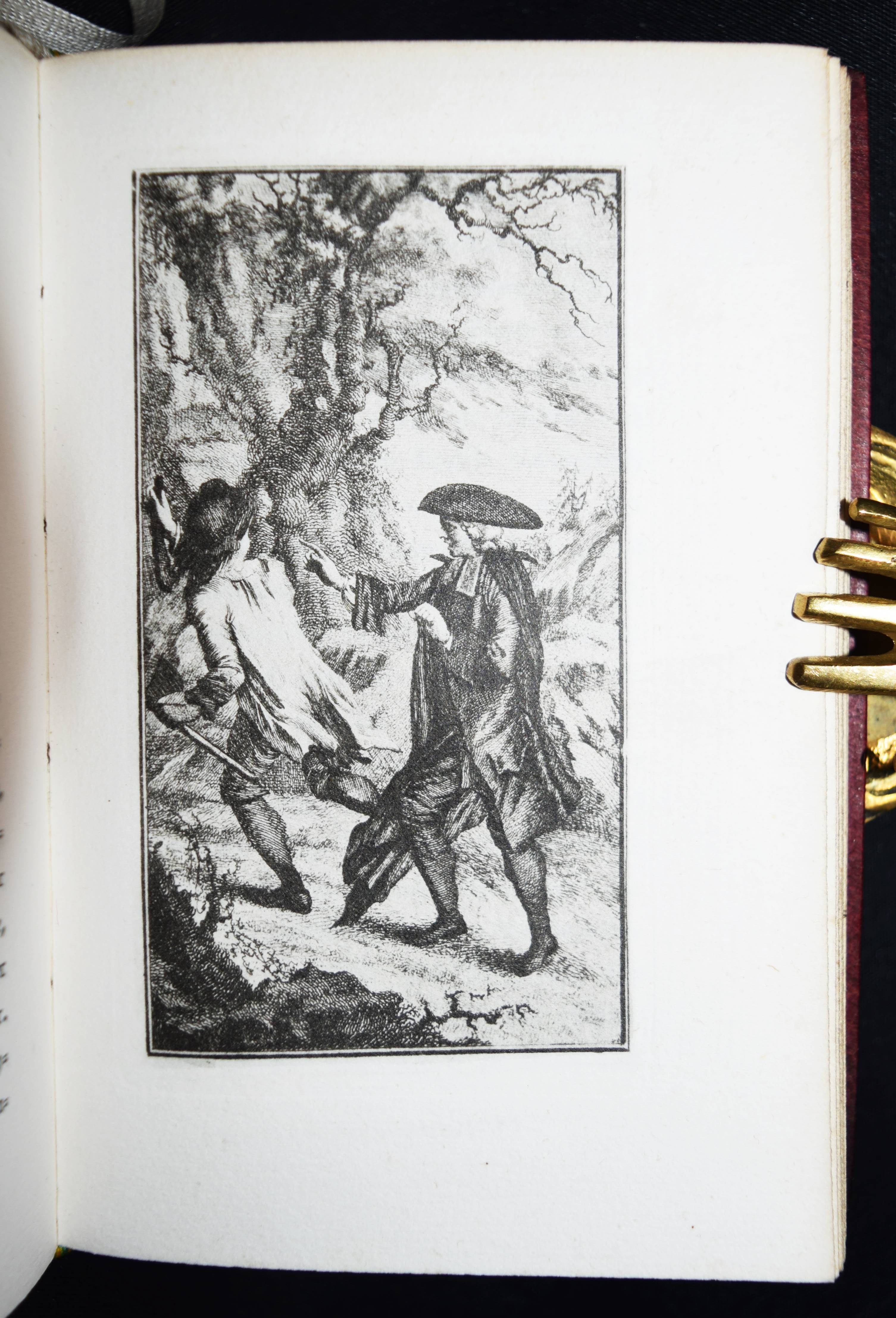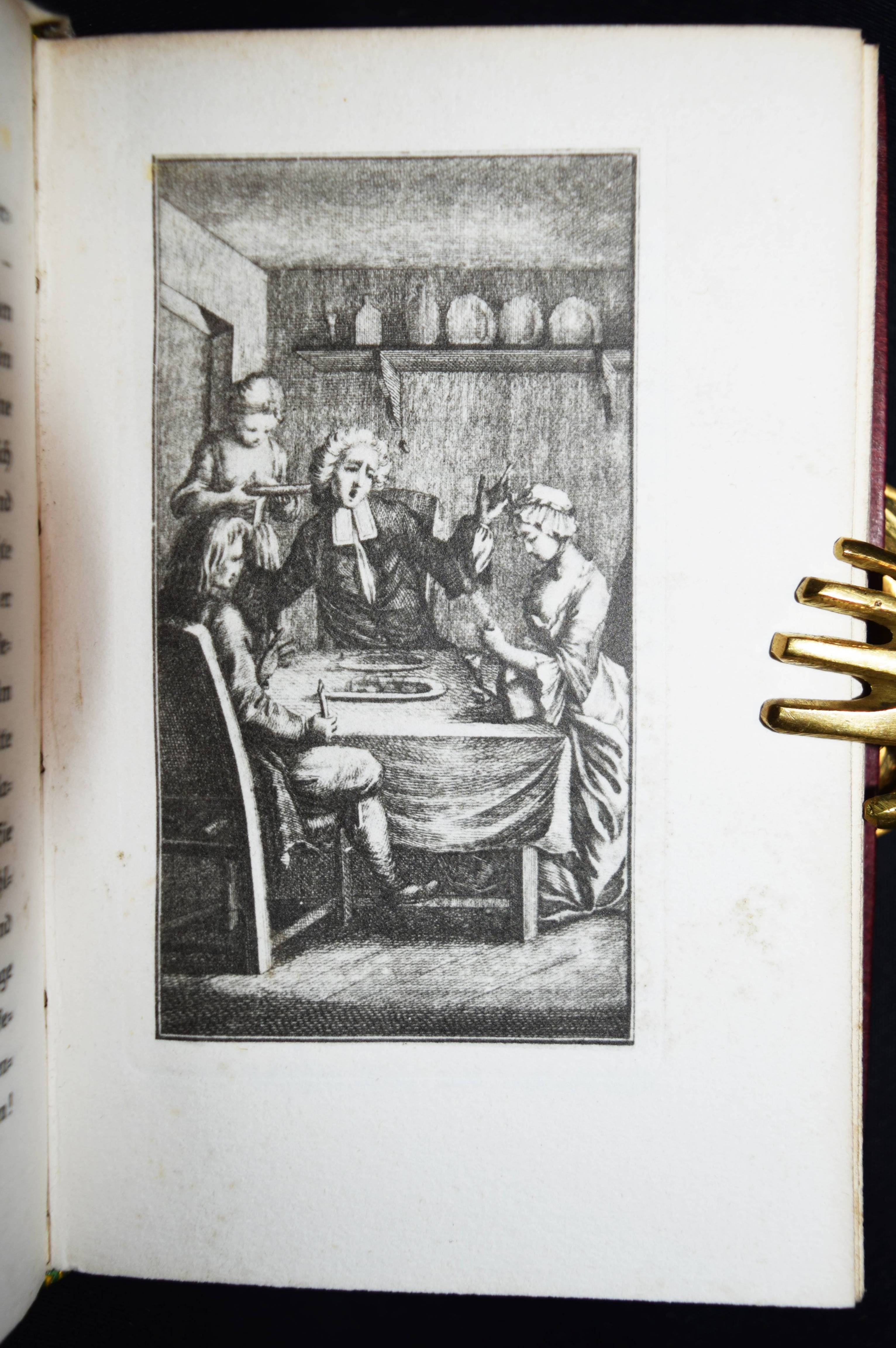 Thümmel, Moritz August v. Wilhelmine. Ein prosaisch komisches Gedicht. Weimar, Gustav Kiepenheuer 1917. Kl.-8° 15 x 10 cm.). XIII, 136 S., [1] Bl. mit Titelvignette, 7 Tafeln u. 12 Vignetten nach Kupferstichen von Johann Michael Stock nach Friedrich Ludwig Oeser. OLdr. mit goldgepr. Rückentitel, Rückenvergoldung, goldgepr. Deckelvignette und Kopfgoldschnitt. Vgl. Goedeke IV/1, 582, 1. Hayn-Gotendorf VII, 648. Lanckoronska-Oehler II, 21. Rümann 1152. – Eines von 125 num. Exemplaren der Vorzugsausgabe in Ganzleder (GA 500 Exemplare). – Bibliophiler Neudruck der ersten illustrierten Ausgabe. – Ein Erfolgsbuch der frühen Goethezeit und gleichzeitig Höhepunkt der komischen Heldengedichte in Prosa. – Exlibris, sehr gutes Exemplar.