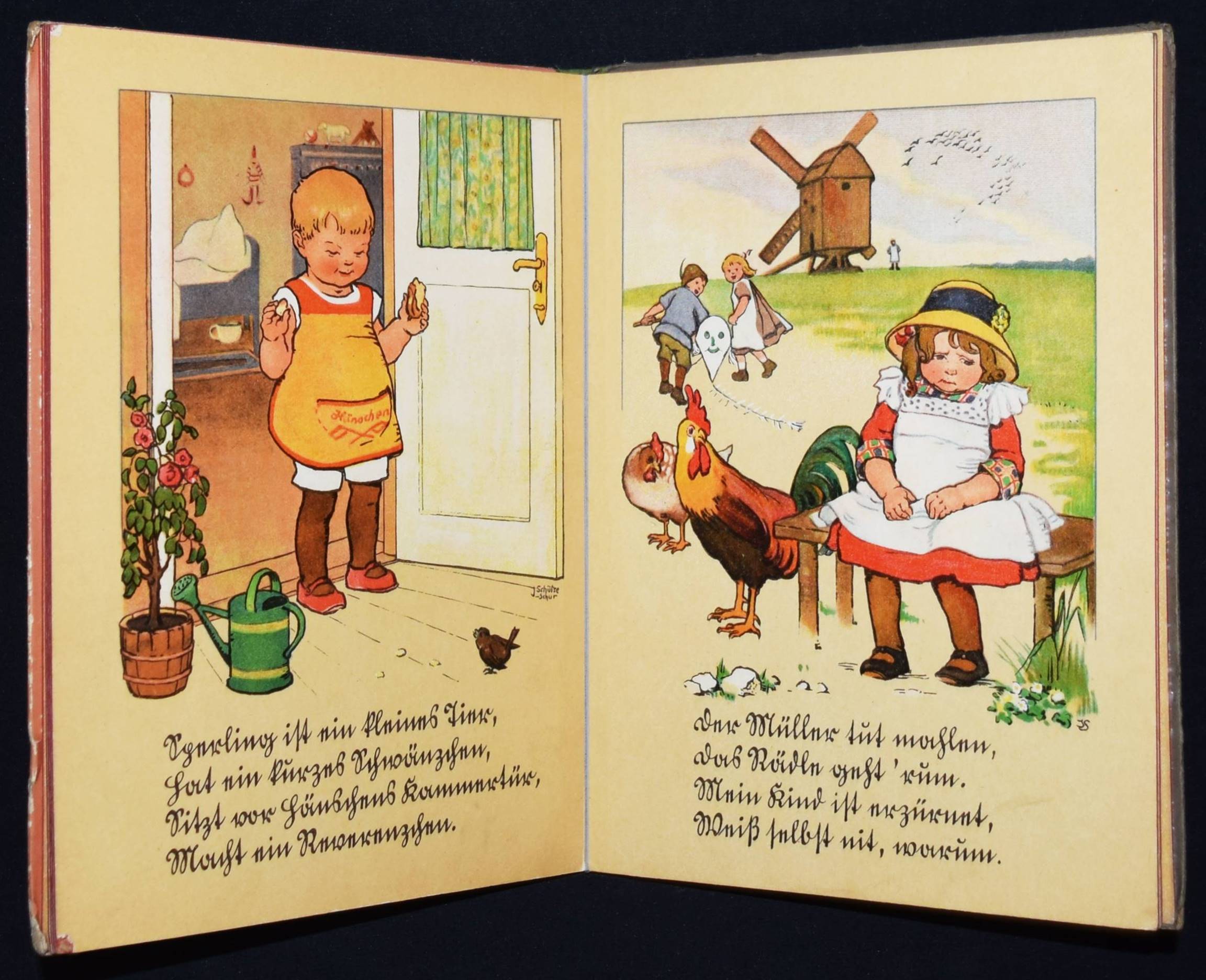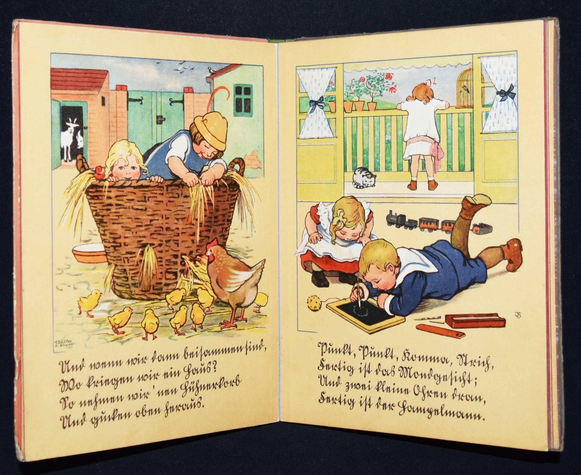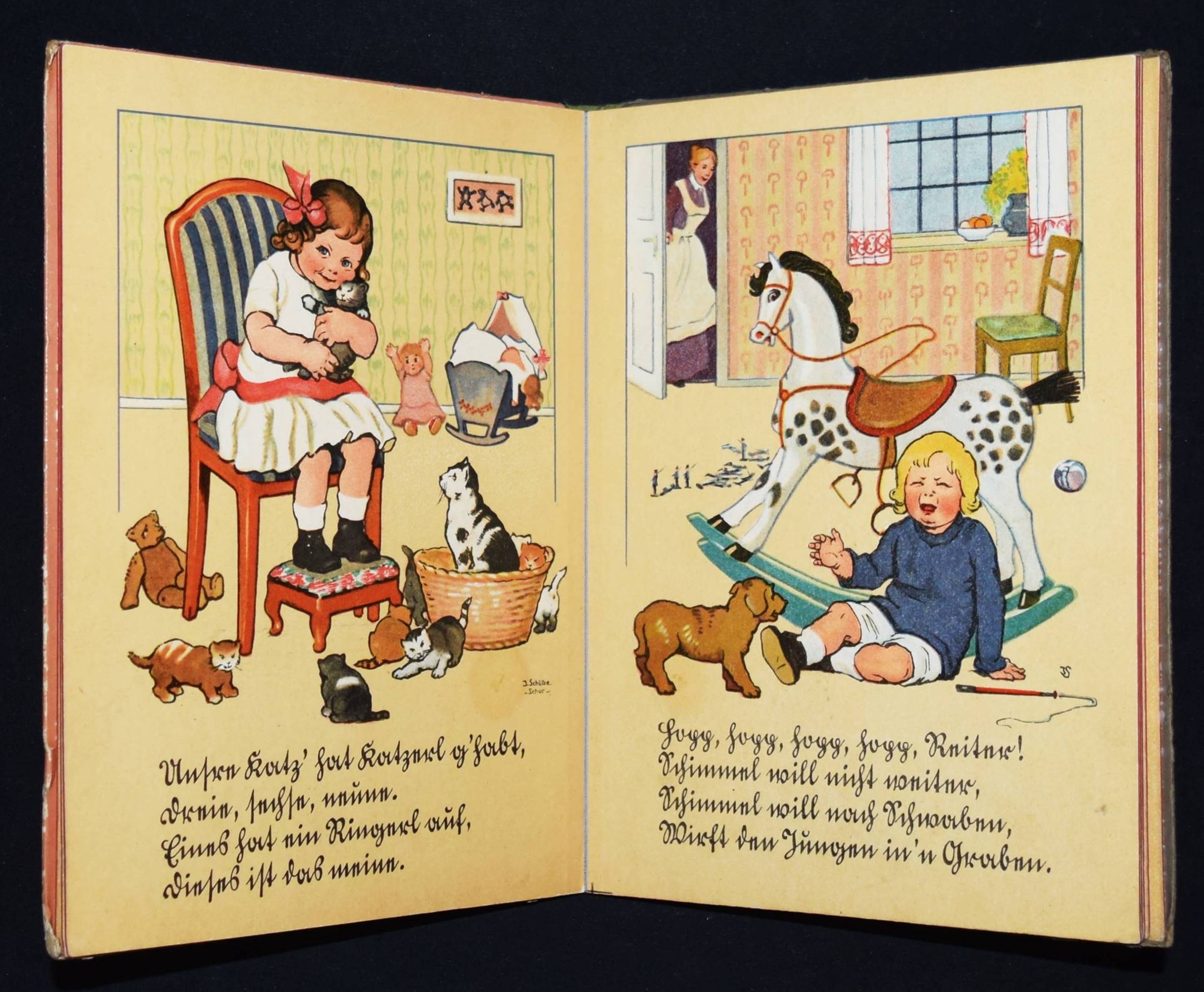 Neue Bilder zu alten Reimen. Bilder von I(lse) Schütze-Schur. Titelbild von Ernst Kutzer. (Deckeltitel). Duisburg, J. A. Steinkamp o. J. (ca. 1913). 4°. [6] Bl. mit farblithogr. Illustrationen auf Karton. Farbig illustr. OHln. (Verlags-Nr. 742). Shindo 38. Nicht bei Bunk (verzeichnet in ähnlicher Ausstattung das Bilderbuch „Für’s Kleinste das Feinste!“, S. 20). – Sehr seltenes Kleinkind-Bilderbuch mit bekannten Kinderreimen (Hoppe, Hoppe, Reiter, Hänschen in der Grube etc.) zu zeittypischen Illustrationen. Teilausgabe von „Überall Sonnenschein“ (Shindo 45). Außer der Deckelillustration stammen auch die Illustrationen auf den Innendeckeln von E. Kutzer (vorne: „Wer dieses Buch nicht lesen kann, der sehe sich’s mit Mutti an“ und hinten: Ist das Buch zu Ende, dann – fangen wir’s von vorne an“). Der Text ist in Sütterlin-Schrift gedruckt. – Einband etwas angestaubt und bestoßen, hinteres Innengelenk gebrochen, sonst sehr gut erhalten.