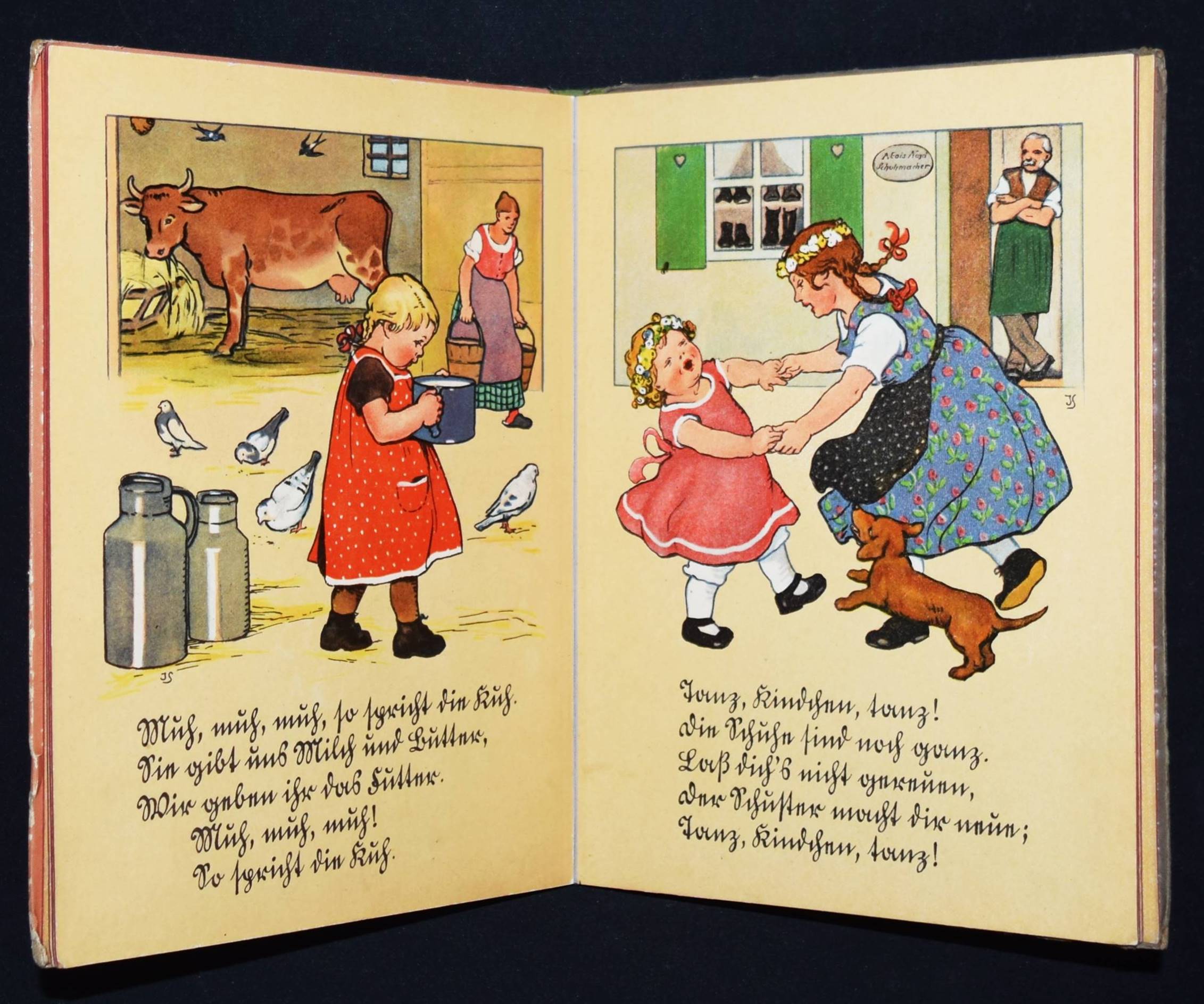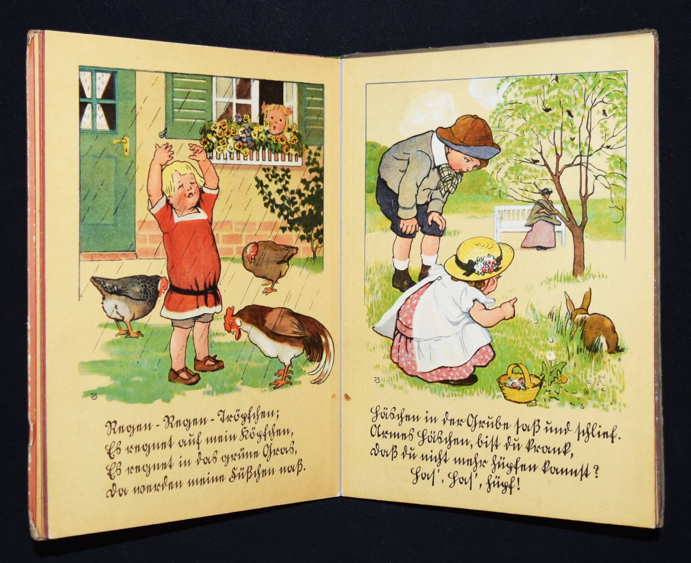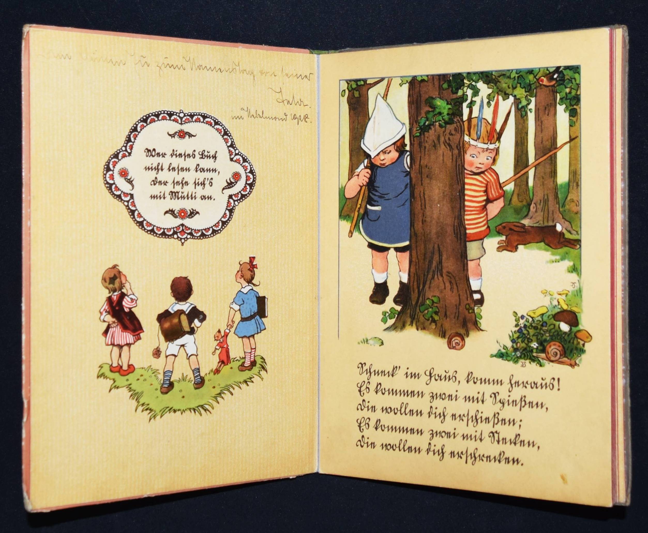 Neue Bilder zu alten Reimen. Bilder von I(lse) Schütze-Schur. Titelbild von Ernst Kutzer. (Deckeltitel). Duisburg, J. A. Steinkamp o. J. (ca. 1913). 4°. [6] Bl. mit farblithogr. Illustrationen auf Karton. Farbig illustr. OHln. (Verlags-Nr. 742). Shindo 38. Nicht bei Bunk (verzeichnet in ähnlicher Ausstattung das Bilderbuch „Für’s Kleinste das Feinste!“, S. 20). – Sehr seltenes Kleinkind-Bilderbuch mit bekannten Kinderreimen (Hoppe, Hoppe, Reiter, Hänschen in der Grube etc.) zu zeittypischen Illustrationen. Teilausgabe von „Überall Sonnenschein“ (Shindo 45). Außer der Deckelillustration stammen auch die Illustrationen auf den Innendeckeln von E. Kutzer (vorne: „Wer dieses Buch nicht lesen kann, der sehe sich’s mit Mutti an“ und hinten: Ist das Buch zu Ende, dann – fangen wir’s von vorne an“). Der Text ist in Sütterlin-Schrift gedruckt. – Einband etwas angestaubt und bestoßen, hinteres Innengelenk gebrochen, sonst sehr gut erhalten.