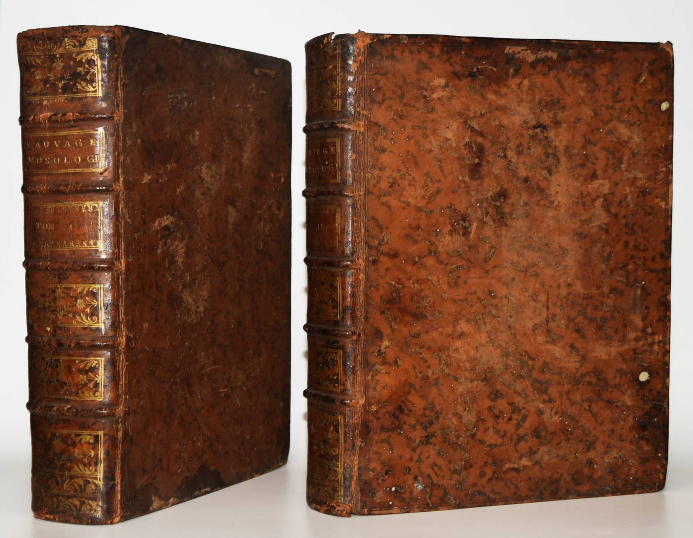 Boissier (de Lacroix) de Sauvages, François. Nosologia methodica sistens morborum classes. Juxtà Sydenhami mentem & botanicorum ordinem. Editio ultima, auctior & emendatior. 2 Bände. Amstelodami (Amsterdam), Fratrum de Tournes 1768. 4°. [3] Bl., VIII, 21, 851 S.; Titel, 751 S. mit 1 Kupfertafel in Band I. Kalbslederbände der Zeit mit goldgepr. Rückensch. und reicher floraler Rückenvergoldung. Garrison-Morton 2203. Graesse VI/1, 277. Hirsch-Hüb. V, 33. – Entgültige erweiterte Ausgabe des 1763 zuerst erschienenen Hauptwerks. Darin entwickelt Sauvages, wie vor ihm der englische Arzt Thomas Sydenham, eine Klassifikation der Krankheiten analog zum botanischen pflanzensystematischen Werk Linnés; das sogenannte „natürliche nosologische System“. – „Sauvages adopted the botanical system of Linnaeus for a classification of diseases; his book exerted a wide influence on his contemporaries. He enumerated 2.400 different diseases“ (Garrison-Morton). – Der franz. Arzt und Botaniker F. Boissier de Sauvages de Lacroix (1706-1767) war Professor für Physiologie und Pathologie in Montpellier. – Einbände etwas berieben, stellenweise im Blattrand etwas wasserfleckig, gutes dekorativ gebundenes Exemplar.