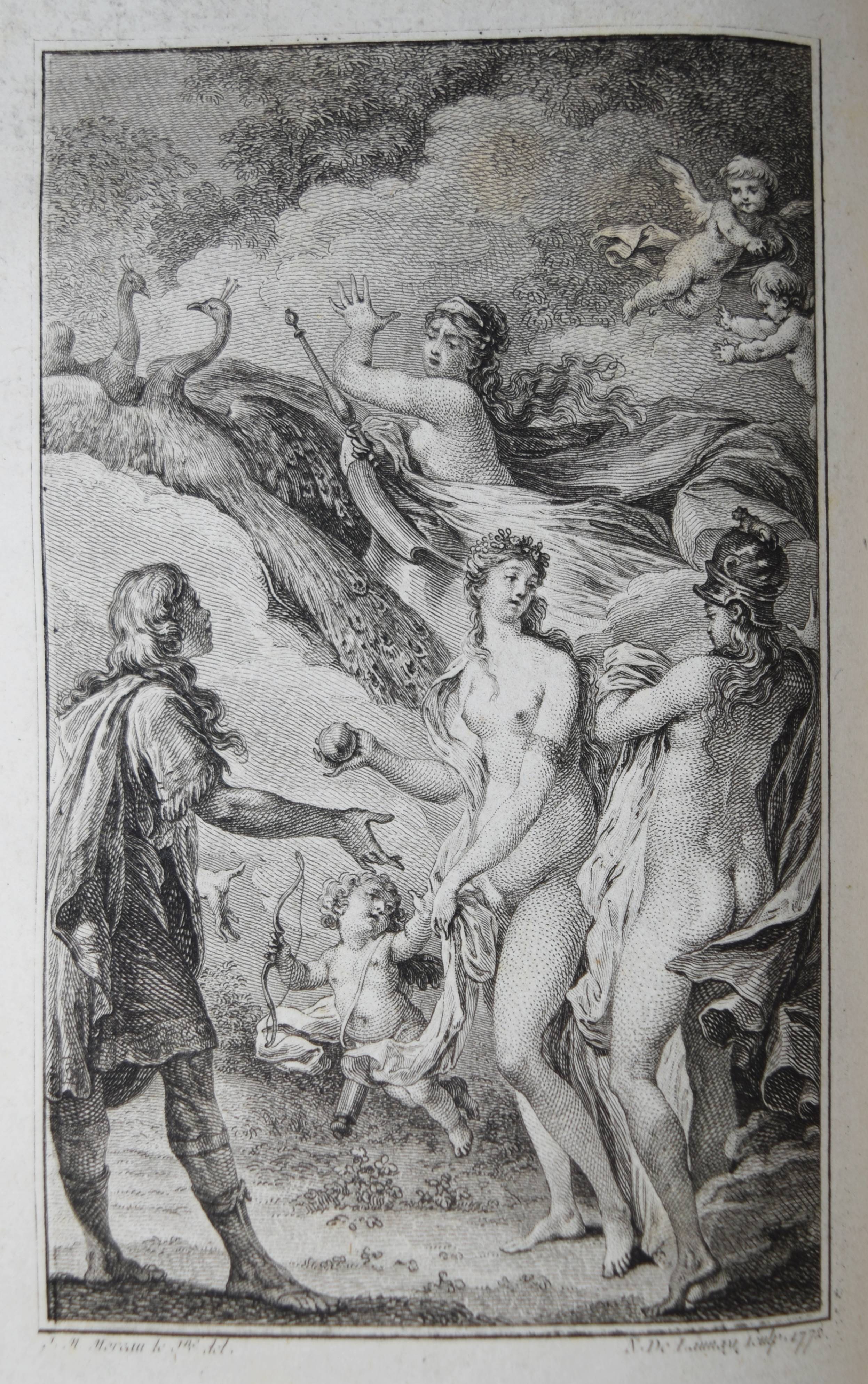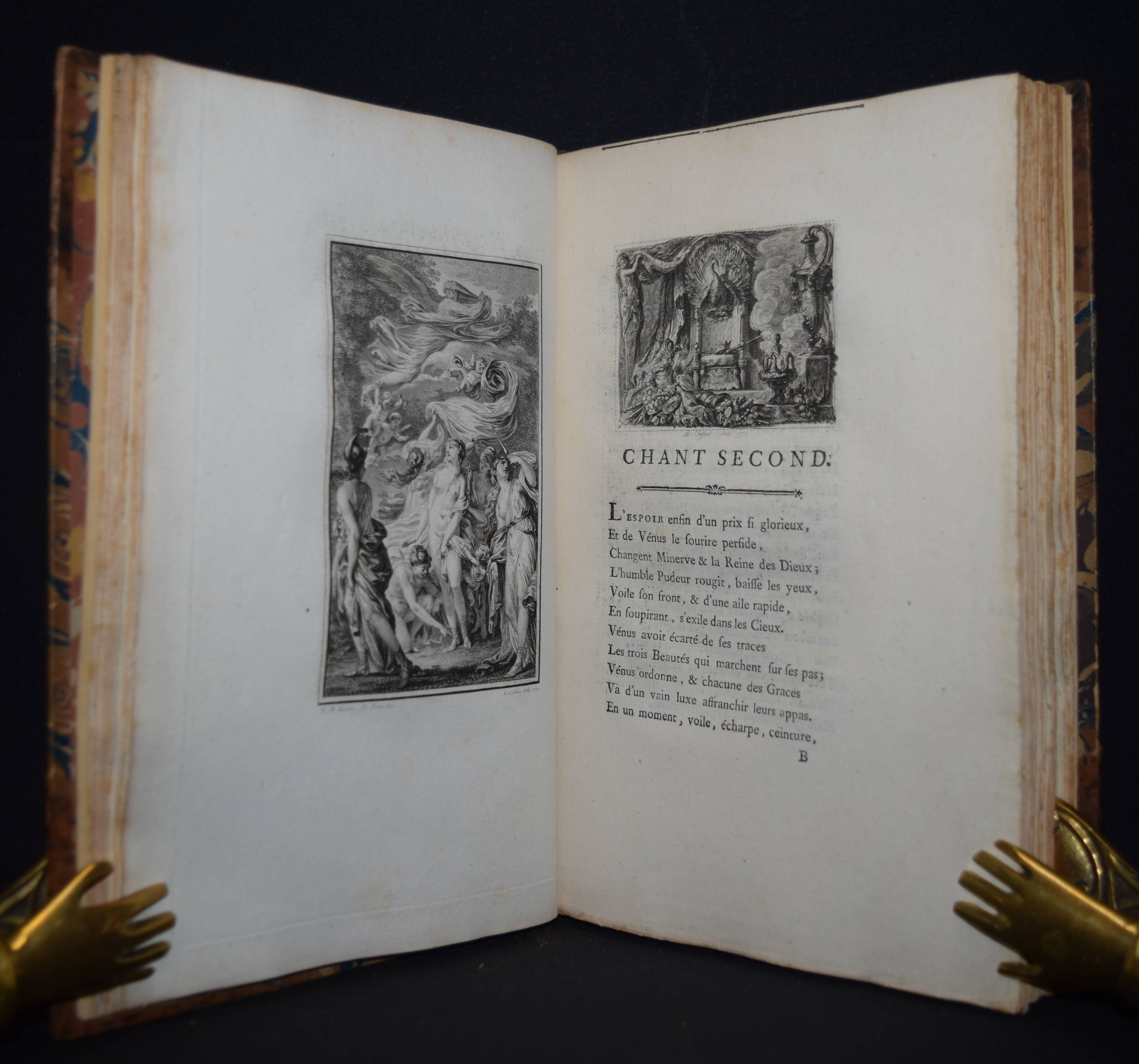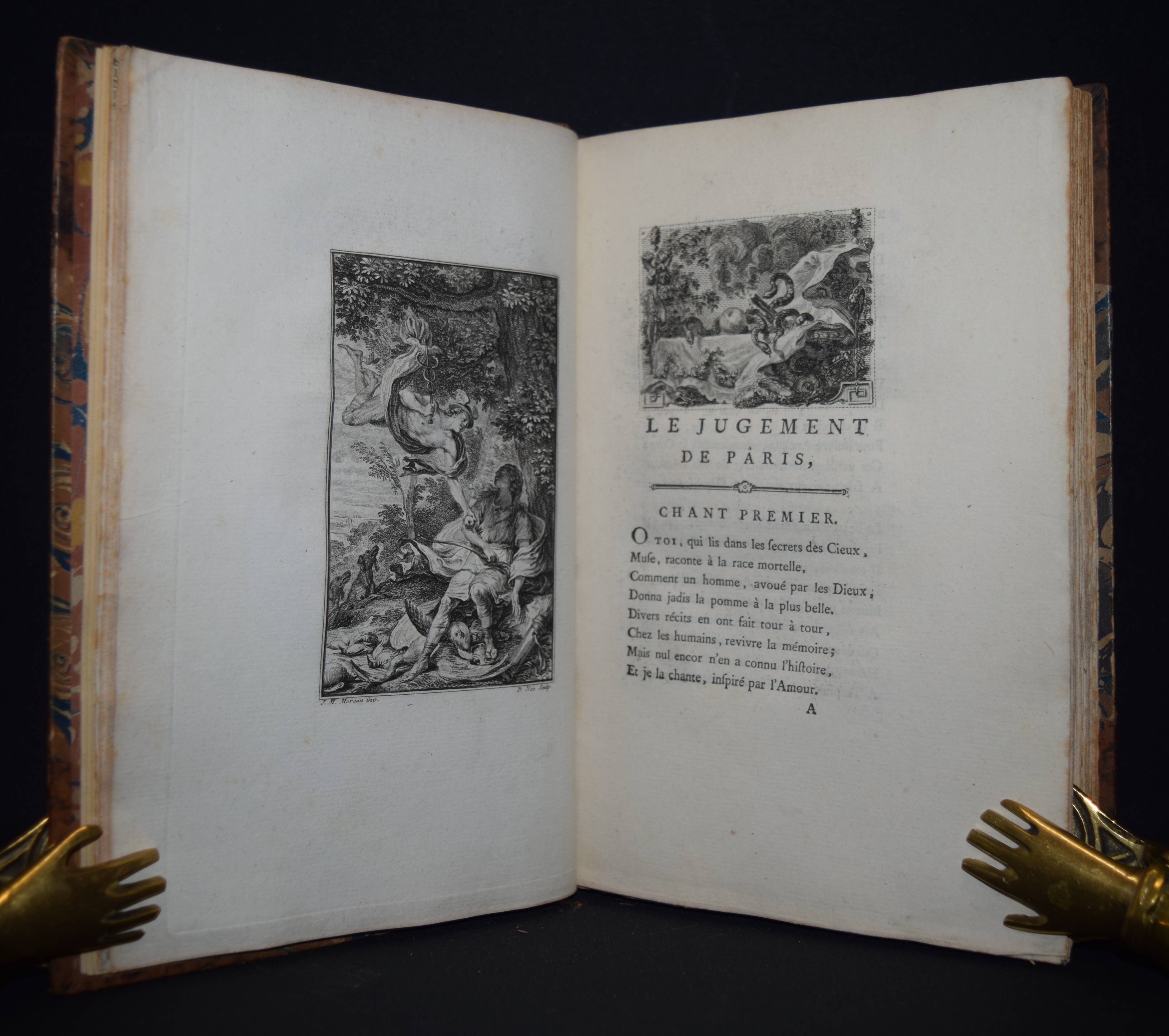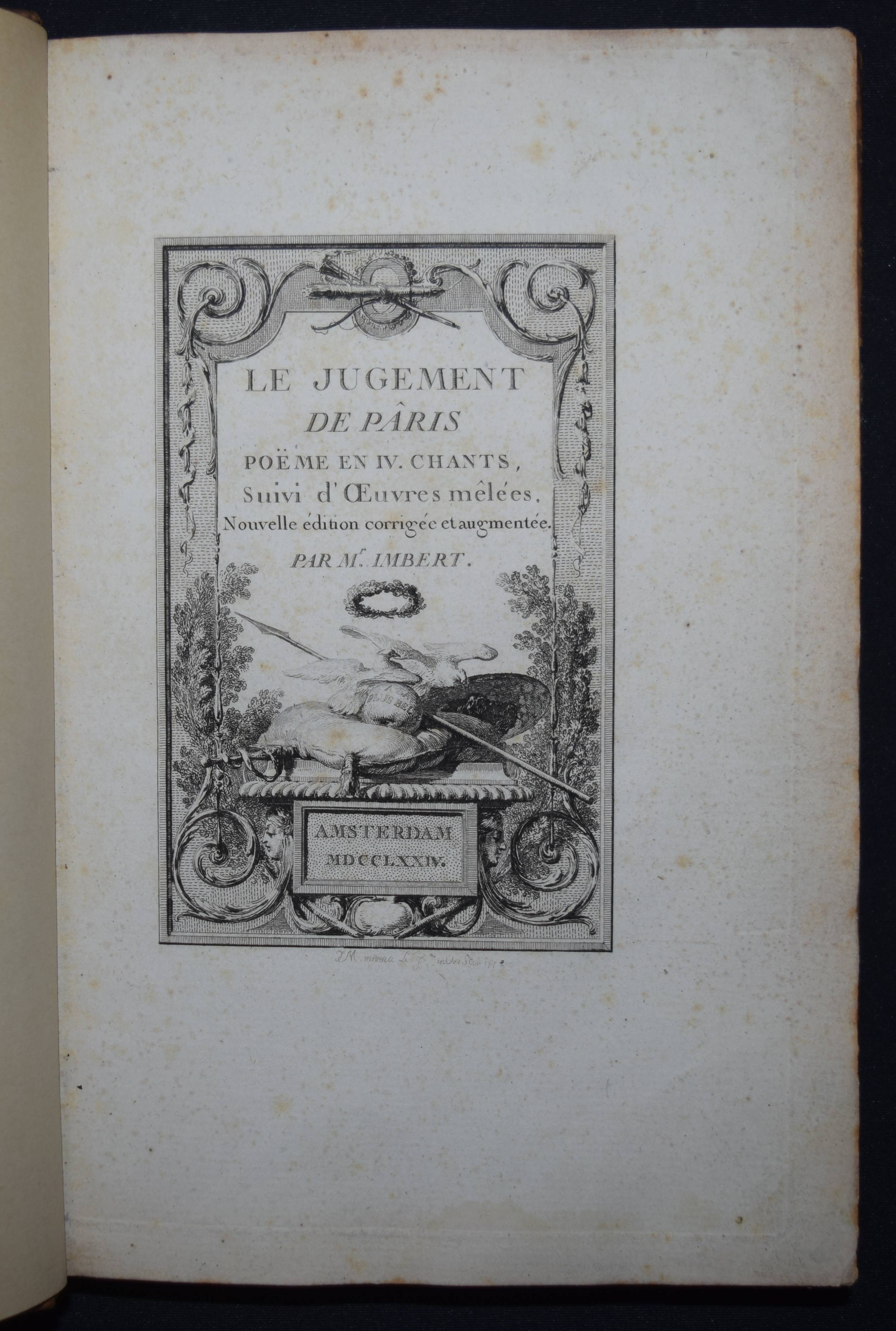 Imbert, (Barthélemy). Le jugement de Pâris. Poëme en IV. chants. Nouvelle édition corrigée et augmentée. Amsterdam, (Delalain) 1774. Gr.-8° (23,5 x 15,5 cm.). Gestoch. illustr. Titel, XIV, [1] Bl., 248, IIJ, (1) S. mit 4 Kupfertafeln von A. J. Inclos, D. Née, N. de Launay u. L. J. Masquelier nach J(ean) M(ichel) Moreau le jeune u. 4 gestoch. Kopf-Vignetten von P(ierre)-P(hilippe) Choffart. Späterer Halblederband mit goldgepr. Rückenschild, dekorativer floraler Rückenvergoldung und Kopfgoldschnitt. Cioranescu 34346. Cohen-Ricci 506 u. 507. Sander 965 Anm. – Vorzugsausgabe auf großem Papier (grand papier de Hollande). – Zweite Ausgabe mit diesen Illustrationen. – „Reimpression avec les memes figures mais avec quelques changements dans le texte – très jolies illustrations“ (Cohen-R.). – Schönes breitrandiges, sauberes und dekorativ gebundenes Exemplar.