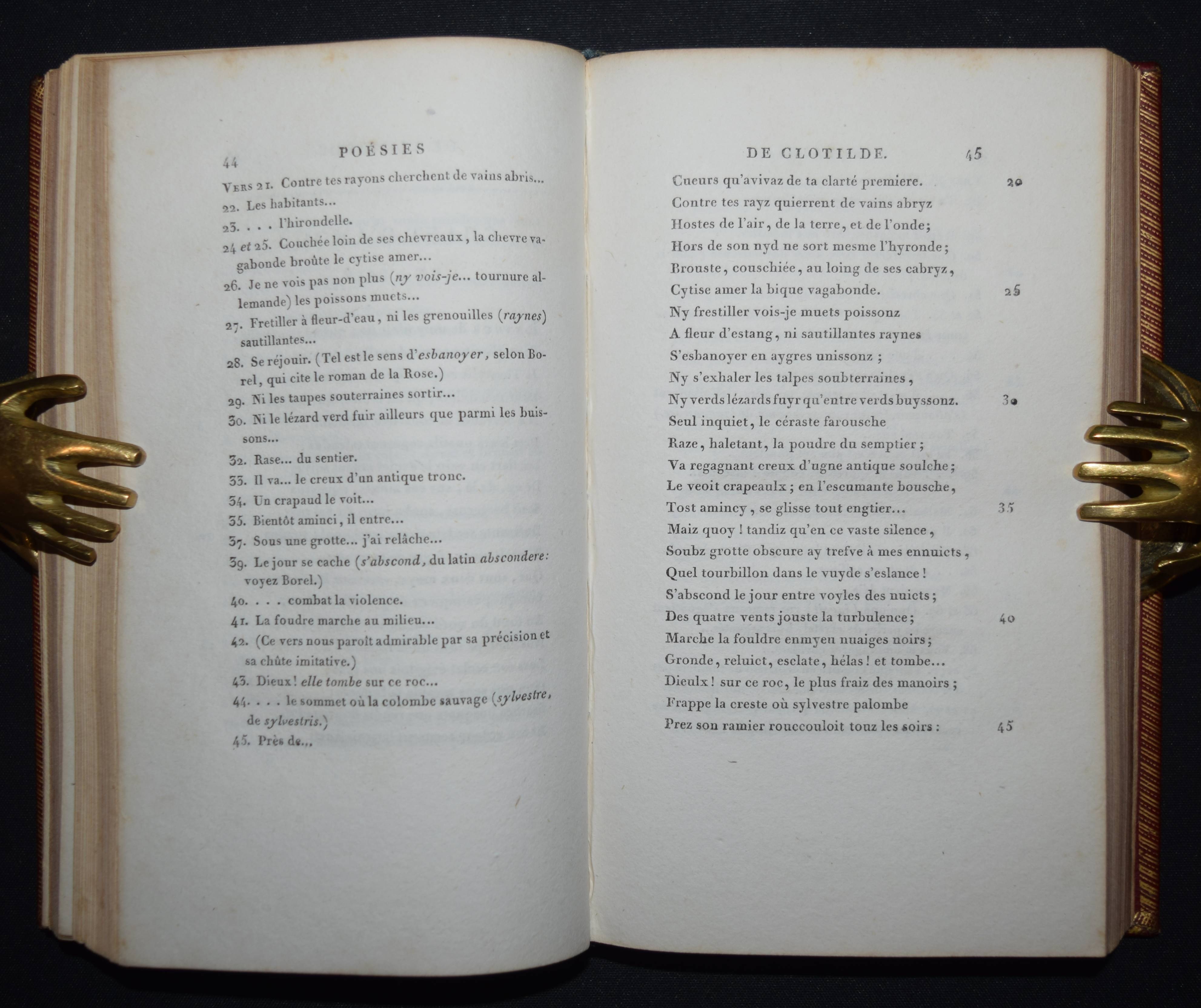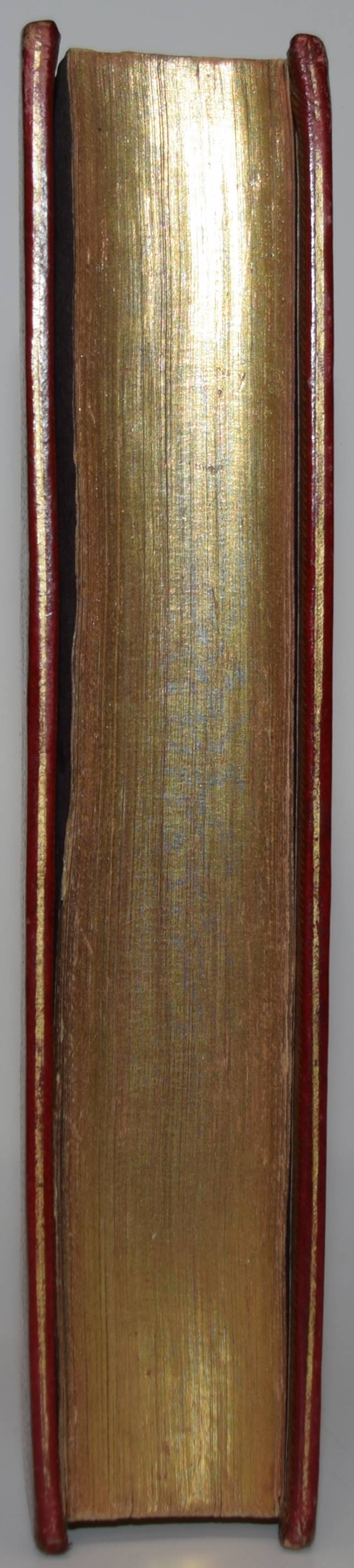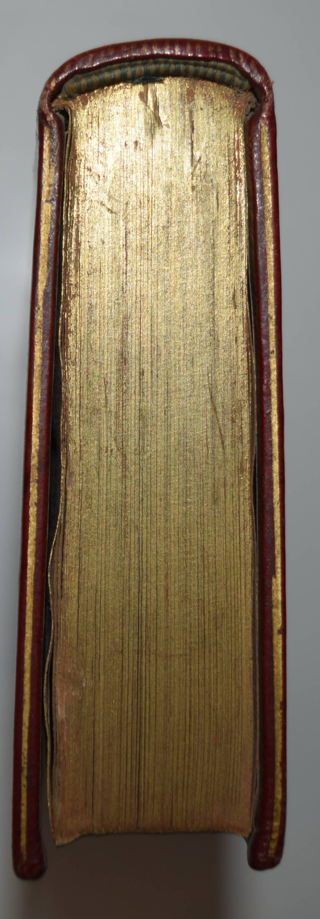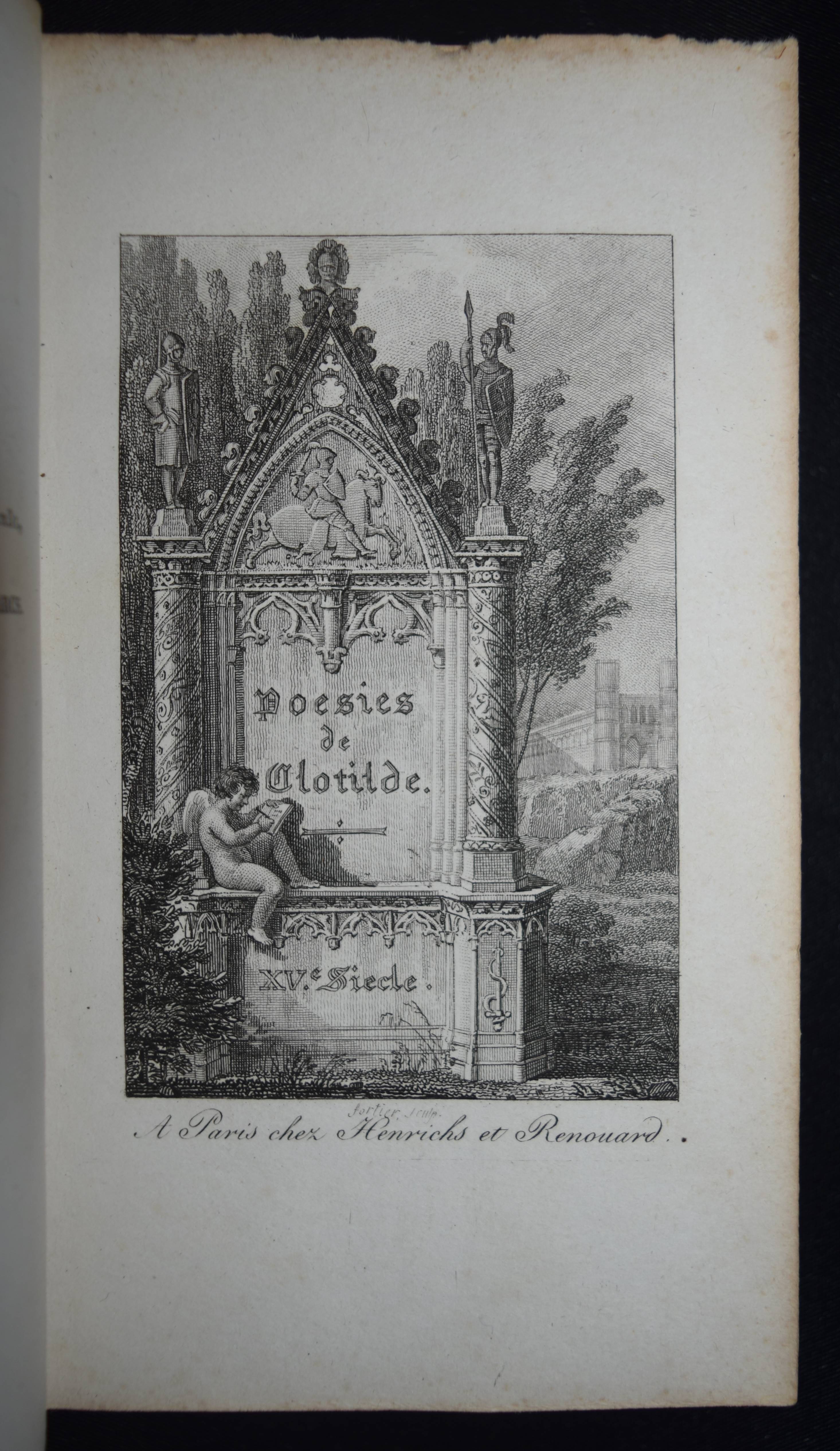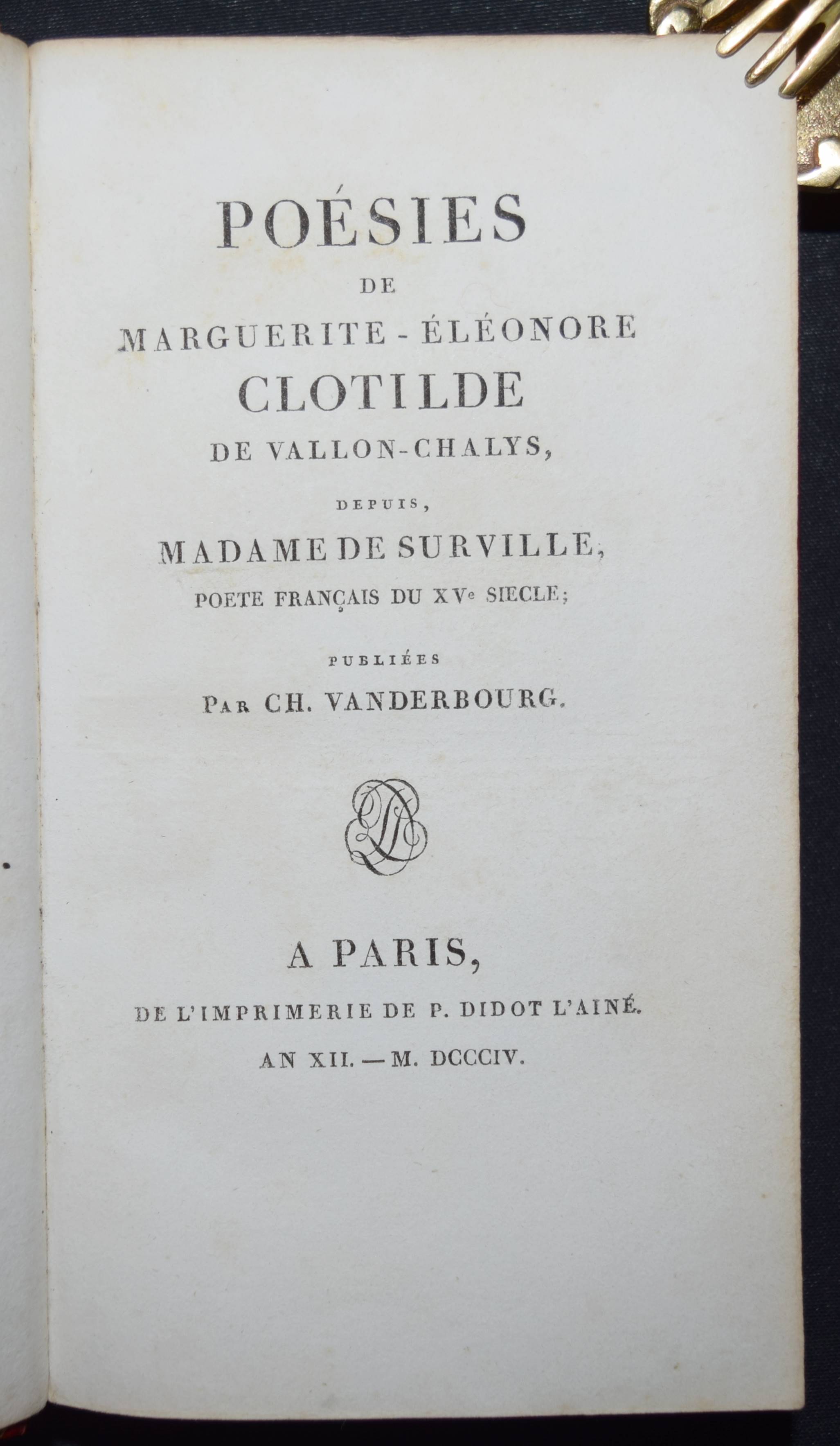 (Surville, Joseph Étienne de). Poésies de Marguerite-Éléonore Clotilde de Vallon-Chalys, depuis Madame de Surville, poéte français du XVe siècle. Publiées par Ch(arles) Vanderbourg. Paris, P. Didot l’ainé für Henrichs et Renouard An XII (1804). Kl.-8° (17 x 10,5 cm.). CXXIII, 257, (1) S. mit gestoch. Frontispiz. Weinroter Maroquineinband der Zeit mit goldgepr. Rückentitel, figürlicher Rückenvergoldung, goldgepr. Deckelfiletten, Innenkantenvergoldung und Goldschnitt. Zweite Ausgabe der zuerst 1803 von C. Vanderbourg herausgegebenen Gedichte der wohl fiktiven Autorin Margarita Eleanora Clothildis de Vallon-Chalys. Die Verfasserin soll zu Beginn des 15. Jahrhunderts geboren worden sein und 1421 Berengar de Surville geheiratet haben, der sieben Jahre später bei der Belagerung von Aurelian getötet wurde. Heute gilt Joseph Étienne de Surville (1755-1798) als Urheber der Gedichte. Die nur in wenigen Exemplaren erhaltene Erstausgabe besitzt ein Vorwort von J.-E. de Surville. – Gestoch. Wappen-Exlibris, außergewöhnlich schönes Exemplar in einem prachtvollen zeitgenöss. Handeinband aus einer Schloß-Bibliothek. – Deuxième édition des poèmes de l’auteur probablement fictif Margarita Eleanora Clothildis de Vallon-Chalys, publiés pour la première fois en 1803 par C. Vanderbourg. L’auteure serait née au début du XVe siècle et aurait épousé en 1421 Bérenger de Surville, qui fut tué sept ans plus tard lors du siège d’Aurélien. Aujourd’hui, Joseph Étienne de Surville (1755-1798) est considéré comme l’auteur des poèmes. La première édition, qui n’a été conservée qu’en quelques exemplaires, possède une préface de J.-E. de Surville. – Poinçonné. Exlibris armorié (″Mr. le Baron de Croze“), exemplaire exceptionnellement beau dans une magnifique reliure d’époque.