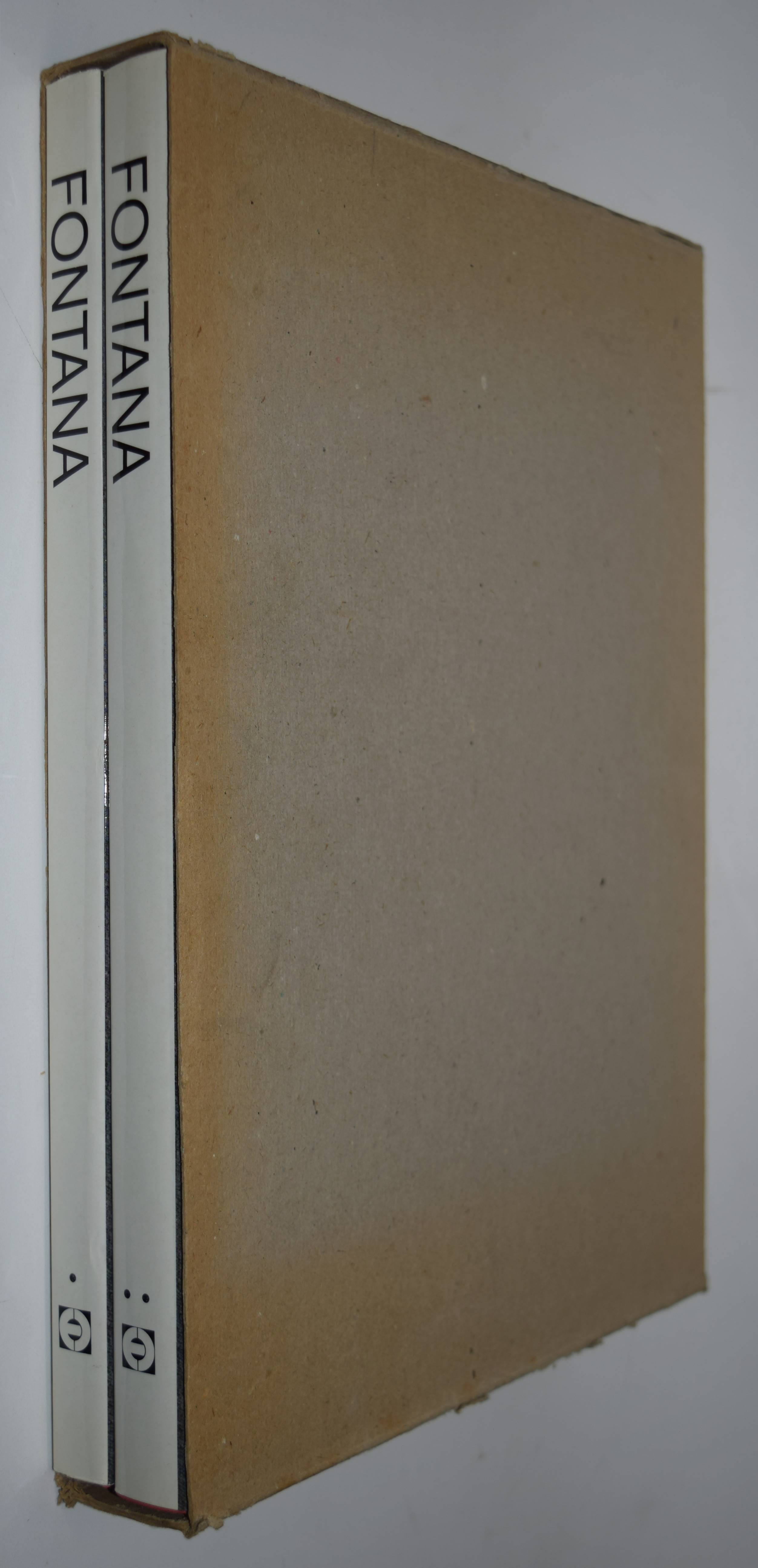 Fontana – Crispolti, Enrico. Archivio Lucio Fontana, Milano. I. Essays par Jan van der Marck et Enrico Crispolti. – II. Catalogue raisonné des peintures, sculptures et environments spatiaux rédigé par Enrico Crispolti. 2 Bände. Bruxelles, La Connaissance Exclusivité Weber (1974). Gr.-4°. 148 S., [2] Bl.; 242 S. mit zahlr. teils farb. Abb. OLn. mit illustr. OU. in Orig.-Pappschuber. Texte in italienisch, französich und englisch. – Werkverzeichnis des italienischen Avantgardekünstlers, der durch seine „Schnittbilder“ weltberühmt wurde. – Sehr gutes Exemplar.