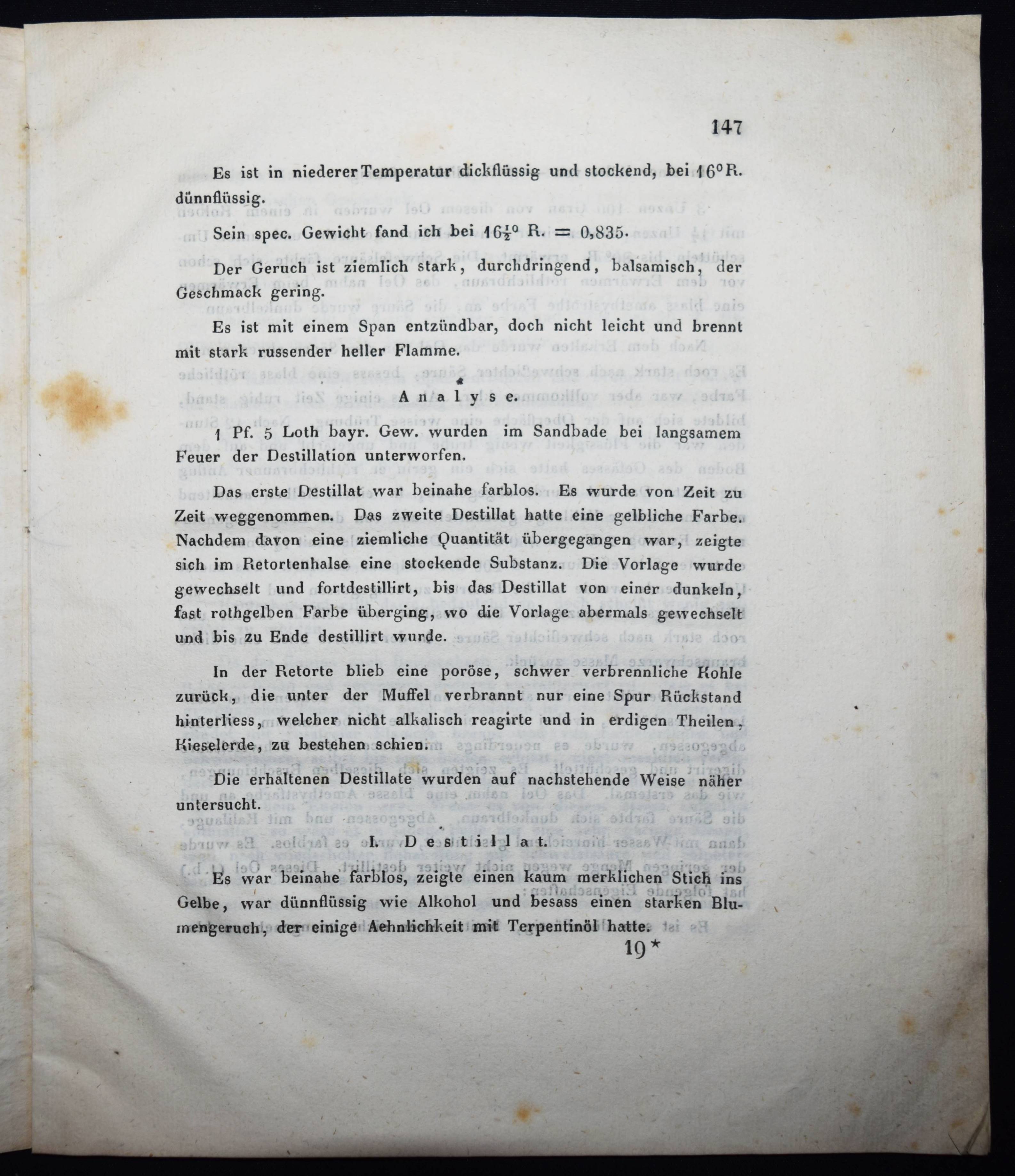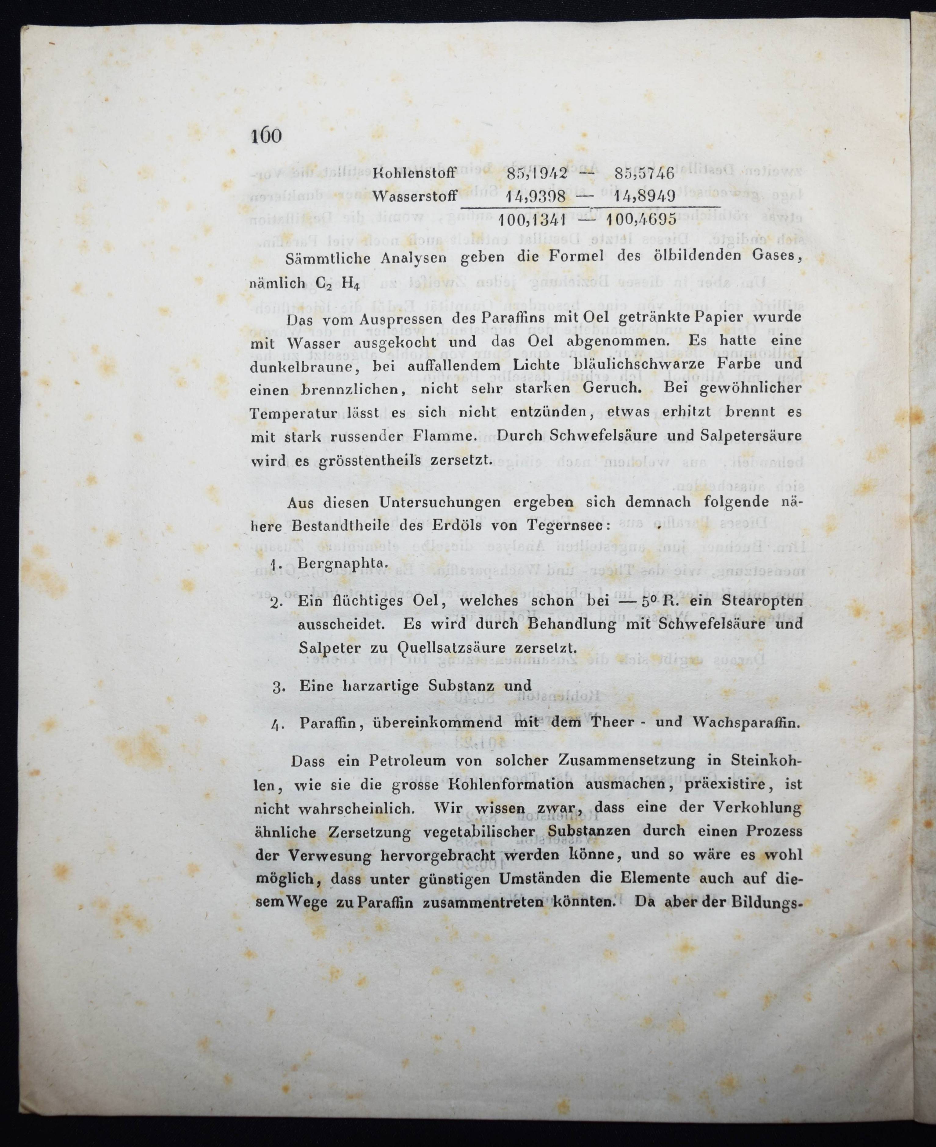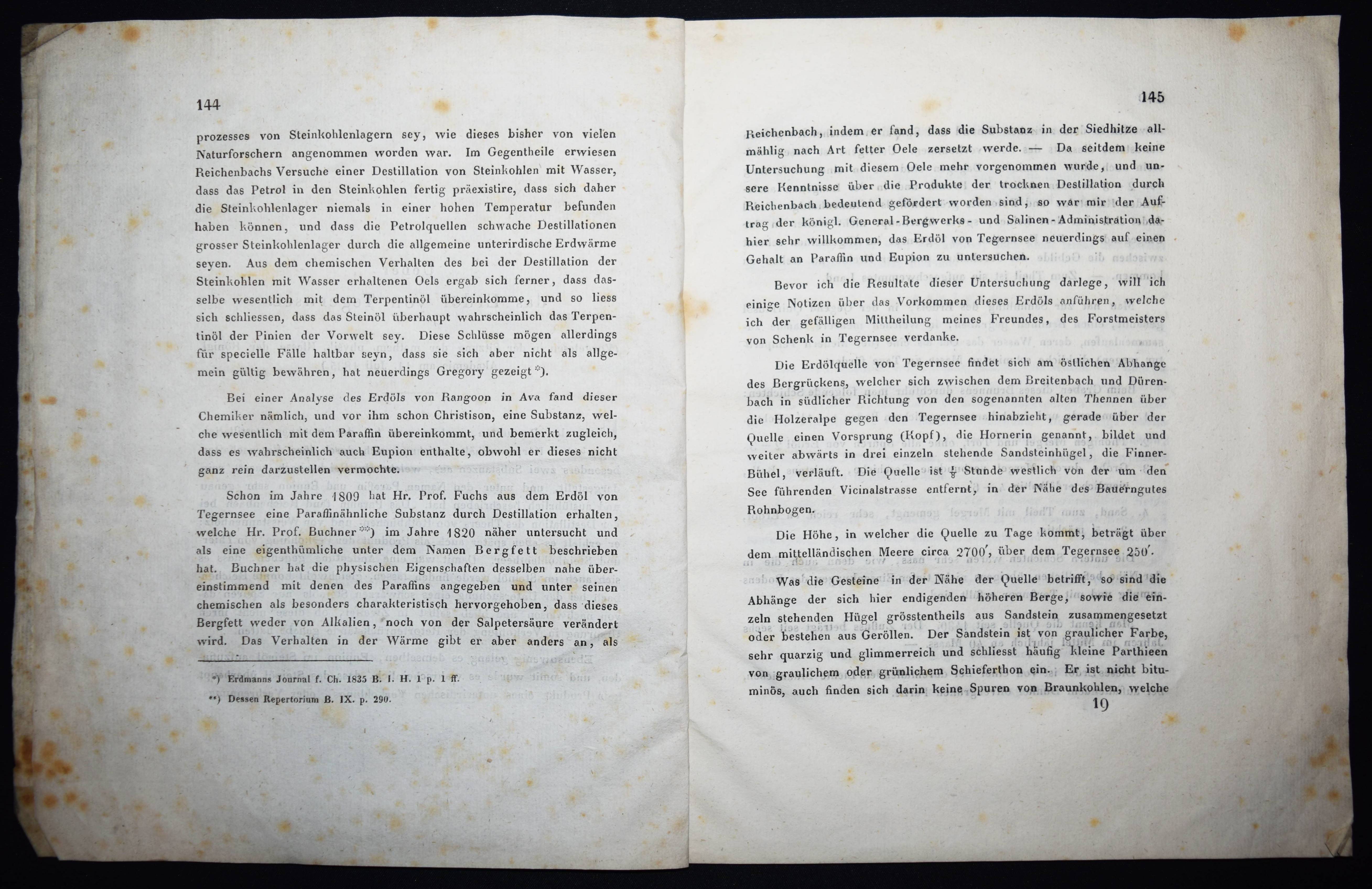 Kobell, Franz Ritter v. Über das Erdöl von Tegernsee im bayerischen Oberlande. München, Bayerischen Akademie der Wissenschaften (1837). 4°. S. [141] – 162. Heftstreifen. (Abhandlungen der Bayerischen Akademie der Wissenschaften, Mathematisch-Physikalische Klasse 2,2). Poggend. I, 1286. – Äußerst seltene Arbeit des berühmten bayr. Geologen, Mundartdichters und Volksschriftstellers F. v. Kobell (1803-1882). – „Auf der Basis gründlicher chemischer Untersuchungen veröffentlichte K. 1830/31 eine „Charakteristik der Mineralien“ (2 Bände), 1833 folgten „Tafeln zur Bestimmung der Mineralien mittels chemischer Versuche“ (bis 1901 14 Auflagen; englische, französische, russische, italienische, spanische, holländische und ungarische Übersetzungen). Daneben erschienen zahlreiche Spezialarbeiten, die ihn rasch zu einem der führenden Mineralogen seiner Zeit machten; er entdeckte zahlreiche Gesteinsarten und erarbeitete für viele Arten genauere Definitionen. 1838 erschien sein Lehrbuch „Grundzüge der Mineralogie“, in dem er sich bemühte, das Thema „auf eine einfache und möglichst populäre Weise darzustellen“. 1847 veröffentlichte er als Zusammenfassung seiner bisherigen Forschungen „Die Mineralogie“ (als „Lehrbuch der Mineralogie“ 61899 herausgegeben von K. Oebbeke und E. Weinschenk), 1864 publizierte er eine „Geschichte der Mineralogie“. Alle naturwissenschaftlichen Veröffentlichungen zeigen K.s besondere Fähigkeit zur anschaulichen, lebendigen Beschreibung und sein Bemühen, komplizierte Zusammenhänge durch klare Darstellung verständlich zu machen. Diesem Anliegen dienten auch Schriften wie „Skizzen aus dem Steinreiche. Geschrieben für die gebildete Gesellschaft“ (1850) oder „Über Pflanzensagen und Pflanzensymbolik“ (1875)“ (K. Pörnbacher in NDB XII, 238 ff.). – Die ersten und letzten Seiten teils stärker braunfleckig, sonst gut erhalten.