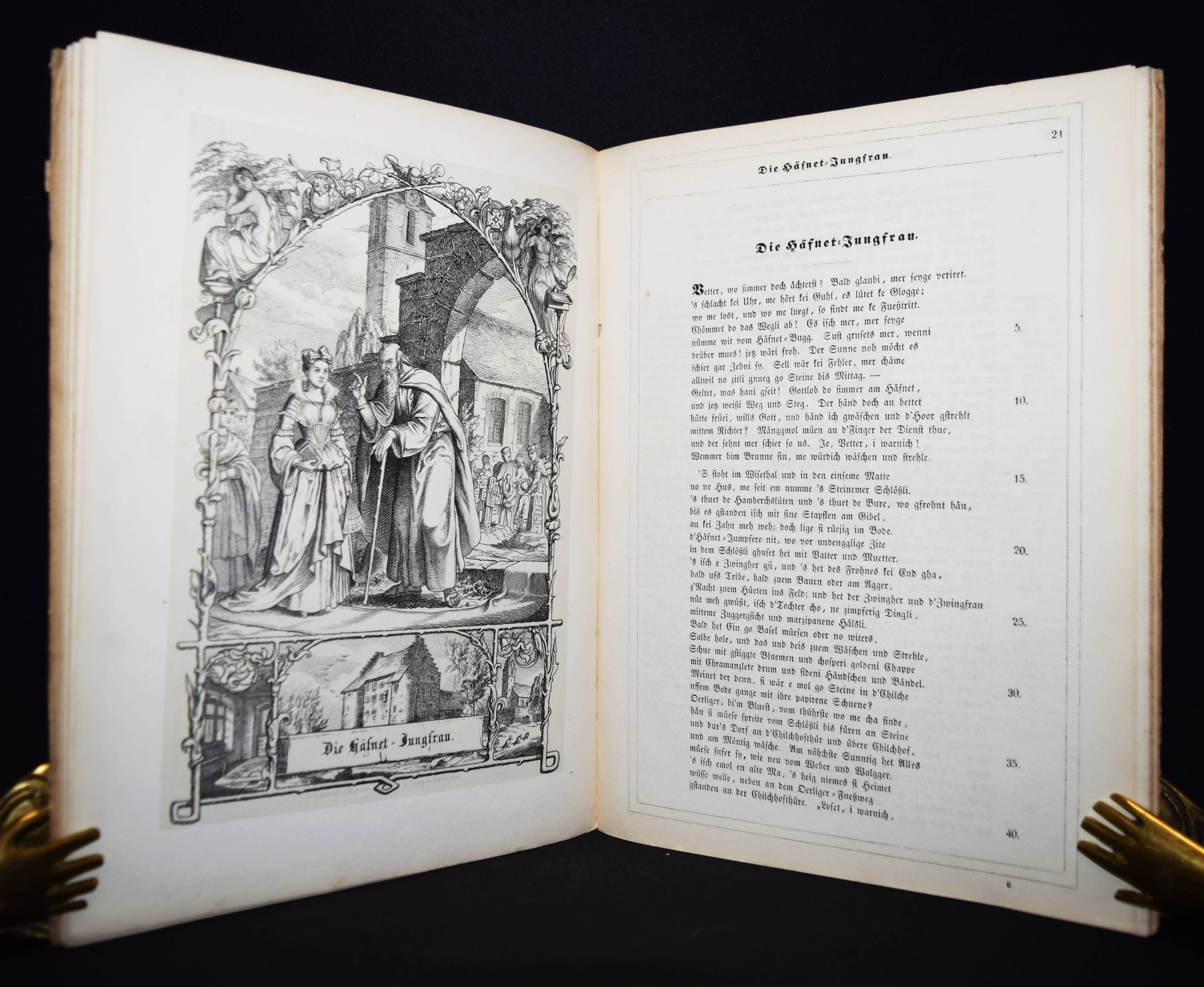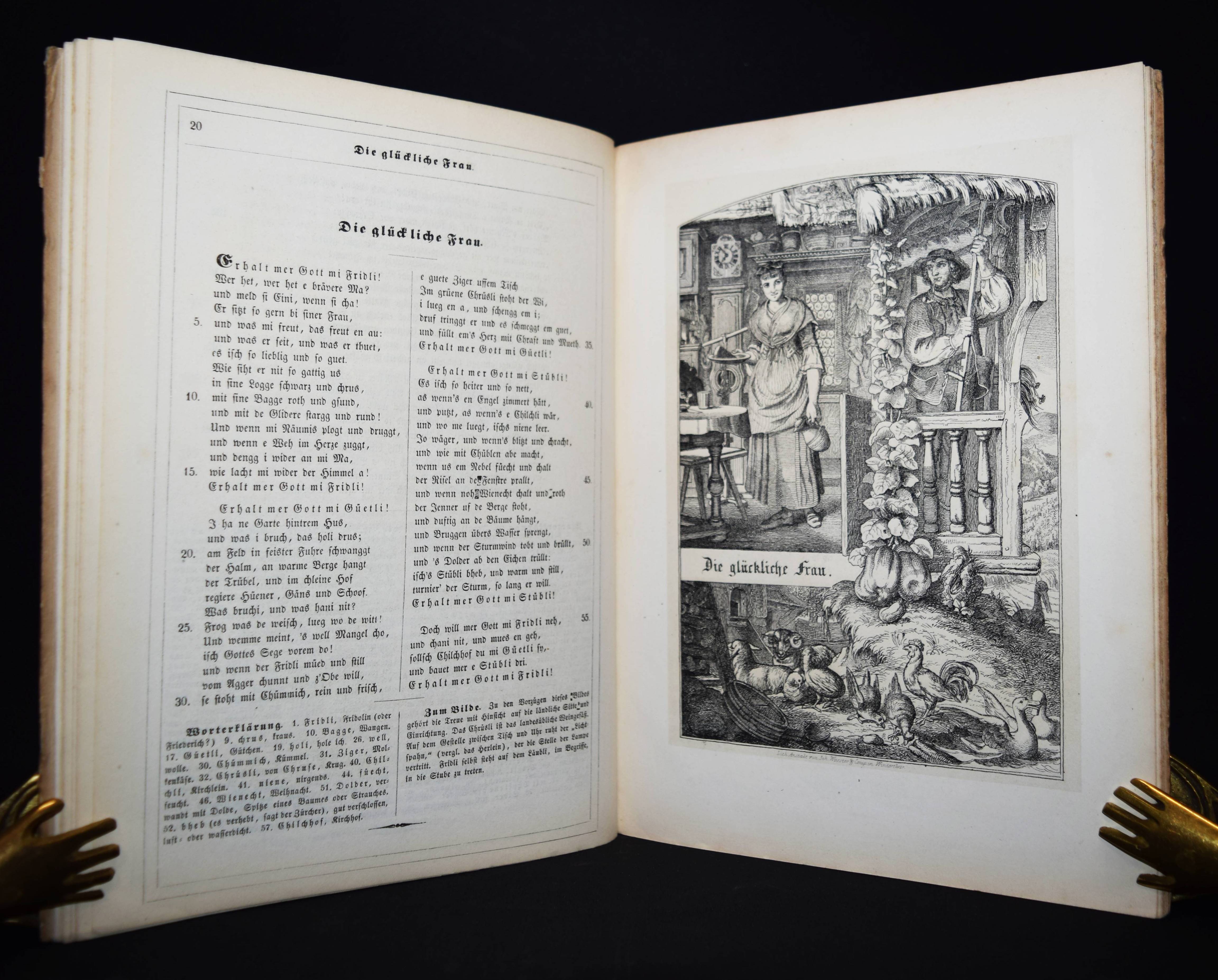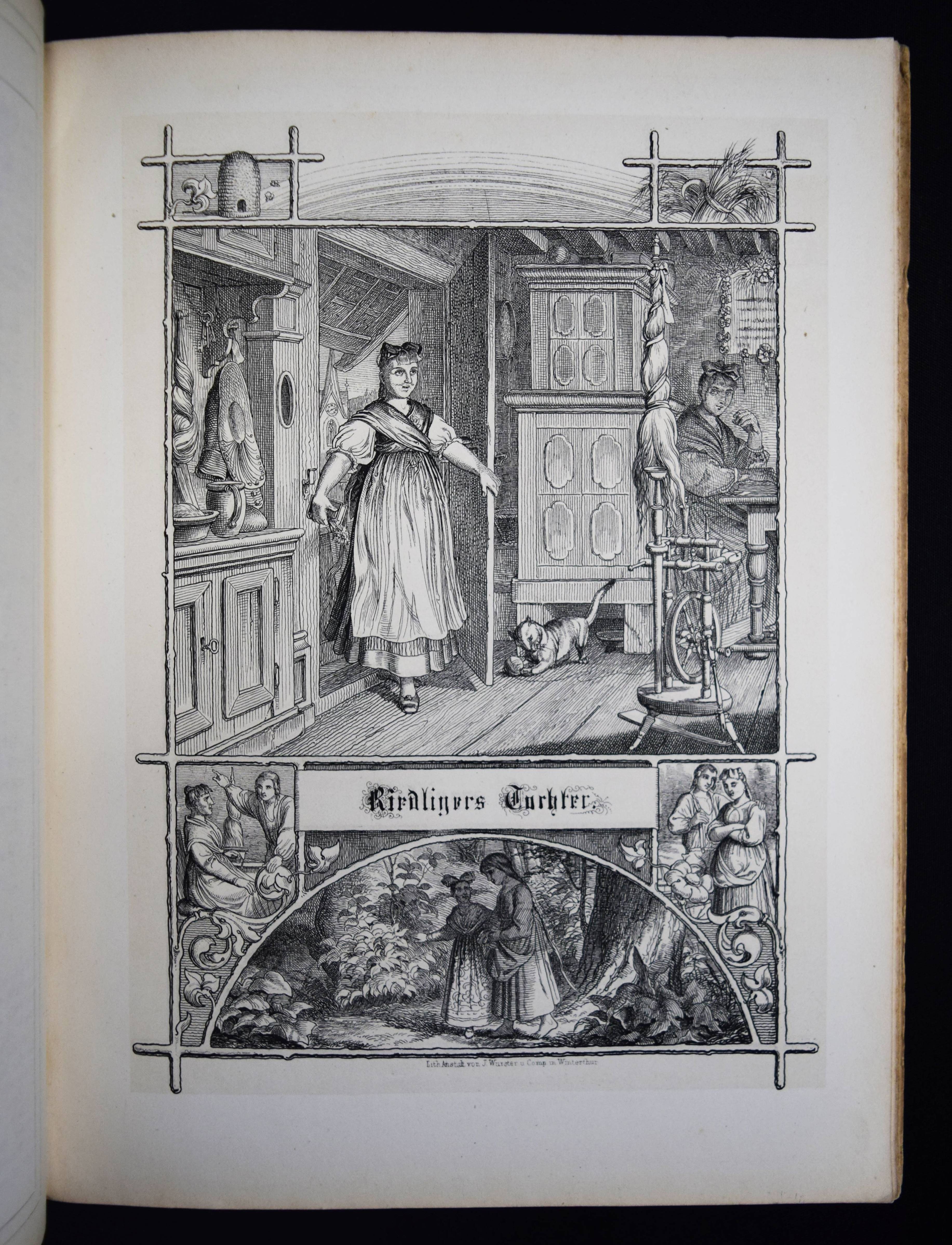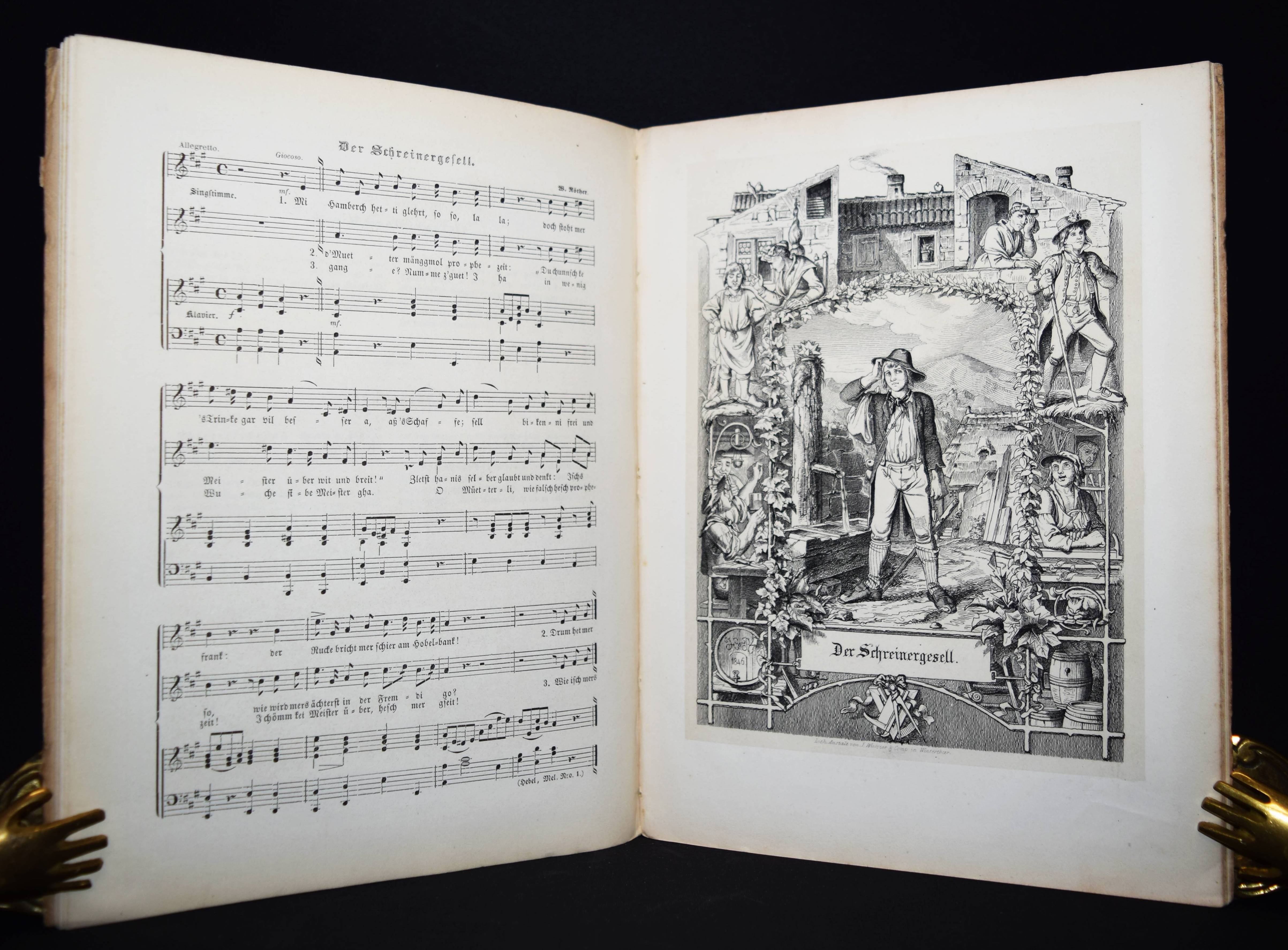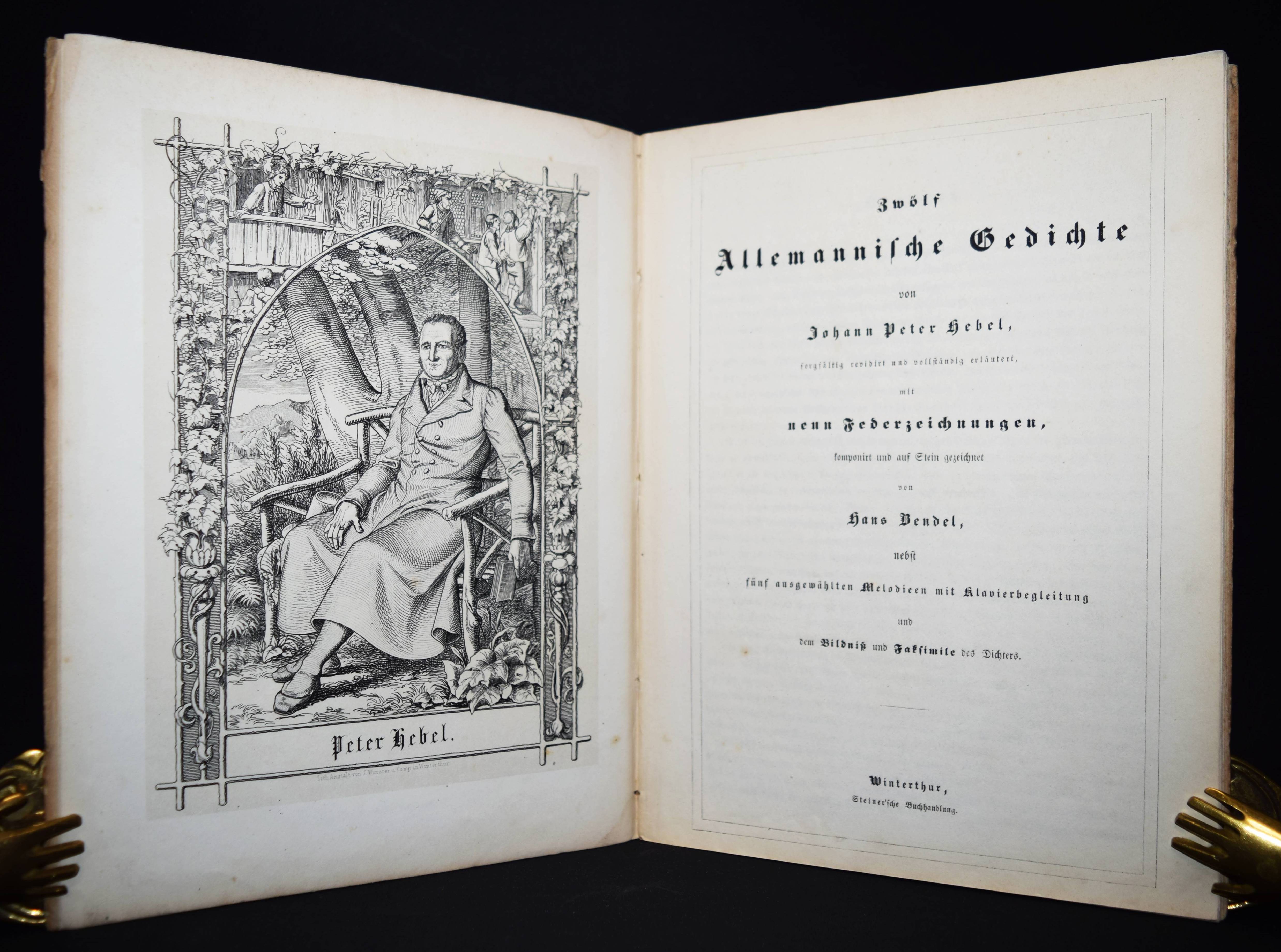 Hebel, Johann Peter. Zwölf Allemannische Gedichte, sorgfältig revidirt und vollständig erläutert, mit neun Federzeichnungen, komponirt und auf Stein gezeichnet von Hans Bendel, nebst fünf ausgewählten Melodieen mit Klavierbegleitung und dem Bildniß und Faksimile des Dichters. Winterthur, Steiner (1849). 4°. [2] Bl., 26 S. u. 9 lithogr. Tafeln mit Tonplatte sowie 5 Musikbeilagen u. 2 S. lithogr. Faksimile. Illustr. OHln. Dieffenbacher, Hebel-Illustratoren 17. Goed. VII, 538. Rümann 127. – Einzige Ausgabe mit diesen Illustrationen. – Hans Bendel war Schüler von Kaulbach. – Deckel etwas angestaubt und leicht fleckig, vereinzelt etwas stockfl., gutes Exemplar.