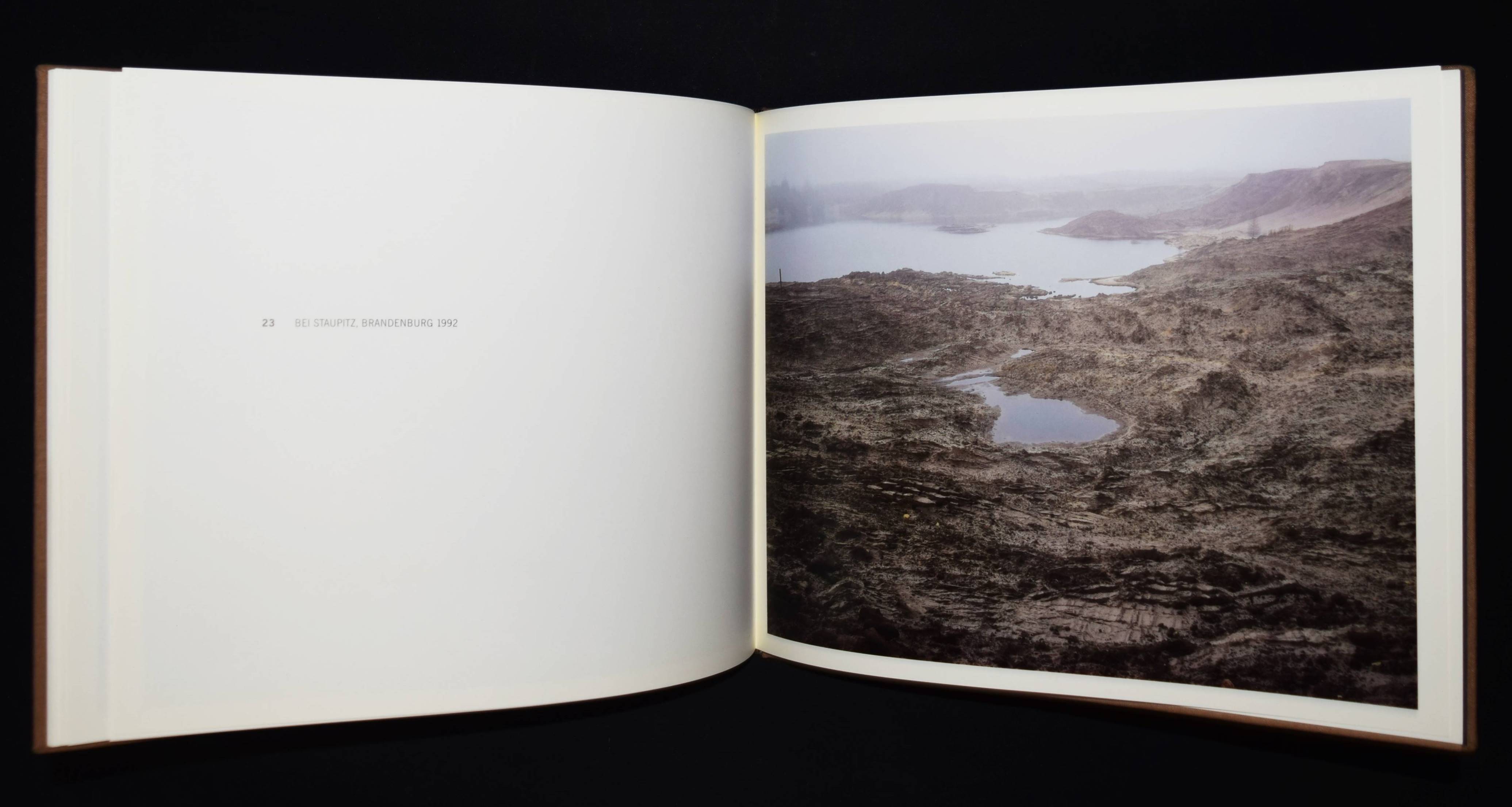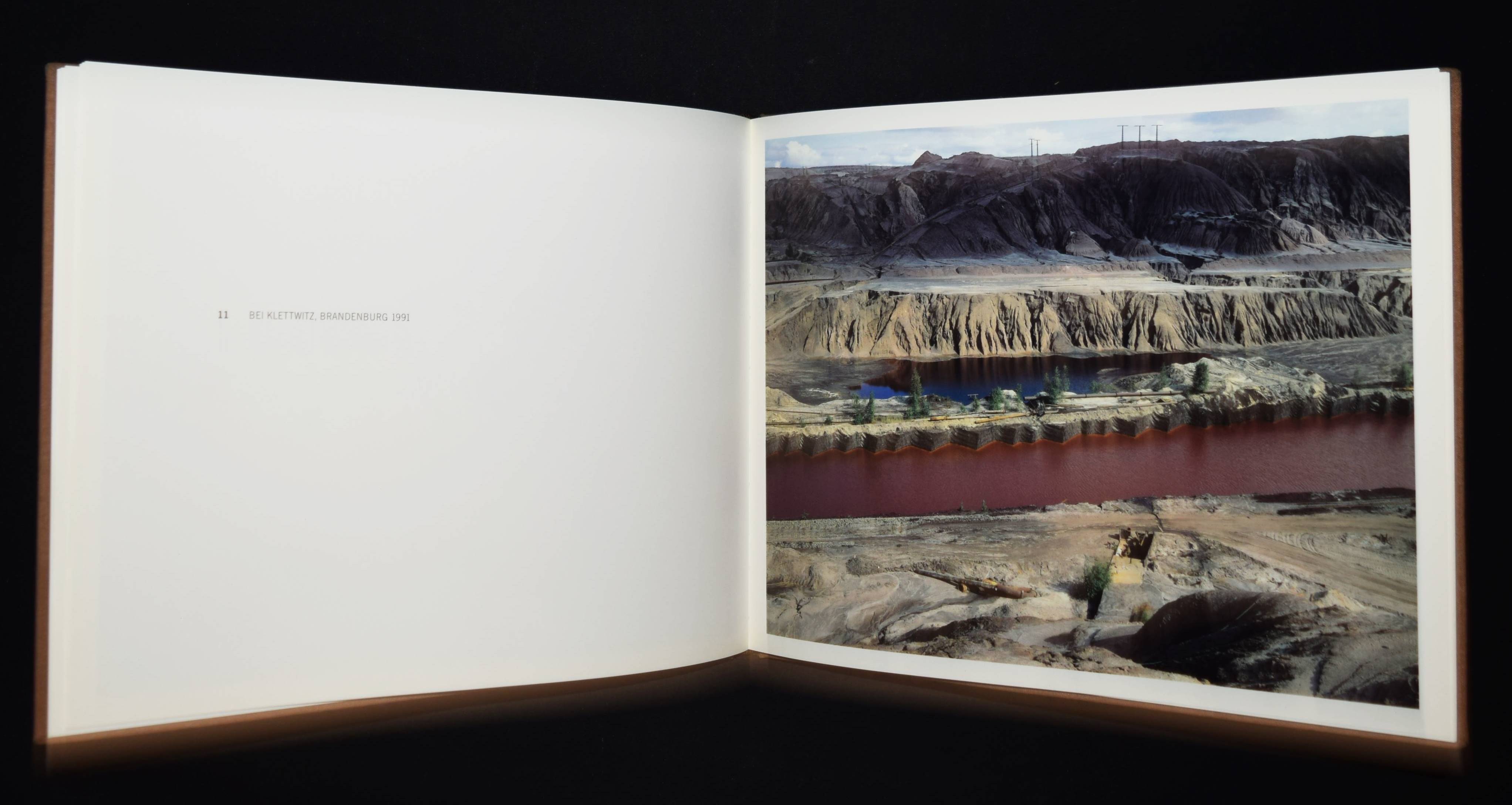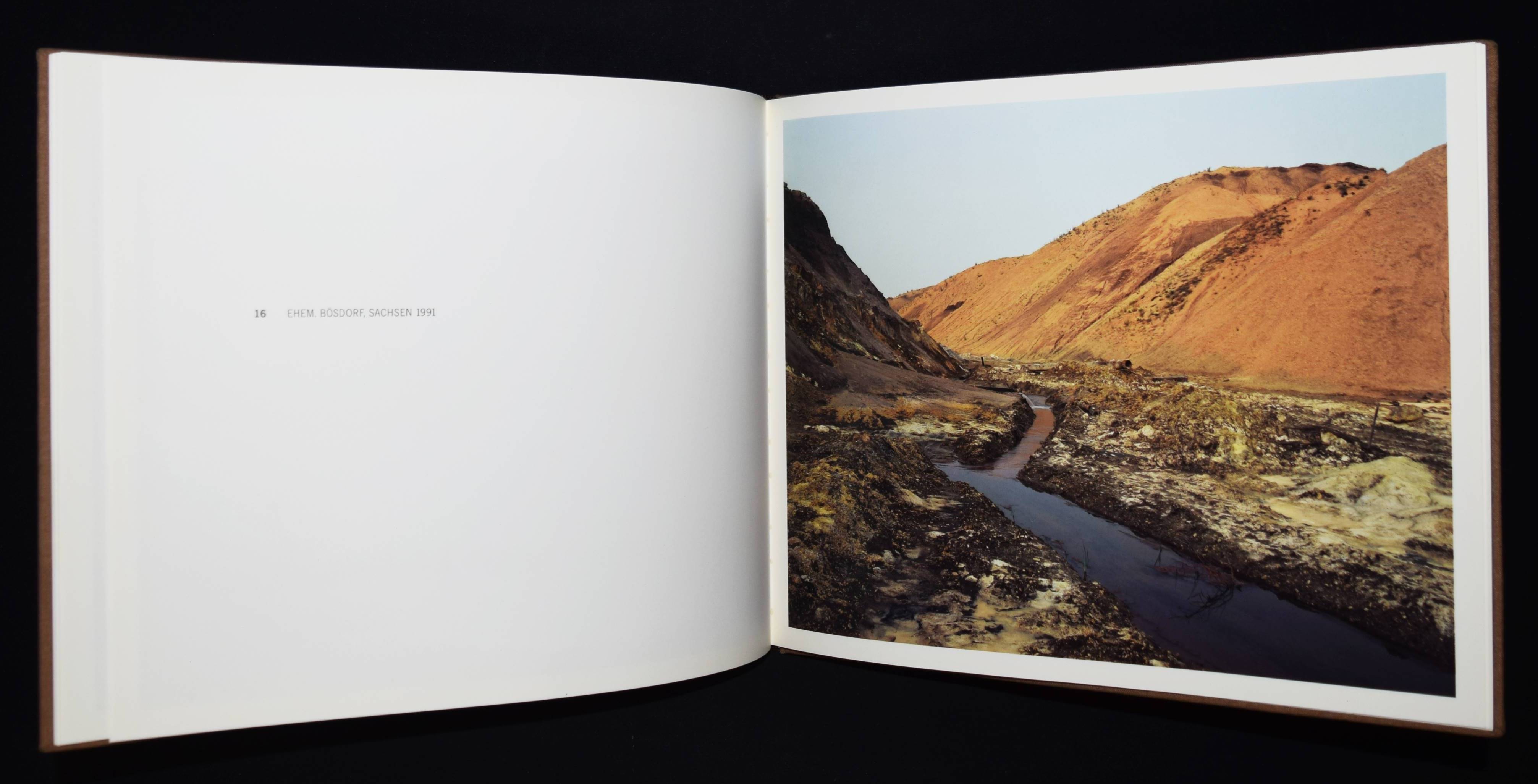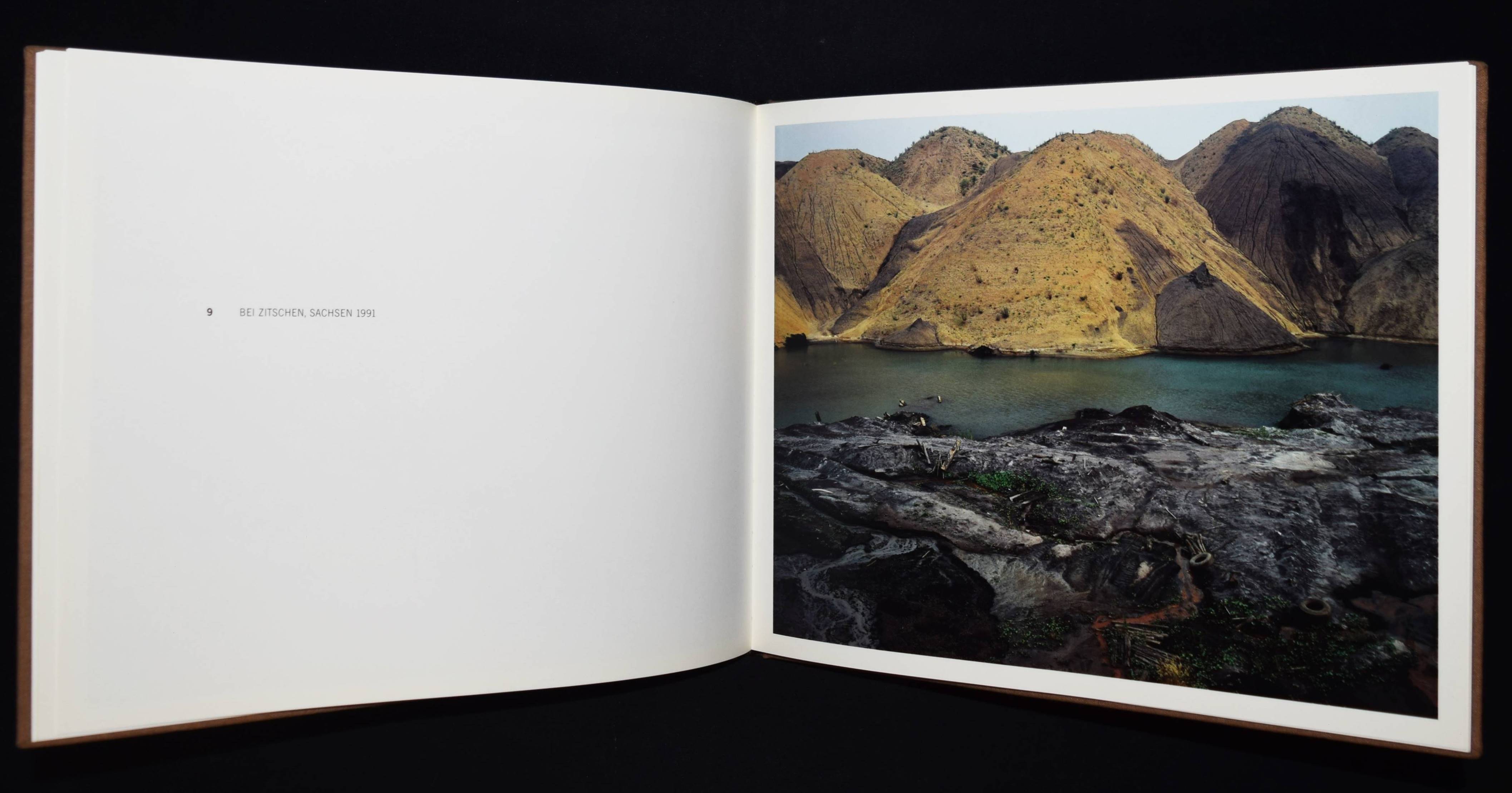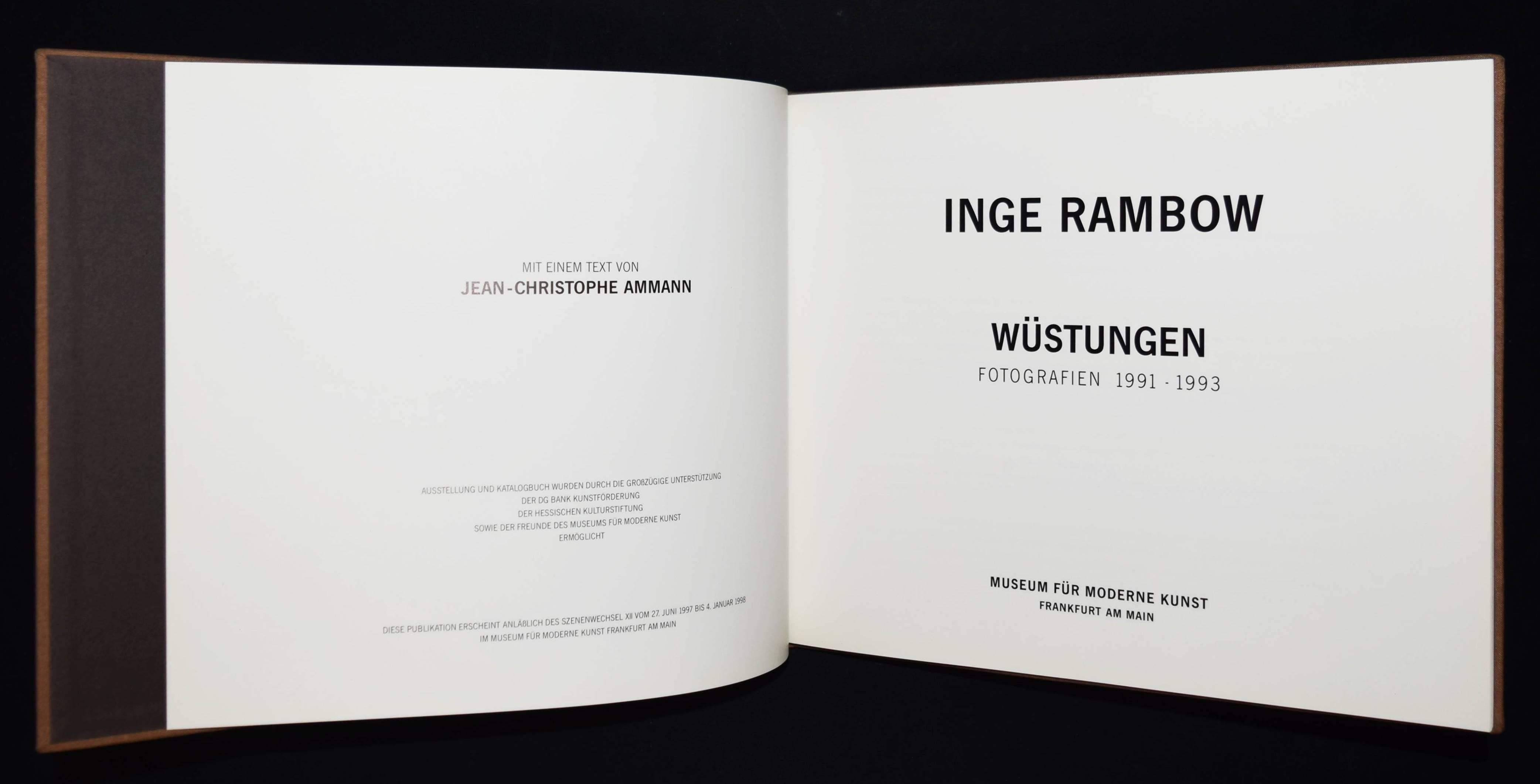 Rambow, Inge. Wüstungen. Ostdeutsche Landschaften 1991-1993. (Mit einem Text von Jean-Christophe Ammann und einem Interview zwischen Gerald Gutsch und I. Rambow).). Frankfurt am Main, Museum für Moderne Kunst (1998). Quer-4°. [72] S. mit 24 Farbtafeln (davon die erste als Deckelbild) und 5 Orig.-Farbphotographien (auf Ilfochrome Classic, 30 x 25,5 cm.). Orig.-Leinenband mit farb. Deckelbild. Deutschland im Fotobuch 70. – Einzige Ausgabe. – Vorzugsausgabe mit 5 Orig.-Farbphotographien (im Buch auf Tafel 10, 23, 11, 2 und 17 abgebildet). – „Inge Rambows zwischen 1991 und 1993 unternommene Ausflüge in die neuen Bundesländer galten den Restlöchernd es Braunkohlentagebaus im Bereich Leipzig. Man wähnt sich auf dem Mond, so irreal erscheinen die mit Schrunden übersäten Abhänge, und so giftig wirken die Tümpel an der Sohle der ausgekohlten Löcher. Heute ist das alles anders, denn die Krater wurden zu Freitzeitlandschaften geflutet. Doch die in der Tradition der amerikanischen Canyonfotografie mit der Großformatkamera aufgenommenen Wüstungen entfalten in dem perfekt gedruckten Buch nochimmer einen erhabenen Schauer, der sich aus dem Zusammenprallen des vor Rambows Kamera real vorhandenen Schreckens der „Devastierung“ und der Ästhetik und delikaten Farbigkeit der Bilder speist“ (T. Wiegand). – Sehr gutes Exemplar.