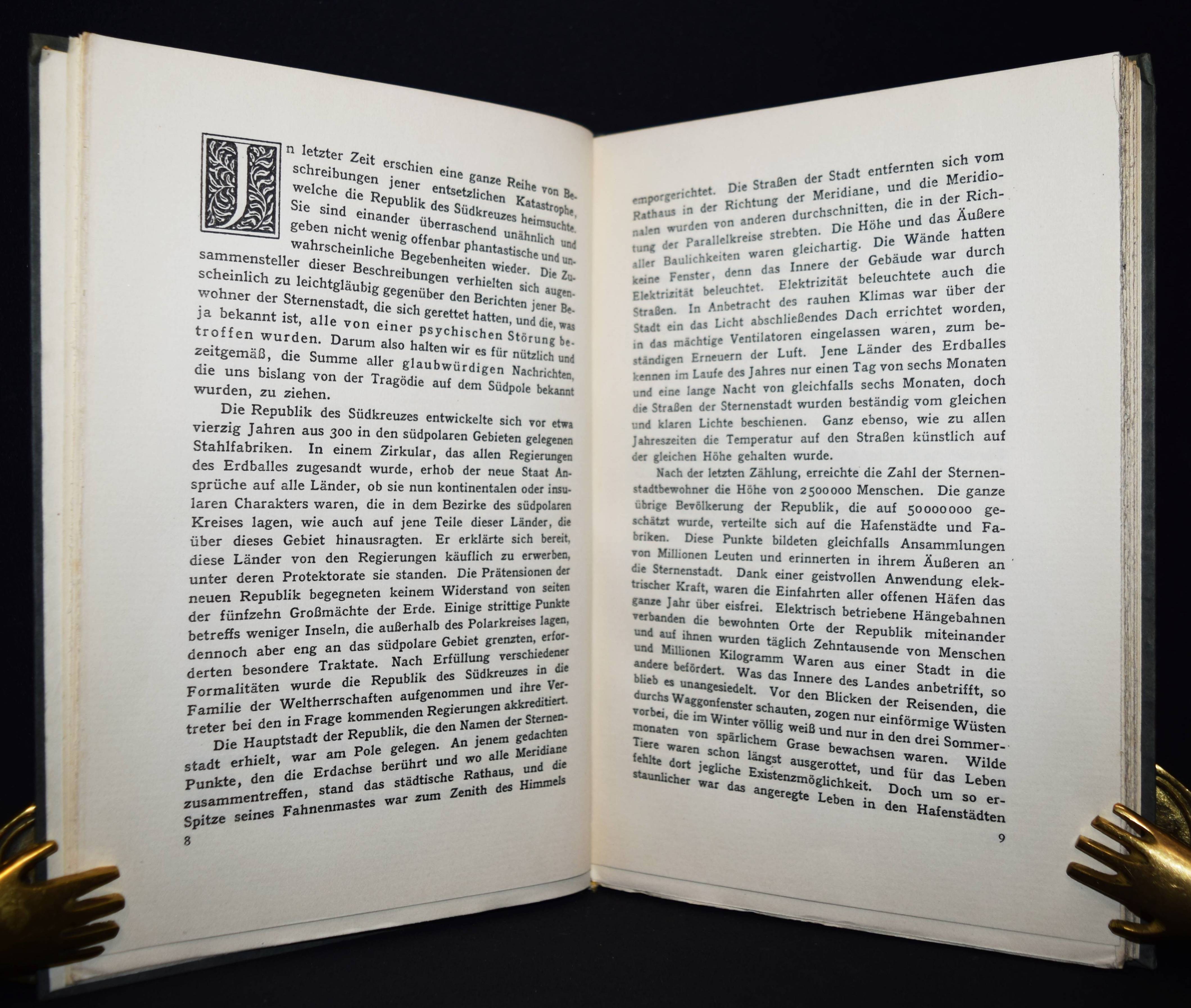 Brjussoff (Brjusov), Valerij (Jakovlevic). Die Republik des Südkreuzes. Novellen. „Dieses Exemplar gehört zur 2. Auflage.“ München, Hans von Weber 1908. Gr.-8°. 108 S., [1] Bl. OPbd. mit goldgepr. Rücken- und Deckeltitel und goldgepr. Deckelillustration. Hayn/G. I, 472. KNLL III, 190. – Erste deutsche Ausgabe. – Als 2. Auflage bezeichnete Normalausgabe, neben der gleichzeitig erschienen Vorzugsausgabe in 50 Exemplaren. – Die russische Originalausgabe erschien 1905 in Moskau. – Die dystopische Titelgeschichte schildert den Zusammenbruch einer fiktiven Wohlfahrtsdiktatur in der Antarktis. – „Mit Vergewaltigung, Mord, Raub, Menschenfresserei und Totschlag richtet sich das Volk in einem letzten Bacchanal der Grausamkeiten und sexuellen Exzesse selbst zugrund“. Brjussovs Zivilisationskritik geht „von Nietzsches Kategorie des Dionysischen aus, das die ‚dünne, obgleich jahrtausendealte Rinde‘ der Kultur durchbricht“ (KNLL III, 190). – Enthält außerdem die Novellen: „Die Schwestern“, „Im unterirdischen Kerker“, „Die letzten Märtyrer“, „Jetzt wo ich erwacht bin“, „Im Spiegel“ und „Das Köpfchen aus Marmor“. – V. J. Brjusov (1873-1924), Begründer des russischen Symbolismus, „trat 1920 im Gegensatz zu den anderen Symbolisten der Kommunistischen Partei bei. In verschiedenen Positionen künstlerischer Institutionen vor allem organisatorisch tätig, begründete er 1921 die Hochschule für Literatur und Kunst“ (Wikipedia). – „(W)enn Brjussof nicht so selbständig wäre, [könnte man] ihn gern den russichen Poe oder Hoffmann nennen“ (Aus dem Verlagsprospekt, zitiert nach Hayn/Gotendorf). – Sehr gutes sauberes Exemplar.