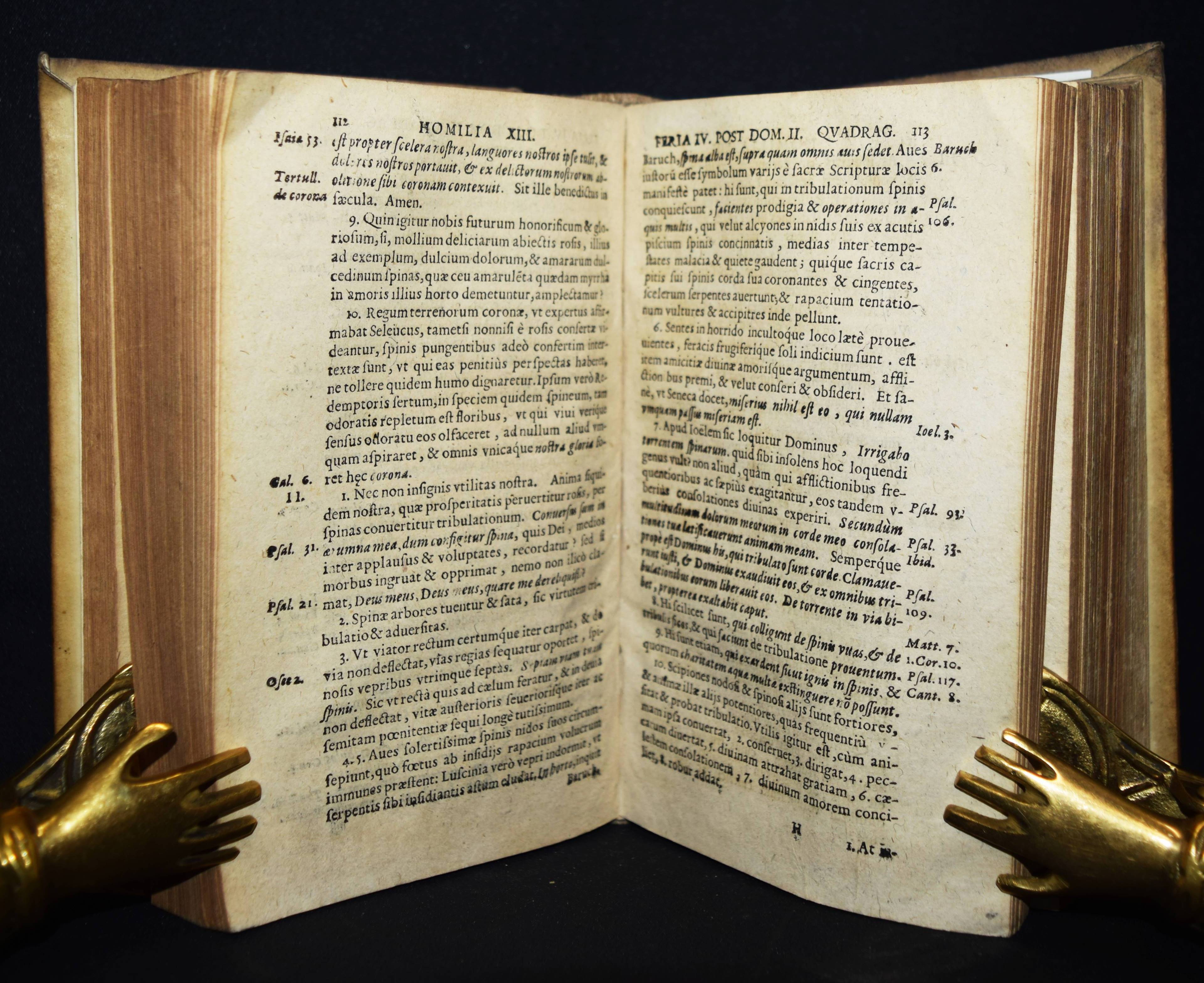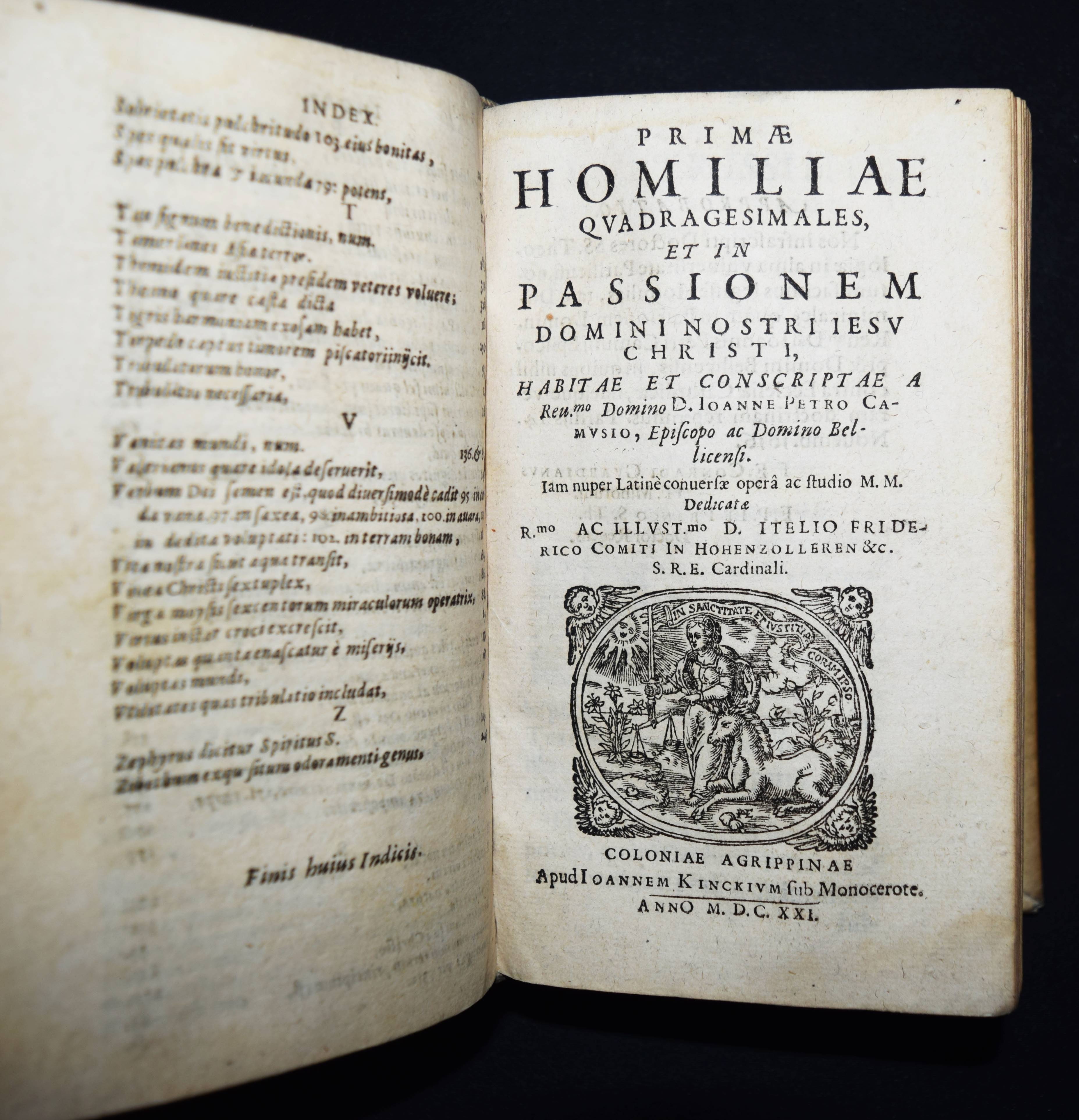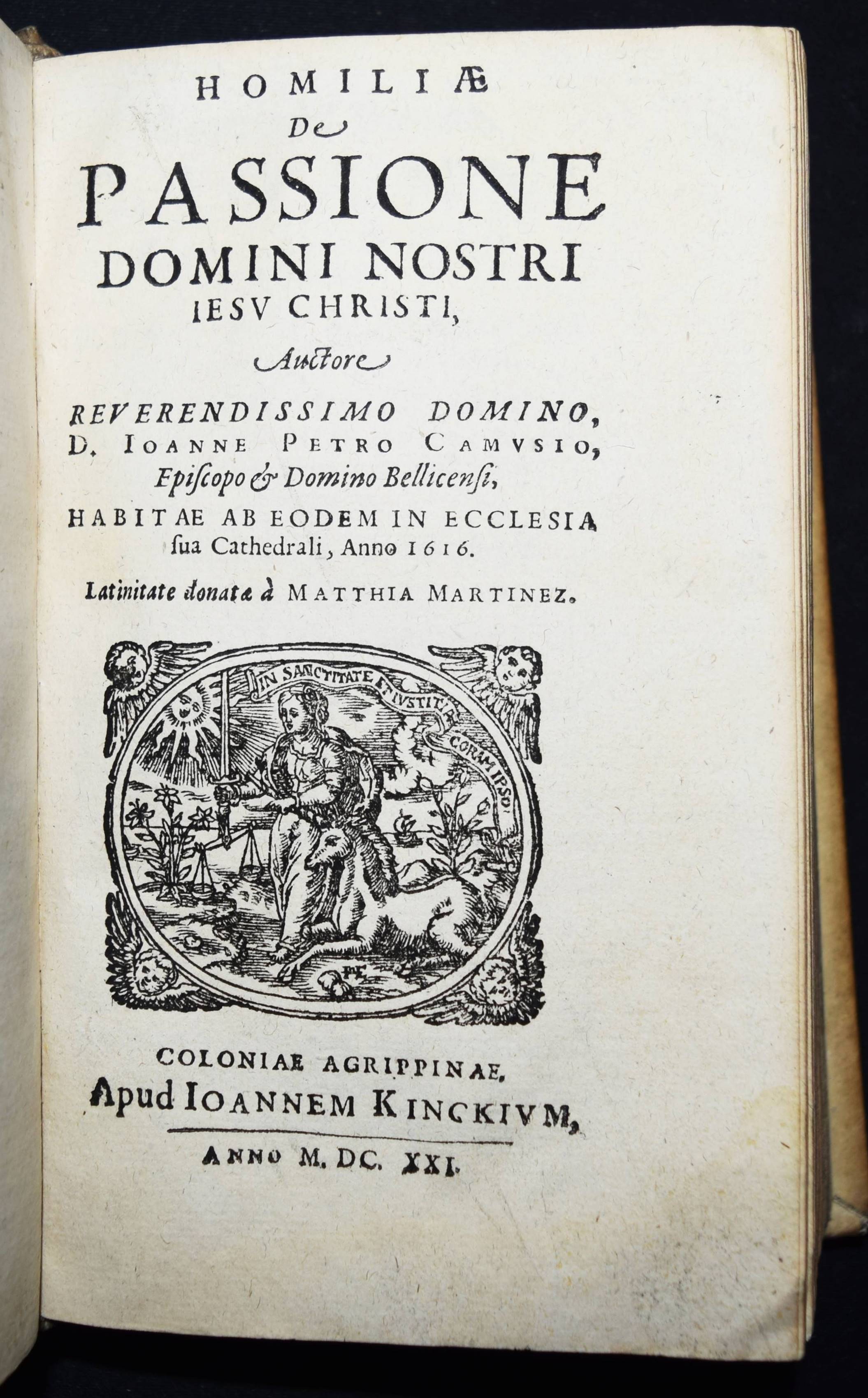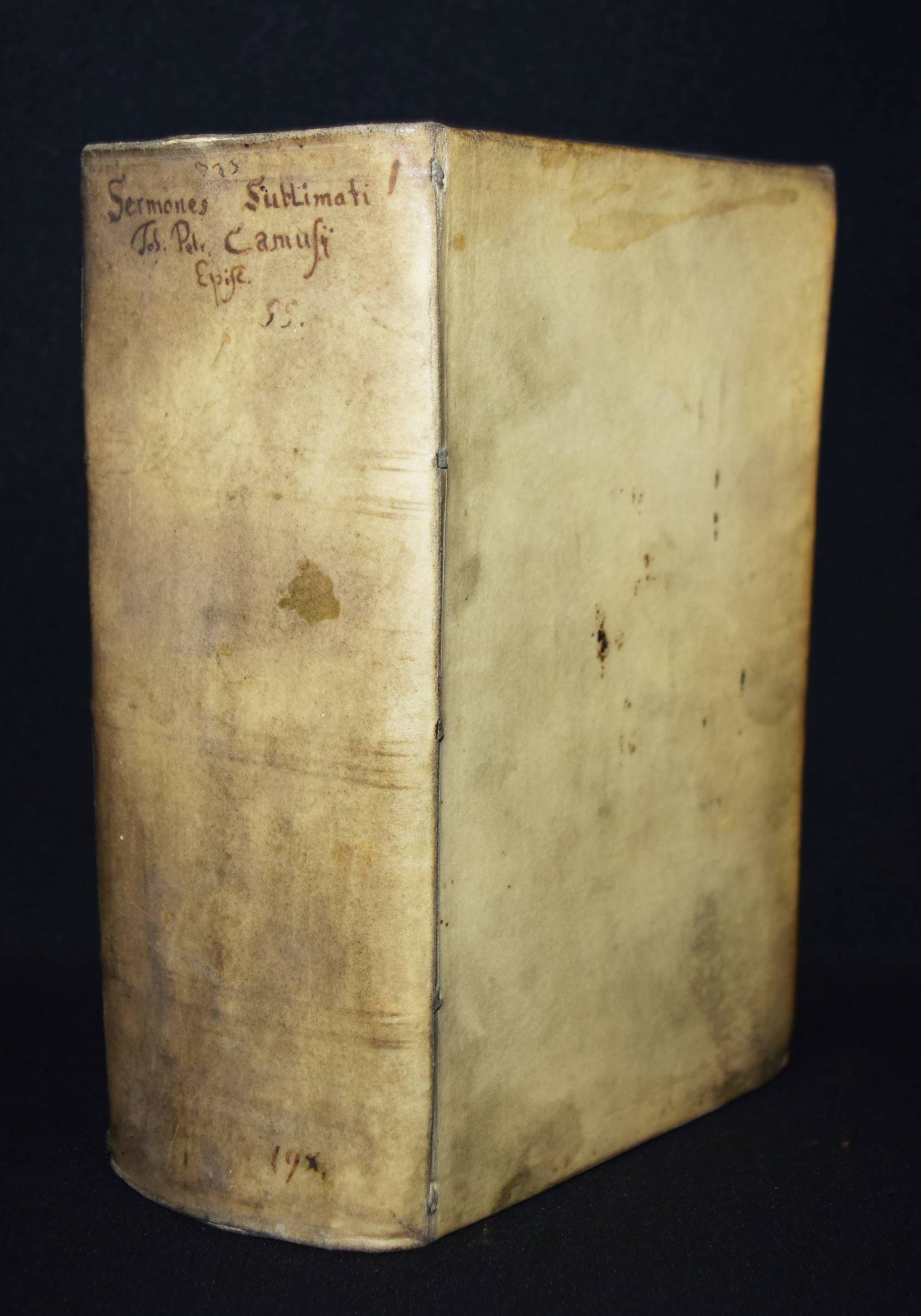 Camus, Jean Pierre. Sermones sublimati, seu homiliae dominicales et festivales. Beigebunden: Ders. Primae homiliae quadragesimales et in passionem Domini nostri Jesu Christi habitae et conscriptae… – Beigebunden: Ders. Homiliae de passione Domini nostri Jesu Christi. 3 Teile in 1 Band. Coloniae Agrippinae (Köln), J. Kinch 1619-1621. 8°. [8] Bl., 361, (6) S.; 384, (7) S.; [8] Bl. (1 w.), 491, (3) S. Prgt. der Zeit mit handschr. Rückentitel. VD 17 23:273998R. – Umfangreiche Predigtsammlung des franz. Bischofs und Barockschriftstellers. – Jean-Pierre Camus (1584-1652) wurde 1609 von Franz von Franz von Sales zum Bischof von Belley geweiht. 1650 wurde er zum Bischof von Arras berufen, starb aber vor Antritt seines Amtes. – „Bischof Camus war einer der fruchtbarsten Autoren der französischen Sprache. Im Dienste der katholischen Gegenreform schrieb er rund zweihundert erbauliche Romane, in denen er mit der drastischen Schilderung sündigen Verhaltens abschreckend wirken wollte und damit zum Vorläufer des roman noir wurde. Seine größte Leistung sind die zehn Bände mit dem Titel Diversités (1608–1618), die nach dem Vorbild der Essais von Montaigne mit großer humanistischer Gelehrsamkeit verfasst sind“ (Wikipedia). – Einband etwas angestaubt, gutes Exemplar.
