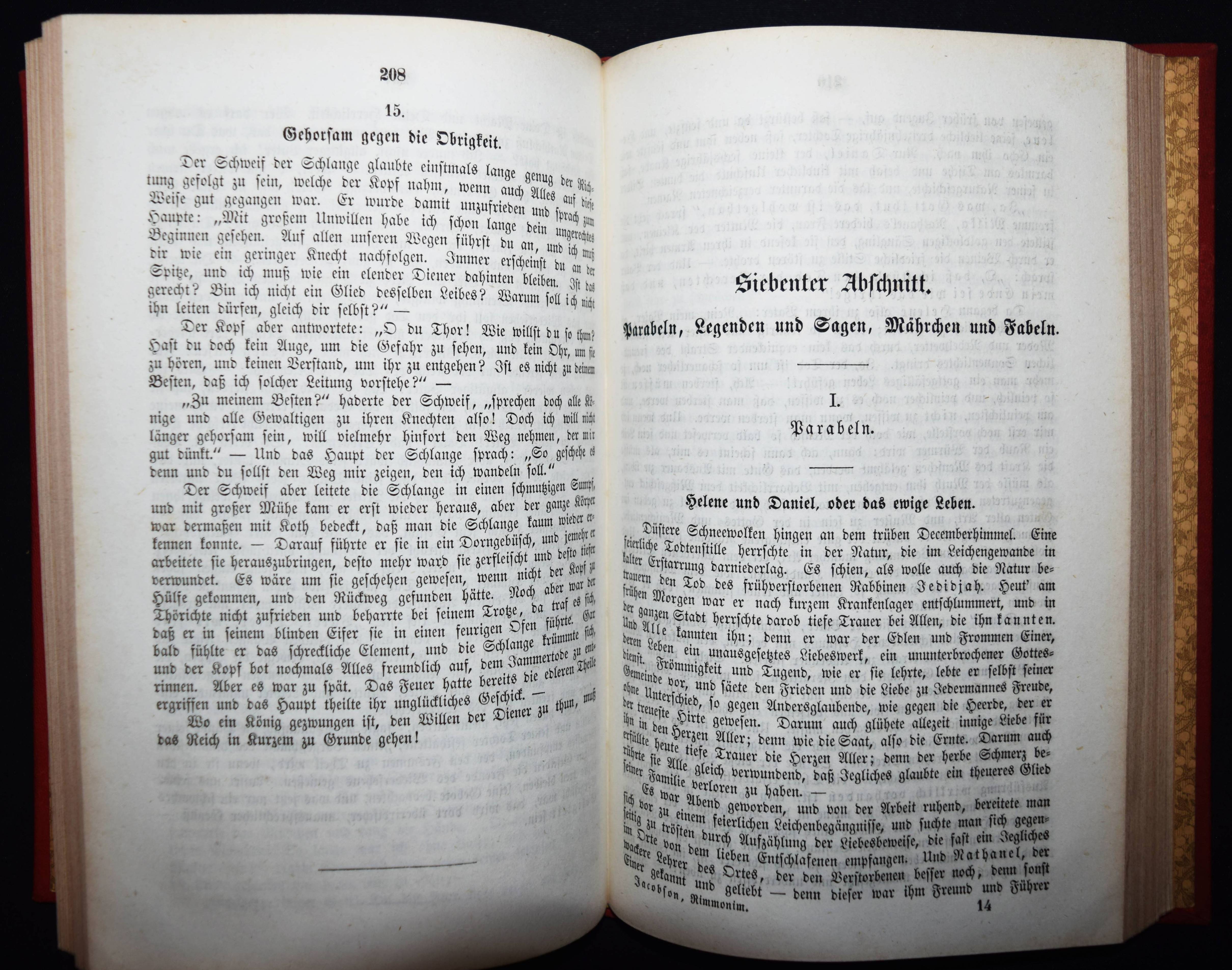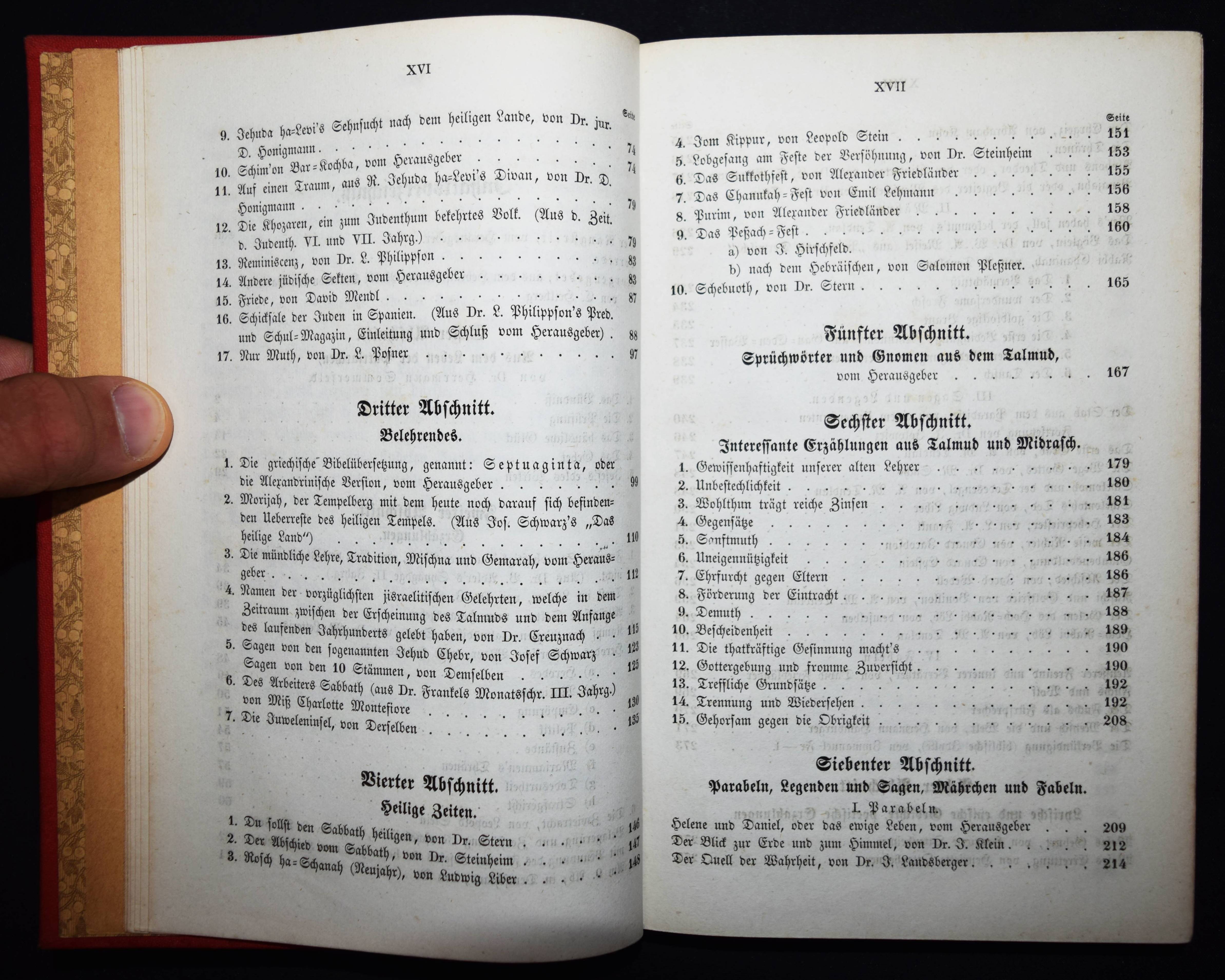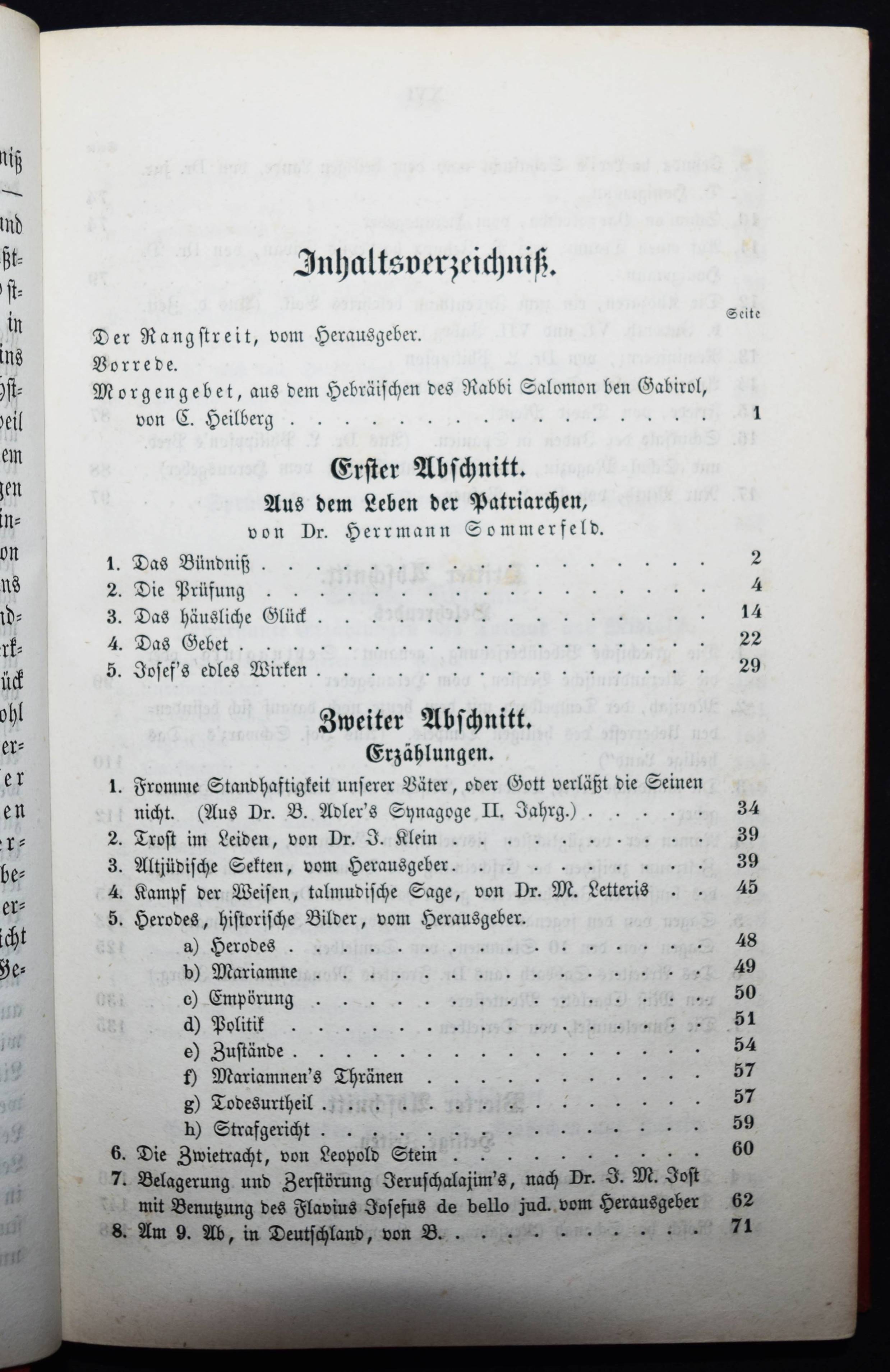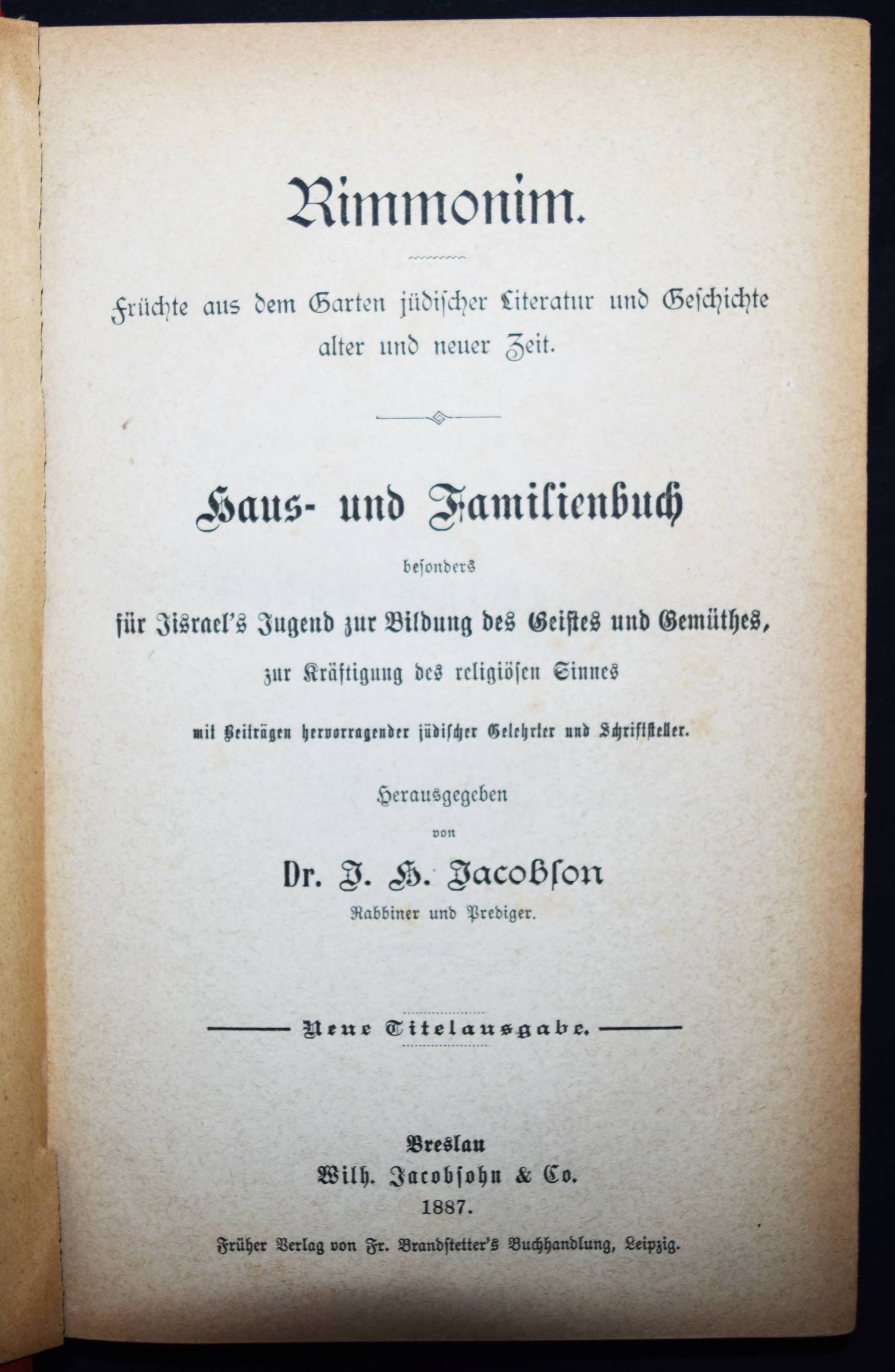 Jacobson, J(akob) H(irsch, Hrsg.). Rimmonim (Granatäpfel). Früchte aus dem Garten jüdischer Literatur und Geschichte alter und neuer Zeit. Haus- und Familienbuch besonders für Israel’s Jugend zur Bildung des Geistes und Gemüthes, zur Kräftigung des religiösen Sinnes mit Beiträgen hervorragender jüdischer Gelehrter und Schriftsteller. Neue Titelausgabe. Breslau, Wilh. Jacobsohn & Co. 1887. 8°. XX, 391, (5) S. Schwarzgepr. OLn. mit goldgepr. Rücken- und Deckeltitel und Goldschnitt. Shavit/Ewers 1094. – Neuauflage des zuerst 1859 erschienen jüdischen Lesebuchs mit dem Untertitel „Ein deutsches Lesebuch für Jisraeliten in Schule und Haus“. – „Die Rimonim („Granatäpfel“) sind äußere bekrönende Aufsätze der beiden hölzernen Rollstäbe einer Torarolle. „Neben dem Tora-Schild erhält die Tora-Rolle durch Krone oder Rimmonim einen zusätzlichen Schmuck …“ (Wikipedia). – „Eine deutschsprachige Anthologie, ebenso als Ergänzung des Lehrwerks „Awtalion“ wie als eigenständiges Lesebuch publiziert. Die vornehmlich an die ältere jüdische Jugend gerichtete Sammlung lyrischer und prosaischer Texte wurde nach den als Granatäpfeln gestalteten Aufsätzen der Tora-Stäbe benannt. Im Vorwort wird die kulturspezifische Lesebuchedition als eine Zusammenstellung „erhebenden und belehrenden, Geist und Gemüth bildenden und veredelnden Materials, angemessen dem Alter und der Bildungsstufe der Jugend“ (XII) gerechtfertigt. Das Lesebuch bietet in neun Abschnitten Texte aus der älteren und jüngeren Literatur sowie zur Geschichte der Juden … Die Beiträge stammen u.a. von D. Friedländer, C. S. Günsburg, D. Honigmann, J. H. Jacobson, I. M. Jost, I. Klein, M. Letteris, L. Philippson, S. Pleßner, M. Sachs, L. Stein, A. M. Tendlau“ (A. Völpel in Shavit/Ewers zu dieser Ausgabe). – Vorsätze, Titelblatt und das letzte Blatt papierbedingt gebräunt, sehr gutes Exemplar im dekorativen Verlagseinband.
