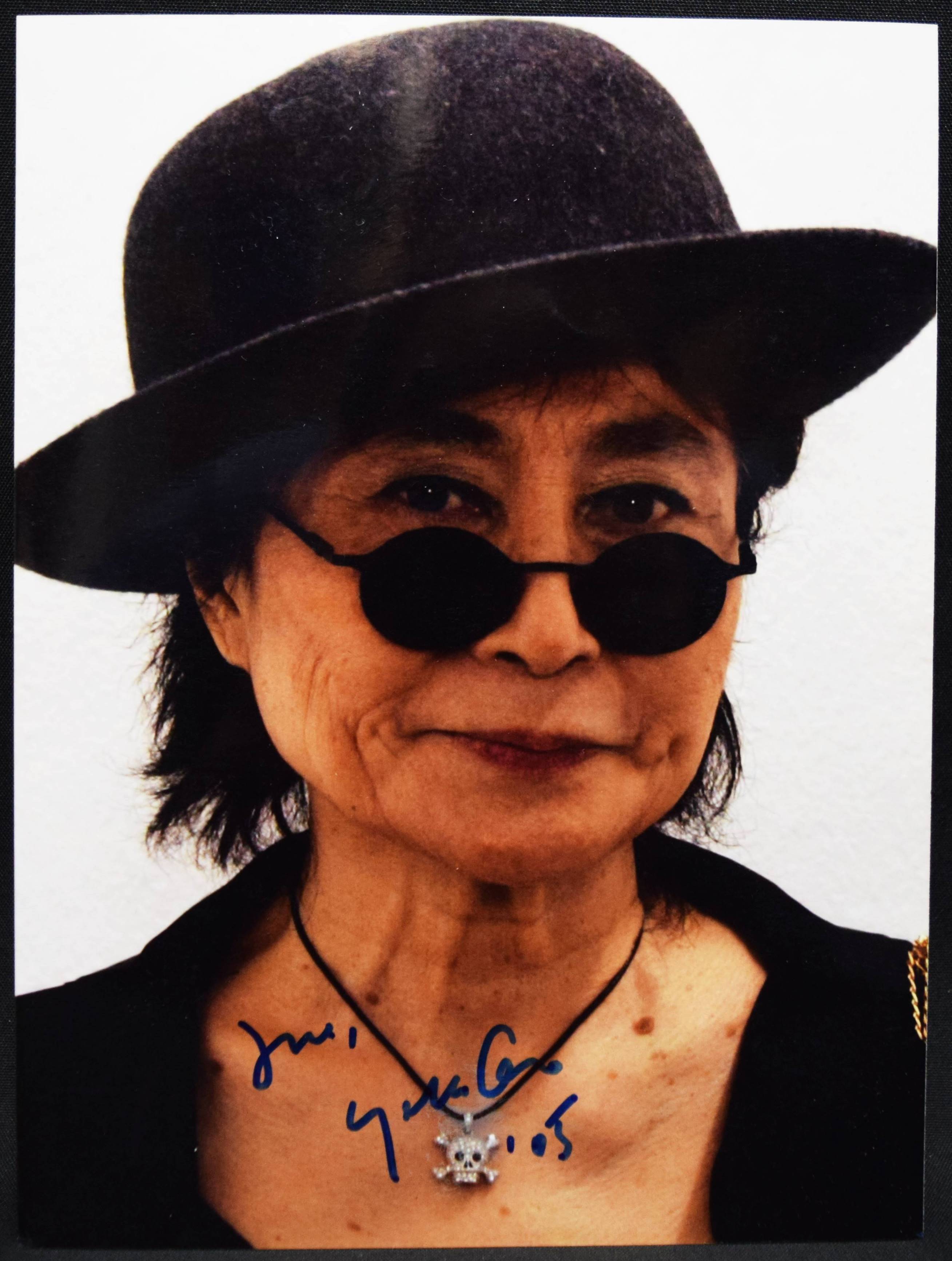 Ono(-Lennon), Yoko. Conceptual Photography. Edited by Jon Hendricks. (Introduction: Lars Schwander. Translation: Pamela Starbird. Photography: Larry Bercow, Jon Hendricks & Lain Macmillan). (Kopenhagen), Tiger Stories (2015). Quer-4°. [80] Bl. mit teils fab. Abb. Orig.-Pappband mit Bauchbinde (Bellyband, 3-sprachiger Text: Dänisch, Englisch, Japanisch). „Rearrange the photos in your mind“ (Yoko Ono, January 31st 2015). – Dazu: Orig.-Farbphotographie (auf Fujicolor Crystal Archive Paper Supreme, 20,5 x 15 cm.) mit eigenhändiger Widmung von Yoko Ono „Love Yoko Ono (20)05“. Außerdem liegt der mehrfach gefaltete Ausstellungkatalog bei „Yoko Ono Remember Love“ 29 maj – 8 augusti 2004 im Kulturhuset Stockholm. – Ono (geb. 1933), eine der bedeutendsten Vertreterinnen der Fluxus-Bewegung und Teilnehmerin der Documenta 5 (1972) und Documenta 8 (1987), inspirierte John Lennon mit ihrer Lyrik-Sammlung „Grapefruit“ (Tokio 1964) zu seinem bekanntesten Song „Imagine“ (1971). – Sehr gutes Exemplar.