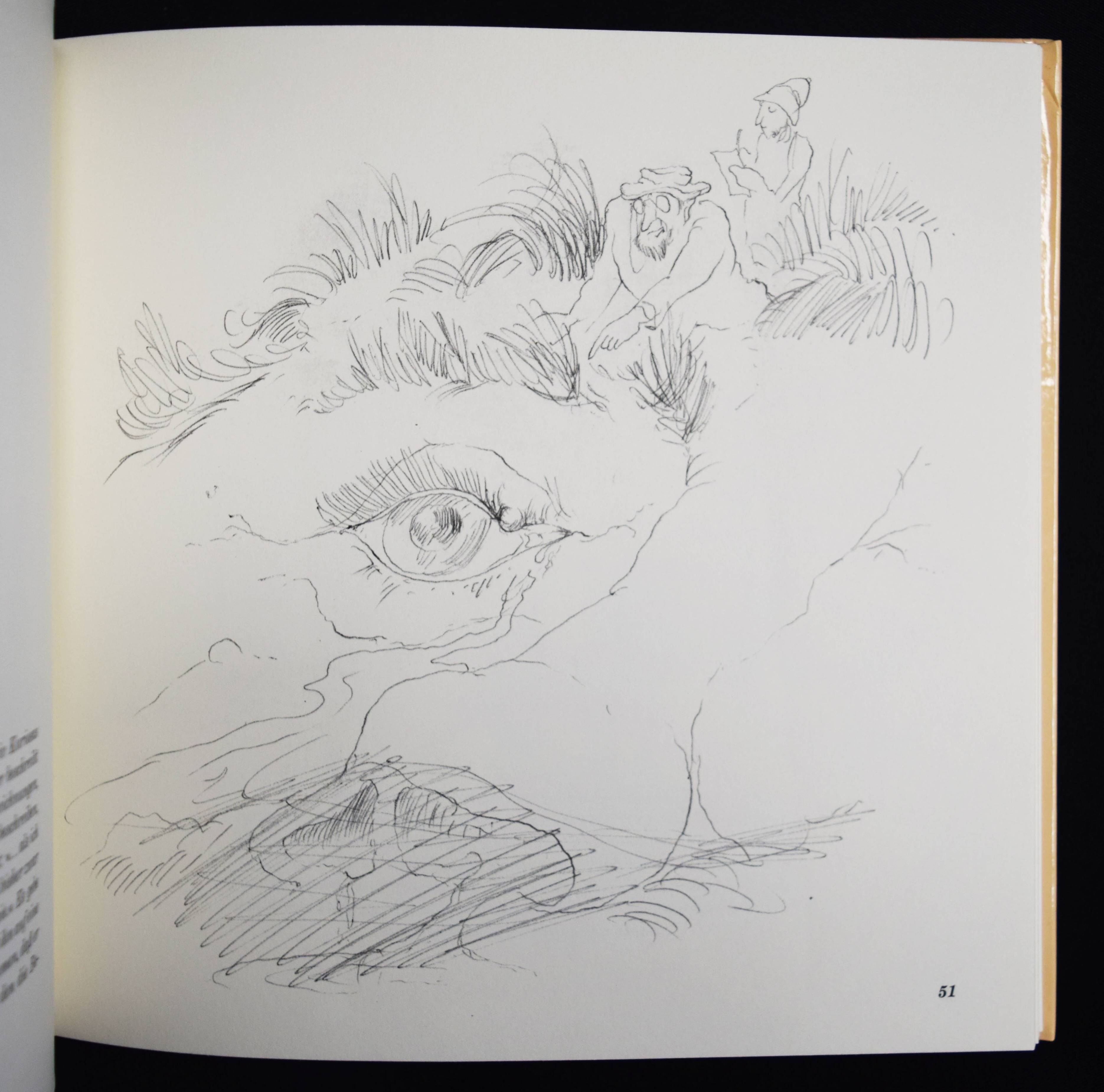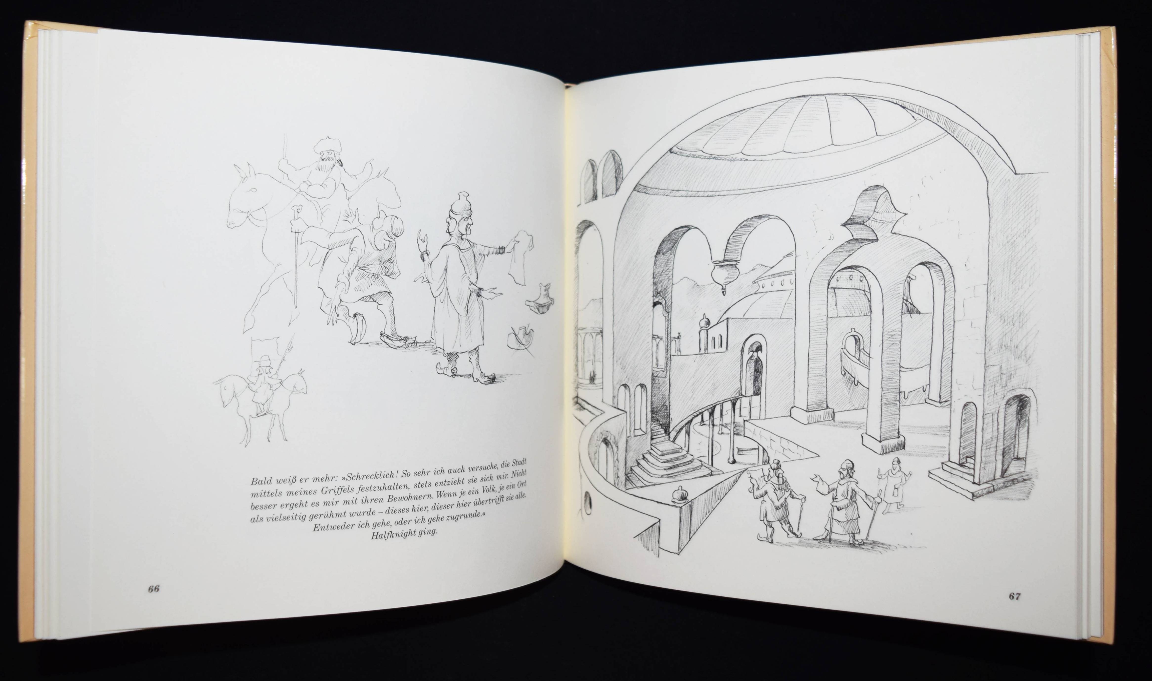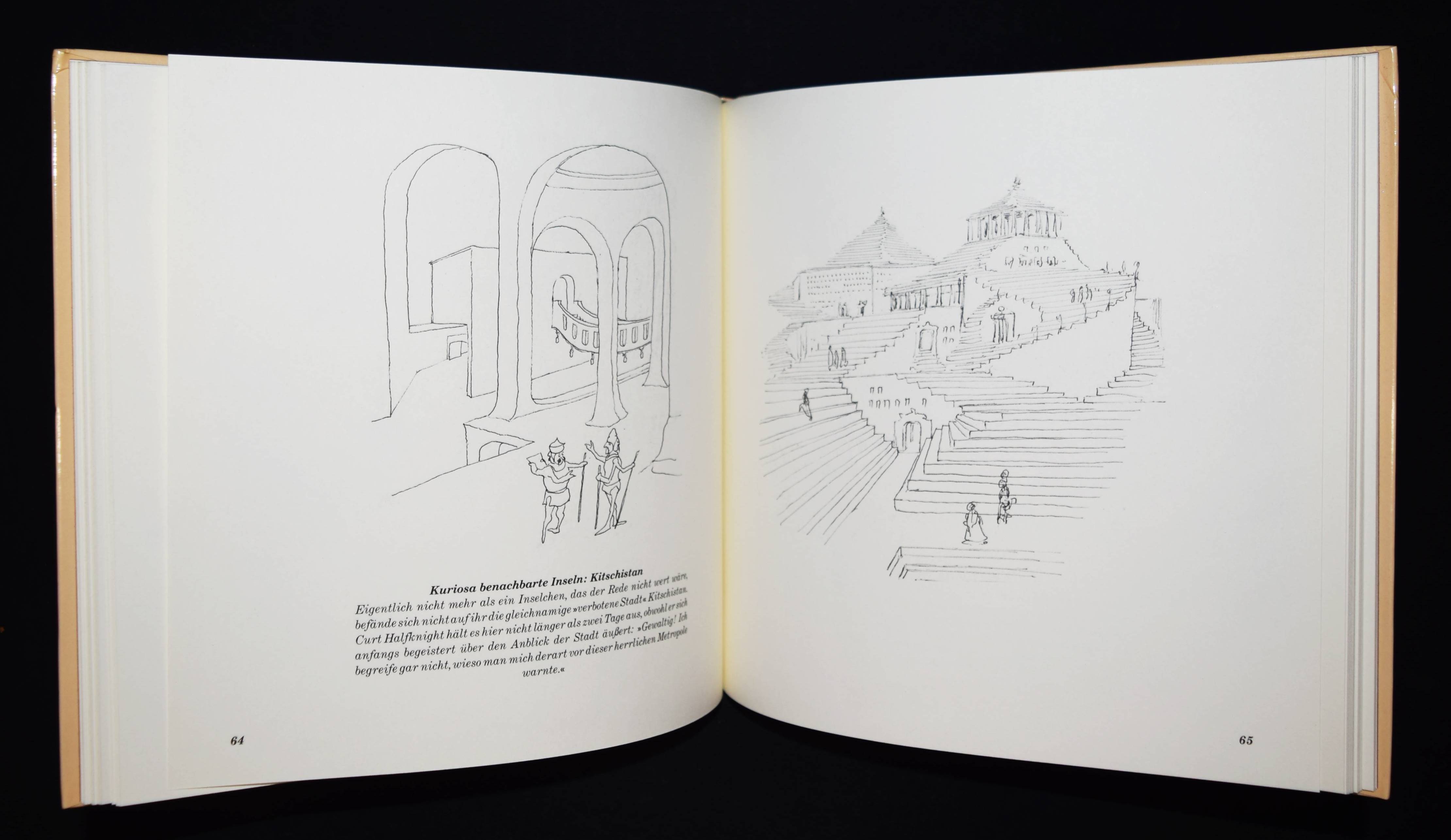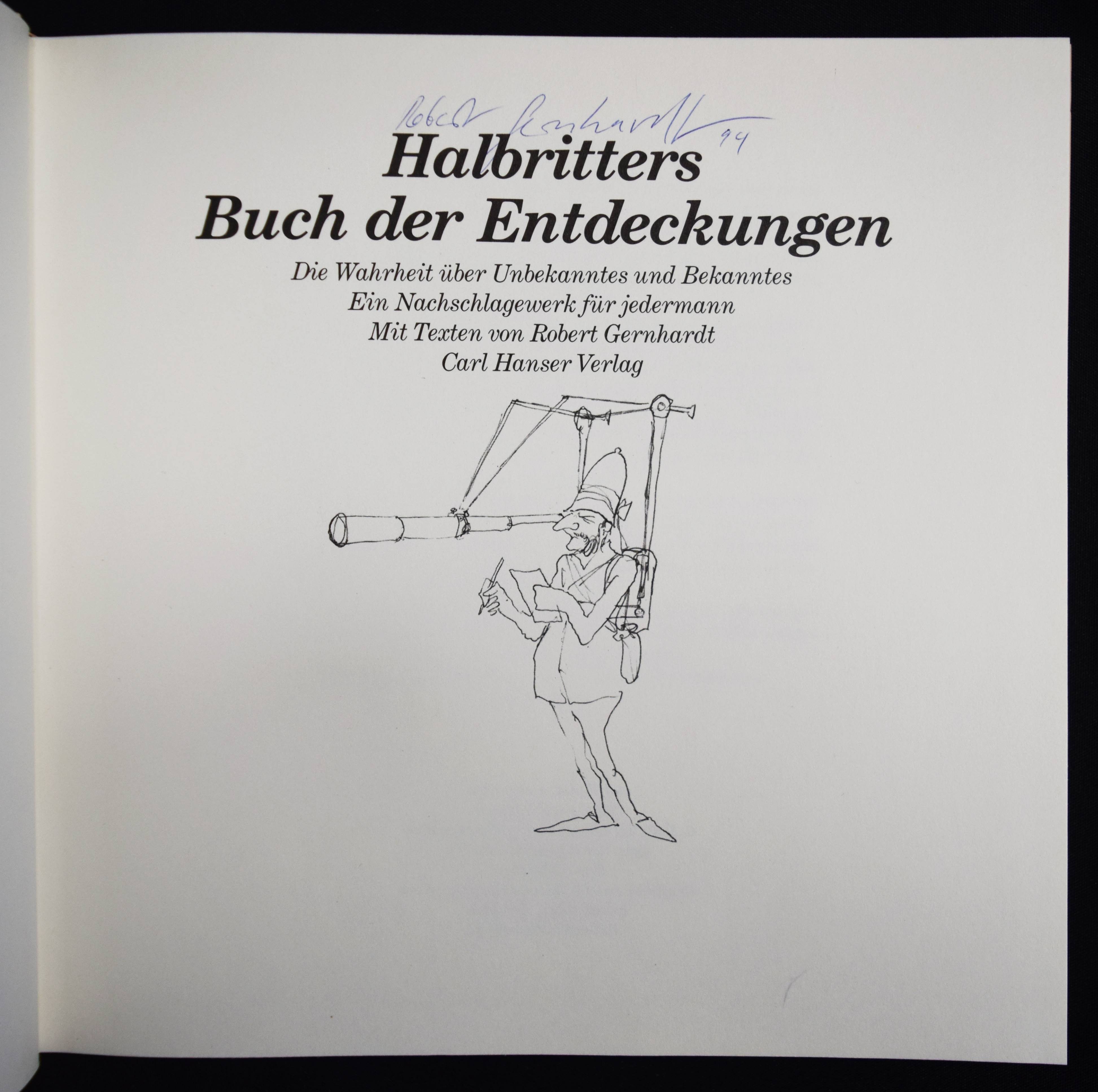 Halbritter, Kurt. Halbritters Buch der Entdeckungen. Die Wahrheit über Unbekanntes und Bekanntes. Ein Nachschlagewerk für jedermann. Mit Texten von Robert Gernhardt. München, Wien, Carl Hanser (1980). Quer-Gr.-8°. 117 S., [2] Bl. mit teils ganzs. Illustrationen. Illustr. OPbd. Erste Ausgabe. – Von Robert Gernhardt auf dem Titelblatt signiert. – „1962 gehörte Halbritter neben Chlodwig Poth und Hans Traxler zu den Zeichnern der ersten Stunde beim Satiremagazin „pardon“. Robert Gernhardt weist auf eine atemberaubende Wandlung vom konventionellen Witzzeichner zum komischen Grafiker bei seinem Zeichner-Kollegen Kurt Halbritter hin, der in seinen späteren Jahren zeichnend und schreibend geradezu unter Strom zu stehen scheint. … Kurt Halbritter wurde 1924 in Frankfurt am Main geboren. Nach einer Ausbildung zum Chemigraphen wurde er zur Deutschen Kriegsmarine einberufen. Er kam für drei Jahre in englische Kriegsgefangenschaft. Wieder zurück in Deutschland studierte Kurt Halbritter an der Werkkunstschule Offenbach, der heutigen Hochschule für Gestaltung, Illustration und Gebrauchsgrafik. Seit 1952 lebte er als freier Illustrator und Karikaturist in Frankfurt-Rödelheim. Kurt Halbritter starb 1978 während einer Irlandreise“ (Caricatura-Museum, Frankfurt). – Sehr gutes Exemplar.