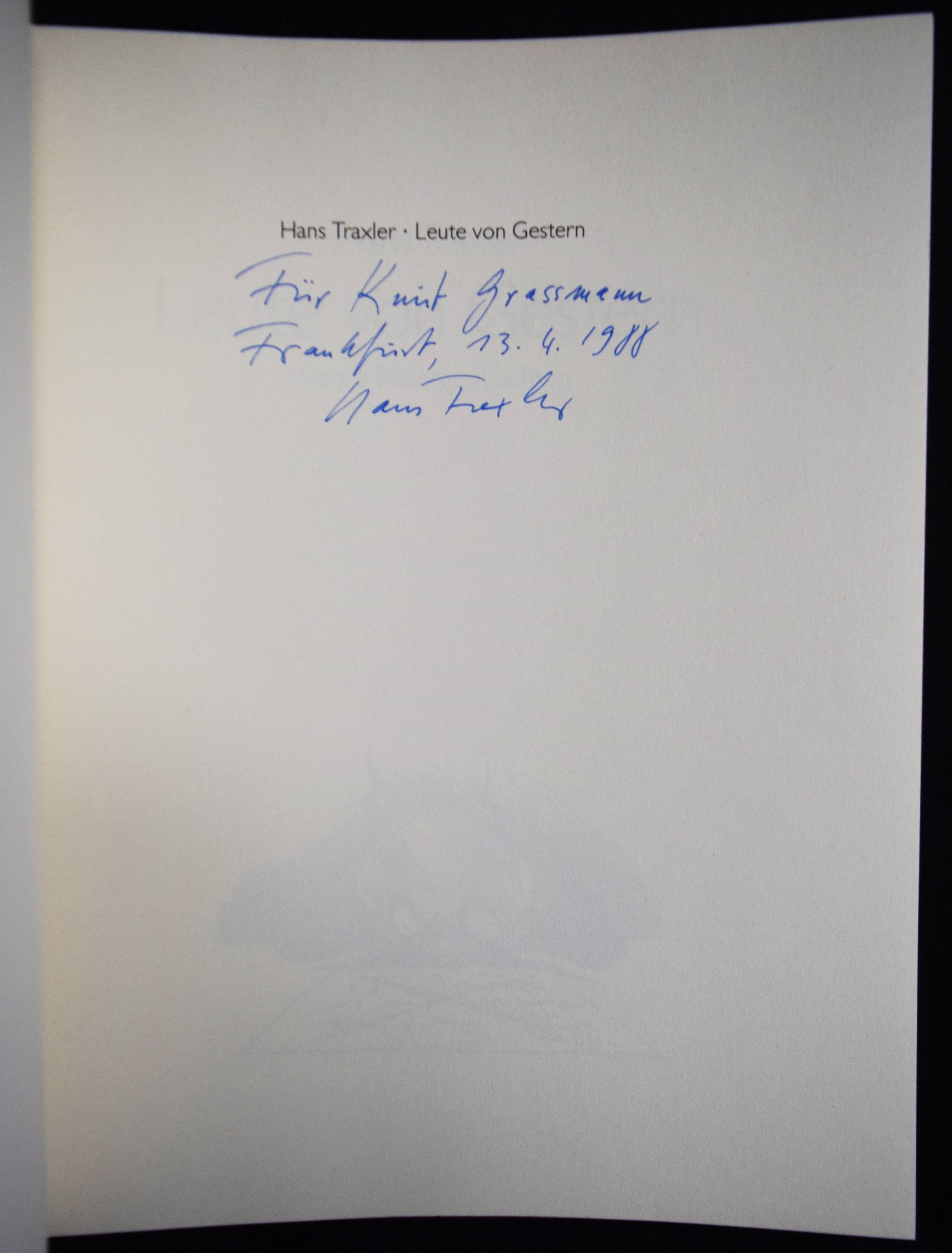 Traxler, Hans. Leute von gestern. Vierzig Bildergeschichten. Zürich, Diogenes-Verlag 1981. 4°. 111, (1) S., [4] Bl. mit teils farb. Illustrationen. Illustr. OKart. Erste Ausgabe. – Mit eigenhändiger Widmung von H. Traxler „Für (den Kulturwissenschaftler) Knut Grassmann Frankfurt, 13. 4. 1988 Hans Traxler“. – Gutes Exemplar.