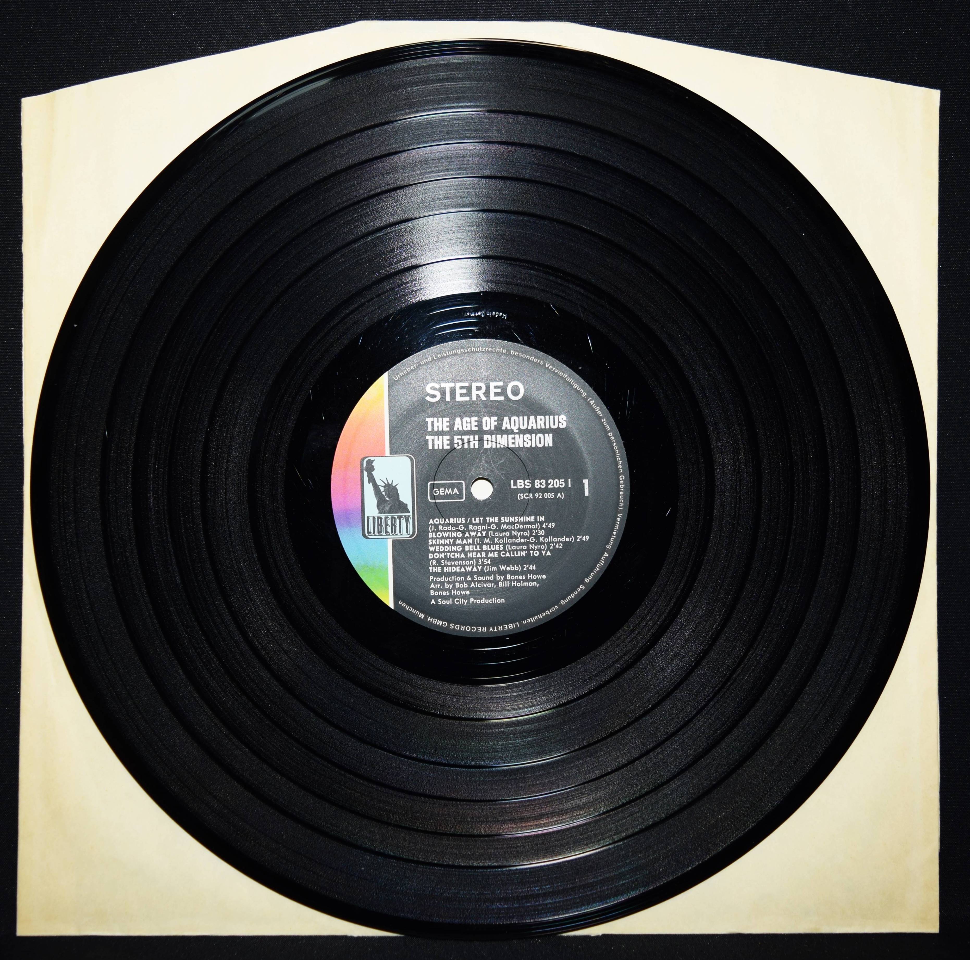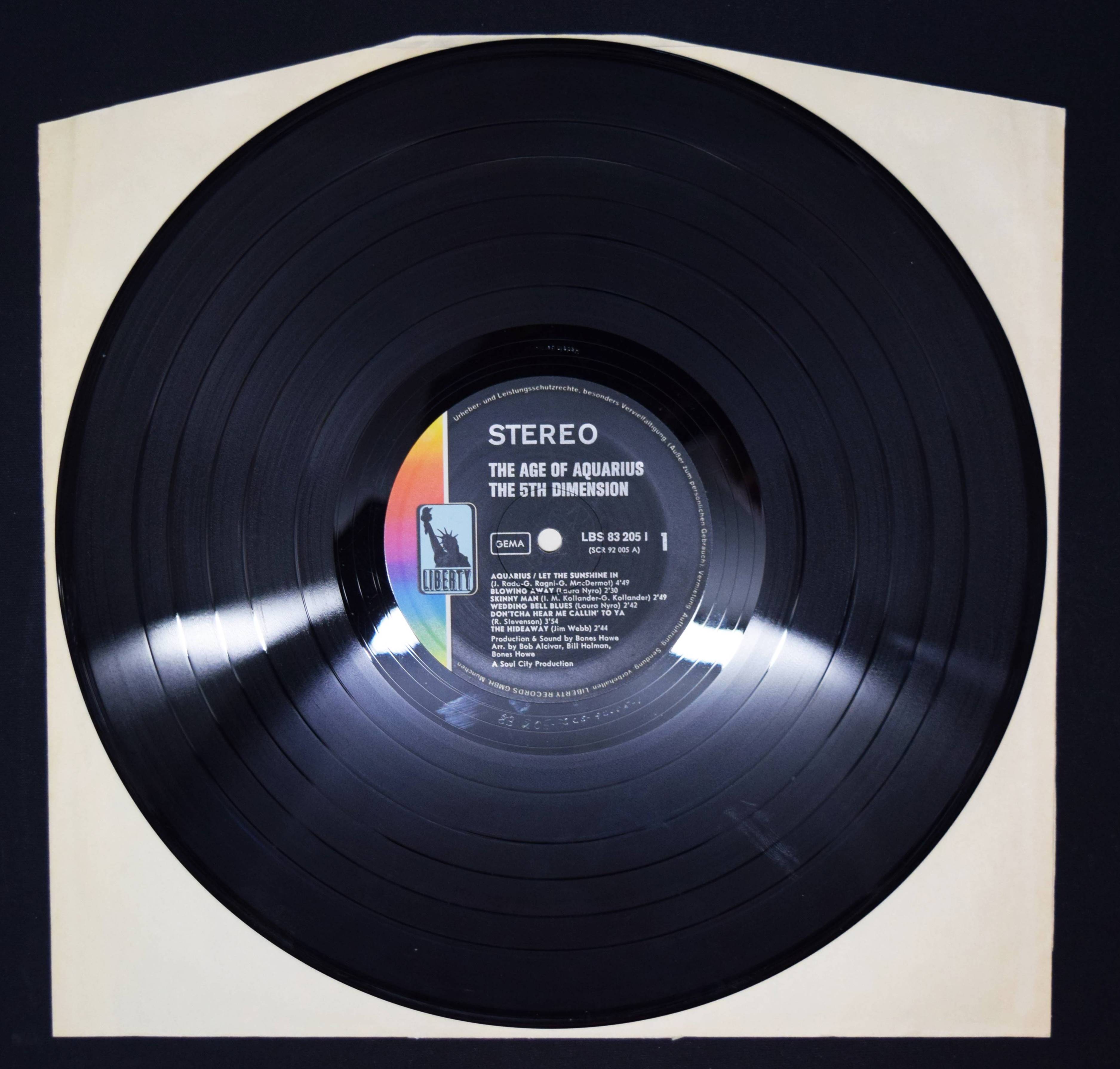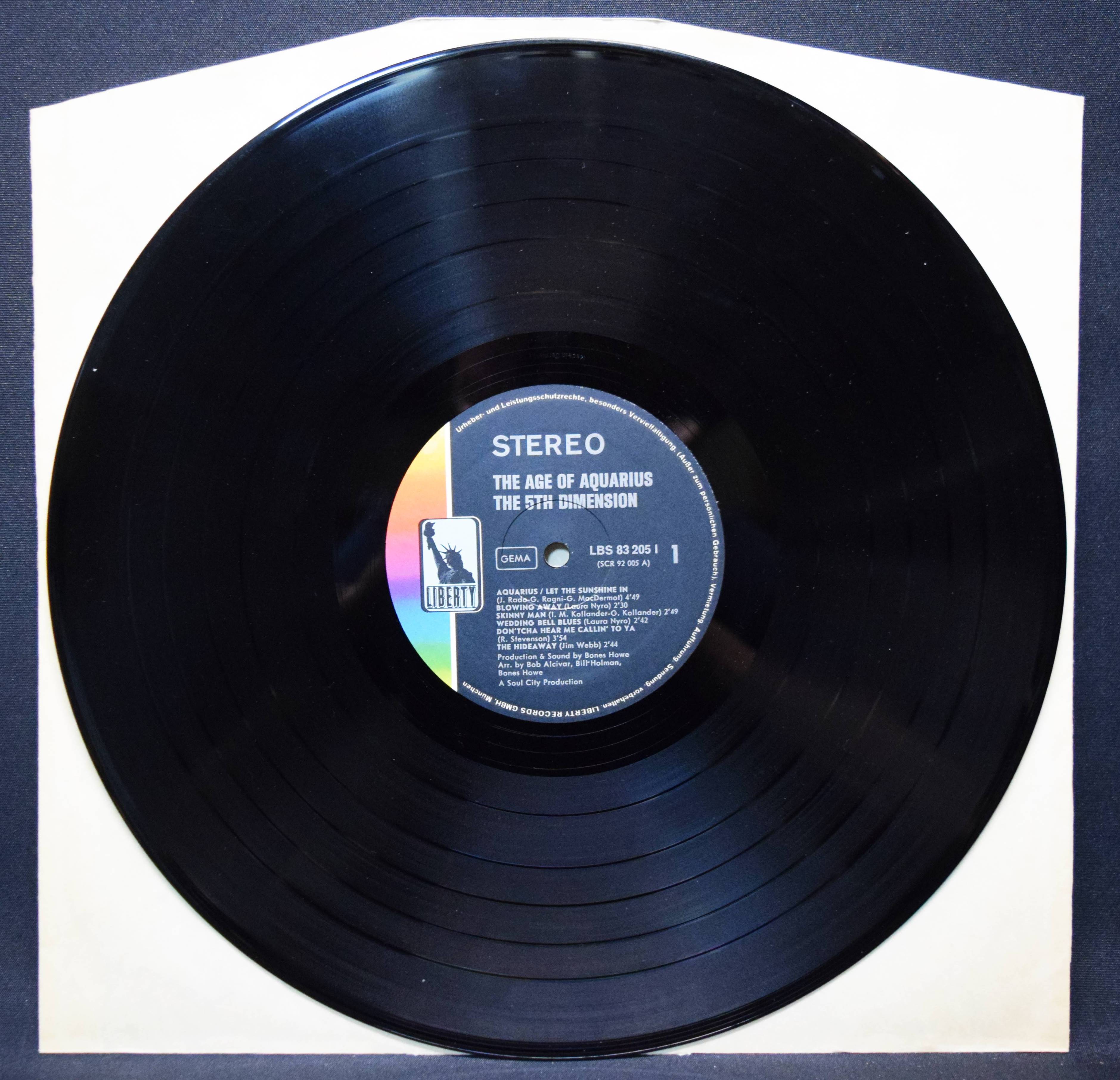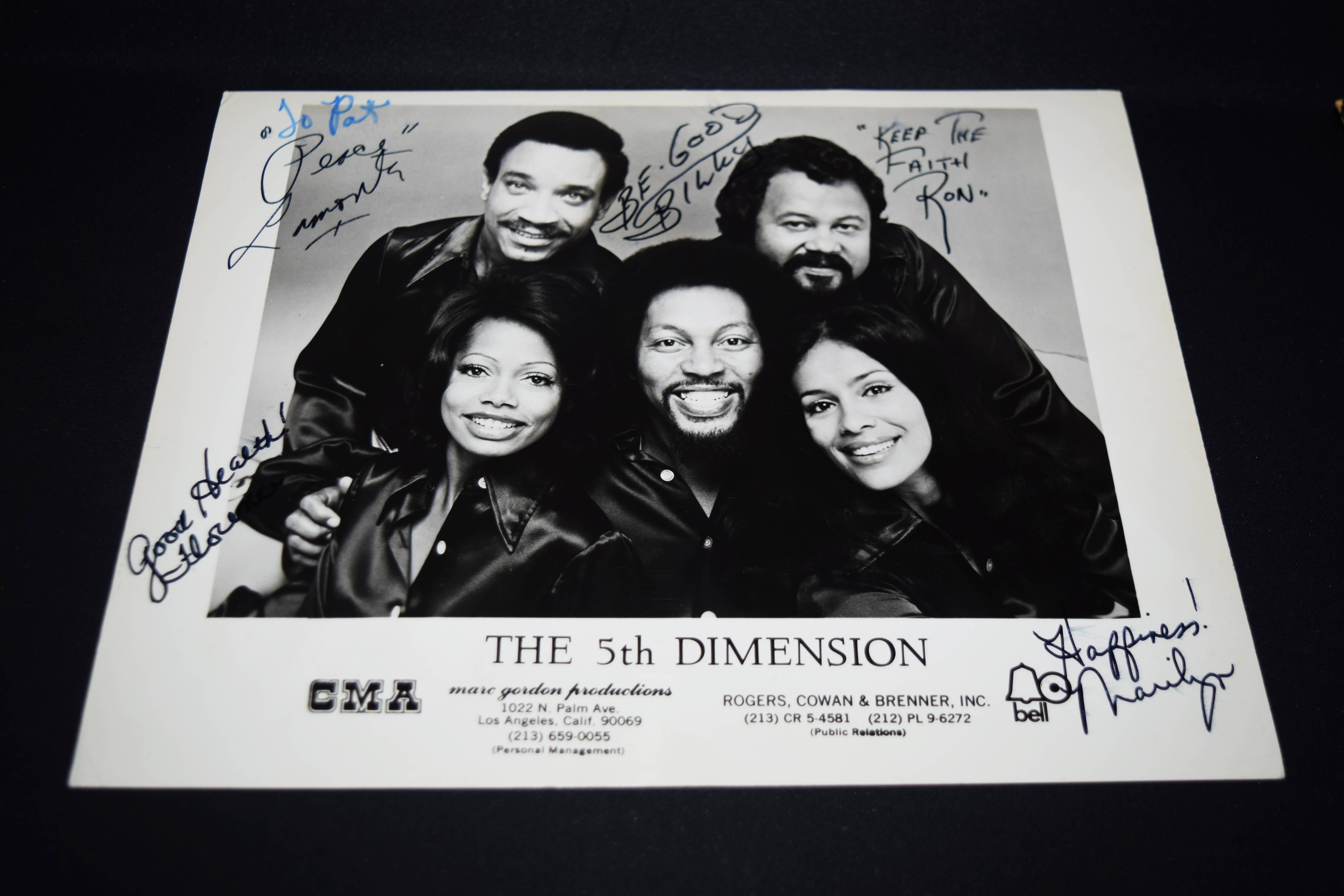 The 5th Dimension – Billy Davis, Lamonte McLemore, Ron Townson, Marilyn McCoo und Florence LaRue. Signierte Orig.-Photographie (Autogramm-Foto, Silbergelatine, 20,5 x 25,7 cm.) mit eigenhändigen Widmungen von allen 5 Mitgliedern der Band. Los Angeles, Marc Gordon Productions and Rogers, Cowan & Brenner Inc. o. J. (um 1975). Für den Hotelier „Pat“ in Las Vegas: „To Pat, Peace Lamonth, Be good Billy, Keep the faith Ron, Good health! Florence, Happiness! Marilyn“. – Die Soul-Formation, 1965 in Los Angeles gegründet, schaffte 1968 den Durchbruch mit dem von Jimmy Webb geschriebenen Titel „Up, Up and Away“, der mit fünf Grammy-Awards ausgezeichnet wurde. – Dazu: The 5th Dimension. The Age of Aquarius. Vinyl-LP. Liberty-LBS 83 205 I (SCS 92 005). Farbig illustr. Orig.-Cover. – Gutes Exemplar.