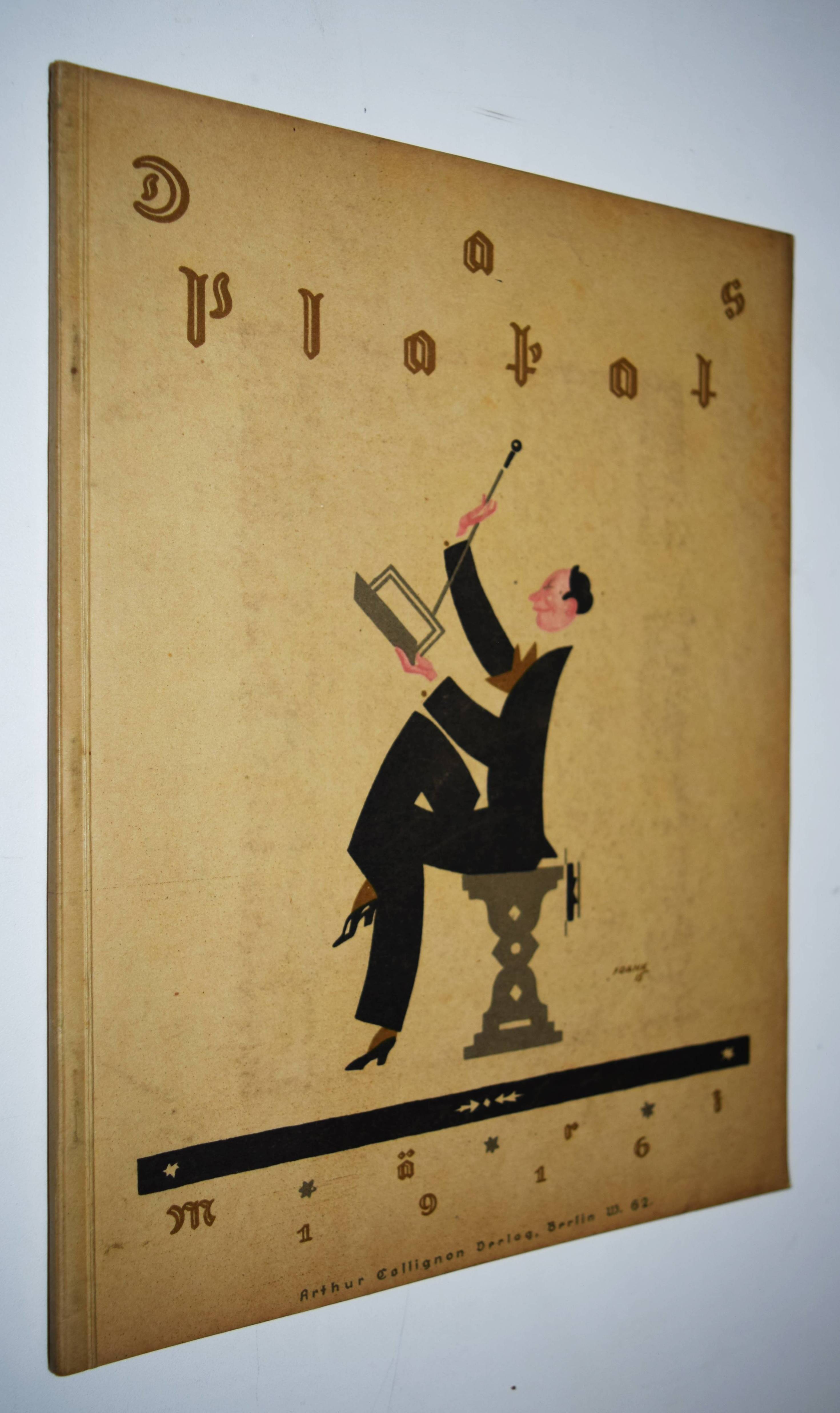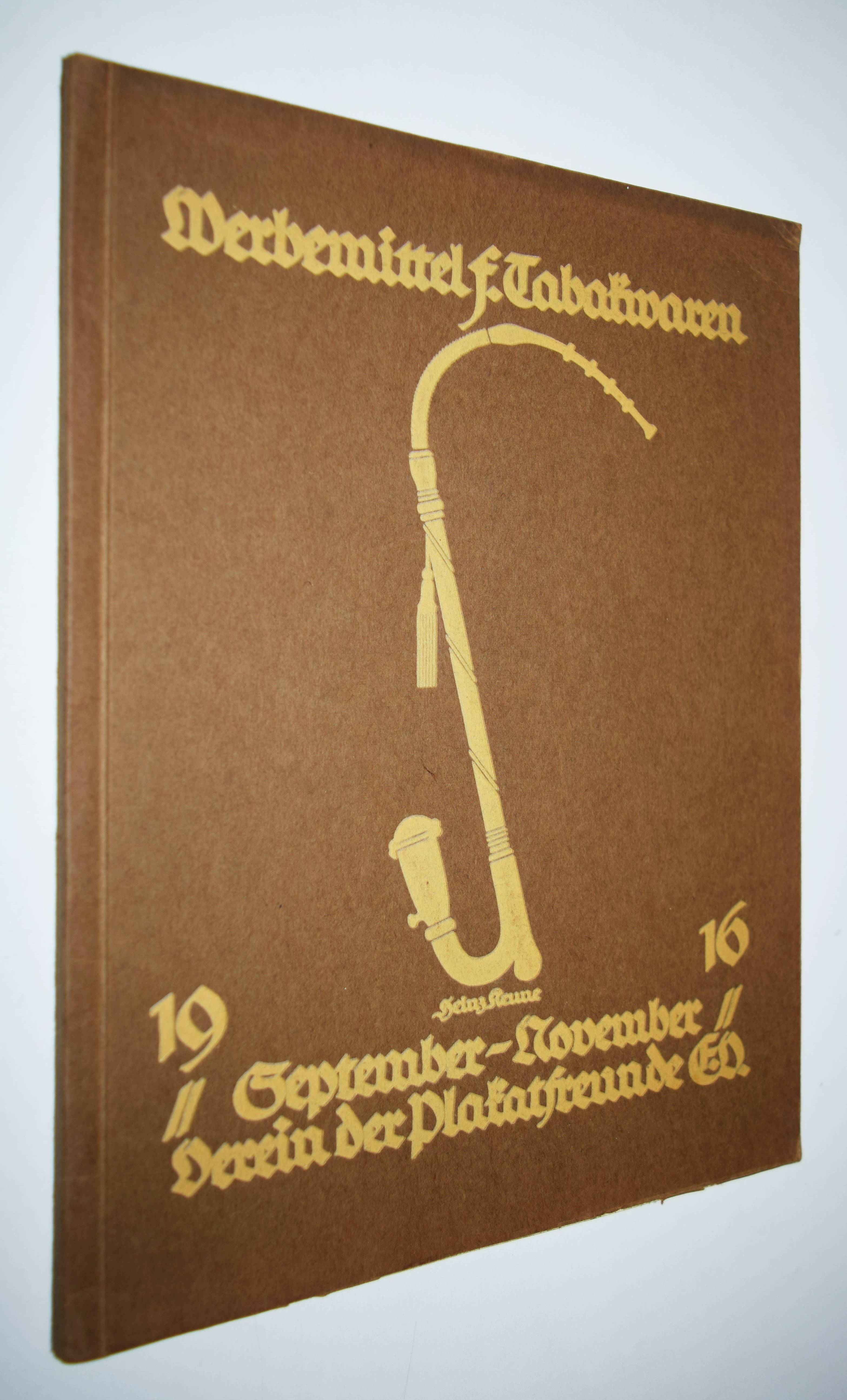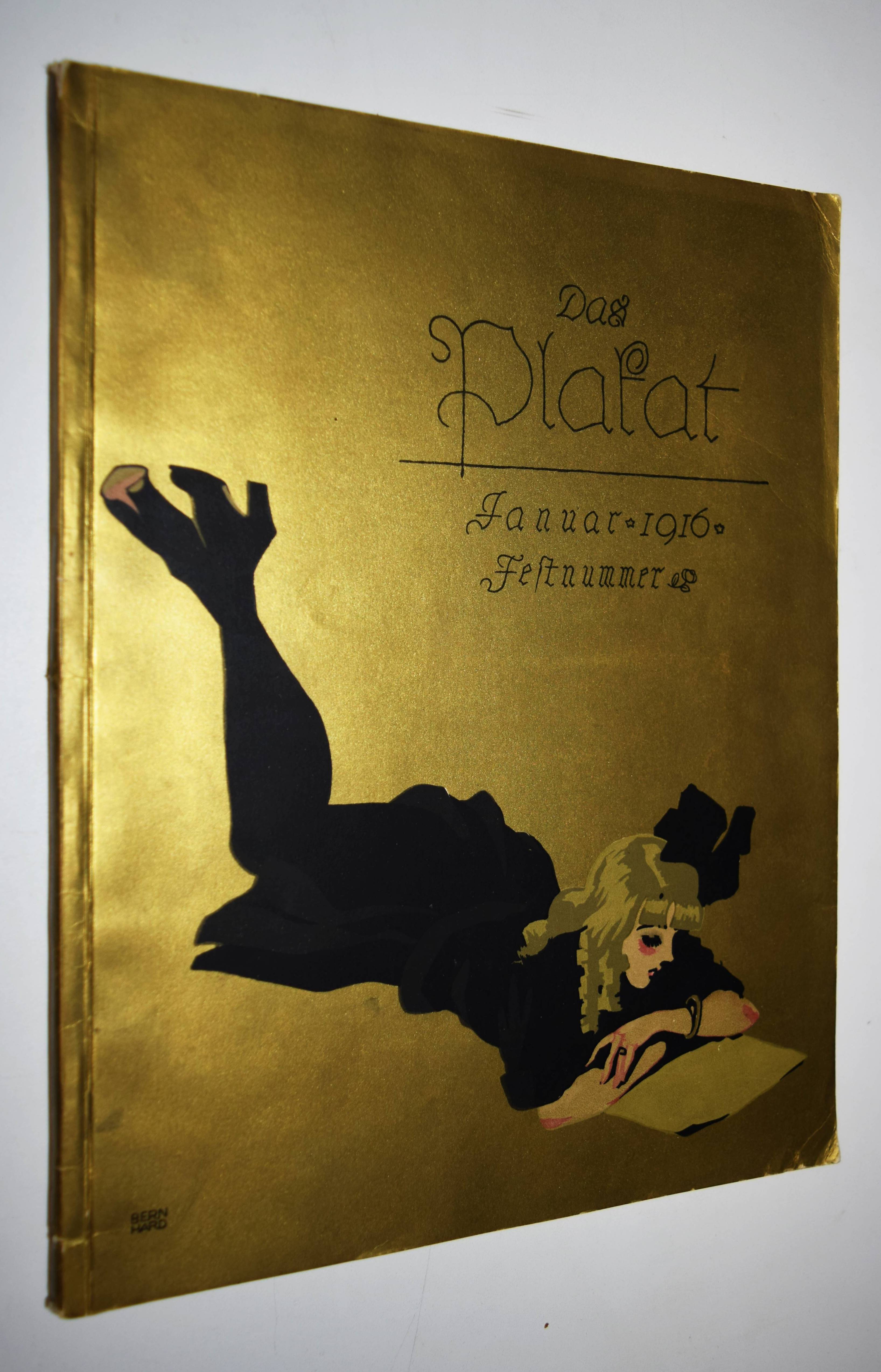 Sachs, Hans (Hrsg.). Das Plakat. Zeitschrift des Vereins der Plakatfreunde e. V. für Kunst in der Reklame. Jahrgang VII. Heft 1-5/6 (und) 2 Beilagen-Hefte. 7 Hefte. Berlin, Verein der Plakatfreunde 1916. 4°. Mit zahlr., teils ganzseitigen und meist farbigen Abbildungen sowie montierten Kunstbeilagen, Papier- und Buntpapierproben. Farbig illustr. OKart. in Orig.-Halbleinenumschlag (Entwurf: Lucian Bernhard). Vollständiger Jahrgang mit den Beilagenheften zum Maiheft (Beilagen zum Aufsatze von Paul Westheim, Politik – Kunst – Reklame) und September/Novemberheft (Werbemittel für Tabakwaren). – Mit ihrer exzellenten Ausstattung und den zahllosen farbigen und montierten Beispielen herausragender Werbegraphik die bis heute unerreichte Publikation zum Thema Plakatkunst. Eine der wohl aufwendigsten und hervorragendsten Zeitschriften des 20. Jahrhunderts. – „Die ersten Nummern erschienen im März und April 1906, als rein internes Mitteilungsblatt und nach einer handschriftlichen Vorlage vervielfältigt in nur 200 Exemplaren, bei einer Mitgliederzahl von nur 80. In dieser Form war das Blatt nicht im Handel erhältlich. Trotzdem zeigt sich schon daran die Zielrichtung: für den Verein zu Werben und neue Mitglieder zu gewinnen. In wie starkem Maße dies gelang, hätte sich keiner der Beteiligten träumen lassen. 1919 etwa hatte der Verein knapp 5000 Mitglieder und alleine im letzten Jahr seines Bestehens gewann er 2200 dazu, so daß die Mitgliederzahl auf deutlich über 7000 stieg … Es gab farbige und montierte Beilagen als Beispiele herausragender Werbegrafik, wie sie sich sonst in keiner Konkurrenzzeitschrift fanden. Verkleinerte Ausführungen von Plakaten, teils auf starken Karton gedruckt, wurden ebenso beigelegt wie Werbemarken, Postkarten u. ä. Alleine ein kurzes Durchblättern konnte den Leser oder Sammler vom Wert jedes einzelnen Heftes überzeugen. Wer einzelne Exemplare oder gar ganze Jahrgänge von Das Plakat besaß, der gab sie nicht wieder her“ (J. Müller-Daehn). – Von leichten Gebrauchsspuren abgesehen, sehr gut erhalten.