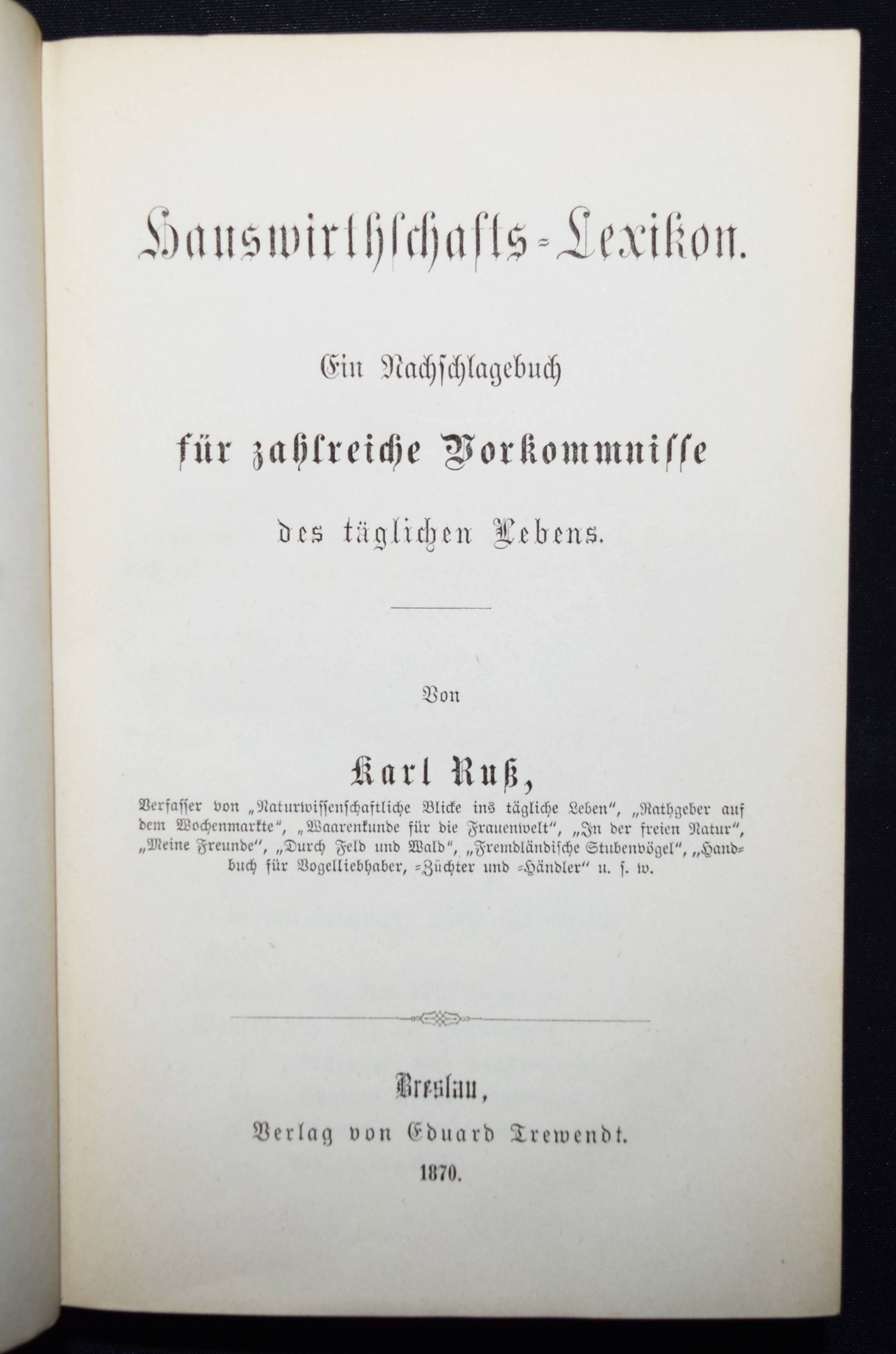Russ, Karl. Hauswirthschafts-Lexikon. Ein Nachschlagebuch für zahlreiche Vorkommnisse des täglichen Lebens. 2 Teile in 1 Band. Breslau, Eduard Trewendt 1870. Kl.-8°. [4] Bl., X, 492 S. Illustr. OHln. mit goldgepr. Rückentitel und Rückenillustration. Erste Ausgabe, selten. – I. Auskunft, Rathschäge und Hinweise, Vorschriften und Recepte. – II. Geräthe, Apparate, Werkzeuge und allerlei Geschirre für die Hauswirthschaft. – Innengelenke leicht angeplatzt, gutes Exemplar im dekorativen Verlagseinband.
