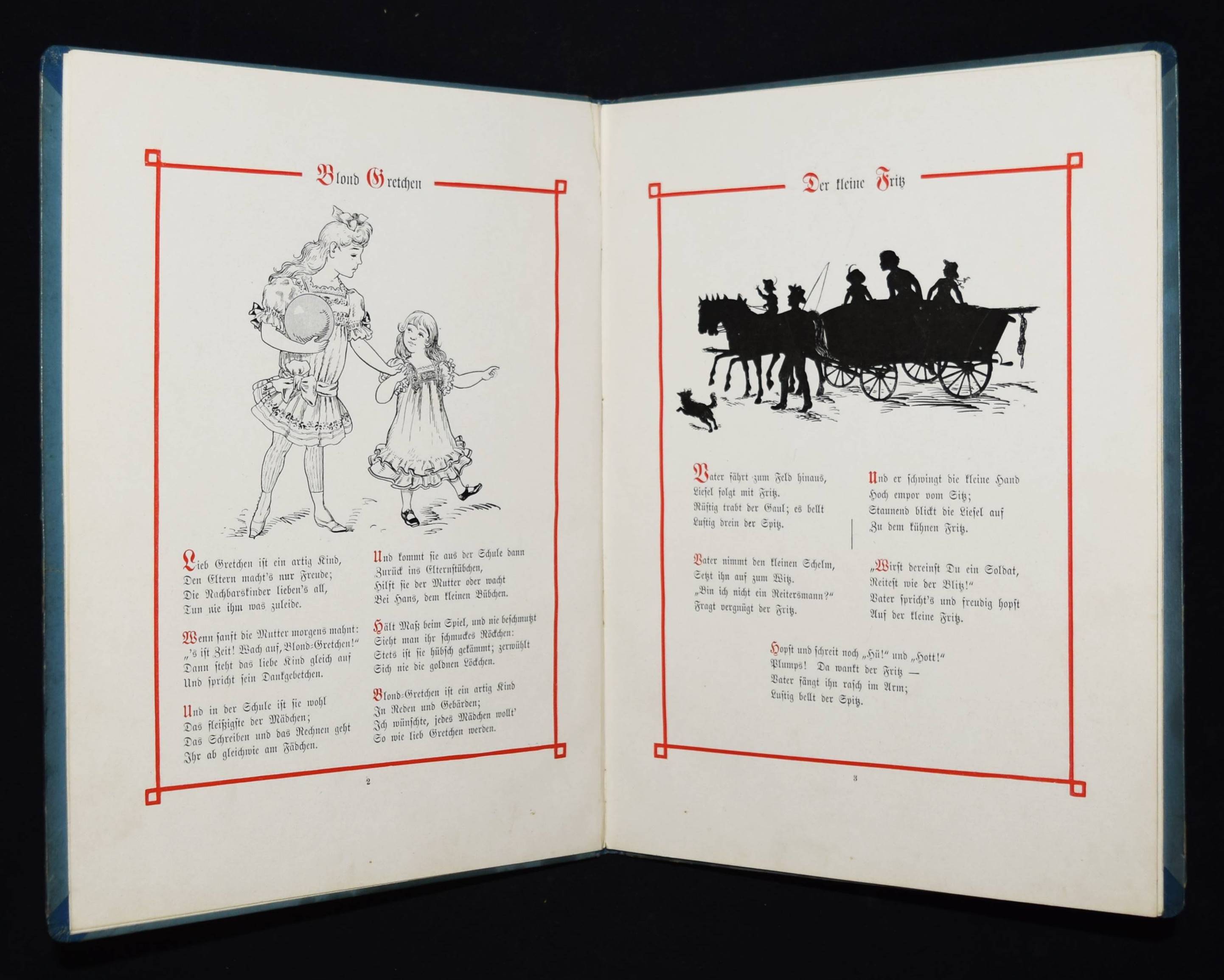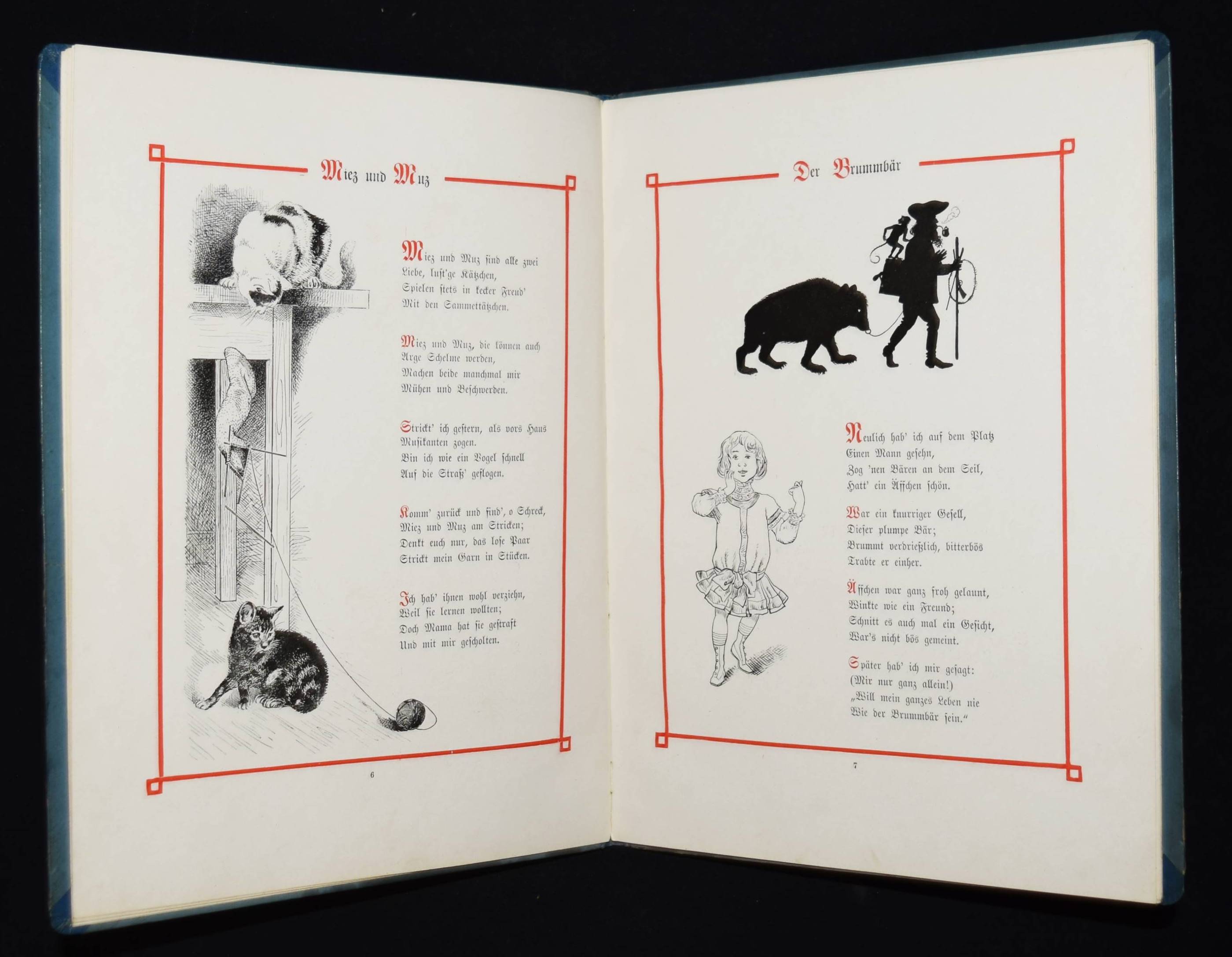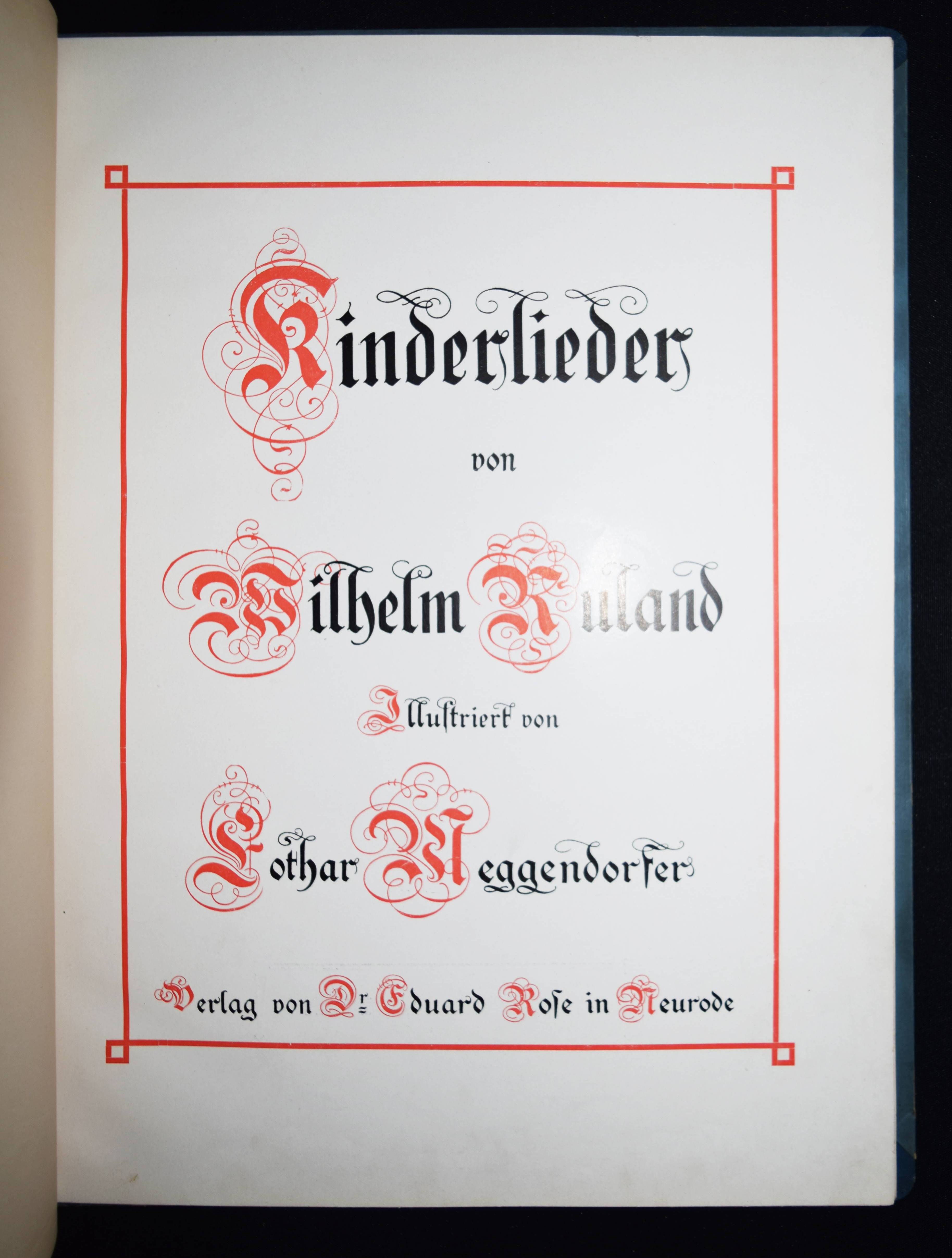Ruland, Wilhelm. Kinderlieder. Illustriert von Lothar Meggendorfer. Neurode, Eduard Rose (1907). 4°. [3] Bl., 51 S. mit Illustrationen. Illustr. OHln. Krahé 71. Ries 132 u. S. 20. Nicht in LKJ I, 460. – Einzige Ausgabe, selten. – „Seiner Königlichen Hoheit, dem Prinzen Luitpold von Bayern zum 7. Geburtstag“. „Um und nach 1900 wird es allgemein beliebt, anspruchsvolle Bilderbücher hochadeligen Persönlichkeiten oder auch nur deren Sprößlingen, etwa zu einem ihrer Geburtstage zuzueignen“ (H. Ries). – Deckel etwas fingerfleckig, zeitgenöss. Widmung auf dem Vorsatz, sehr gutes sauberes Exemplar.