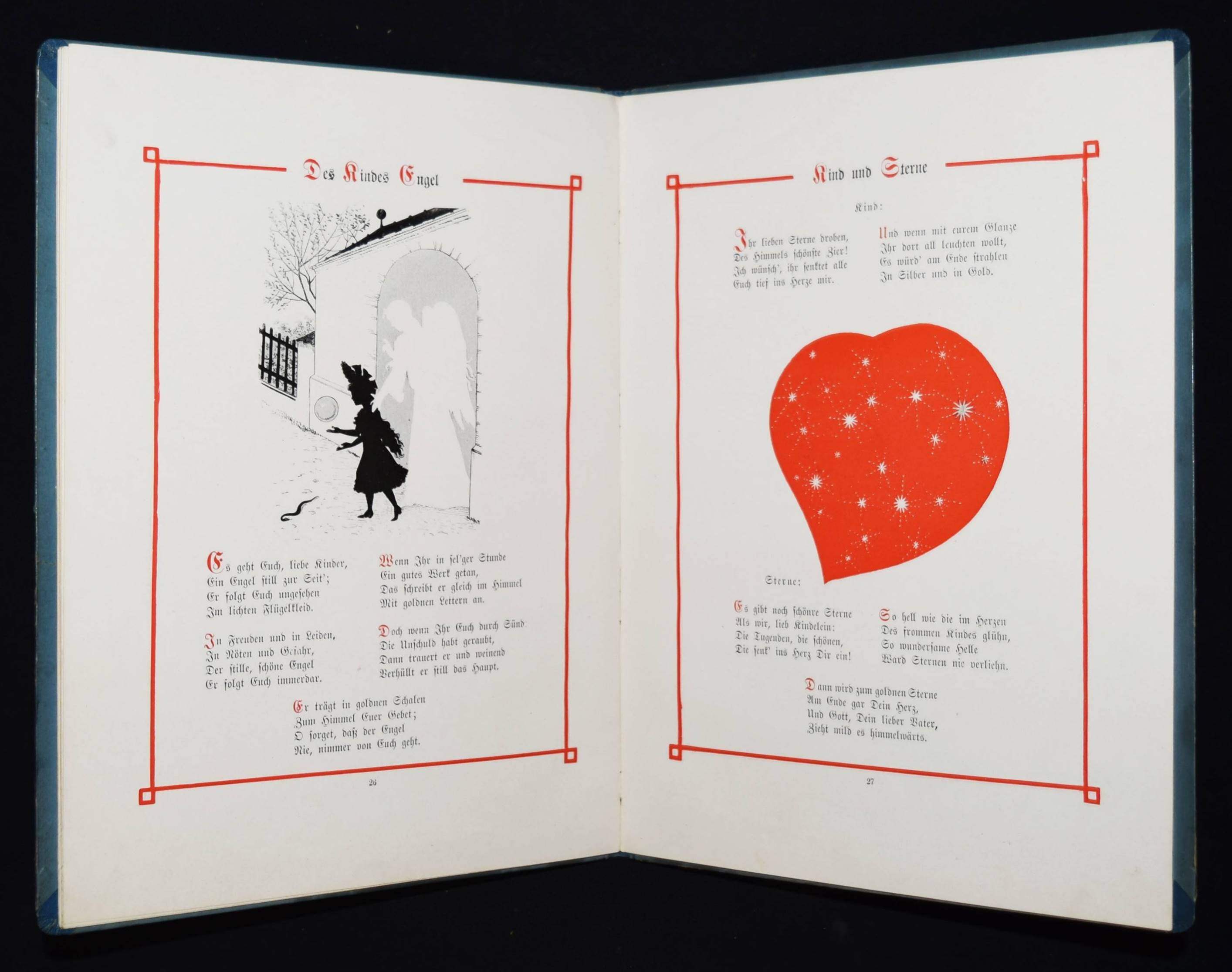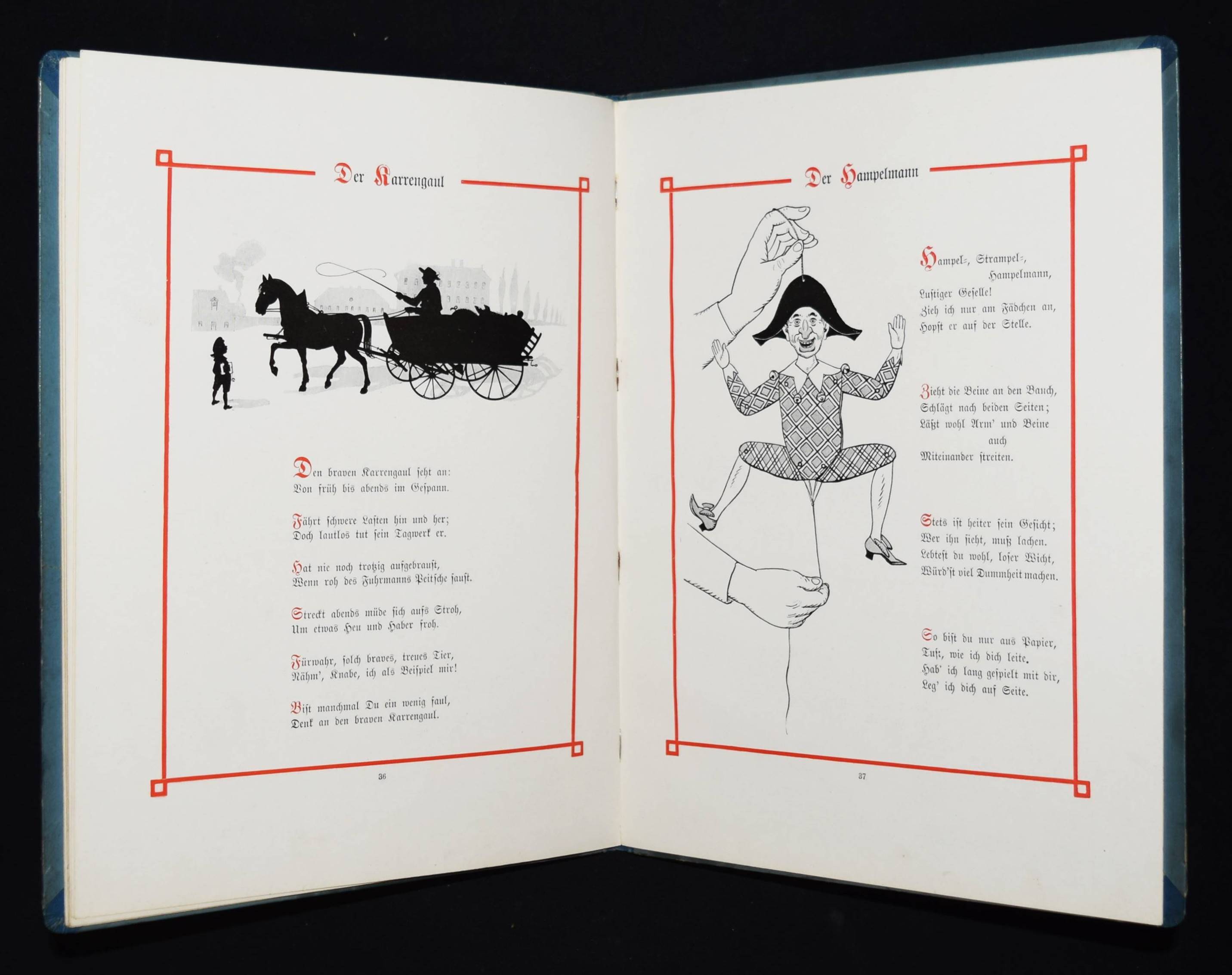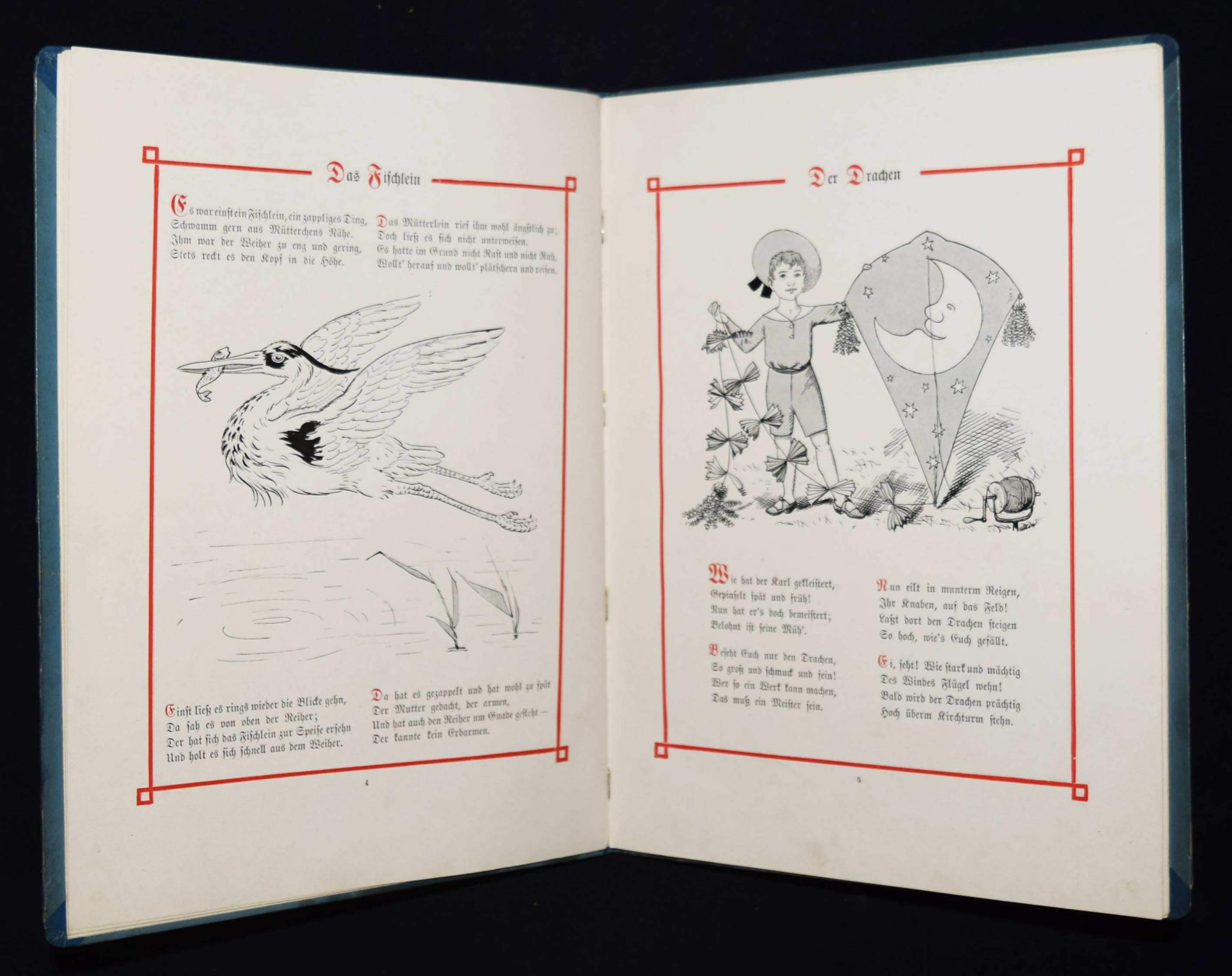 Ruland, Wilhelm. Kinderlieder. Illustriert von Lothar Meggendorfer. Neurode, Eduard Rose (1907). 4°. [3] Bl., 51 S. mit Illustrationen. Illustr. OHln. Krahé 71. Ries 132 u. S. 20. Nicht in LKJ I, 460. – Einzige Ausgabe, selten. – „Seiner Königlichen Hoheit, dem Prinzen Luitpold von Bayern zum 7. Geburtstag“. „Um und nach 1900 wird es allgemein beliebt, anspruchsvolle Bilderbücher hochadeligen Persönlichkeiten oder auch nur deren Sprößlingen, etwa zu einem ihrer Geburtstage zuzueignen“ (H. Ries). – Deckel etwas fingerfleckig, zeitgenöss. Widmung auf dem Vorsatz, sehr gutes sauberes Exemplar.