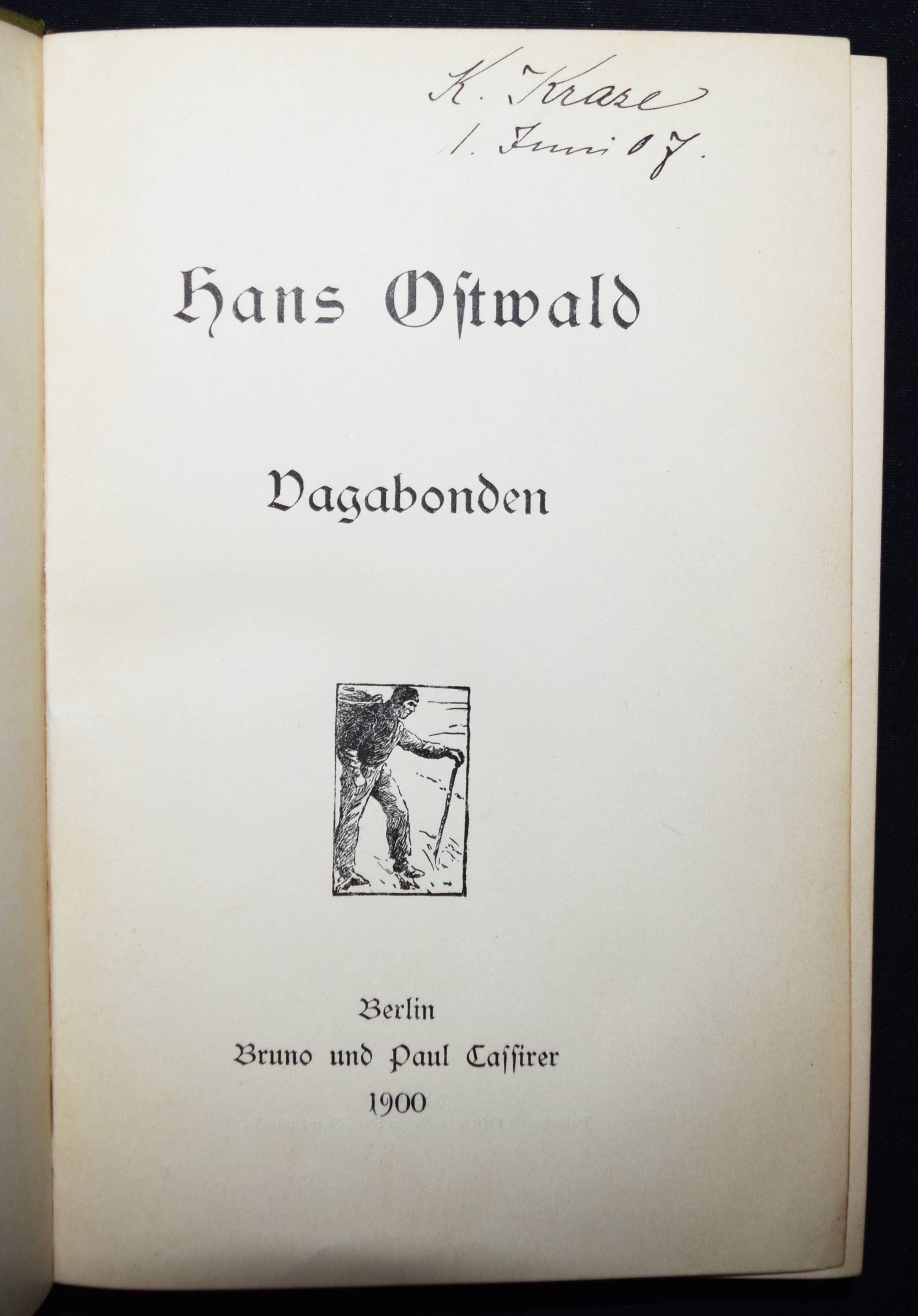 Ostwald, Hans. Vagabonden. (Ein autobiographischer Roman). Berlin, Paul Cassirer 1900. 8°. 335 S. Farbig illustr. OLn. NDB XIX, 634. – Sehr seltene erste Ausgabe der ersten Veröffentlichung. – „O. lernte wie sein Bruder Gustav den Beruf des Goldschmieds. 1894 ging er auf Wanderschaft, die ihn bis nach Riga führte zu Verwandten, die dort Kaufleute waren. 1896/97 arbeitete er in Leipzig als Redakteur der Leipziger Volkszeitung; der Kontakt mit Wilhelm Ostwald (1853–1932) und dessen Kreis vermittelte ihm moderne wissenschaftliche Sichtweisen und Rüstzeug für sozialreformerische Vorstellungen. Nach Berlin zurückgekehrt, arbeitete er seit 1898 als Redakteur der linksliberalen „Welt am Montag“. Der Mitredakteur und Freund Felix Holländer vermittelte Kontakte zum Friedrichshagener Dichterkreis. Später gehörte O. zum Kreis der Neuen Gemeinschaft um die Brüder Hart. Auf Anregung Holländers veröffentlichte O. 1900 mit dem Roman „Vagabonden“ („Vagabunden“, Neuausg. 1980; seit d. 3. Aufl. mit d. Untertitel „Ein autobiograph. Roman“) die literarische Verarbeitung seiner Erfahrungen „auf der Walz“. Der große Erfolg dieses Buches (und späterer Werke) ermöglichte ihm das Leben als freier Schriftsteller … Aus seinen Erfahrungen auf der Wanderschaft resultierte sein soziales Engagement für die Verbesserung der Lebenssituation der Landstreicher. O. übte heftige Kritik an den Einrichtungen der „Wanderfürsorge“ (Die Bekämpfung der Landstreicherei, 1903) und deren Überwachungssystem. Dabei ging es ihm nicht um die Abschaffung der „Walz“. Er entwickelte Ideen zu Arbeitsbeschaffungsprogrammen und engagierte sich bei der Initiierung von Siedlungsprojekten für Arbeitslose (1909 Gründung u. Vorsitz im „Komitee für innere soziale Kolonisation“), von denen einige 1911-16 verwirklicht werden konnten“ (Ralf Dose in NDB). – Zeitgenöss. Besitzvermerk auf dem Titelblatt, sehr gutes sauberes Exemplar.