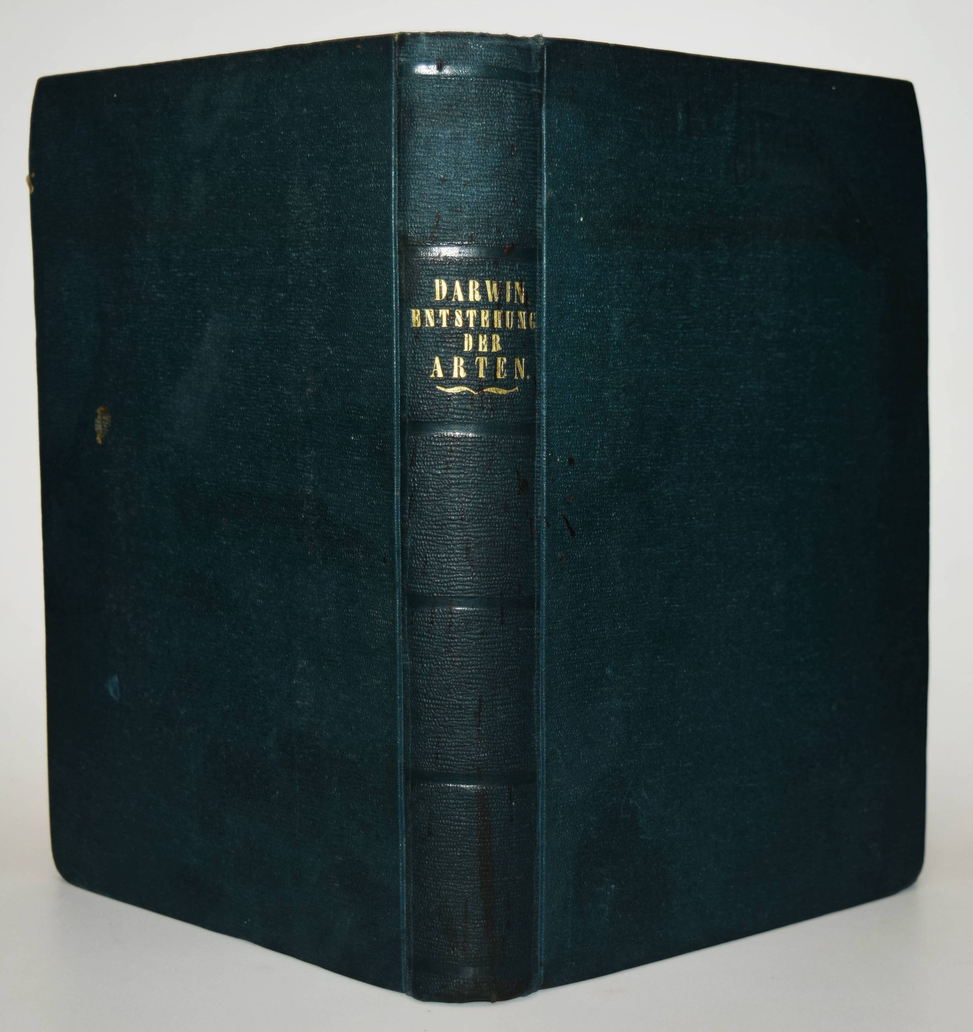 Darwin, Charles. Über die Entstehung der Arten im Thier- und Pflanzen-Reich durch natürliche Züchtung, oder Erhaltung der vervollkommneten Rassen im Kampfe um’s Daseyn. Nach der dritten Englischen Auflage und mit neueren Zusätzen des Verfassers für diese deutesche Ausgabe aus dem Englischen übersetzt und mit Anmerkungen versehen von (Heinrich) G(eorg) Bronn. 2., verb. und sehr verm. Aufl. Stuttgart, E. Schweizerbart (1862-)1863. 8°. VIII, 551 S. mit 1 mont. Orig-Photographie (Albuminabzug, 15,3 x 11,5 cm.) von Maull & Polyblank, Abzug von (Carl Johann Sigmund) Buchner u. 1 gefalt. lithogr. Tafel. Dunkelgrüner Leinenband der Zeit mit goldgepr. Rückentitel. Freeman 673. Heidtmann, Wie das Photo ins Buch kam 267, 511. Vgl. Hirsch/Hüb. II, 187 u. Carter/Muir, PMM 344 b. – Sehr seltene zweite deutsche Ausgabe, die einzige Ausgabe eines Werkes von Darwin mit einer Original-Portraitphotographie. Die 3. u. 4. Aufl. enthalten Darwins Porträt in Stahlstich, spätere Auflagen in Lichtdruck. Übertragen von dem bedeutenden Paläontologen H. G. Bronn (1800-1862), der „trotz der Verschiedenheit der Meinung der erste war, der, die eminente Bedeutung von Darwin`s Buch richtig einschätzend, demselben in einer vorzüglichen Übersetzung die weiteste und rascheste Verbreitung verschaffte und dadurch nicht wenig beitrug zu dem raschen Siege der Theorie“ (ADB III, 360). – Der Stuttgarter Porträtmaler und Fotograf C. Buchner (1821-1918) ist auf dem Abzug als Fotograf angegeben hat jedoch nur die Abzüge der früher entstandenen Aufnahme angefertigt. – Buchner, war der jüngere Bruder des Porträt- und Historienmalers Johann Georg Buchner (1815–1857) und lieferte diesem fotografische Porträts als Vorlagen. Buchner war seit 1854 in Stuttgart tätig und wurde 1885 zum Hofmaler und Hoffotografen des Königreichs Württemberg ernannt. – Das Porträt Darwins von Henry Maull (1829–1914) entstand nach verschiedenen Quellen entweder 1854 (Darwin im Alter von 45 Jahren) oder 1859 oder 1860 (Darwin im Alter von 51 Jahren). Da eine ähnliche Aufnahme Darwins von Maull bekannt ist, über die sich Darwin in einem Brief vom 27. Mai 1855 kritisch äußert, ist die Datierung mit 1854 wahrscheinlicher. – Der britische Fotograf H. Maull gründete zusammen mit George Henry Polyblank 1854 ein Fotoatelier in London und firmierte bis 1865 als Maull & Polyblank, 1866-1878 als Maull, Henry & Co. bzw. Maull & Co. und 1879-1885 als Maull & Fox. H. Maull, der zahlreiche prominente Persönlichkeiten porträtierte, war seit 1870 Mitglied der Royal Photographic Society. Maull & Polyblank veröffentlichten 1859 „Photographic Portraits of Living Celebrities. … With biographical Notices by E. Walford“ mit 40 Albumin-Abzügen (vgl. The Truthful Lens 212, 116). – St.a.T., die ersten und letzten Bl. etwas braunfleckig, sehr gutes Exemplar. – Very rare second German edition, the only edition of a work by Darwin with an original portrait photograph. The 3rd and 4th editions contain Darwin’s portrait in steel engraving, later editions in collotype. Translated by the important paleontologist H. G. Bronn (1800-1862), who „despite the difference of opinion, was the first to correctly assess the eminent importance of Darwin’s book and to give it the widest and quickest distribution in an excellent translation, thereby contributing not a little to the rapid victory of the theory“ (ADB III, 360). – The Stuttgart portrait painter and photographer C. Buchner (1821-1918) is listed as the photographer on the print, but he only made the prints of the earlier photograph. – Buchner, was the younger brother of the portrait and history painter Johann Georg Buchner (1815-1857) and provided him with photographic portraits as models. Buchner had been working in Stuttgart since 1854 and was appointed court painter and court photographer of the Kingdom of Württemberg in 1885. – According to various sources, the portrait of Darwin by Henry Maull (1829-1914) was taken either in 1854 (Darwin at the age of 45) or 1859 or 1860 (Darwin at the age of 51). Since a similar photograph of Darwin by Maull is known, about which Darwin made a critical comment in a letter dated May 27, 1855, the date of 1854 is more likely. – The British photographer H. Maull founded a photographic studio in London together with George Henry Polyblank in 1854 and traded as Maull & Polyblank until 1865, as Maull, Henry & Co. or Maull & Co. from 1866 to 1878 and as Maull & Fox from 1879 to 1885. H. Maull, who portrayed numerous prominent personalities, had been a member of the Royal Photographic Society since 1870. In 1859 Maull & Polyblank published „Photographic Portraits of Living Celebrities. … With biographical Notices by E. Walford“ with 40 albumen prints (cf. The Truthful Lens 212, 116). – Stamp on titlepage, first and last leaves somewhat brownstained, very good copy.