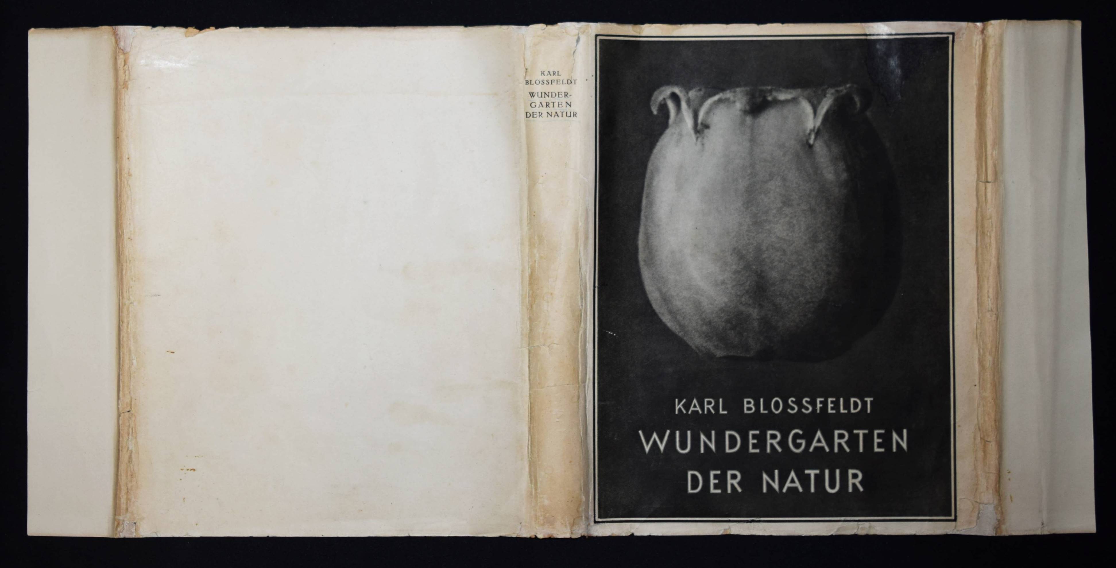 Blossfeldt, Karl. Wundergarten der Natur. Neue Bilddokumentation schöner Pflanzenformen. Berlin, Verlag für Kunstwissenschaft o. J. (1932). 4°. XIII, (3) S. u. 137 Abb. auf 120 num. Bildtafeln in Kupfertiefdruck. Hellgrauer OLn. mit Rücken- u. Deckeltitel u. Deckelvignette (Entwurf: Curt Siebert) u. illustr. Orig.-Schutzumschlag. Heidtmann 14481. Heiting/Jaeger I, 194 ff. (mit mehreren Abb.). The Open Book 106 f. – Erste Ausgabe. – „Dass hier die hohe Qualität des ersten Bandes beibehalten werden konnte, liegt daran, dass trotz des Verlagswechsels erneut die Graphische Anstalt Ganymed in Berlin mit der Druckherstellung beauftragt wurde… Gleich zu Beginn des Abbildungsteils fallen erste Unterschiede zu ‚Urformen der Kunst‘ ins Auge. Die Pflanzen bilden fast immer einen stärkeren Kontrast zum Hintergrund, was daran liegt, dass dieser, im Gegensatz zum vorherrschenden Grau des ersten Bildbandes häufig schwarz oder weiß gehalten ist. Dadurch geraten die Licht-Schatten-Kontraste insgesamt wesentlich eindrücklicher, die Pflanzen wirken folglich noch plastischer… Überhaupt tauchen nur wenige Seiten mit zwei oder drei Fotografien auf… Abgesehen davon, dass diese neue Form der Anordnung sich mehr den botanischen Gegebenheiten anpasst, entspricht sie in ihrer Klarheit und Strenge auch wesentlich deutlicher dem Stil der Neuen Sachlichkeit. Diese Feststellung darf im Übrigen für den gesamten zweiten Bildband gelten“ (B. Hammers in Heiting/Jaeger). – „Blossfeldts Aufnahmen zeigen in starker Vergrösserung pflanzliche Details und organische Formbildungen, die Bezüge zu dekorativen Elementen und ornamentalen Formen der Kunstgeschichte deutlich machen. Diese fotografischen Arbeiten beeinflussten Renger-Patzsch und Finsler“ (R. Mißelbeck S. 25). – Schutzumschlag etwas berieben, leicht angestaubt und am Vorderdeckel mit unauffällig restaurierter Fehlstelle und restaur. Randläsuren, sonst sehr gutes sauberes Exemplar. – First edition. – „The fact that the high quality of the first volume could be maintained here is due to the fact that, despite the change of publisher, the Graphische Anstalt Ganymed in Berlin was again commissioned with the printing… Right at the beginning of the illustration section, the first differences to ‚Urformen der Kunst‘ are noticeable. The plants almost always form a stronger contrast to the background, which is due to the fact that this is often black or white, in contrast to the predominant gray of the first illustrated volume. As a result, the contrasts between light and shadow are much more impressive overall, making the plants appear even more vivid… In fact, there are only a few pages with two or three photographs… Apart from the fact that this new form of arrangement is more in keeping with the botanical conditions, it also corresponds much more clearly to the New Objectivity style in its clarity and austerity. Incidentally, this statement can be applied to the entire second illustrated book“ (B. Hammers in Heiting/Jaeger). – „Blossfeldt’s photographs show highly enlarged plant details and organic formations that make clear references to decorative elements and ornamental forms from art history. These photographic works influenced Renger-Patzsch and Finsler“ (R. Misselbeck p. 25). – Dust jacket somewhat rubbed, slightly dusty and on front cover with inconspicuously restored loss and restor. marginal tears, otherwise very good and clean copy.