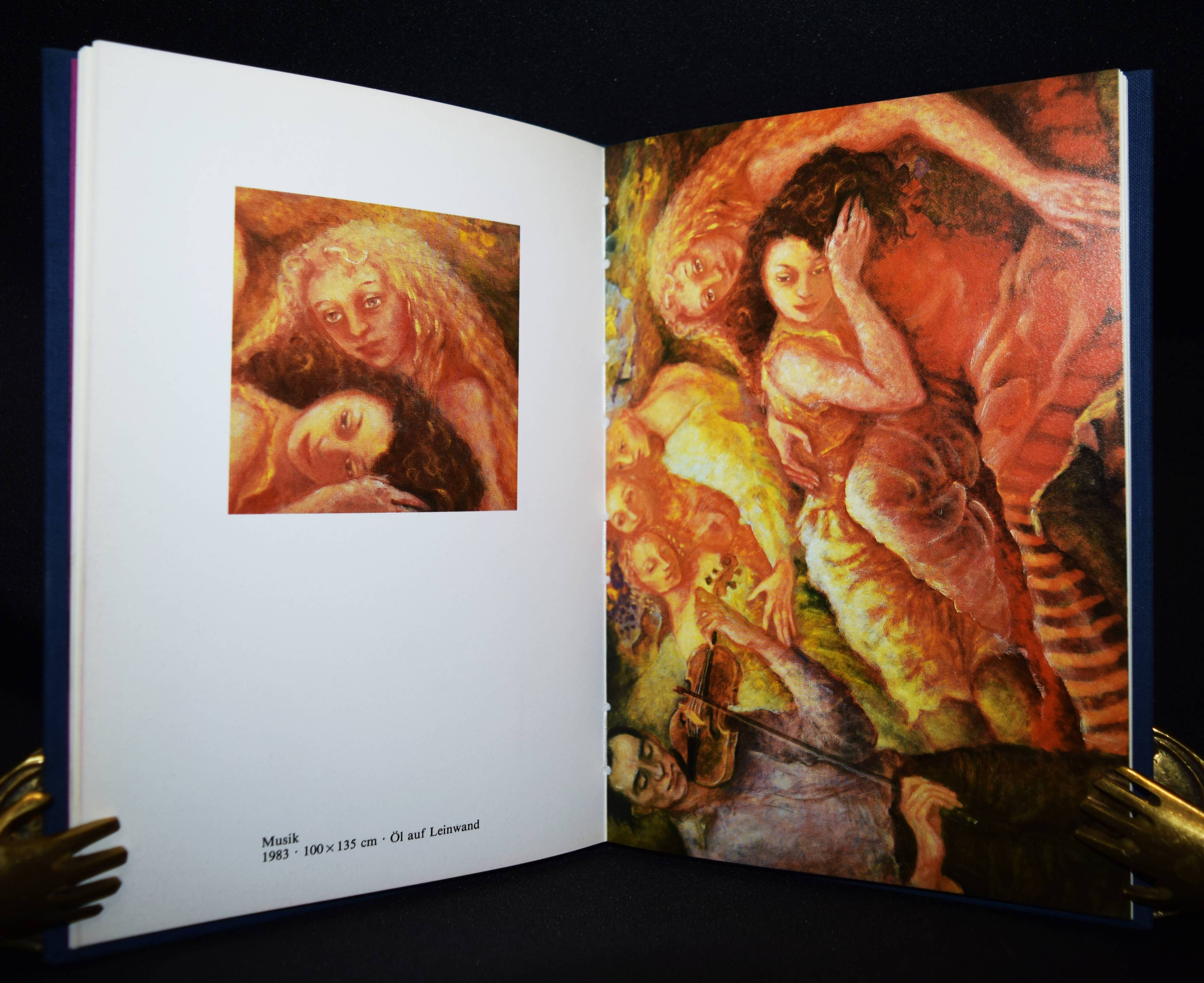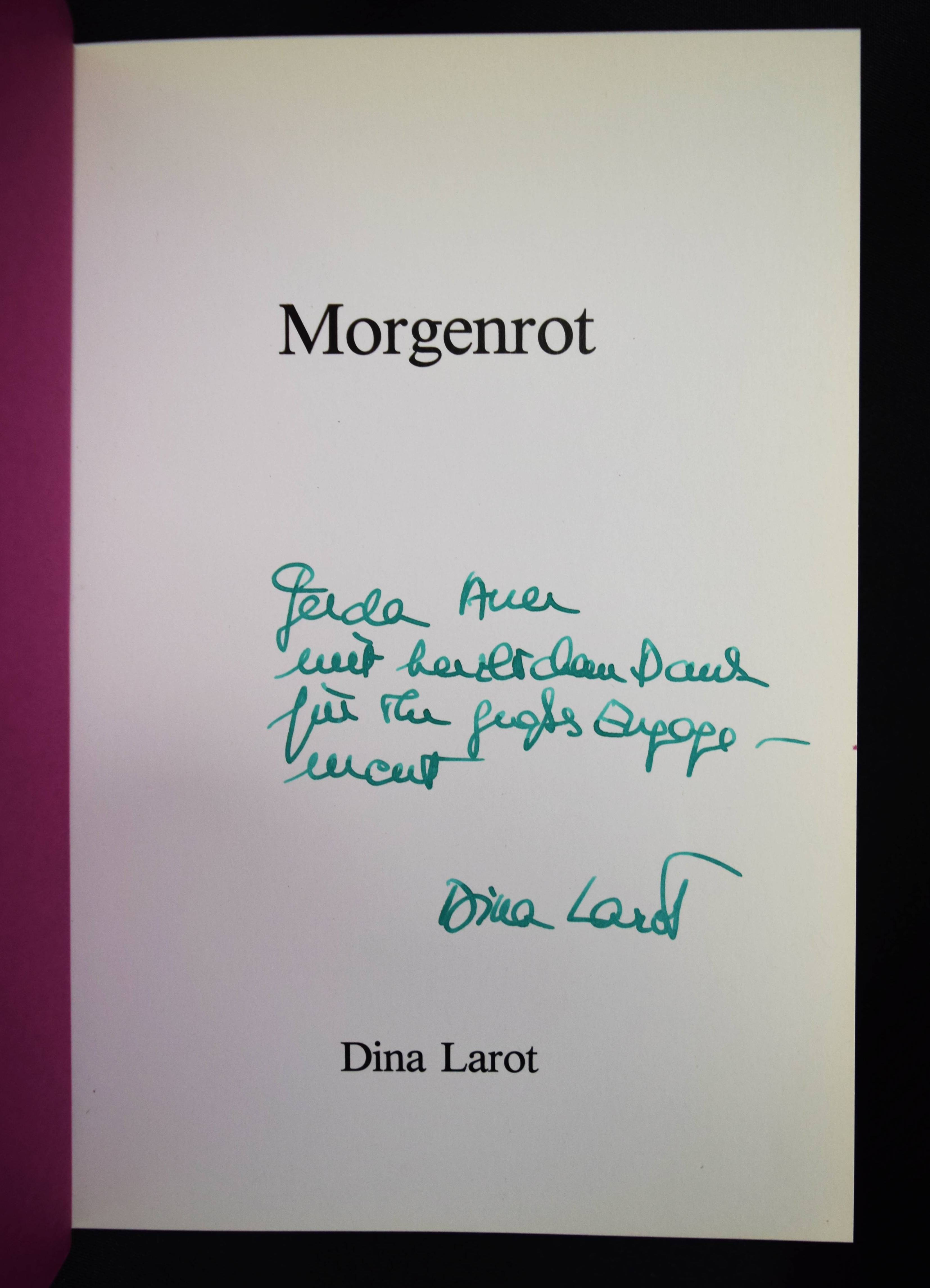 | Larot, Dina (d. i. Maria Elisabeth Lebzeltern). Morgenrot. Wien, Selbstverlag 1983. 8°. [64] S. mit 5 Fototafeln und 35 meist ganzs. farb. Abb. OLn. mit farb. Deckelbild. Mit eigenhändiger Widmung von D. Larot für Gerda Auer. – Dina Larot (geb. 1942 in Wien), „studierte bei Rudolf Szyszkowitz an der Kunstgewerbeschule Graz Malerei. Im Jahr 1962 war sie in Salzburg Teilnehmerin der Sommerakademie „Schule des Sehens“ bei Oskar Kokoschka. Im Zuge ihrer künstlerischen Entwicklung nahm sie den Künstlernamen Dina Larot an. … Hauptthemen ihres künstlerischen Schaffens sind weibliche Erotik und weibliche Sexualität. In Medien wird sie auch als Mädchenmalerin oder als Malerin des Weiblichen bezeichnet“ (Wikipedia). – Sehr gutes Exemplar.