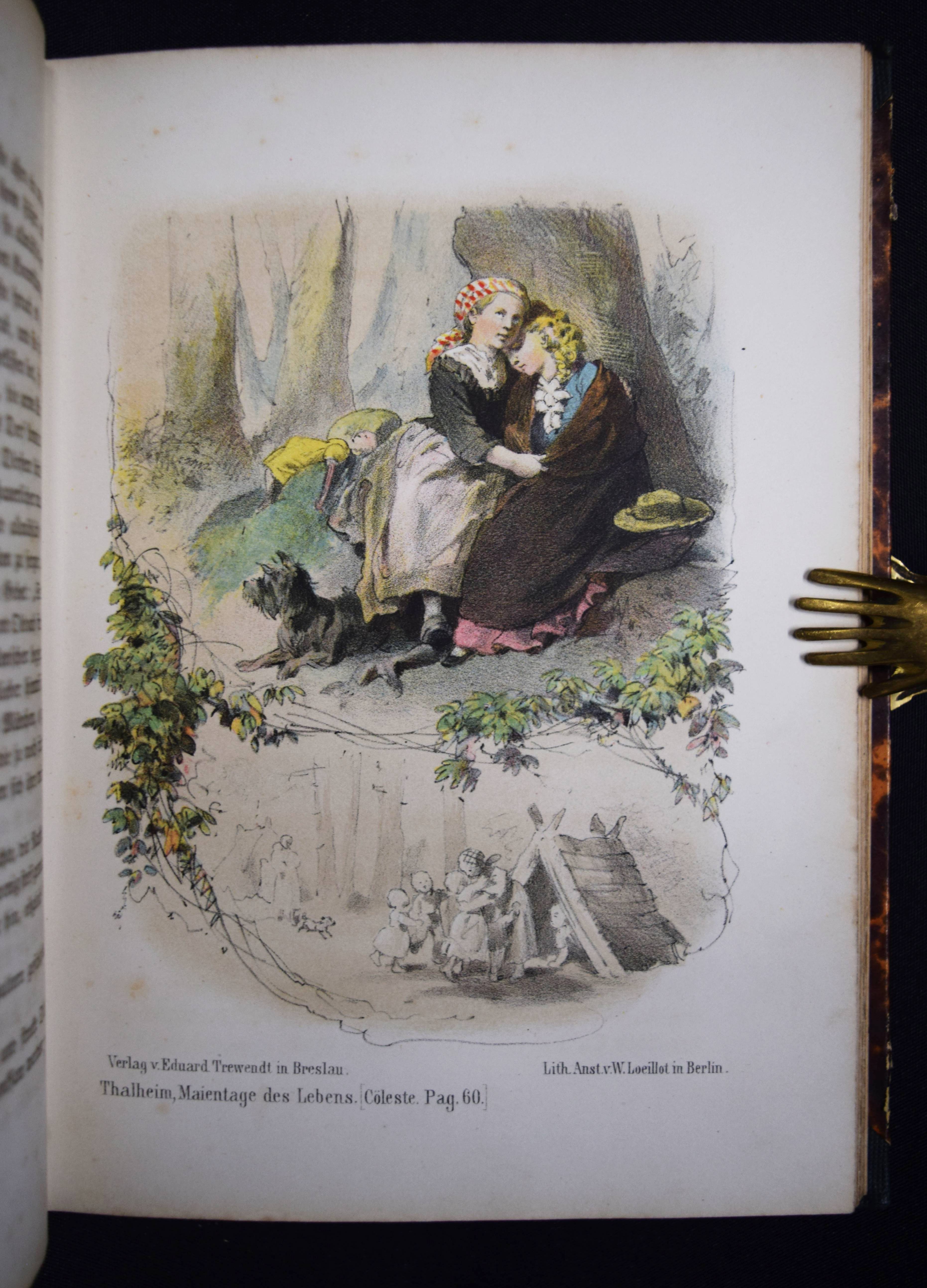Thalheim, Louise. Maientage des Lebens. Drei Erzählungen. Breslau, Eduard Trewendt 1871. 8°. 151 S. mit 4 lithogr. handkol. Illustrationen der Verfasserin. OHln. mit dekorativer figürlicher Rückenvergoldung. Daube, Katalog Benjamin 174. LKJ III, 526. Ries 920, 3. Semrau, Thalheim 34. Seebaß II, 2036. Wegehaupt II, 3389. – Erste Ausgabe, selten. – Die hübschen Tafeln zeigen jeweils eine größere kolorierte und eine kleinere getönte Darstellung. – „Eine hübsch illustrierte Jungmädchengeschichte” (A. Seebaß). – „Charakteristisch für Thalheims Stil ist die Verbindung eines größeren Hauptbildes mit mehreren kleineren vignettenartigen Bildchen. das Graziöse und Anmutige dieser Komposition und deren zarte und geschmackvolle Kolorierung heben sie aus ähnlichen Illustrationen der Zeit heraus“ (E. Semrau in LKJ). – Nur vereinzelt im Blattrand etwas fingerfleckig, sehr gutes Exemplar im dekorativen Verlagseinband.