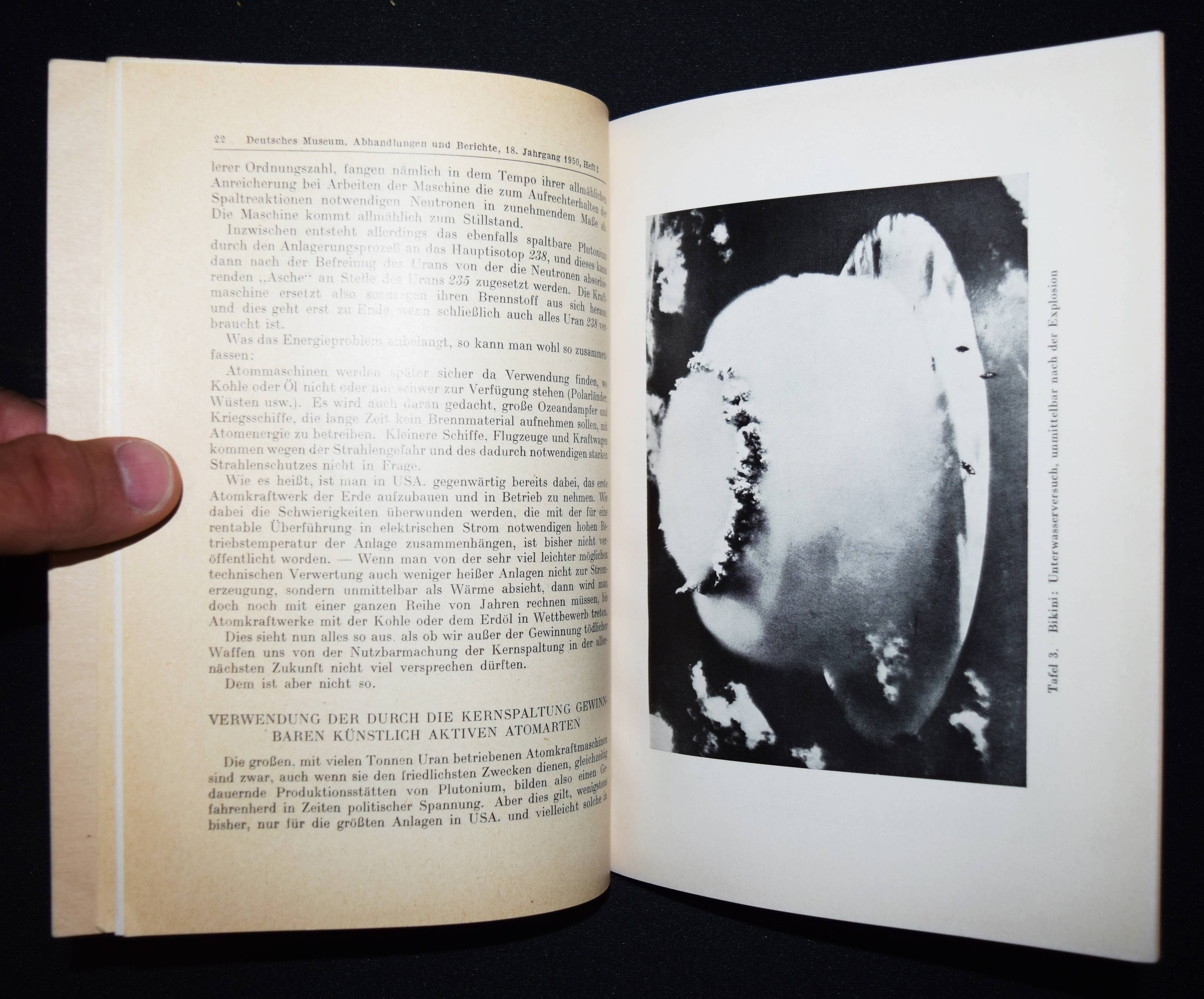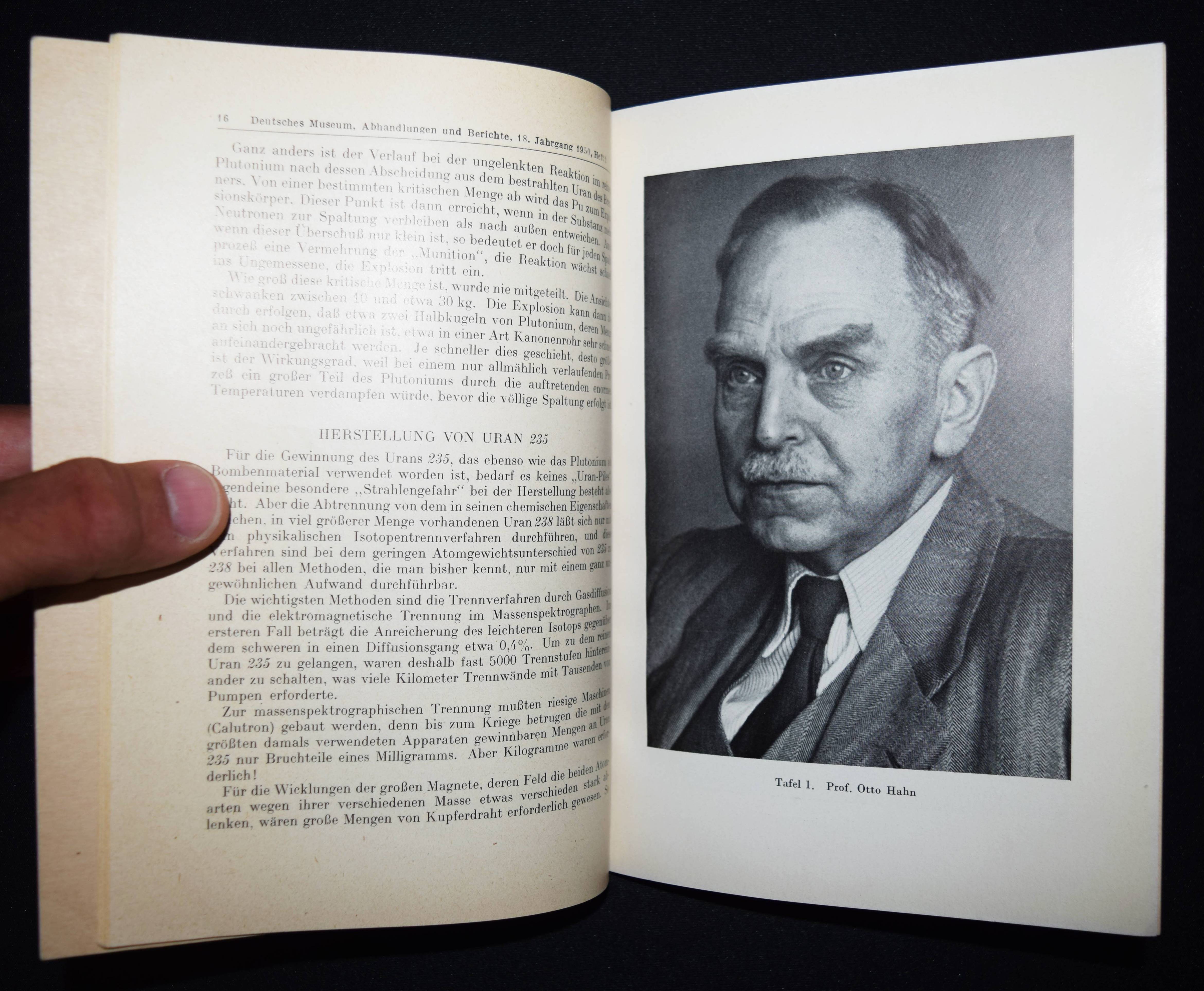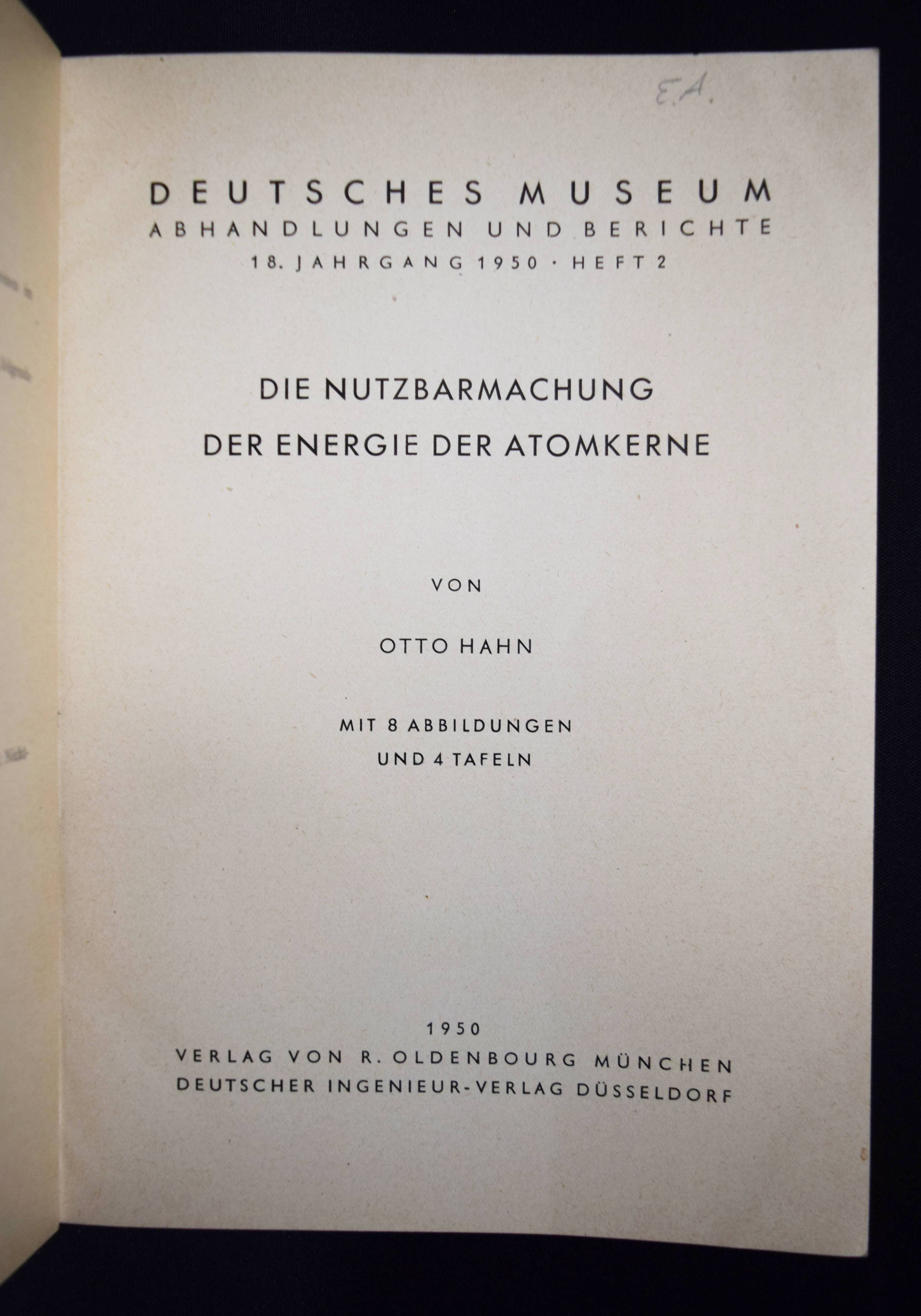 Hahn, Otto. Die Nutzbarmachung der Energie der Atomkerne. München, Oldenbourg 1950. 8°. 37 S. mit 4 Tafeln u. 8 Abb. OKart. (Abhandlungen und Berichte / Deutsches Museum, 18. Jahrgang, Heft 2). Erste Ausgabe. – Gutes Exemplar.