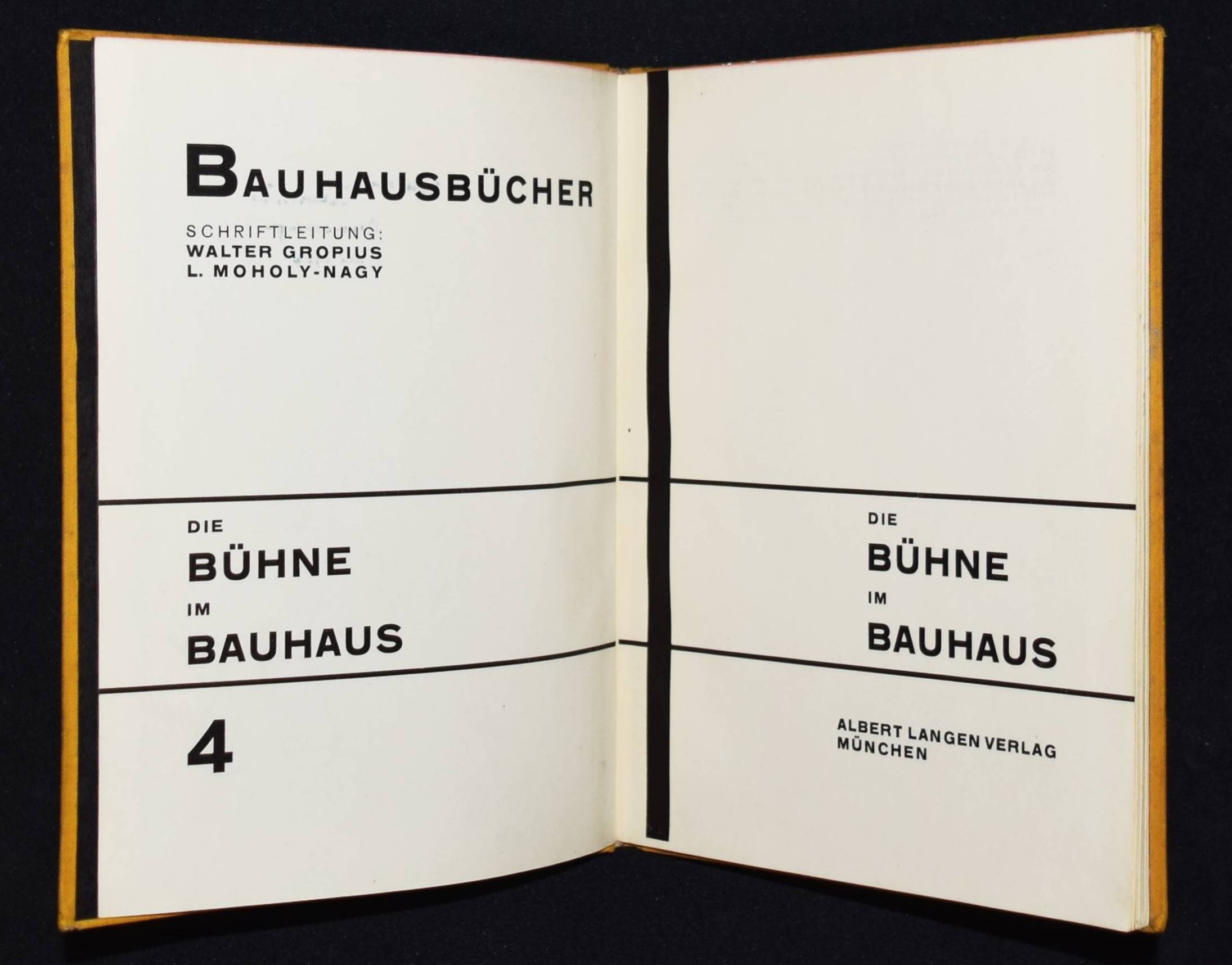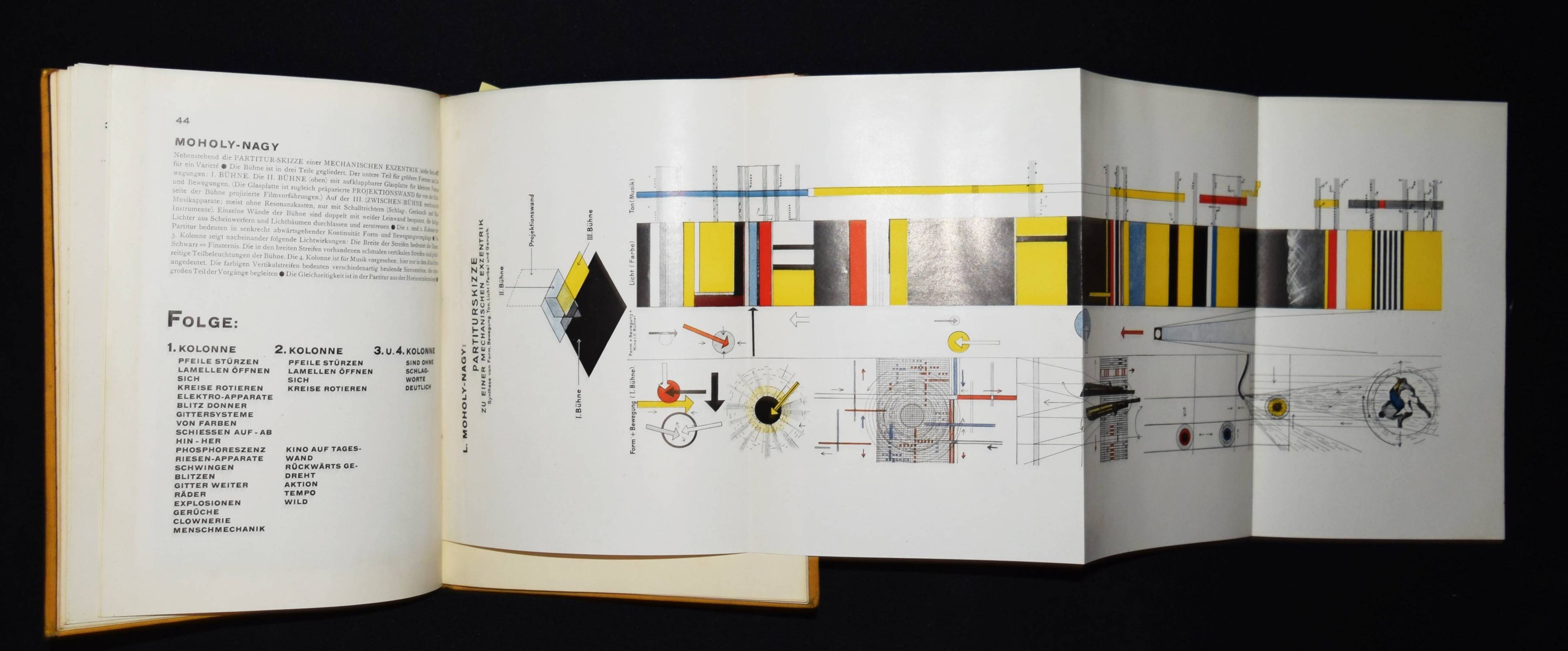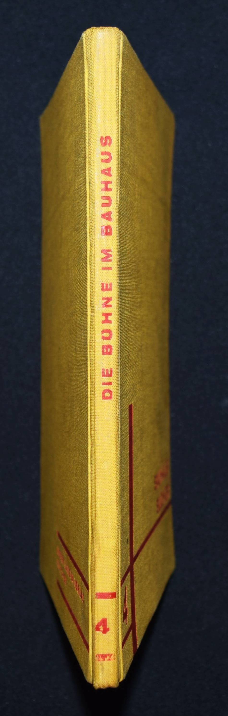 (Schlemmer, Oskar, Hrsg.). Die Bühne am Bauhaus. München, Albert Langen o. J. (1925). Gr.-8°. 84 S., [2] Bl. mit ca. 60 teils ganzs. Abb., davon 1 auf Transparentpapier u. 1 gefalt. Farbtafel. Gelber OLn. (Bauhausbücher, Band 4). Wingler 563.4. – Erste Ausgabe. – Oskar Schlemmer hatte sofort nach dem Umzug von Weimar nach Dessau die dortige Bauhausbühne übernommen. – Neben eigenen Texten finden sich Beiträge von Lazlo Moholy-Nagy (mit dessen farbig lithographierter „Partiturskizze zu einer mechanischen Exzentrik“), Farkas Molnár, Marcel Breuer, Kurt Schmidt, Xanti Schwawinsky und anderen. – Zahlreiche Abbildungen von Bühneninstallationen, Figurinen und der Bauhauskapelle. – Einband etwas angestaubt und leicht fleckig, zeitgenöss. Besitzvermerk und Stempel auf dem Vortitel, sonst gut erhalten.