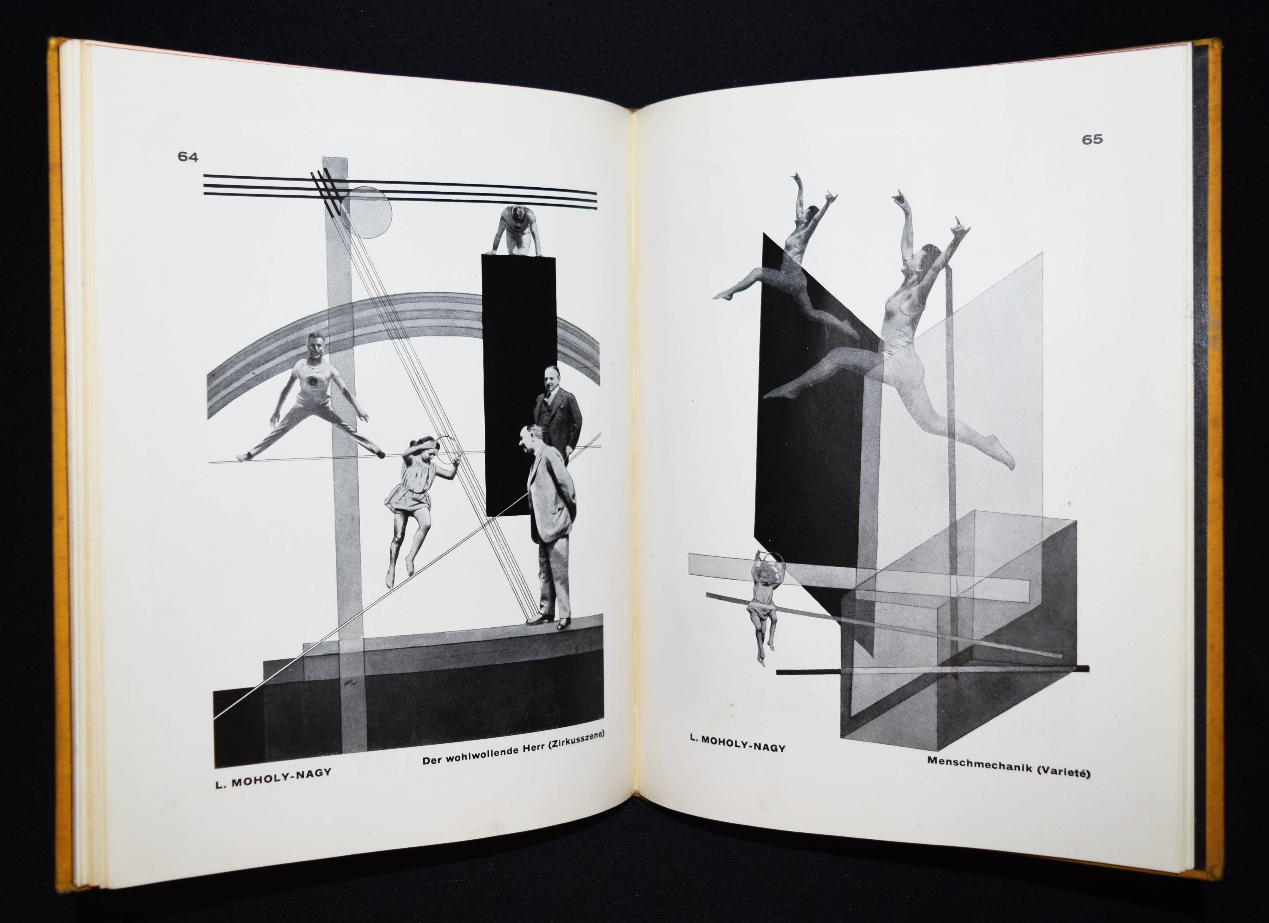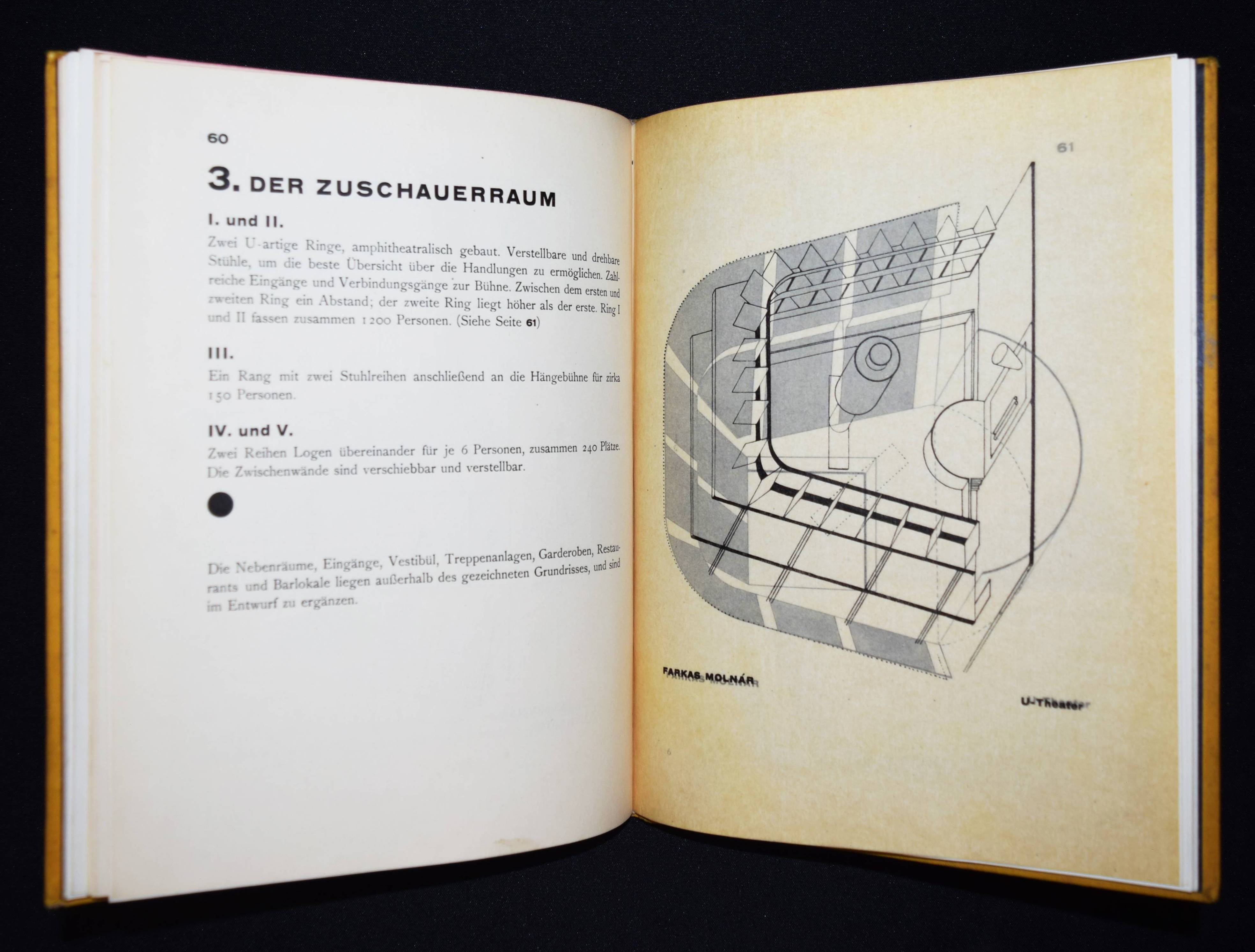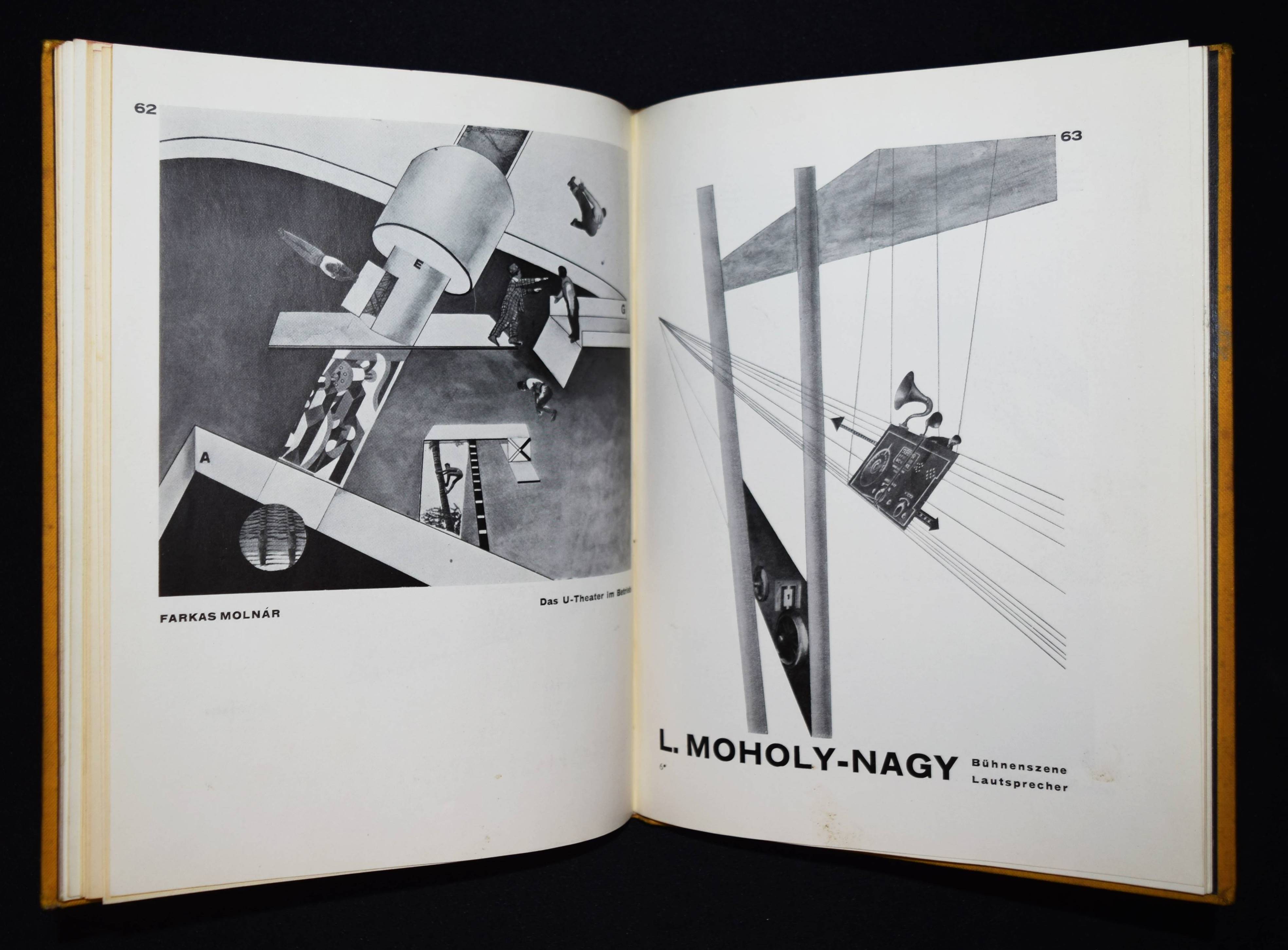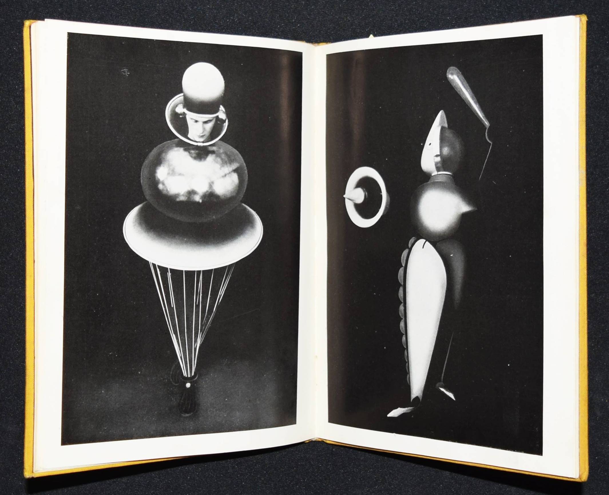 (Schlemmer, Oskar, Hrsg.). Die Bühne am Bauhaus. München, Albert Langen o. J. (1925). Gr.-8°. 84 S., [2] Bl. mit ca. 60 teils ganzs. Abb., davon 1 auf Transparentpapier u. 1 gefalt. Farbtafel. Gelber OLn. (Bauhausbücher, Band 4). Wingler 563.4. – Erste Ausgabe. – Oskar Schlemmer hatte sofort nach dem Umzug von Weimar nach Dessau die dortige Bauhausbühne übernommen. – Neben eigenen Texten finden sich Beiträge von Lazlo Moholy-Nagy (mit dessen farbig lithographierter „Partiturskizze zu einer mechanischen Exzentrik“), Farkas Molnár, Marcel Breuer, Kurt Schmidt, Xanti Schwawinsky und anderen. – Zahlreiche Abbildungen von Bühneninstallationen, Figurinen und der Bauhauskapelle. – Einband etwas angestaubt und leicht fleckig, zeitgenöss. Besitzvermerk und Stempel auf dem Vortitel, sonst gut erhalten.