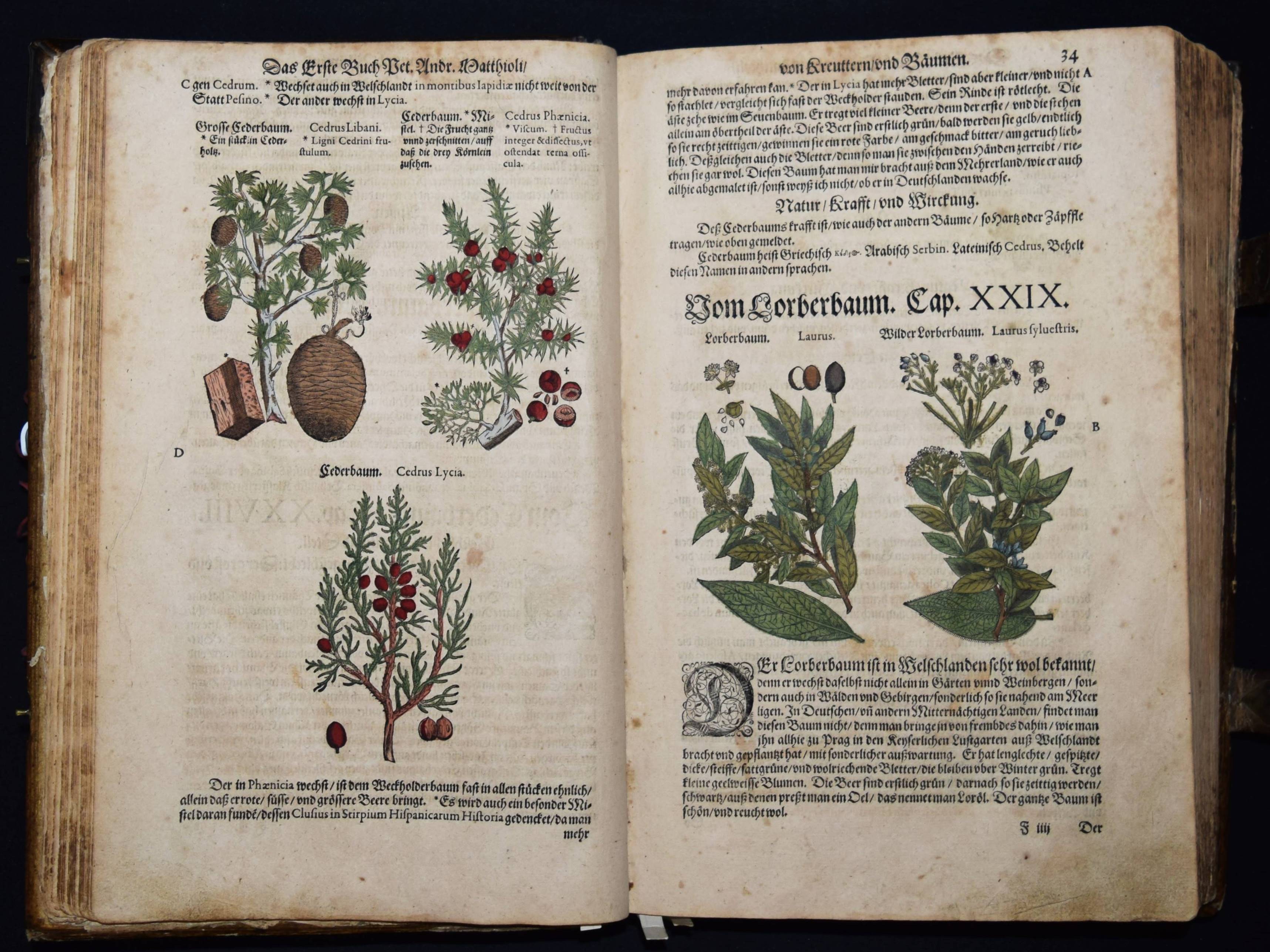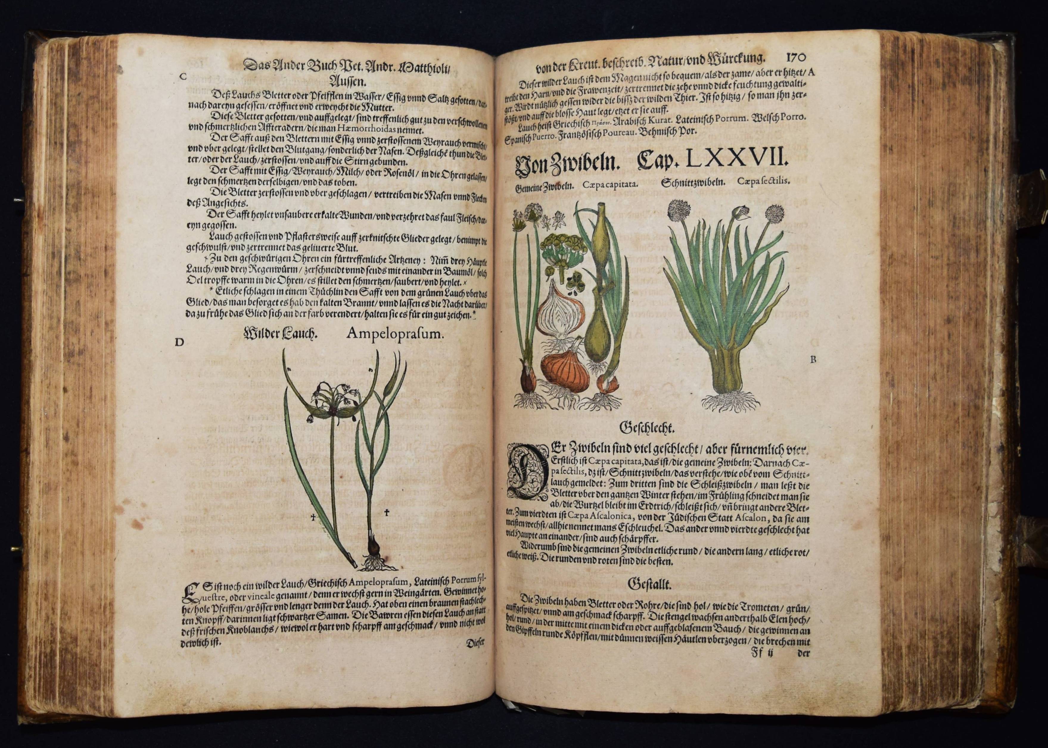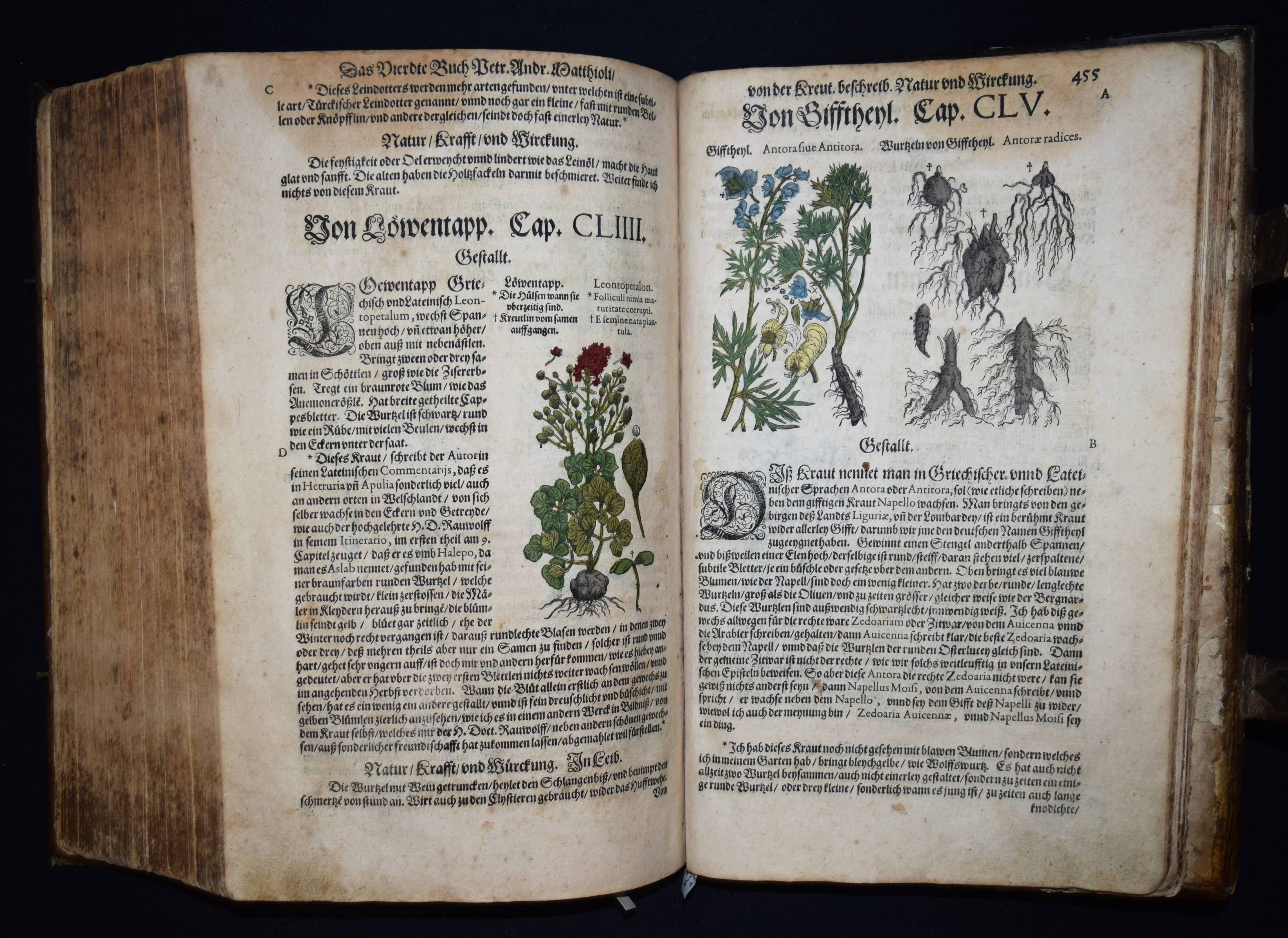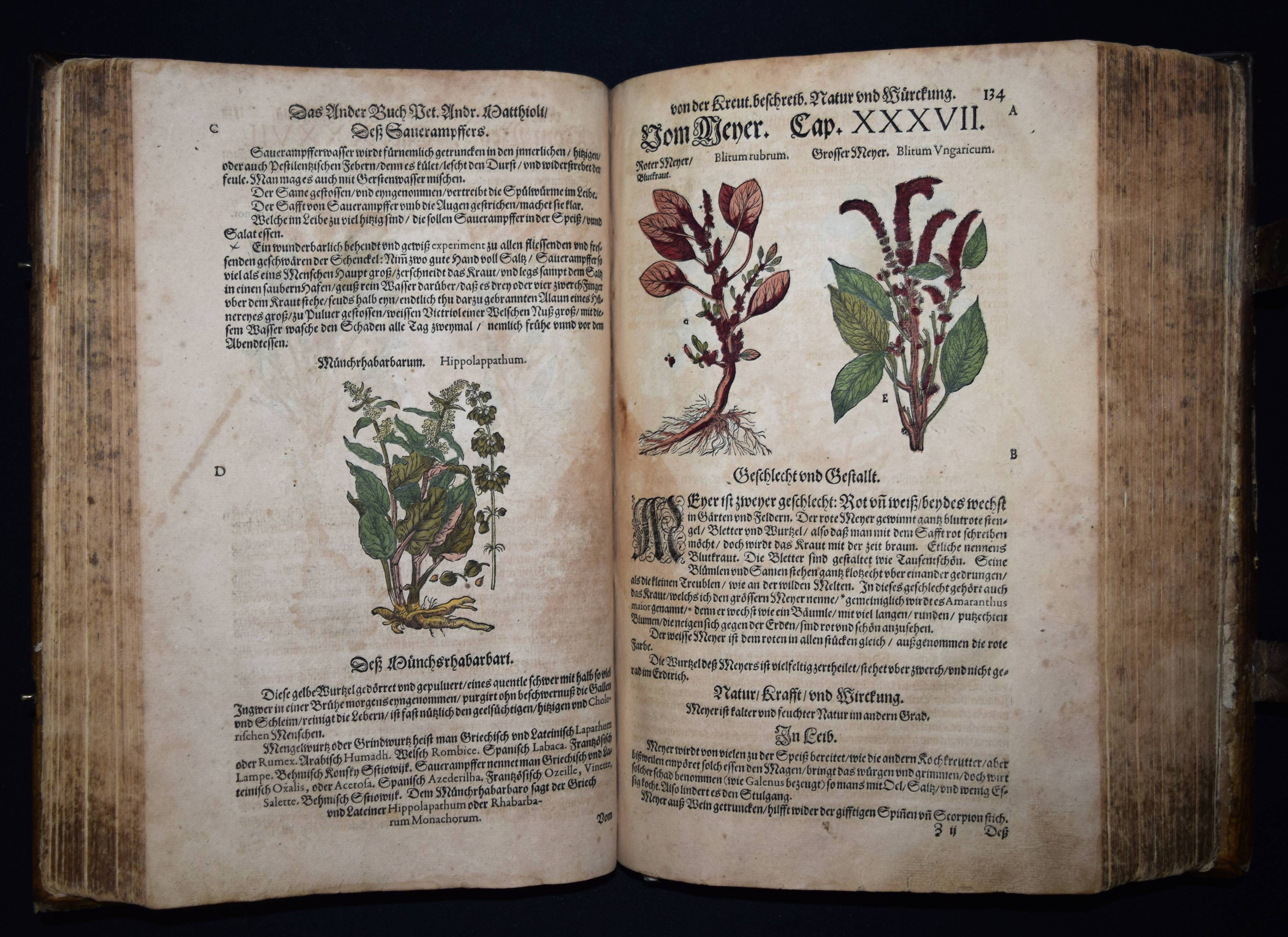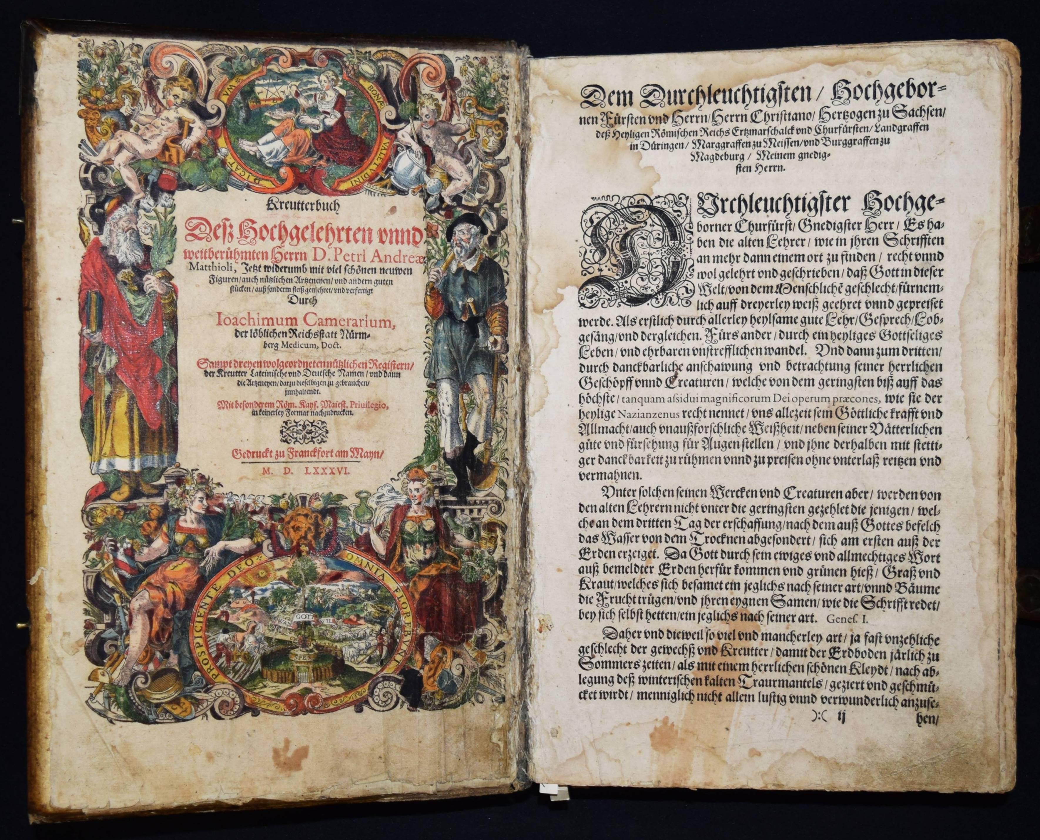 Matthioli (auch Mattioli), Petrus Andreas. Kreutterbuch. Jetzt widerunb mit viel schönen neuwen Figuren, auch nützlichen Artzneyen, und andern guten stücken, auß sonderm fleiß genlehret, und verfertigt durch Joachimum Camerarium der löblichen Reichsstatt Nürmberg Medicum, Doct. Sampt dreyen wolgeordneten nützlichen Registern, der Kreutter Lateinische und Teutsche Namen, und dann die Artzeneyen, darzu dieselbigen zu gebrauchen, innhaltendt. (Übersetzt von Georg Handsch). Frankfurt am Main, Sigmund Feyerabend, Jacob Fischer und Heinrich Dacken 1586. Folio (37,5 x 24 cm.). [8] Bl., 460 Bl., [37] Bl. mit handkol. illustr. Titel und ca. 800 handkol. Holzschnitten u. handkol. Druckermarke. Blindgepr. Schweinslederband der Zeit über Holzdeckeln mit 2 (statt 4) Eckbeschlägen und 2 Messing-Schließen. Hunt 210. Krivatsy 7576. Nissen, BBI 1311. VD16 M 1614 (verz. auch eine Variante aus demselben Jahr „Artzeneyen … Medicum, D.“, ZV 15556). Schmid, Ueber alte Kräuterbücher 40, 52, 57, 61 f. – Zweite von Joachim Camerarius bearbeitete Ausgabe, die erstmals 1563 erschienen war. „Der von Camerarius besorgten Ausgabe liegt die Prager Übersetzung durch Georg Handsch zugrunde. Die Abbildungen stammen aus dem Nachlaß Conrad Geßners, den Camerarius erworben hatte“ (Nissen, Kräuterbucher, S. 68). Neben Geßners Holzschnitten wurden auch Holzschnitte der Valgrisi-Ausgabe verwendet. – Mit zahlreichen interessanten Textpassagen über die Herkunftländer wichtiger Pflanzen und deren Einführung in Europa: „Occidentales indios“ (Bl. 5 verso), „Indianer“ und „Insel S. Dominici“ (Bl. 54), „Ebenus ist ein Baum, … Diß Holtz wirde zu uns gebracht auß India. Die Spanier bringen es auß den newen erfunden Inseln…“ (Bl. 53 verso u. 54 verso), „Die Muscaten Nüß wachsen in grosser menge in der Insel Badan…“ (Bl. 97 verso), Mais, „Vom Türckischen Korn. … es wechst nicht in Asia in der Türckey, sondern in India, so gegen Mitternacht ligt… Die Indianer nennen diß Korn in ihrer sprachen Mehiz, oder Maiz …“ (Bl. 114 verso u. 115), „Von Indianischem, oder Calecutischem Pfeffer“ (Bl. 181), „Der gemeine Pfeffer wechst auch in India, … Die histori haben wir von Spaniern und Portugalesern, welche uber Meer schiffen gegen Mittag unnd Morgen auff Calceuth, Taprobana, Java, und andere Inseln …“ (Bl. 181 verso), „Diese edel Wurtzel Rhabarbarum …“ (Bl. 211 verso), „Stachlicht Aloe … „Umb Moxico wechst es gar viel …“ (Bl. 231 verso), „Flos Solis Peruuianus (Sonnenblume). Vor etlichen Jaren hat man dieses gewechs auß America und Peru, … zu uns gebracht, …“ (Bl. 261 verso), „Tabacum sive Petum. … Dieses gewechs ist erstlich auß America in Franckreich gebracht worden, wechst sonderlich viel in einer Insel, die wie das Kraut Tabacco heisset, …“ (Bl. 373 verso) u.v.m. Außerdem findet sich im Nachwort ein interessanter Hinweis zur erfolgreichen Editionsgeschichte des Werks „… unnd von dem ersten druck an biß auff diese zeit uber die zwey und dreyssig tausendt Exemplar verhandelt sind worden …“ – Einband etwas berieben, Titel und das letzte Bl. mit der Druckermarke mit Knickspuren und alt restaurierten Einrissen, ein Textblatt (Bl. 256) mit halbseitigem Abriss (liegt als Farbkopie bei), wenige Blätter im Register mit alt restaurierten Eckabrissen (teils geringer Textverlust), durchgehend gleichmäßig gebräunt und im unteren Blattrand teils etwas fingerfleckig, noch sehr gutes Exemplar der seltenen altkolorierten Ausgabe in einem dekorativen zeitgenössischen Einband.