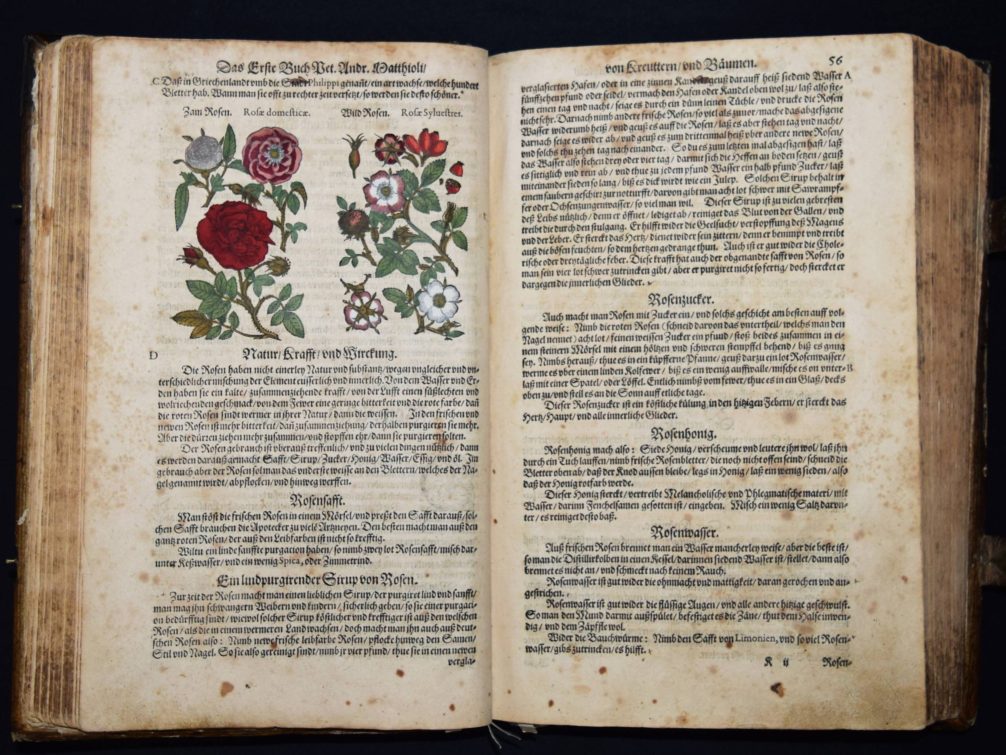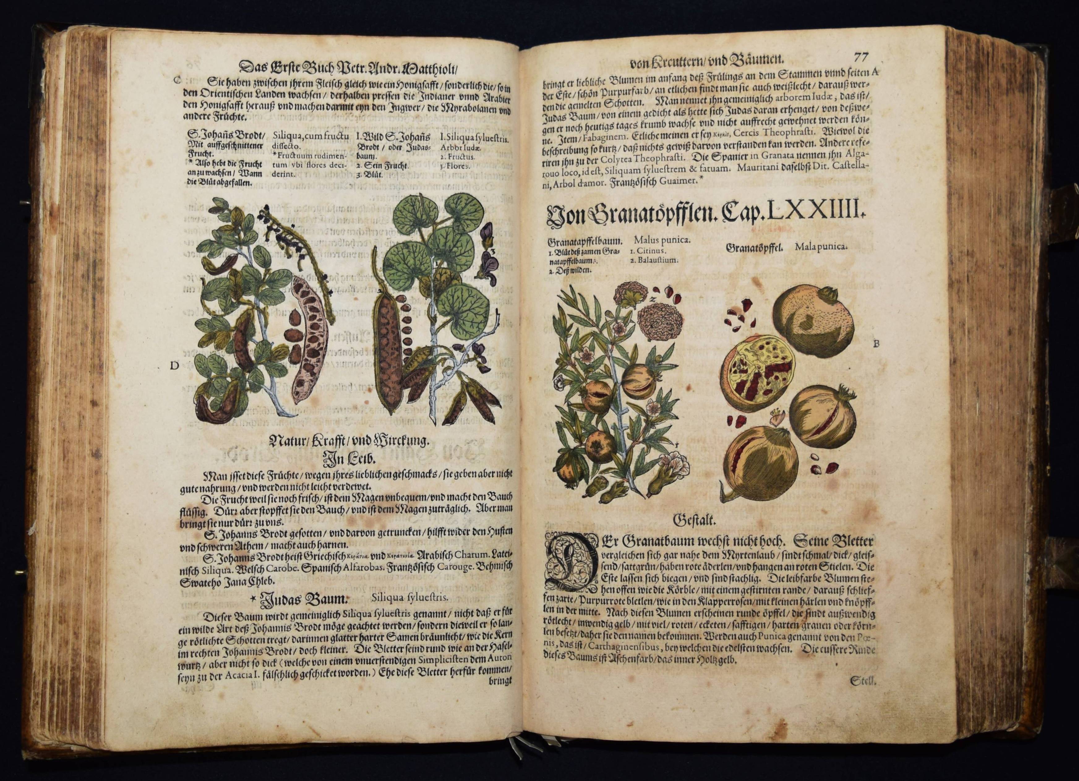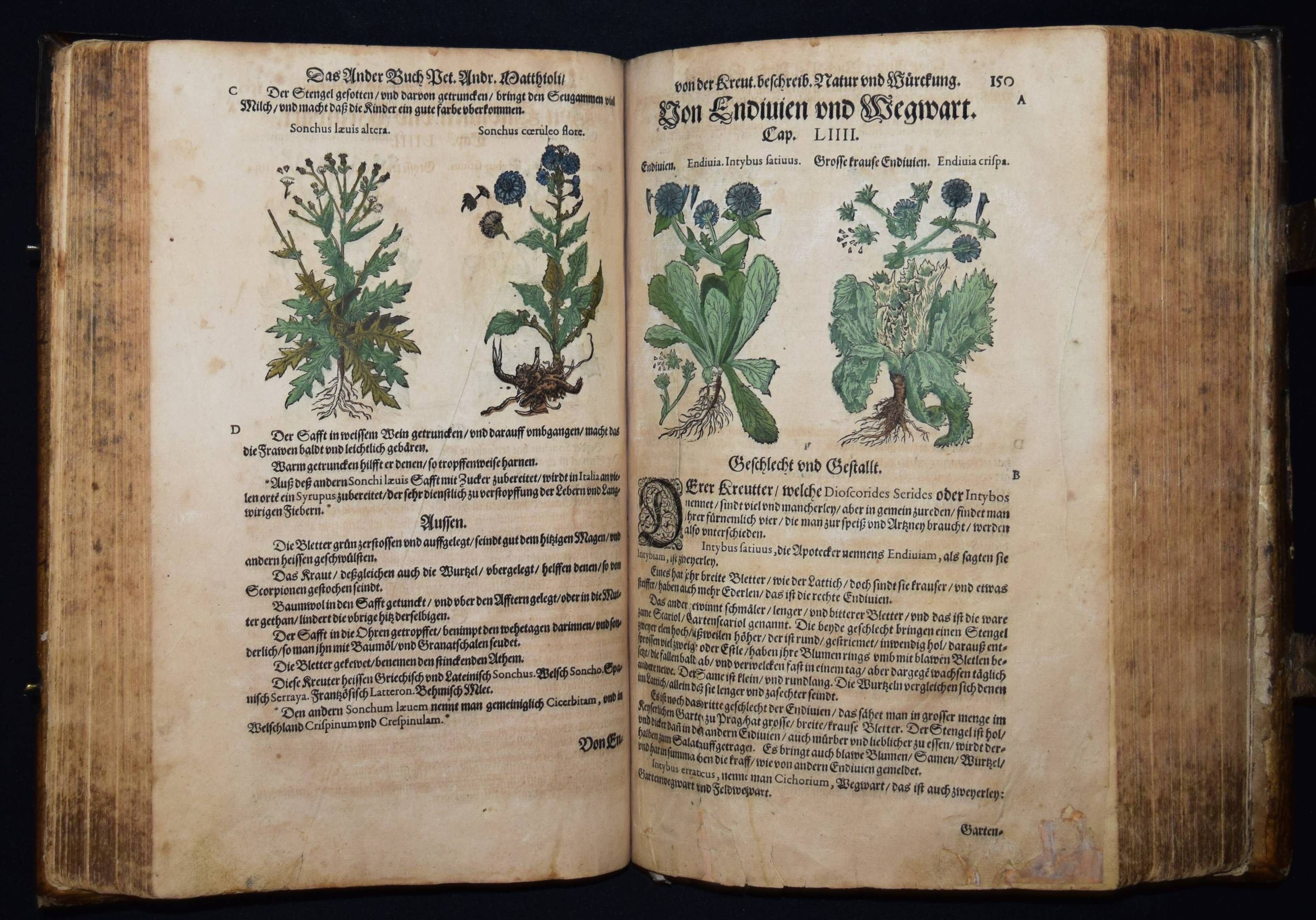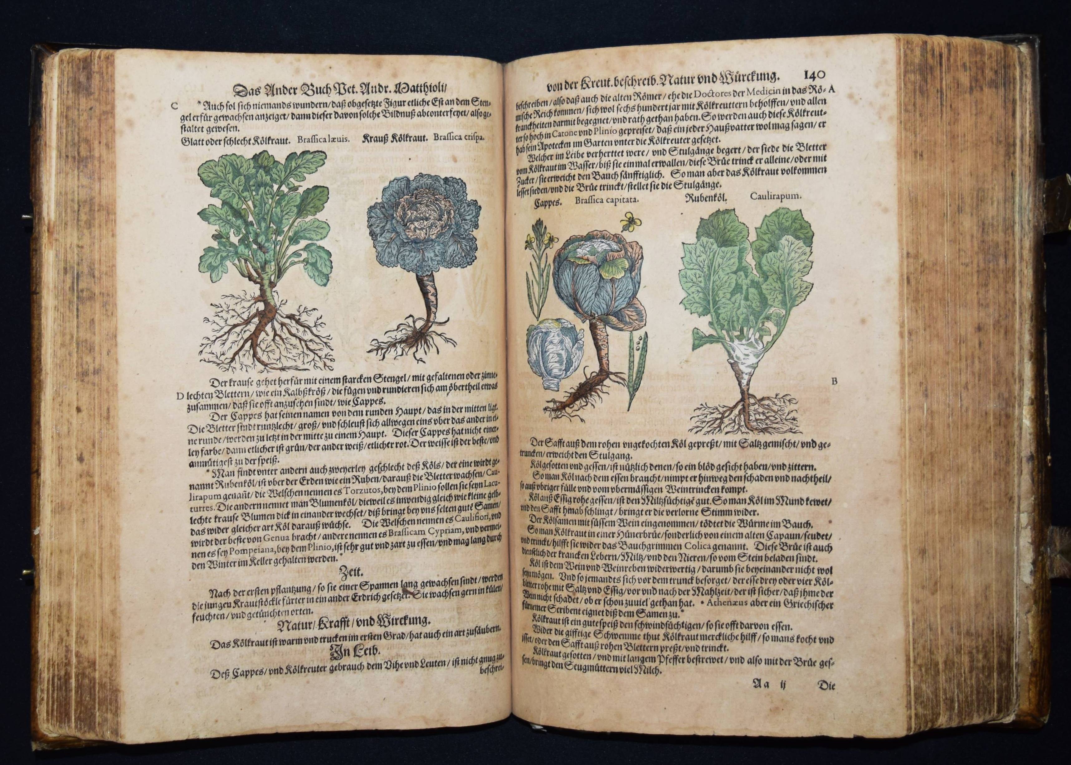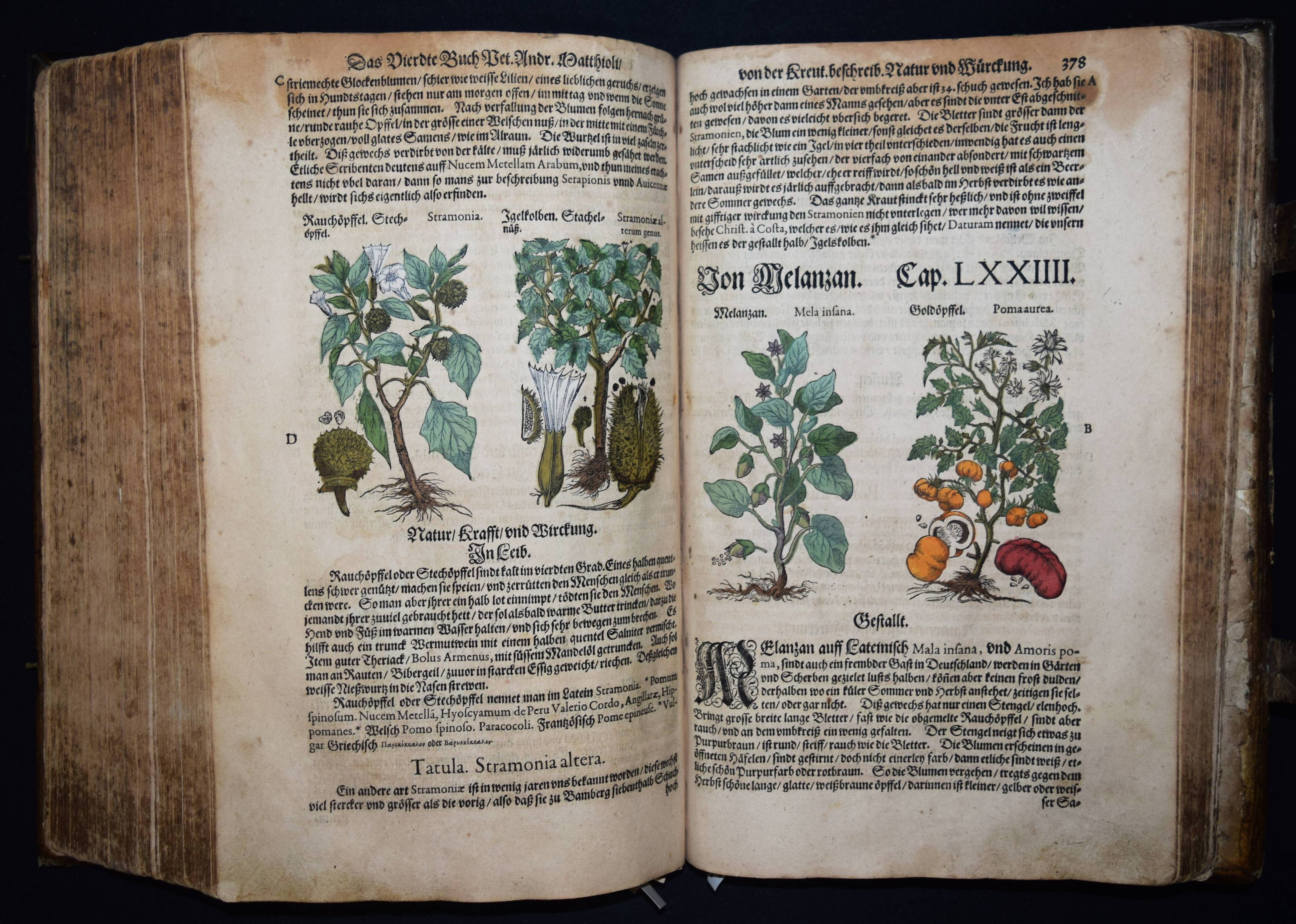 Matthioli (auch Mattioli), Petrus Andreas. Kreutterbuch. Jetzt widerunb mit viel schönen neuwen Figuren, auch nützlichen Artzneyen, und andern guten stücken, auß sonderm fleiß genlehret, und verfertigt durch Joachimum Camerarium der löblichen Reichsstatt Nürmberg Medicum, Doct. Sampt dreyen wolgeordneten nützlichen Registern, der Kreutter Lateinische und Teutsche Namen, und dann die Artzeneyen, darzu dieselbigen zu gebrauchen, innhaltendt. (Übersetzt von Georg Handsch). Frankfurt am Main, Sigmund Feyerabend, Jacob Fischer und Heinrich Dacken 1586. Folio (37,5 x 24 cm.). [8] Bl., 460 Bl., [37] Bl. mit handkol. illustr. Titel und ca. 800 handkol. Holzschnitten u. handkol. Druckermarke. Blindgepr. Schweinslederband der Zeit über Holzdeckeln mit 2 (statt 4) Eckbeschlägen und 2 Messing-Schließen. Hunt 210. Krivatsy 7576. Nissen, BBI 1311. VD16 M 1614 (verz. auch eine Variante aus demselben Jahr „Artzeneyen … Medicum, D.“, ZV 15556). Schmid, Ueber alte Kräuterbücher 40, 52, 57, 61 f. – Zweite von Joachim Camerarius bearbeitete Ausgabe, die erstmals 1563 erschienen war. „Der von Camerarius besorgten Ausgabe liegt die Prager Übersetzung durch Georg Handsch zugrunde. Die Abbildungen stammen aus dem Nachlaß Conrad Geßners, den Camerarius erworben hatte“ (Nissen, Kräuterbucher, S. 68). Neben Geßners Holzschnitten wurden auch Holzschnitte der Valgrisi-Ausgabe verwendet. – Mit zahlreichen interessanten Textpassagen über die Herkunftländer wichtiger Pflanzen und deren Einführung in Europa: „Occidentales indios“ (Bl. 5 verso), „Indianer“ und „Insel S. Dominici“ (Bl. 54), „Ebenus ist ein Baum, … Diß Holtz wirde zu uns gebracht auß India. Die Spanier bringen es auß den newen erfunden Inseln…“ (Bl. 53 verso u. 54 verso), „Die Muscaten Nüß wachsen in grosser menge in der Insel Badan…“ (Bl. 97 verso), Mais, „Vom Türckischen Korn. … es wechst nicht in Asia in der Türckey, sondern in India, so gegen Mitternacht ligt… Die Indianer nennen diß Korn in ihrer sprachen Mehiz, oder Maiz …“ (Bl. 114 verso u. 115), „Von Indianischem, oder Calecutischem Pfeffer“ (Bl. 181), „Der gemeine Pfeffer wechst auch in India, … Die histori haben wir von Spaniern und Portugalesern, welche uber Meer schiffen gegen Mittag unnd Morgen auff Calceuth, Taprobana, Java, und andere Inseln …“ (Bl. 181 verso), „Diese edel Wurtzel Rhabarbarum …“ (Bl. 211 verso), „Stachlicht Aloe … „Umb Moxico wechst es gar viel …“ (Bl. 231 verso), „Flos Solis Peruuianus (Sonnenblume). Vor etlichen Jaren hat man dieses gewechs auß America und Peru, … zu uns gebracht, …“ (Bl. 261 verso), „Tabacum sive Petum. … Dieses gewechs ist erstlich auß America in Franckreich gebracht worden, wechst sonderlich viel in einer Insel, die wie das Kraut Tabacco heisset, …“ (Bl. 373 verso) u.v.m. Außerdem findet sich im Nachwort ein interessanter Hinweis zur erfolgreichen Editionsgeschichte des Werks „… unnd von dem ersten druck an biß auff diese zeit uber die zwey und dreyssig tausendt Exemplar verhandelt sind worden …“ – Einband etwas berieben, Titel und das letzte Bl. mit der Druckermarke mit Knickspuren und alt restaurierten Einrissen, ein Textblatt (Bl. 256) mit halbseitigem Abriss (liegt als Farbkopie bei), wenige Blätter im Register mit alt restaurierten Eckabrissen (teils geringer Textverlust), durchgehend gleichmäßig gebräunt und im unteren Blattrand teils etwas fingerfleckig, noch sehr gutes Exemplar der seltenen altkolorierten Ausgabe in einem dekorativen zeitgenössischen Einband.