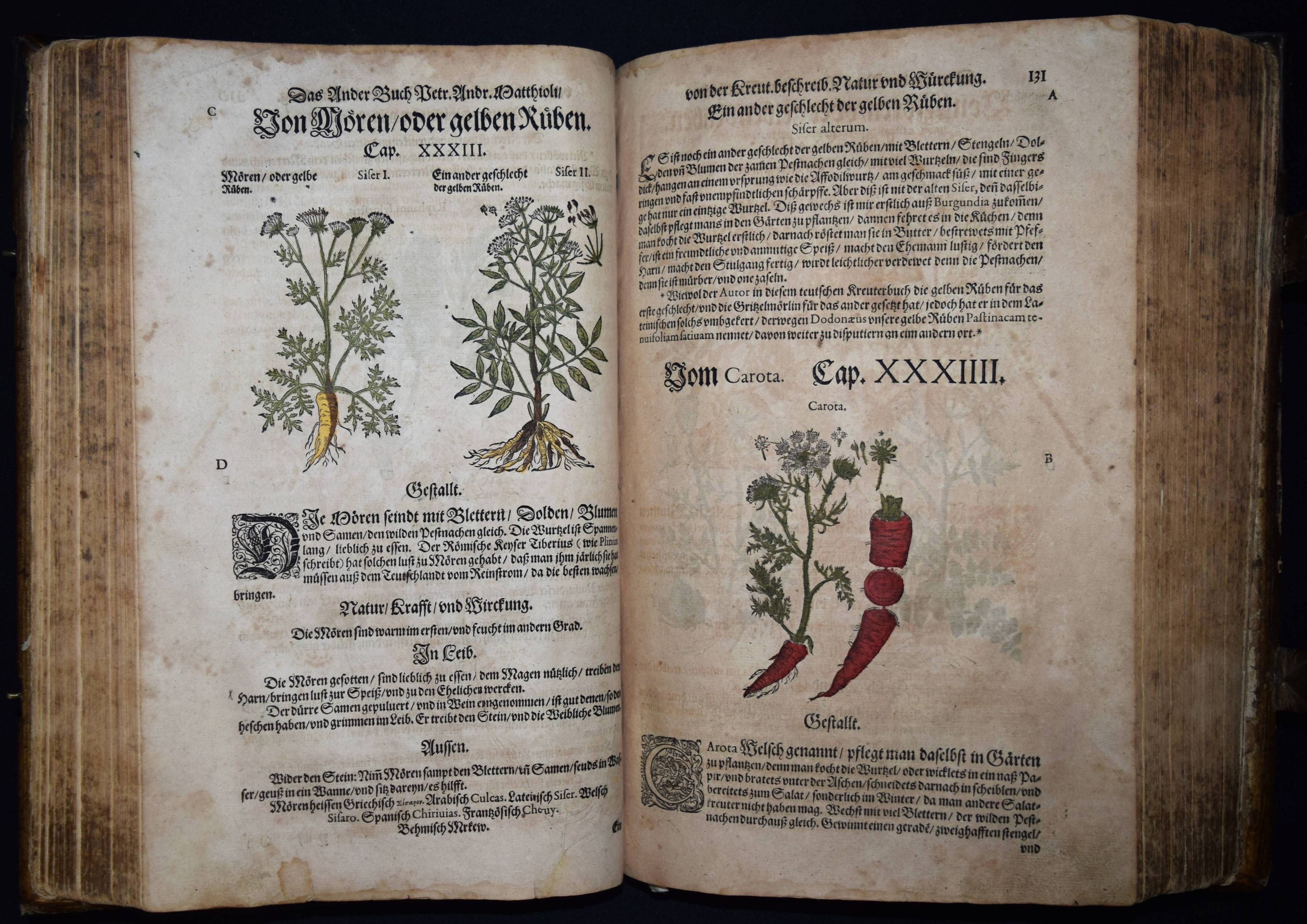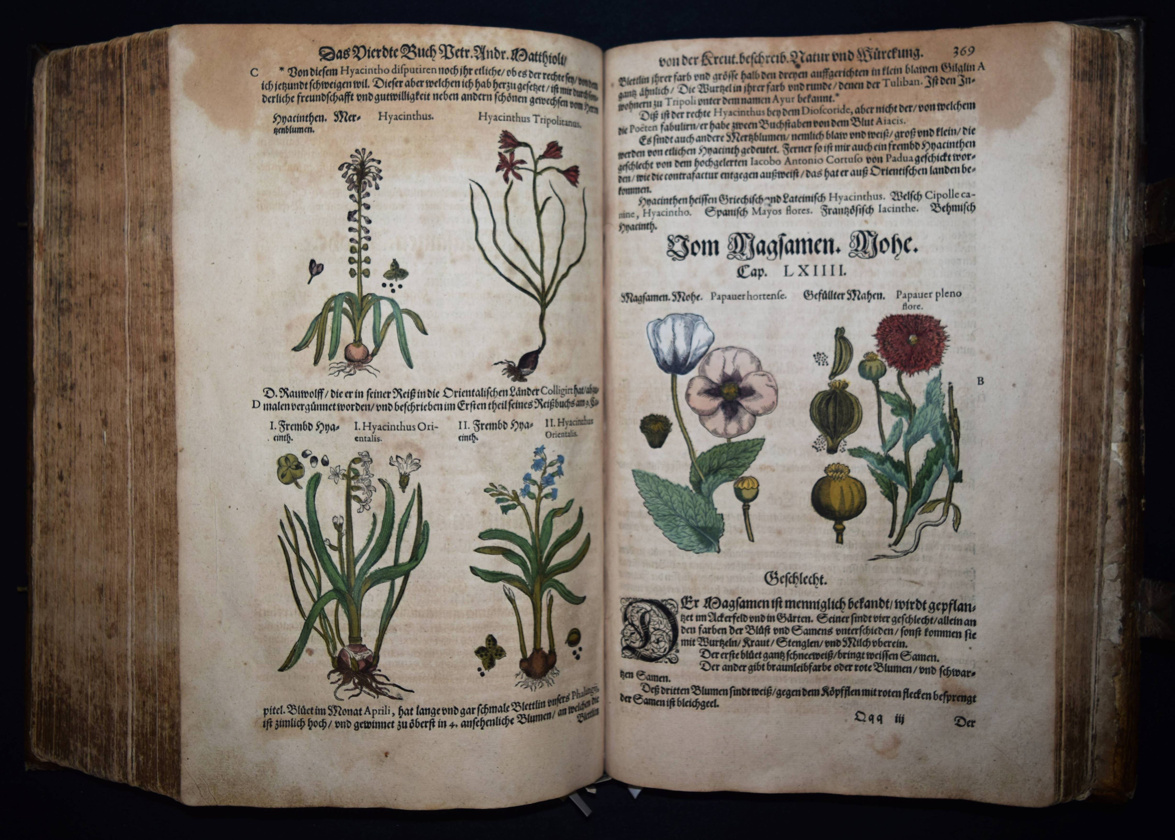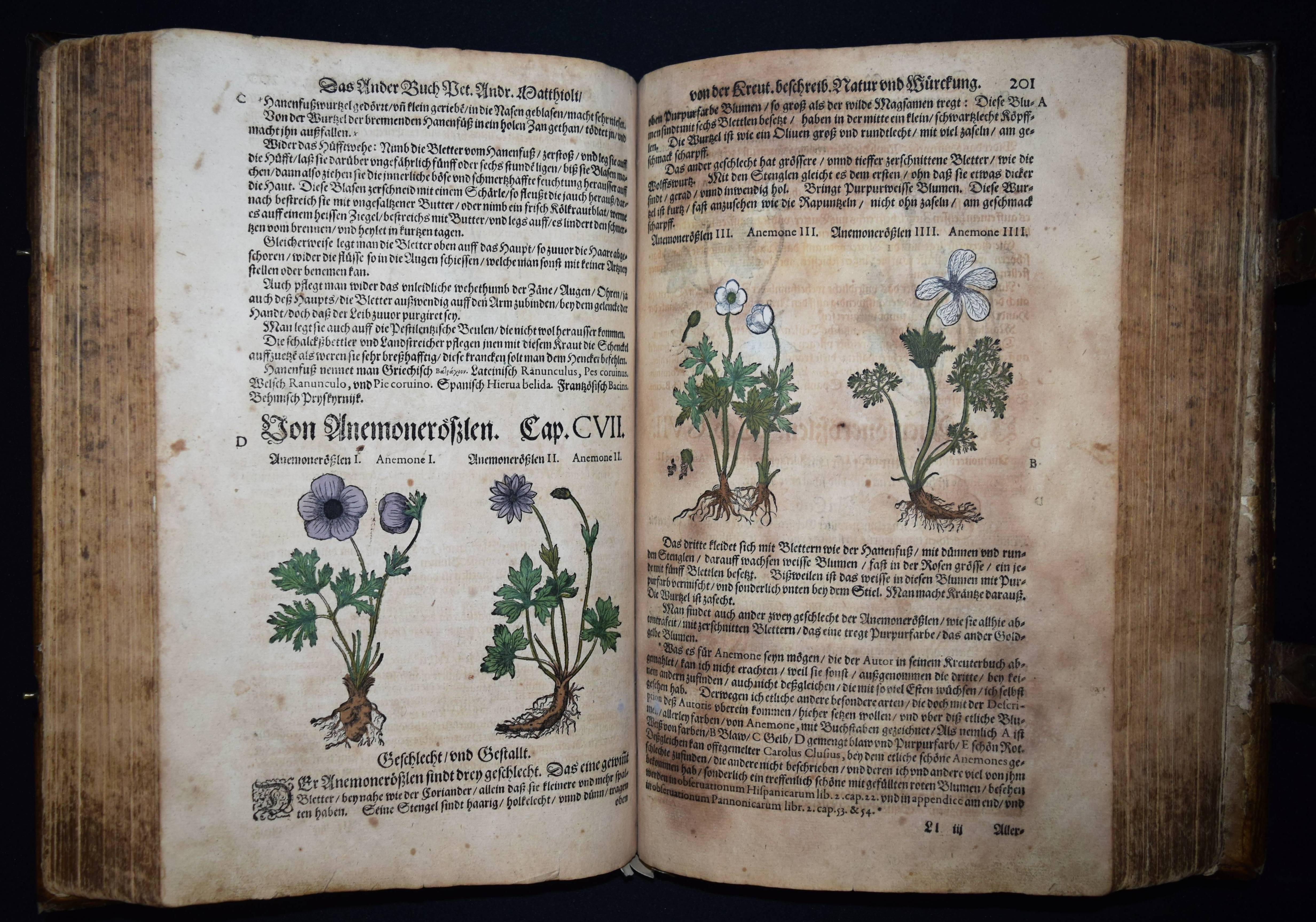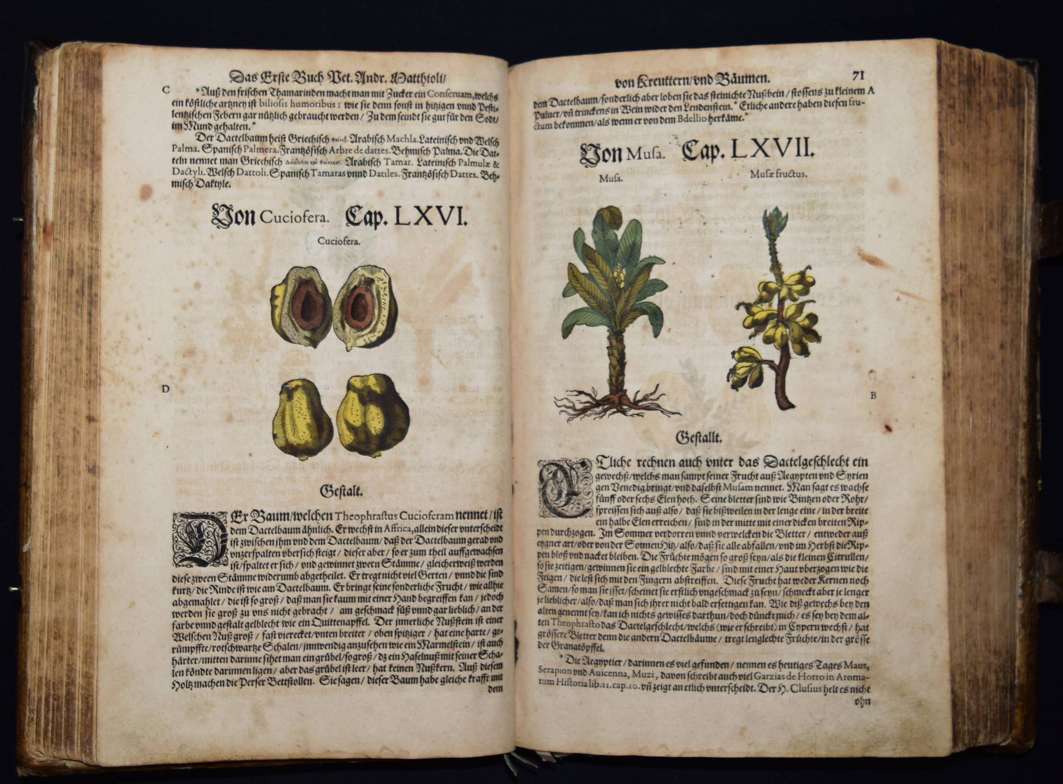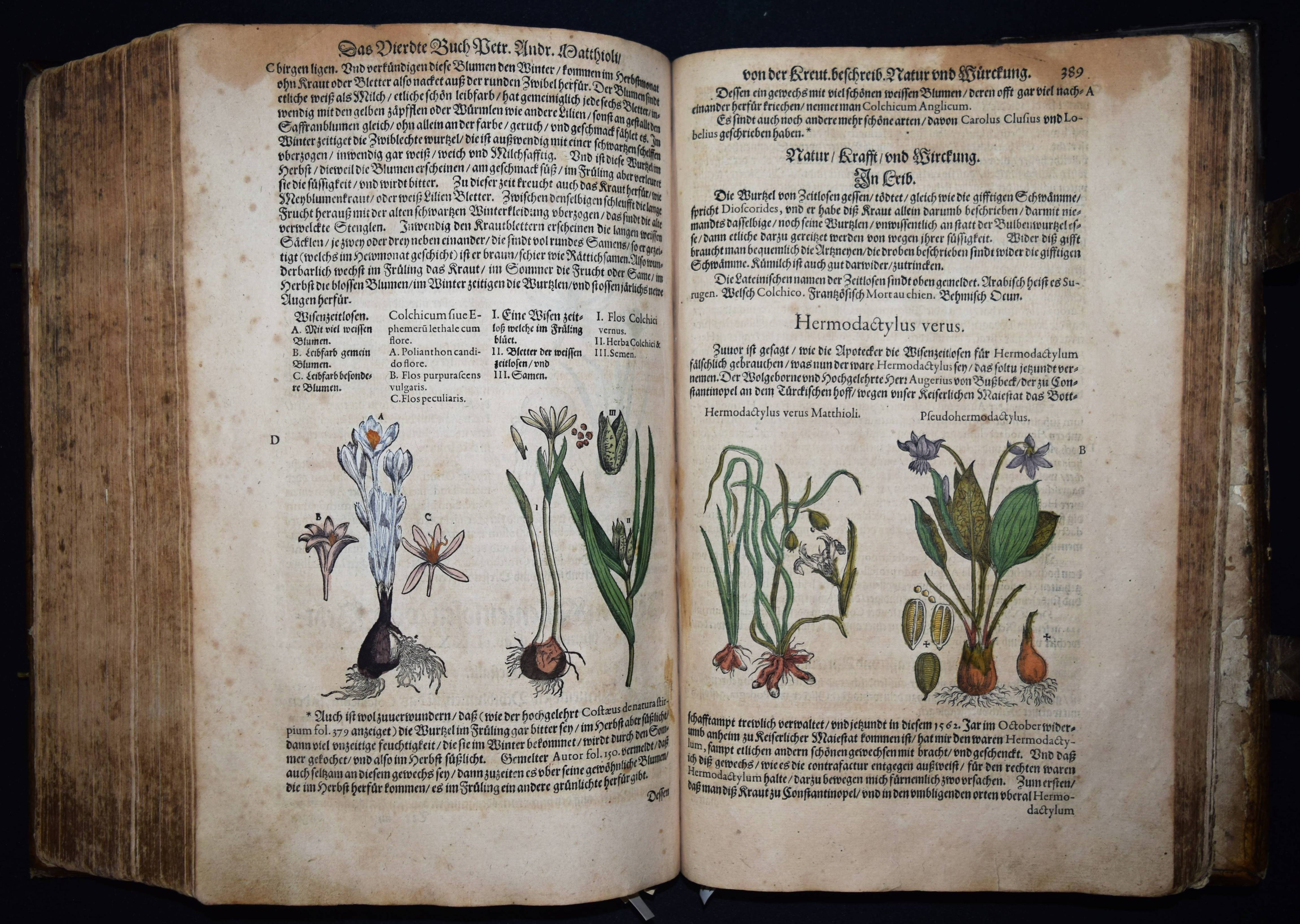 Matthioli (auch Mattioli), Petrus Andreas. Kreutterbuch. Jetzt widerunb mit viel schönen neuwen Figuren, auch nützlichen Artzneyen, und andern guten stücken, auß sonderm fleiß genlehret, und verfertigt durch Joachimum Camerarium der löblichen Reichsstatt Nürmberg Medicum, Doct. Sampt dreyen wolgeordneten nützlichen Registern, der Kreutter Lateinische und Teutsche Namen, und dann die Artzeneyen, darzu dieselbigen zu gebrauchen, innhaltendt. (Übersetzt von Georg Handsch). Frankfurt am Main, Sigmund Feyerabend, Jacob Fischer und Heinrich Dacken 1586. Folio (37,5 x 24 cm.). [8] Bl., 460 Bl., [37] Bl. mit handkol. illustr. Titel und ca. 800 handkol. Holzschnitten u. handkol. Druckermarke. Blindgepr. Schweinslederband der Zeit über Holzdeckeln mit 2 (statt 4) Eckbeschlägen und 2 Messing-Schließen. Hunt 210. Krivatsy 7576. Nissen, BBI 1311. VD16 M 1614 (verz. auch eine Variante aus demselben Jahr „Artzeneyen … Medicum, D.“, ZV 15556). Schmid, Ueber alte Kräuterbücher 40, 52, 57, 61 f. – Zweite von Joachim Camerarius bearbeitete Ausgabe, die erstmals 1563 erschienen war. „Der von Camerarius besorgten Ausgabe liegt die Prager Übersetzung durch Georg Handsch zugrunde. Die Abbildungen stammen aus dem Nachlaß Conrad Geßners, den Camerarius erworben hatte“ (Nissen, Kräuterbucher, S. 68). Neben Geßners Holzschnitten wurden auch Holzschnitte der Valgrisi-Ausgabe verwendet. – Mit zahlreichen interessanten Textpassagen über die Herkunftländer wichtiger Pflanzen und deren Einführung in Europa: „Occidentales indios“ (Bl. 5 verso), „Indianer“ und „Insel S. Dominici“ (Bl. 54), „Ebenus ist ein Baum, … Diß Holtz wirde zu uns gebracht auß India. Die Spanier bringen es auß den newen erfunden Inseln…“ (Bl. 53 verso u. 54 verso), „Die Muscaten Nüß wachsen in grosser menge in der Insel Badan…“ (Bl. 97 verso), Mais, „Vom Türckischen Korn. … es wechst nicht in Asia in der Türckey, sondern in India, so gegen Mitternacht ligt… Die Indianer nennen diß Korn in ihrer sprachen Mehiz, oder Maiz …“ (Bl. 114 verso u. 115), „Von Indianischem, oder Calecutischem Pfeffer“ (Bl. 181), „Der gemeine Pfeffer wechst auch in India, … Die histori haben wir von Spaniern und Portugalesern, welche uber Meer schiffen gegen Mittag unnd Morgen auff Calceuth, Taprobana, Java, und andere Inseln …“ (Bl. 181 verso), „Diese edel Wurtzel Rhabarbarum …“ (Bl. 211 verso), „Stachlicht Aloe … „Umb Moxico wechst es gar viel …“ (Bl. 231 verso), „Flos Solis Peruuianus (Sonnenblume). Vor etlichen Jaren hat man dieses gewechs auß America und Peru, … zu uns gebracht, …“ (Bl. 261 verso), „Tabacum sive Petum. … Dieses gewechs ist erstlich auß America in Franckreich gebracht worden, wechst sonderlich viel in einer Insel, die wie das Kraut Tabacco heisset, …“ (Bl. 373 verso) u.v.m. Außerdem findet sich im Nachwort ein interessanter Hinweis zur erfolgreichen Editionsgeschichte des Werks „… unnd von dem ersten druck an biß auff diese zeit uber die zwey und dreyssig tausendt Exemplar verhandelt sind worden …“ – Einband etwas berieben, Titel und das letzte Bl. mit der Druckermarke mit Knickspuren und alt restaurierten Einrissen, ein Textblatt (Bl. 256) mit halbseitigem Abriss (liegt als Farbkopie bei), wenige Blätter im Register mit alt restaurierten Eckabrissen (teils geringer Textverlust), durchgehend gleichmäßig gebräunt und im unteren Blattrand teils etwas fingerfleckig, noch sehr gutes Exemplar der seltenen altkolorierten Ausgabe in einem dekorativen zeitgenössischen Einband.