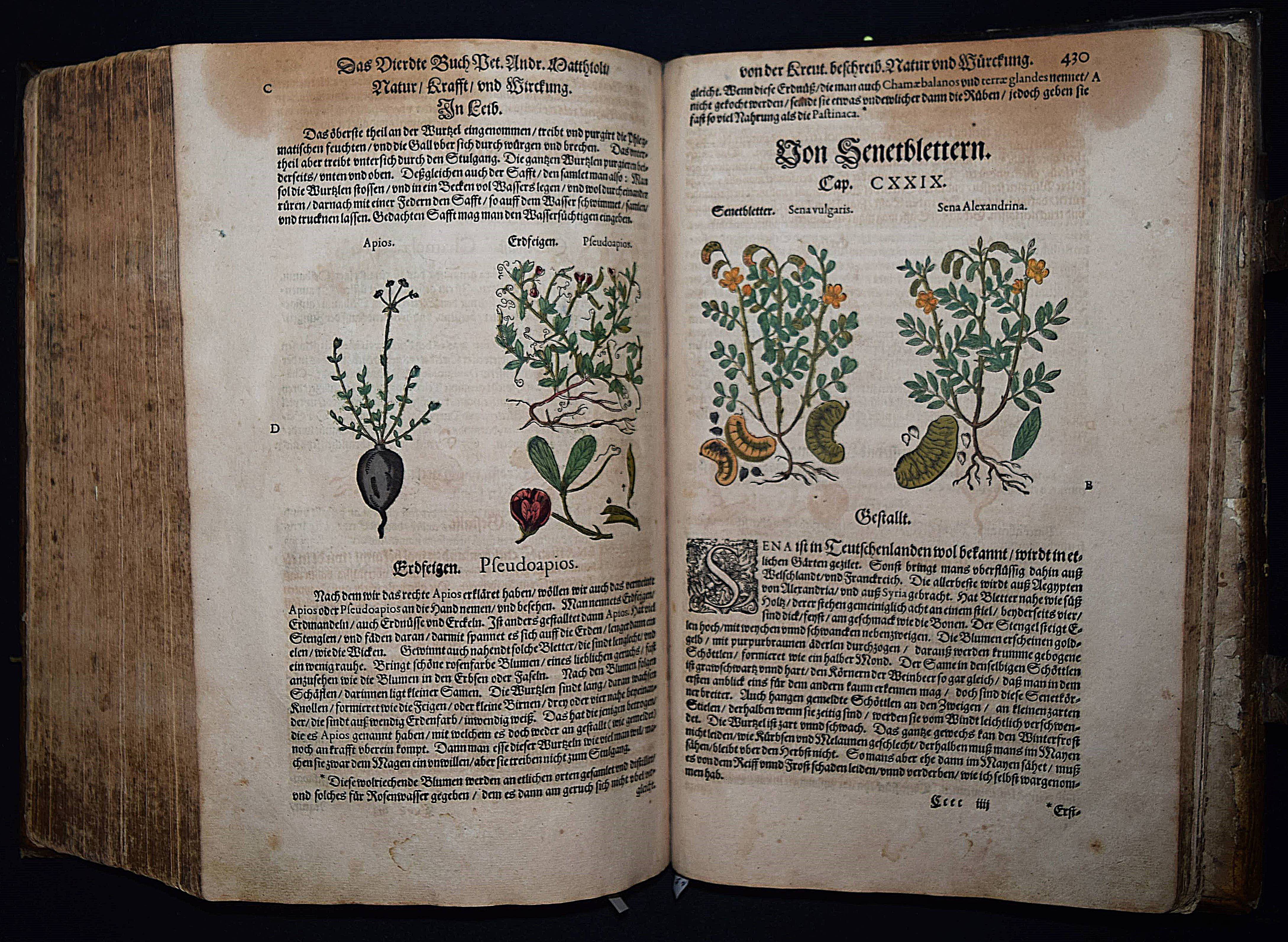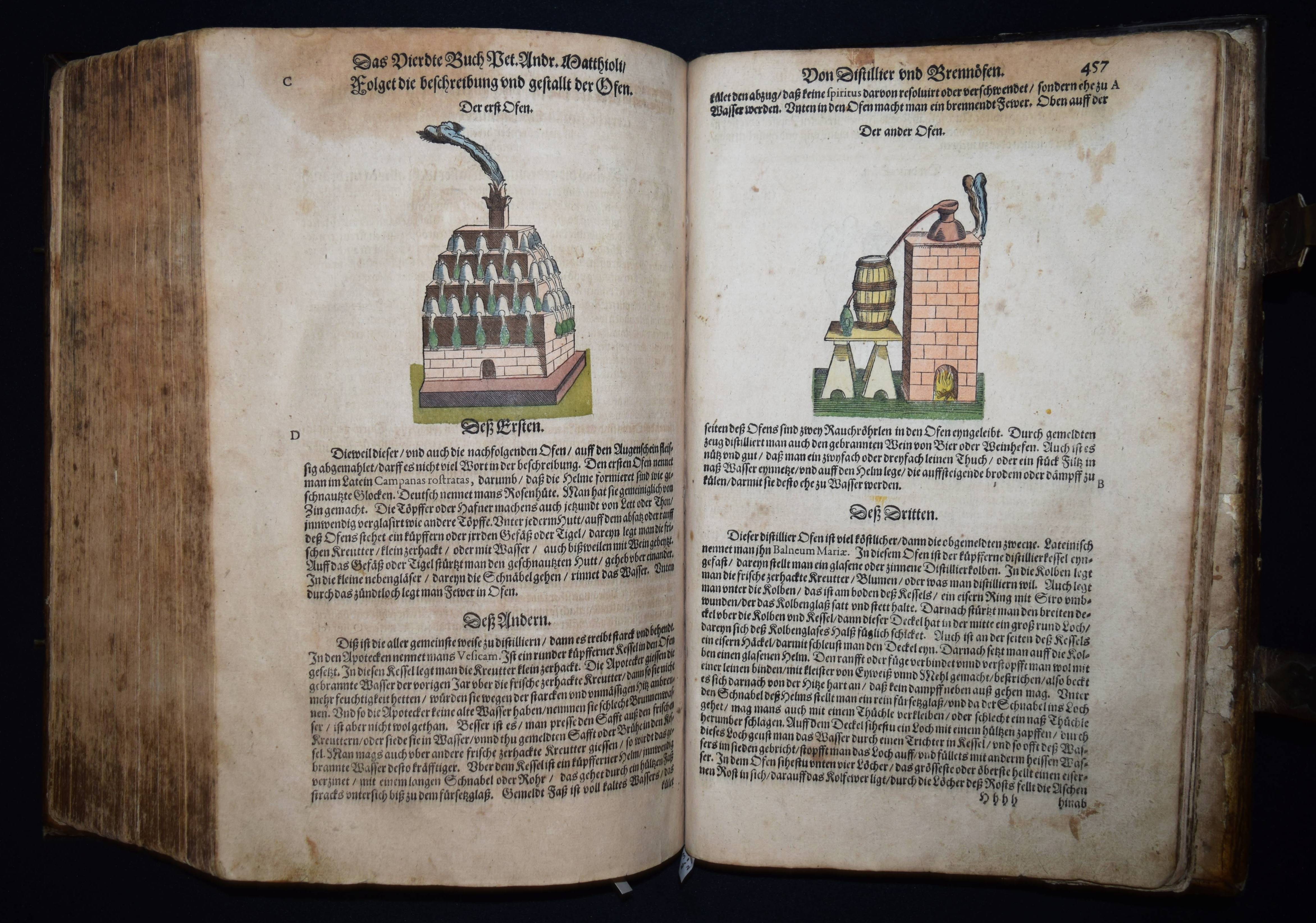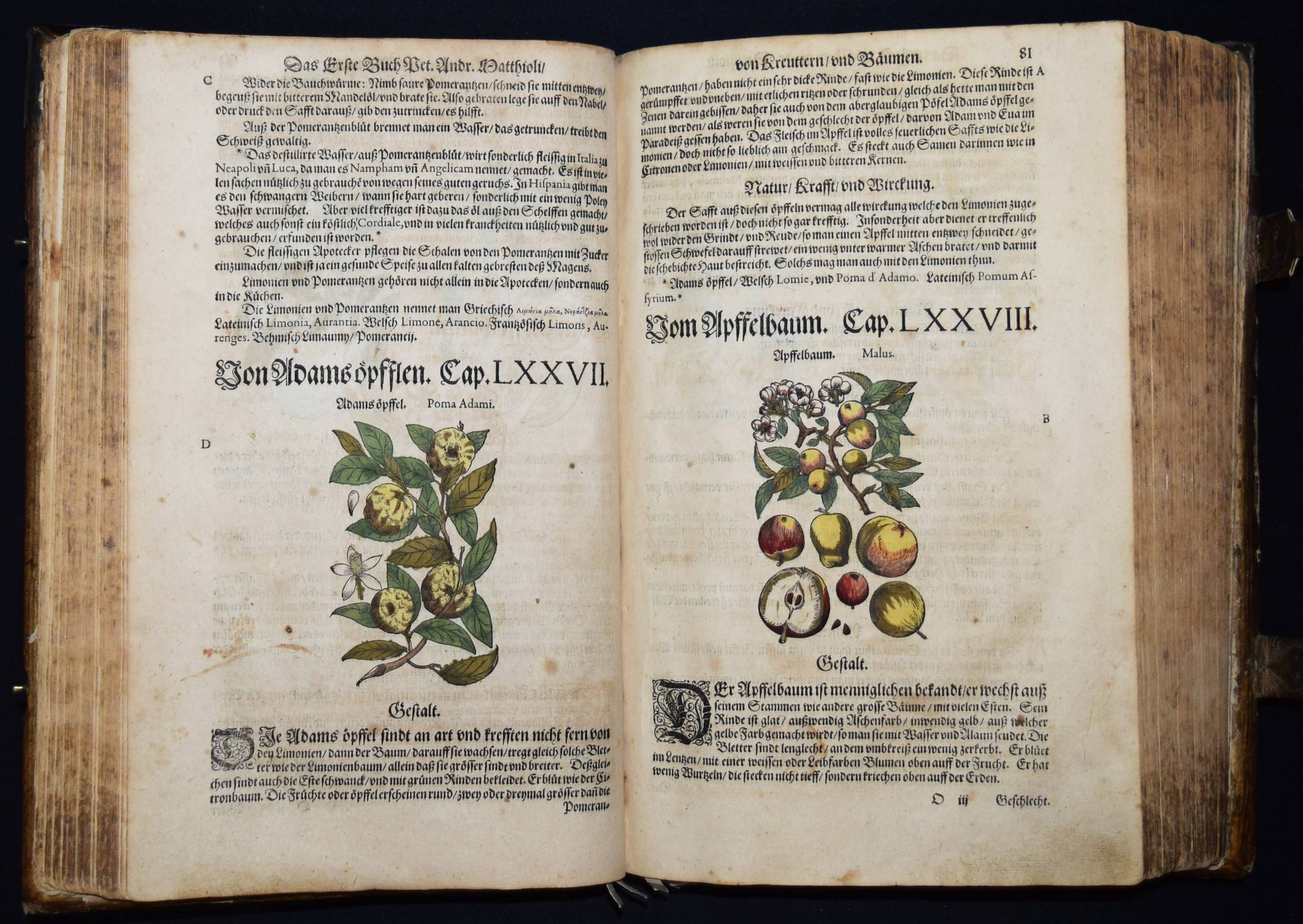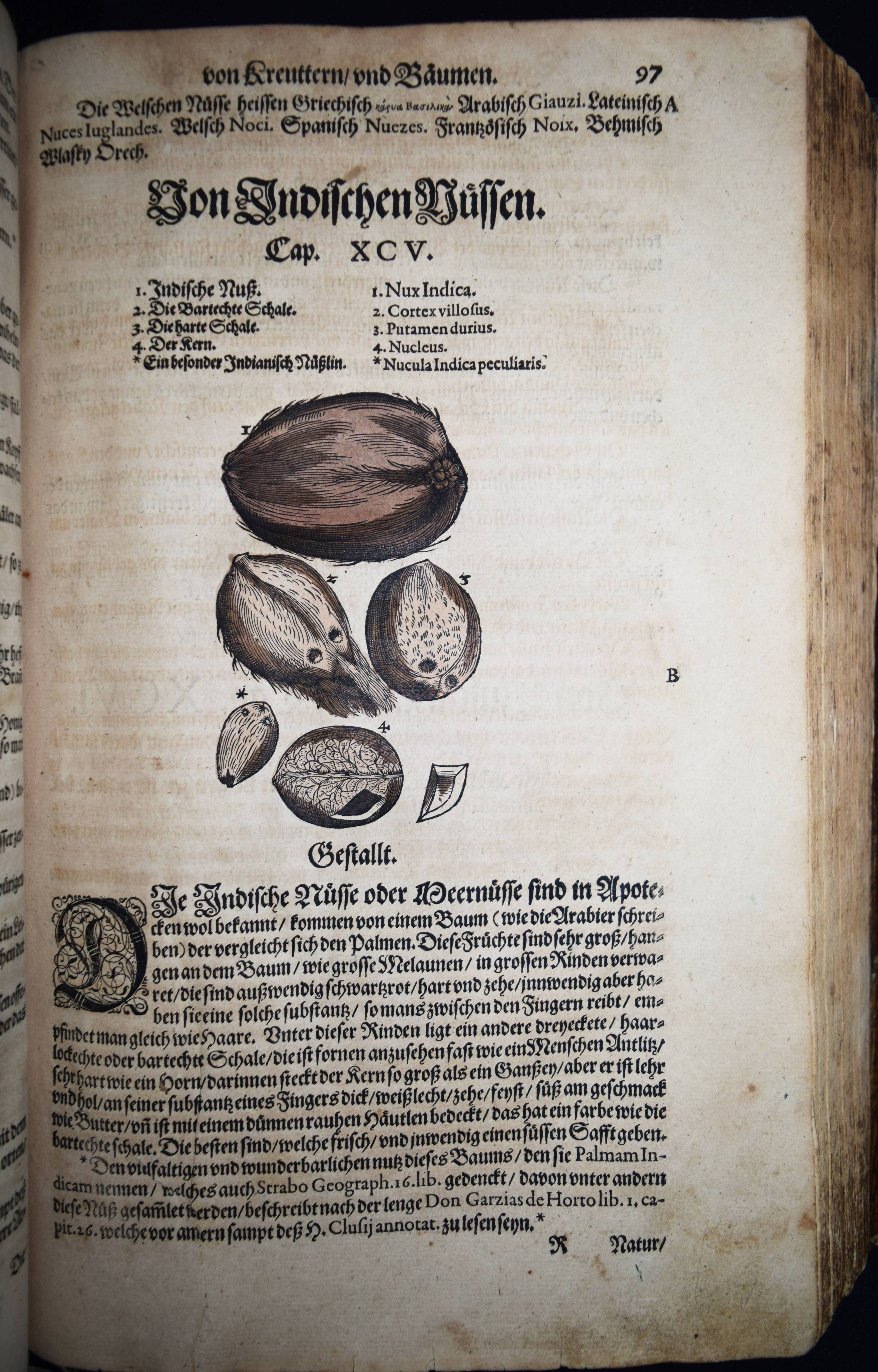 Matthioli (auch Mattioli), Petrus Andreas. Kreutterbuch. Jetzt widerunb mit viel schönen neuwen Figuren, auch nützlichen Artzneyen, und andern guten stücken, auß sonderm fleiß genlehret, und verfertigt durch Joachimum Camerarium der löblichen Reichsstatt Nürmberg Medicum, Doct. Sampt dreyen wolgeordneten nützlichen Registern, der Kreutter Lateinische und Teutsche Namen, und dann die Artzeneyen, darzu dieselbigen zu gebrauchen, innhaltendt. (Übersetzt von Georg Handsch). Frankfurt am Main, Sigmund Feyerabend, Jacob Fischer und Heinrich Dacken 1586. Folio (37,5 x 24 cm.). [8] Bl., 460 Bl., [37] Bl. mit handkol. illustr. Titel und ca. 800 handkol. Holzschnitten u. handkol. Druckermarke. Blindgepr. Schweinslederband der Zeit über Holzdeckeln mit 2 (statt 4) Eckbeschlägen und 2 Messing-Schließen. Hunt 210. Krivatsy 7576. Nissen, BBI 1311. VD16 M 1614 (verz. auch eine Variante aus demselben Jahr „Artzeneyen … Medicum, D.“, ZV 15556). Schmid, Ueber alte Kräuterbücher 40, 52, 57, 61 f. – Zweite von Joachim Camerarius bearbeitete Ausgabe, die erstmals 1563 erschienen war. „Der von Camerarius besorgten Ausgabe liegt die Prager Übersetzung durch Georg Handsch zugrunde. Die Abbildungen stammen aus dem Nachlaß Conrad Geßners, den Camerarius erworben hatte“ (Nissen, Kräuterbucher, S. 68). Neben Geßners Holzschnitten wurden auch Holzschnitte der Valgrisi-Ausgabe verwendet. – Mit zahlreichen interessanten Textpassagen über die Herkunftländer wichtiger Pflanzen und deren Einführung in Europa: „Occidentales indios“ (Bl. 5 verso), „Indianer“ und „Insel S. Dominici“ (Bl. 54), „Ebenus ist ein Baum, … Diß Holtz wirde zu uns gebracht auß India. Die Spanier bringen es auß den newen erfunden Inseln…“ (Bl. 53 verso u. 54 verso), „Die Muscaten Nüß wachsen in grosser menge in der Insel Badan…“ (Bl. 97 verso), Mais, „Vom Türckischen Korn. … es wechst nicht in Asia in der Türckey, sondern in India, so gegen Mitternacht ligt… Die Indianer nennen diß Korn in ihrer sprachen Mehiz, oder Maiz …“ (Bl. 114 verso u. 115), „Von Indianischem, oder Calecutischem Pfeffer“ (Bl. 181), „Der gemeine Pfeffer wechst auch in India, … Die histori haben wir von Spaniern und Portugalesern, welche uber Meer schiffen gegen Mittag unnd Morgen auff Calceuth, Taprobana, Java, und andere Inseln …“ (Bl. 181 verso), „Diese edel Wurtzel Rhabarbarum …“ (Bl. 211 verso), „Stachlicht Aloe … „Umb Moxico wechst es gar viel …“ (Bl. 231 verso), „Flos Solis Peruuianus (Sonnenblume). Vor etlichen Jaren hat man dieses gewechs auß America und Peru, … zu uns gebracht, …“ (Bl. 261 verso), „Tabacum sive Petum. … Dieses gewechs ist erstlich auß America in Franckreich gebracht worden, wechst sonderlich viel in einer Insel, die wie das Kraut Tabacco heisset, …“ (Bl. 373 verso) u.v.m. Außerdem findet sich im Nachwort ein interessanter Hinweis zur erfolgreichen Editionsgeschichte des Werks „… unnd von dem ersten druck an biß auff diese zeit uber die zwey und dreyssig tausendt Exemplar verhandelt sind worden …“ – Einband etwas berieben, Titel und das letzte Bl. mit der Druckermarke mit Knickspuren und alt restaurierten Einrissen, ein Textblatt (Bl. 256) mit halbseitigem Abriss (liegt als Farbkopie bei), wenige Blätter im Register mit alt restaurierten Eckabrissen (teils geringer Textverlust), durchgehend gleichmäßig gebräunt und im unteren Blattrand teils etwas fingerfleckig, noch sehr gutes Exemplar der seltenen altkolorierten Ausgabe in einem dekorativen zeitgenössischen Einband.