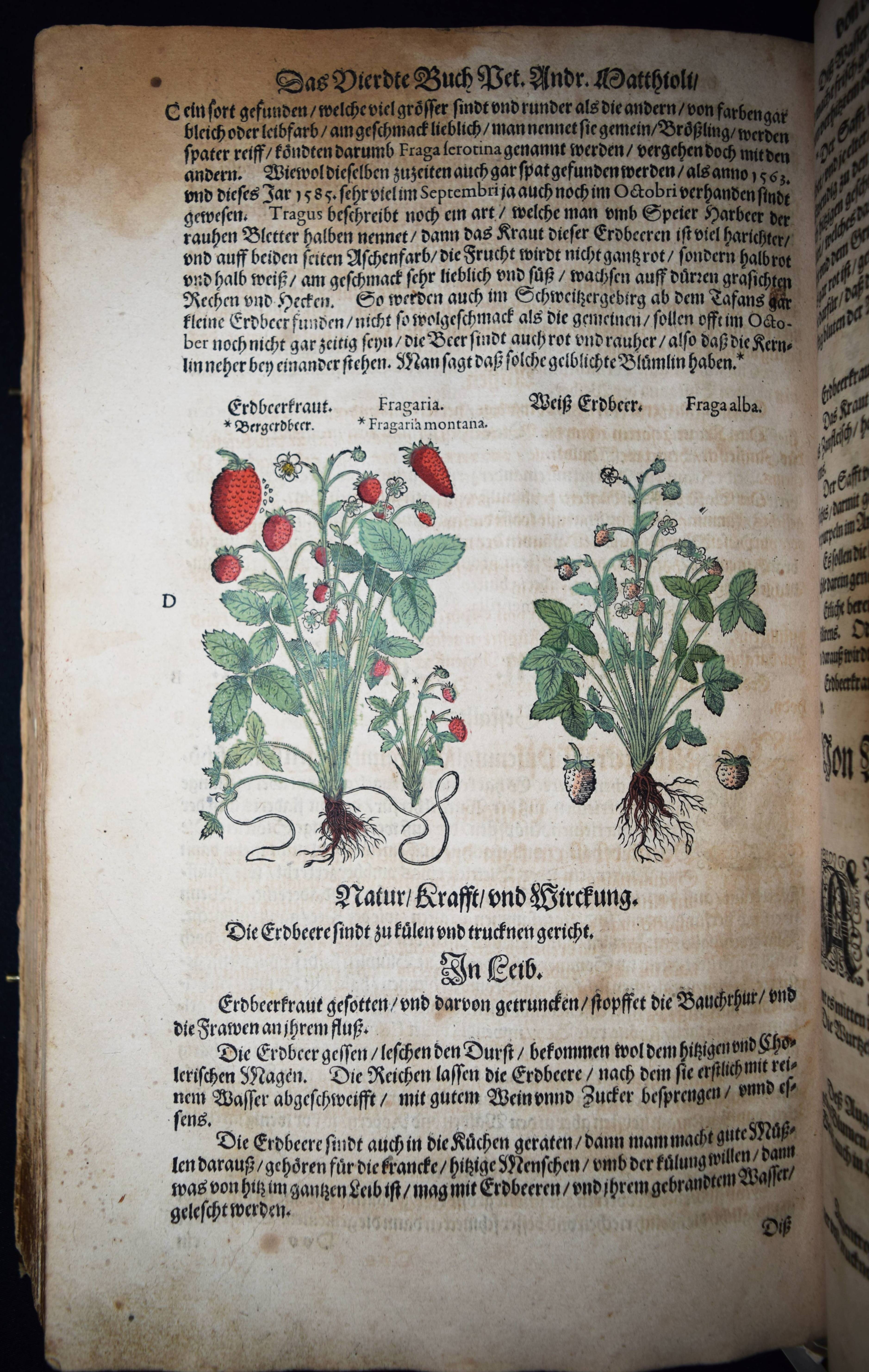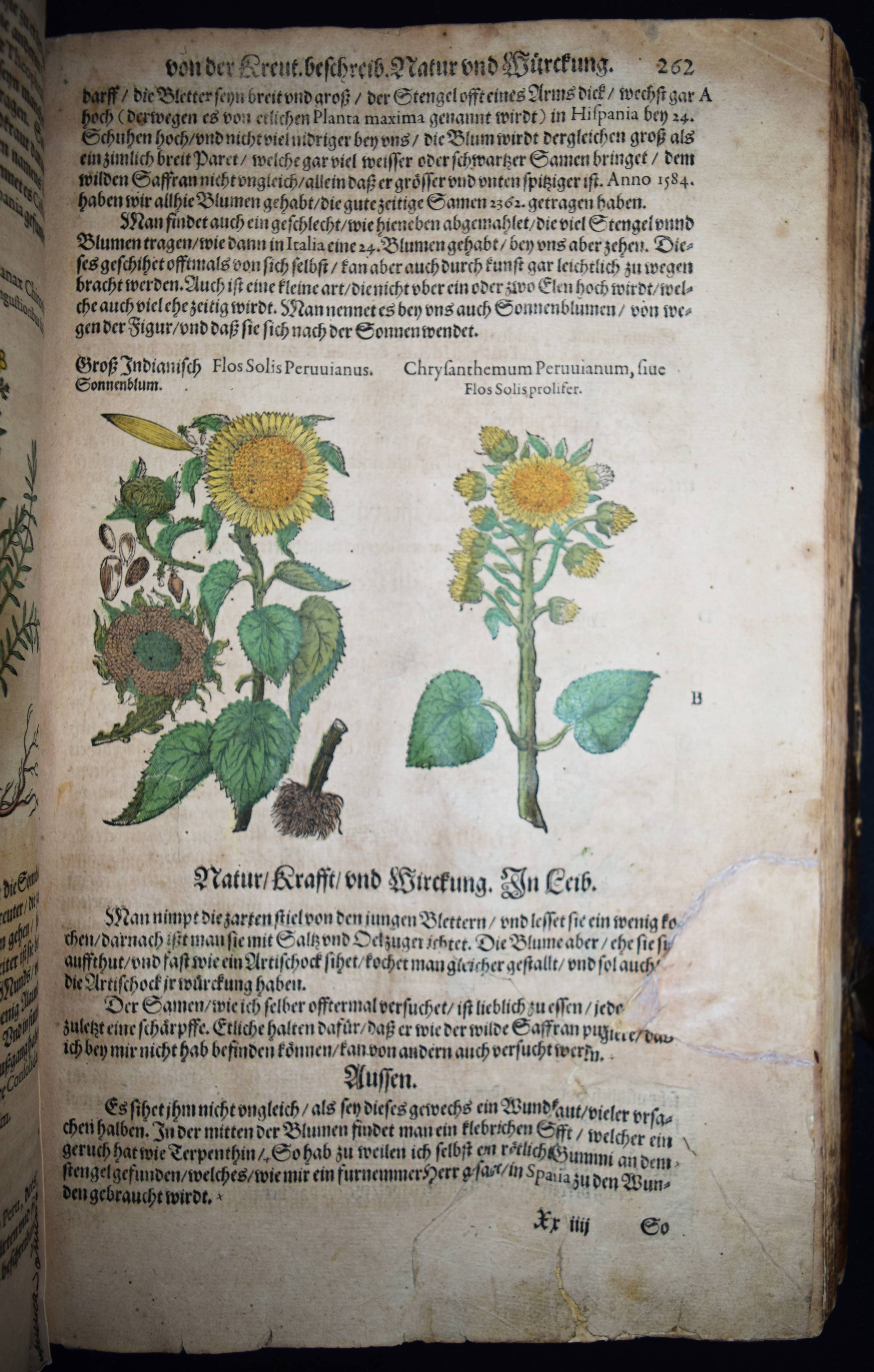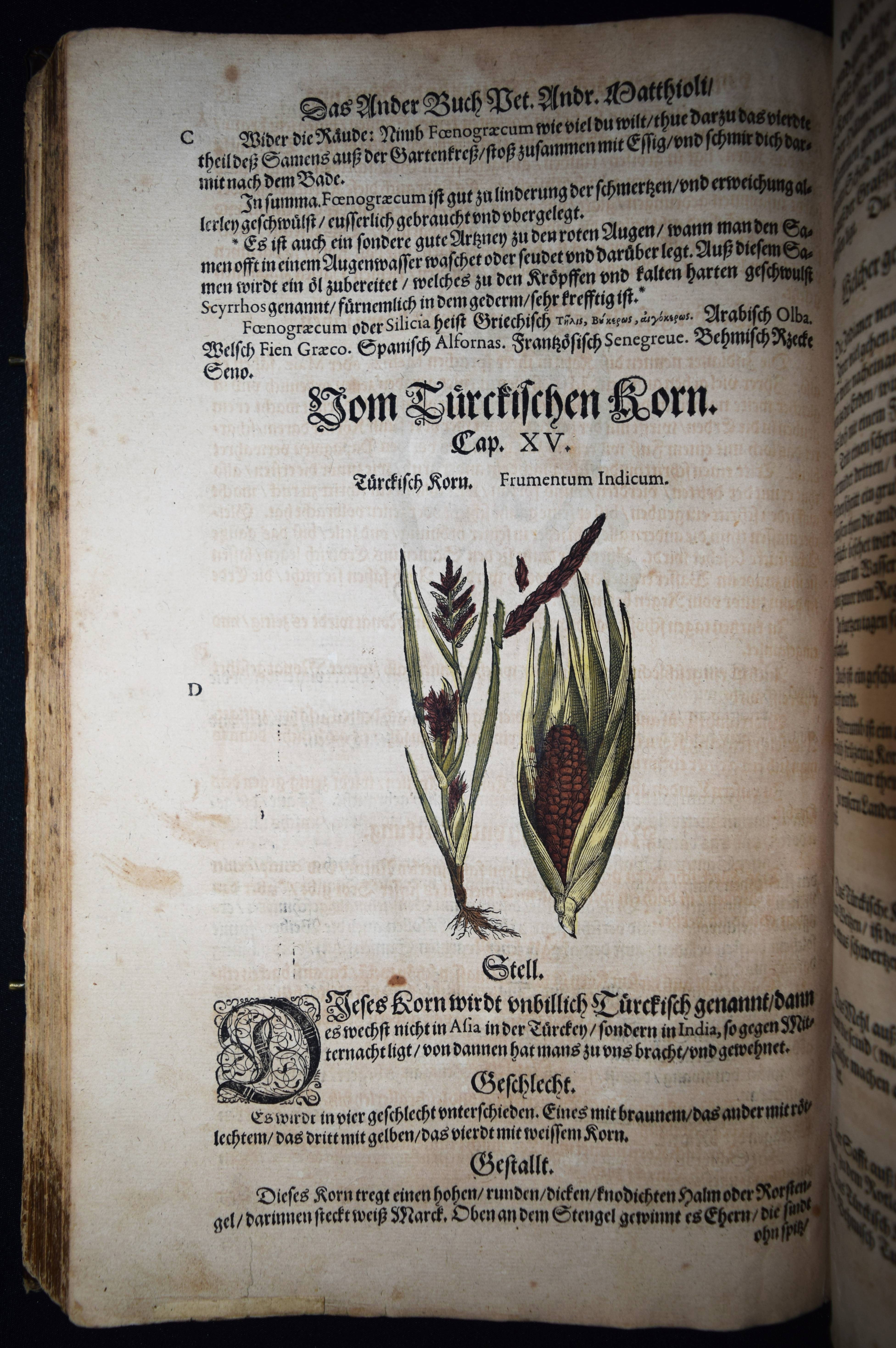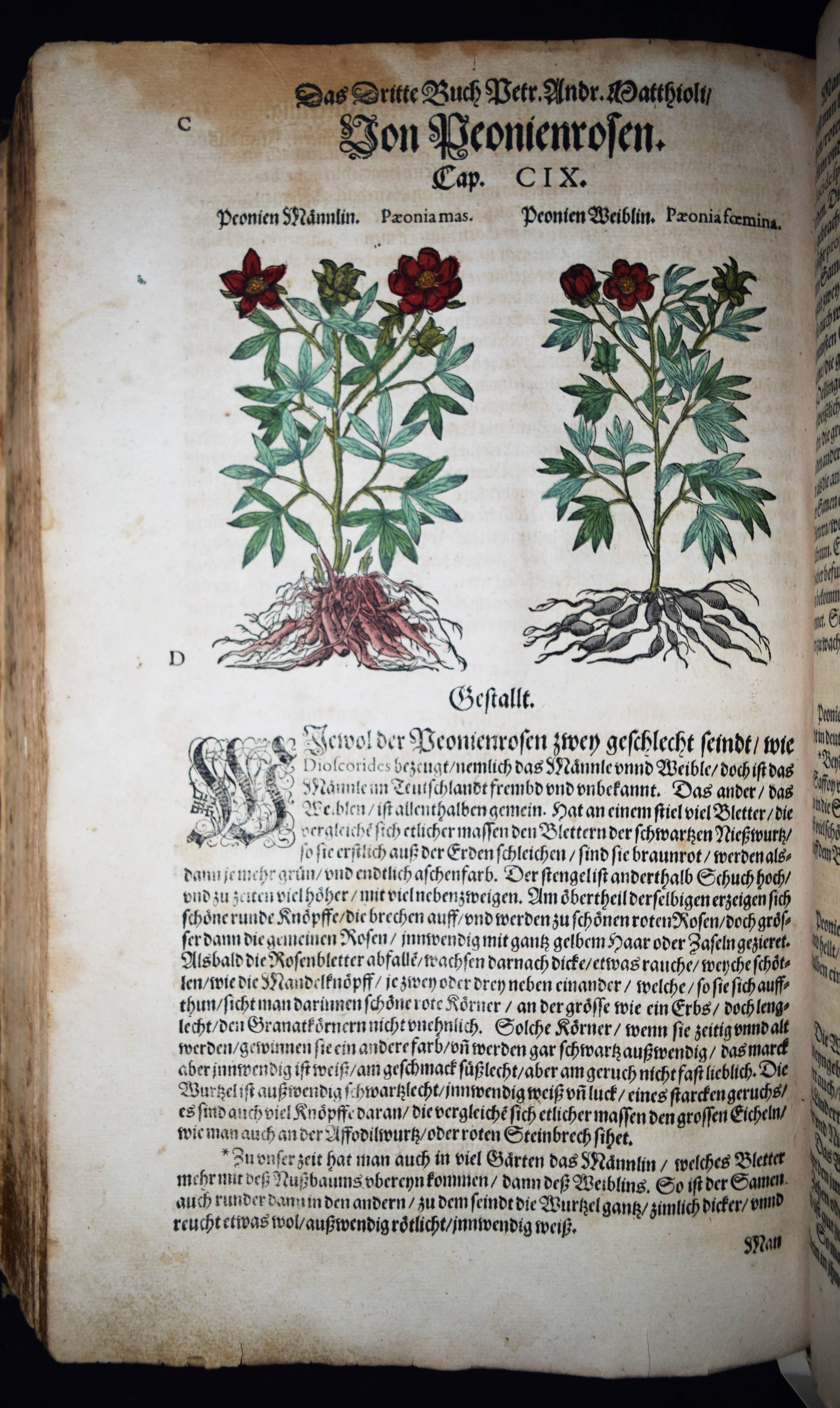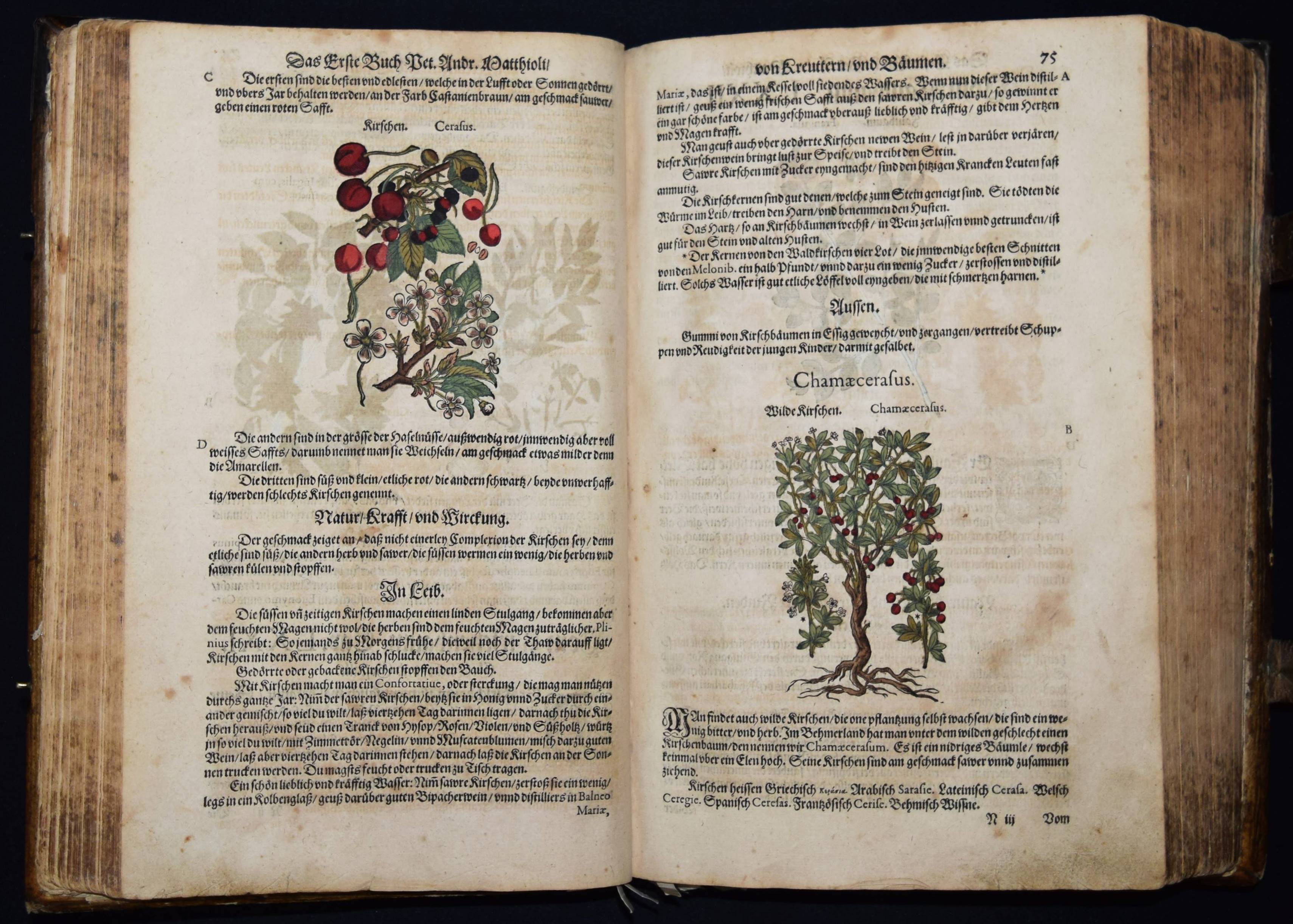 Matthioli (auch Mattioli), Petrus Andreas. Kreutterbuch. Jetzt widerunb mit viel schönen neuwen Figuren, auch nützlichen Artzneyen, und andern guten stücken, auß sonderm fleiß genlehret, und verfertigt durch Joachimum Camerarium der löblichen Reichsstatt Nürmberg Medicum, Doct. Sampt dreyen wolgeordneten nützlichen Registern, der Kreutter Lateinische und Teutsche Namen, und dann die Artzeneyen, darzu dieselbigen zu gebrauchen, innhaltendt. (Übersetzt von Georg Handsch). Frankfurt am Main, Sigmund Feyerabend, Jacob Fischer und Heinrich Dacken 1586. Folio (37,5 x 24 cm.). [8] Bl., 460 Bl., [37] Bl. mit handkol. illustr. Titel und ca. 800 handkol. Holzschnitten u. handkol. Druckermarke. Blindgepr. Schweinslederband der Zeit über Holzdeckeln mit 2 (statt 4) Eckbeschlägen und 2 Messing-Schließen. Hunt 210. Krivatsy 7576. Nissen, BBI 1311. VD16 M 1614 (verz. auch eine Variante aus demselben Jahr „Artzeneyen … Medicum, D.“, ZV 15556). Schmid, Ueber alte Kräuterbücher 40, 52, 57, 61 f. – Zweite von Joachim Camerarius bearbeitete Ausgabe, die erstmals 1563 erschienen war. „Der von Camerarius besorgten Ausgabe liegt die Prager Übersetzung durch Georg Handsch zugrunde. Die Abbildungen stammen aus dem Nachlaß Conrad Geßners, den Camerarius erworben hatte“ (Nissen, Kräuterbucher, S. 68). Neben Geßners Holzschnitten wurden auch Holzschnitte der Valgrisi-Ausgabe verwendet. – Mit zahlreichen interessanten Textpassagen über die Herkunftländer wichtiger Pflanzen und deren Einführung in Europa: „Occidentales indios“ (Bl. 5 verso), „Indianer“ und „Insel S. Dominici“ (Bl. 54), „Ebenus ist ein Baum, … Diß Holtz wirde zu uns gebracht auß India. Die Spanier bringen es auß den newen erfunden Inseln…“ (Bl. 53 verso u. 54 verso), „Die Muscaten Nüß wachsen in grosser menge in der Insel Badan…“ (Bl. 97 verso), Mais, „Vom Türckischen Korn. … es wechst nicht in Asia in der Türckey, sondern in India, so gegen Mitternacht ligt… Die Indianer nennen diß Korn in ihrer sprachen Mehiz, oder Maiz …“ (Bl. 114 verso u. 115), „Von Indianischem, oder Calecutischem Pfeffer“ (Bl. 181), „Der gemeine Pfeffer wechst auch in India, … Die histori haben wir von Spaniern und Portugalesern, welche uber Meer schiffen gegen Mittag unnd Morgen auff Calceuth, Taprobana, Java, und andere Inseln …“ (Bl. 181 verso), „Diese edel Wurtzel Rhabarbarum …“ (Bl. 211 verso), „Stachlicht Aloe … „Umb Moxico wechst es gar viel …“ (Bl. 231 verso), „Flos Solis Peruuianus (Sonnenblume). Vor etlichen Jaren hat man dieses gewechs auß America und Peru, … zu uns gebracht, …“ (Bl. 261 verso), „Tabacum sive Petum. … Dieses gewechs ist erstlich auß America in Franckreich gebracht worden, wechst sonderlich viel in einer Insel, die wie das Kraut Tabacco heisset, …“ (Bl. 373 verso) u.v.m. Außerdem findet sich im Nachwort ein interessanter Hinweis zur erfolgreichen Editionsgeschichte des Werks „… unnd von dem ersten druck an biß auff diese zeit uber die zwey und dreyssig tausendt Exemplar verhandelt sind worden …“ – Einband etwas berieben, Titel und das letzte Bl. mit der Druckermarke mit Knickspuren und alt restaurierten Einrissen, ein Textblatt (Bl. 256) mit halbseitigem Abriss (liegt als Farbkopie bei), wenige Blätter im Register mit alt restaurierten Eckabrissen (teils geringer Textverlust), durchgehend gleichmäßig gebräunt und im unteren Blattrand teils etwas fingerfleckig, noch sehr gutes Exemplar der seltenen altkolorierten Ausgabe in einem dekorativen zeitgenössischen Einband.