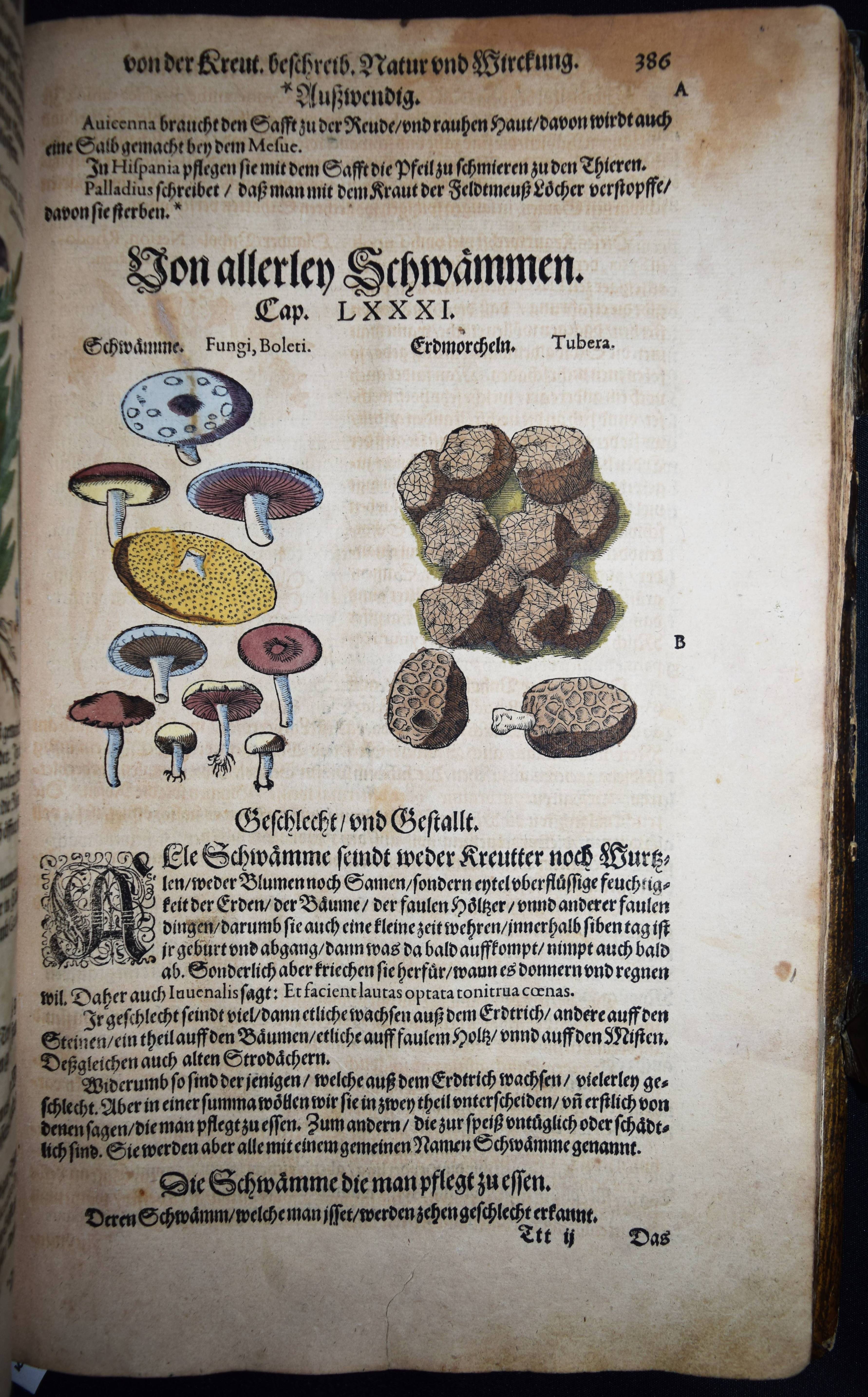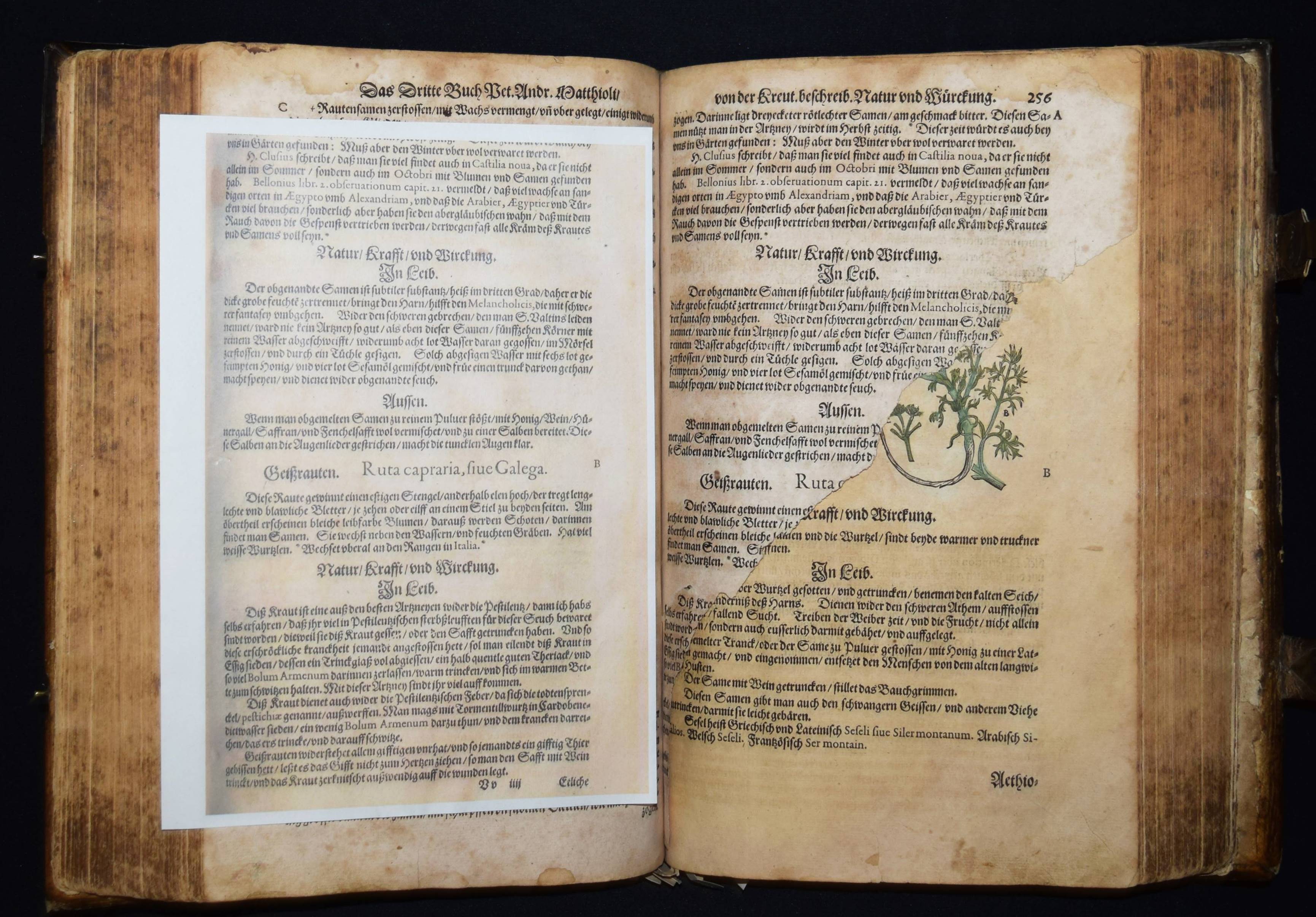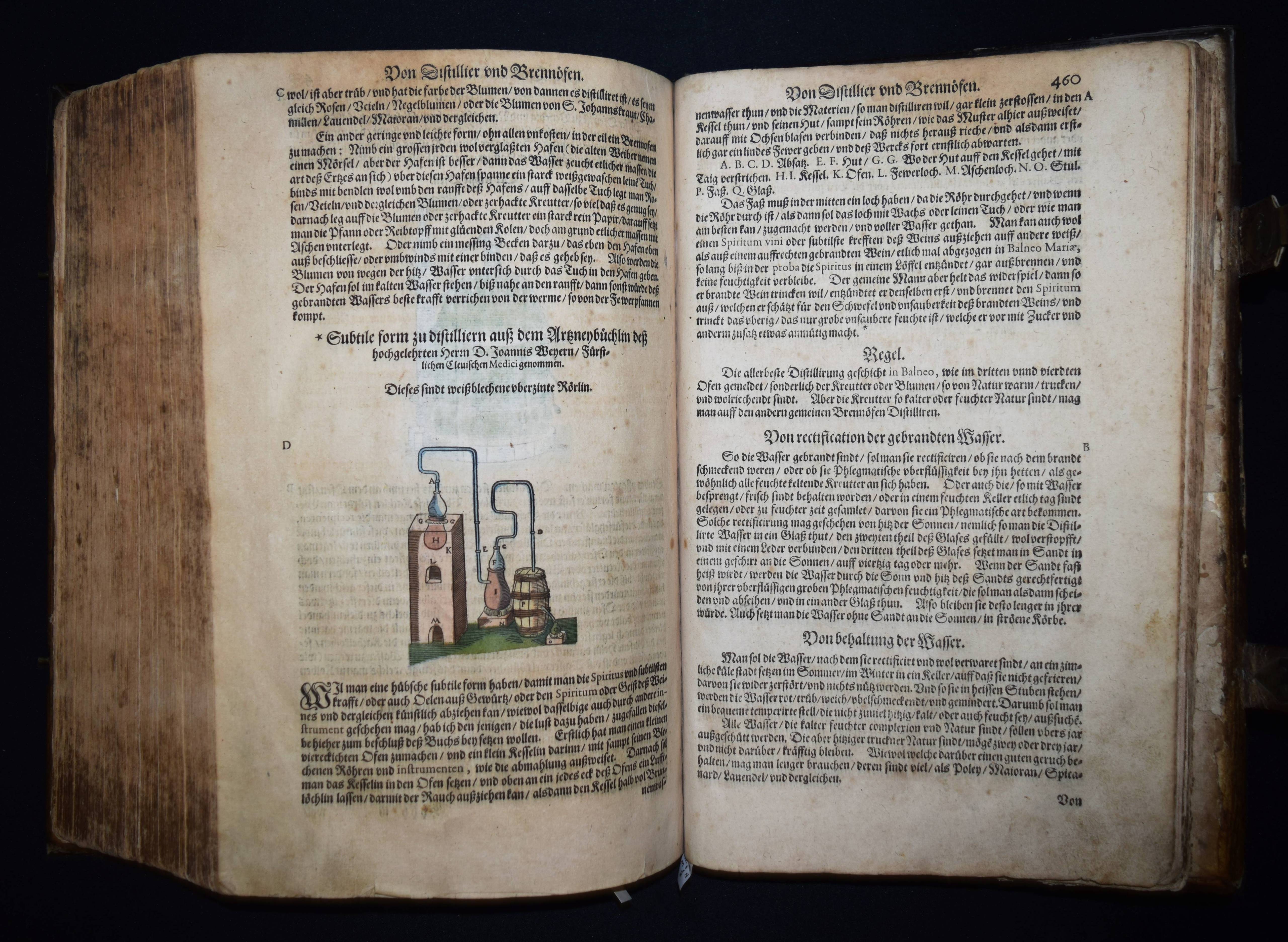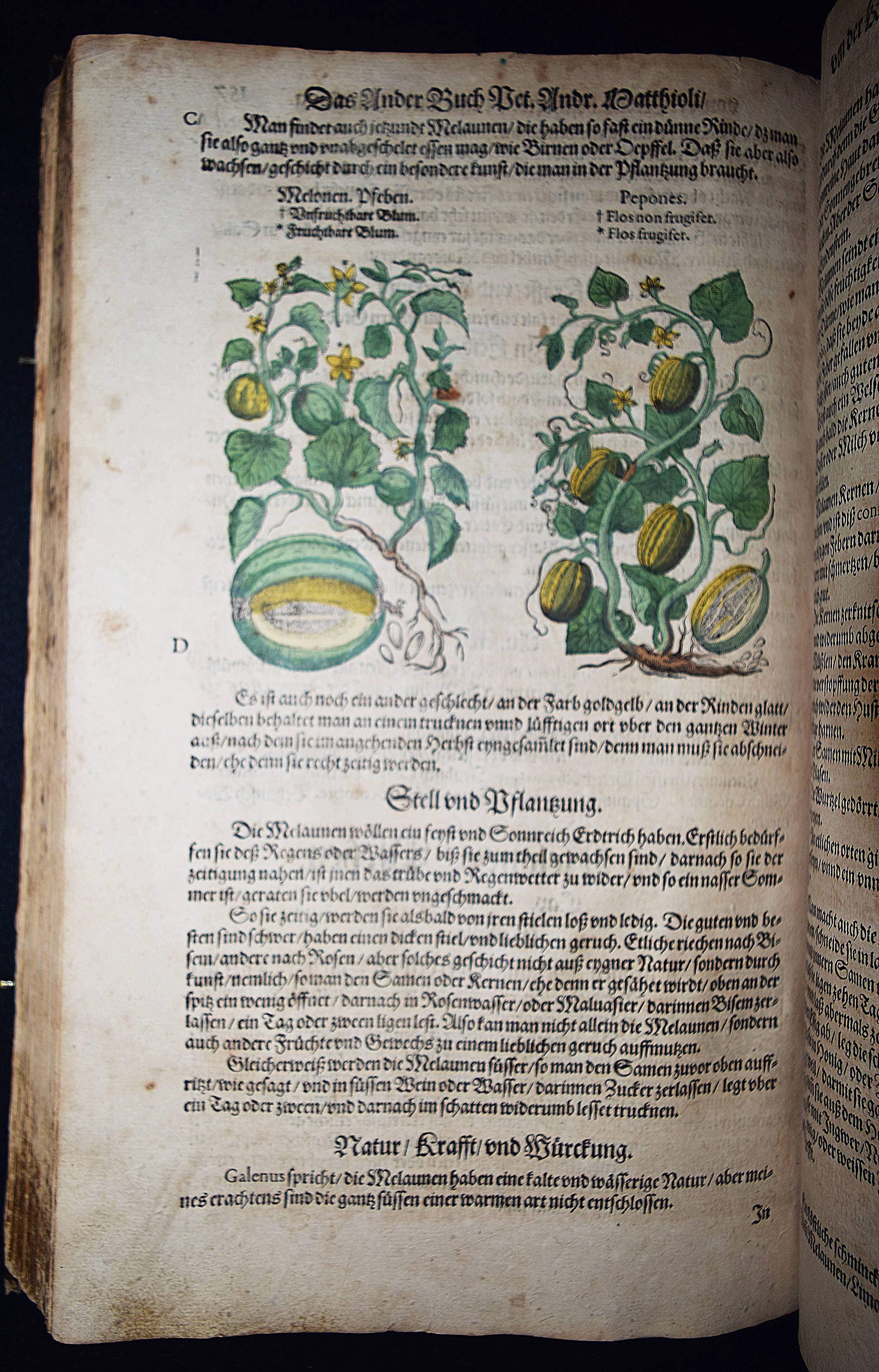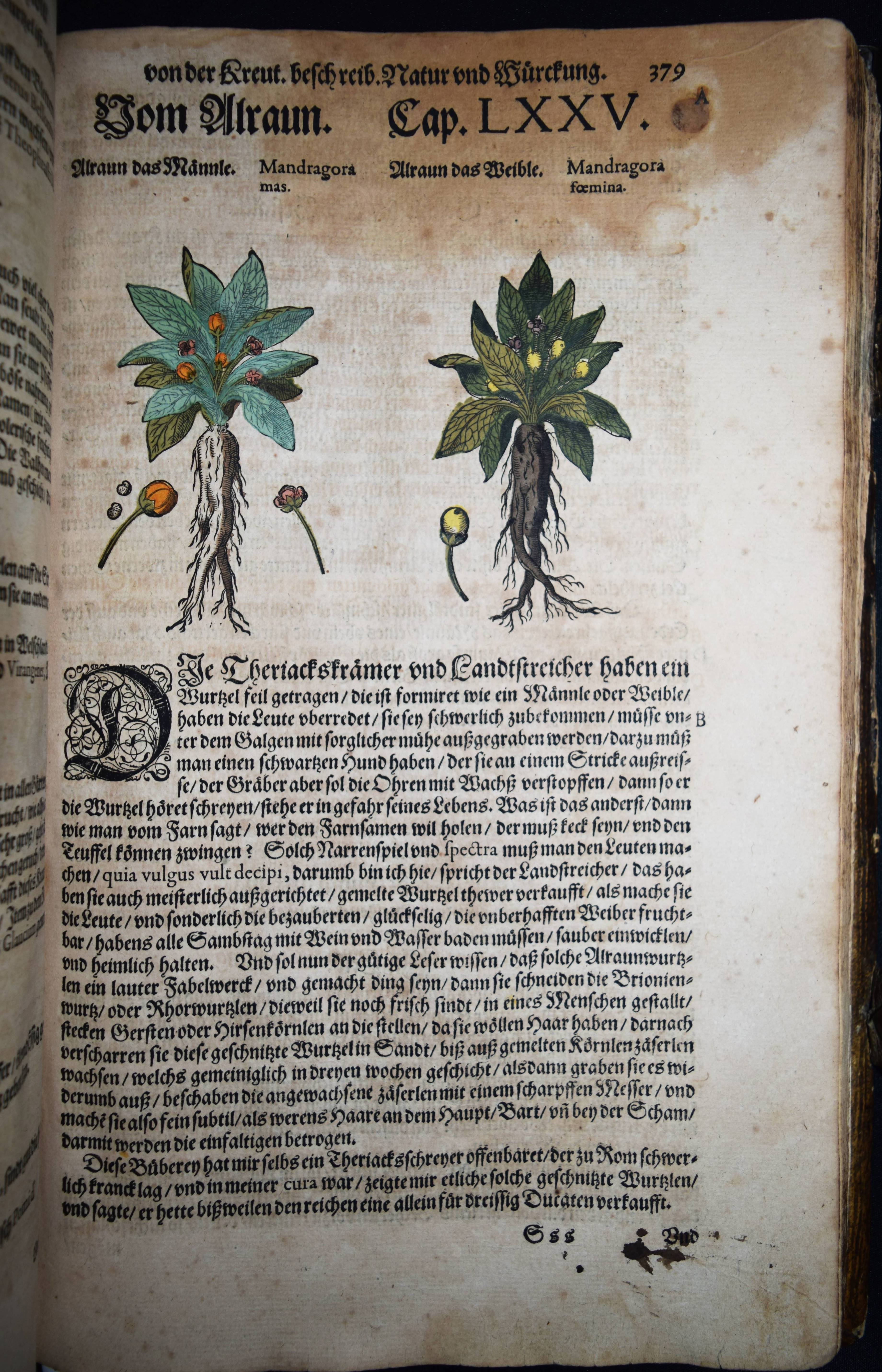 Matthioli (auch Mattioli), Petrus Andreas. Kreutterbuch. Jetzt widerunb mit viel schönen neuwen Figuren, auch nützlichen Artzneyen, und andern guten stücken, auß sonderm fleiß genlehret, und verfertigt durch Joachimum Camerarium der löblichen Reichsstatt Nürmberg Medicum, Doct. Sampt dreyen wolgeordneten nützlichen Registern, der Kreutter Lateinische und Teutsche Namen, und dann die Artzeneyen, darzu dieselbigen zu gebrauchen, innhaltendt. (Übersetzt von Georg Handsch). Frankfurt am Main, Sigmund Feyerabend, Jacob Fischer und Heinrich Dacken 1586. Folio (37,5 x 24 cm.). [8] Bl., 460 Bl., [37] Bl. mit handkol. illustr. Titel und ca. 800 handkol. Holzschnitten u. handkol. Druckermarke. Blindgepr. Schweinslederband der Zeit über Holzdeckeln mit 2 (statt 4) Eckbeschlägen und 2 Messing-Schließen. Hunt 210. Krivatsy 7576. Nissen, BBI 1311. VD16 M 1614 (verz. auch eine Variante aus demselben Jahr „Artzeneyen … Medicum, D.“, ZV 15556). Schmid, Ueber alte Kräuterbücher 40, 52, 57, 61 f. – Zweite von Joachim Camerarius bearbeitete Ausgabe, die erstmals 1563 erschienen war. „Der von Camerarius besorgten Ausgabe liegt die Prager Übersetzung durch Georg Handsch zugrunde. Die Abbildungen stammen aus dem Nachlaß Conrad Geßners, den Camerarius erworben hatte“ (Nissen, Kräuterbucher, S. 68). Neben Geßners Holzschnitten wurden auch Holzschnitte der Valgrisi-Ausgabe verwendet. – Mit zahlreichen interessanten Textpassagen über die Herkunftländer wichtiger Pflanzen und deren Einführung in Europa: „Occidentales indios“ (Bl. 5 verso), „Indianer“ und „Insel S. Dominici“ (Bl. 54), „Ebenus ist ein Baum, … Diß Holtz wirde zu uns gebracht auß India. Die Spanier bringen es auß den newen erfunden Inseln…“ (Bl. 53 verso u. 54 verso), „Die Muscaten Nüß wachsen in grosser menge in der Insel Badan…“ (Bl. 97 verso), Mais, „Vom Türckischen Korn. … es wechst nicht in Asia in der Türckey, sondern in India, so gegen Mitternacht ligt… Die Indianer nennen diß Korn in ihrer sprachen Mehiz, oder Maiz …“ (Bl. 114 verso u. 115), „Von Indianischem, oder Calecutischem Pfeffer“ (Bl. 181), „Der gemeine Pfeffer wechst auch in India, … Die histori haben wir von Spaniern und Portugalesern, welche uber Meer schiffen gegen Mittag unnd Morgen auff Calceuth, Taprobana, Java, und andere Inseln …“ (Bl. 181 verso), „Diese edel Wurtzel Rhabarbarum …“ (Bl. 211 verso), „Stachlicht Aloe … „Umb Moxico wechst es gar viel …“ (Bl. 231 verso), „Flos Solis Peruuianus (Sonnenblume). Vor etlichen Jaren hat man dieses gewechs auß America und Peru, … zu uns gebracht, …“ (Bl. 261 verso), „Tabacum sive Petum. … Dieses gewechs ist erstlich auß America in Franckreich gebracht worden, wechst sonderlich viel in einer Insel, die wie das Kraut Tabacco heisset, …“ (Bl. 373 verso) u.v.m. Außerdem findet sich im Nachwort ein interessanter Hinweis zur erfolgreichen Editionsgeschichte des Werks „… unnd von dem ersten druck an biß auff diese zeit uber die zwey und dreyssig tausendt Exemplar verhandelt sind worden …“ – Einband etwas berieben, Titel und das letzte Bl. mit der Druckermarke mit Knickspuren und alt restaurierten Einrissen, ein Textblatt (Bl. 256) mit halbseitigem Abriss (liegt als Farbkopie bei), wenige Blätter im Register mit alt restaurierten Eckabrissen (teils geringer Textverlust), durchgehend gleichmäßig gebräunt und im unteren Blattrand teils etwas fingerfleckig, noch sehr gutes Exemplar der seltenen altkolorierten Ausgabe in einem dekorativen zeitgenössischen Einband.