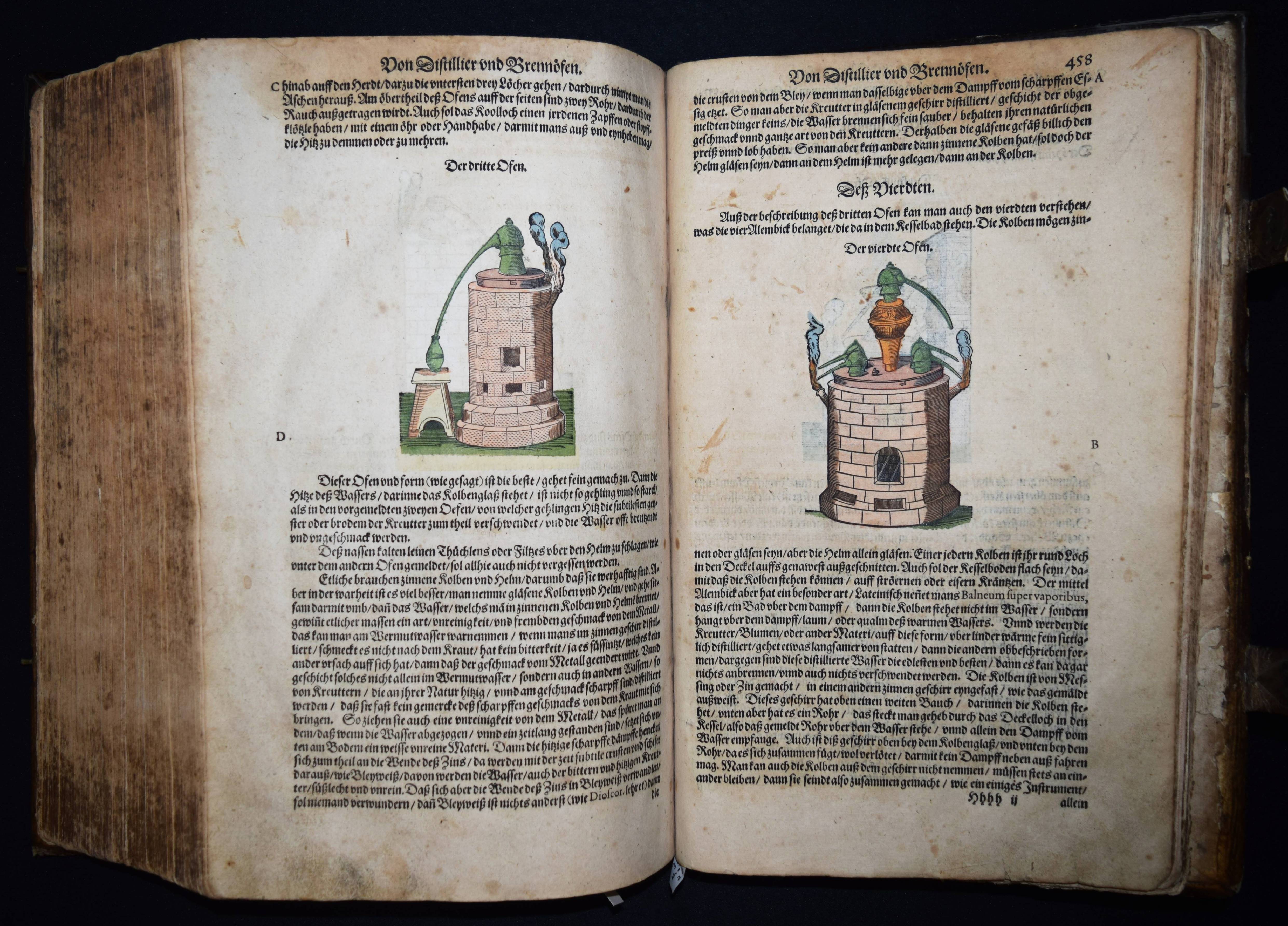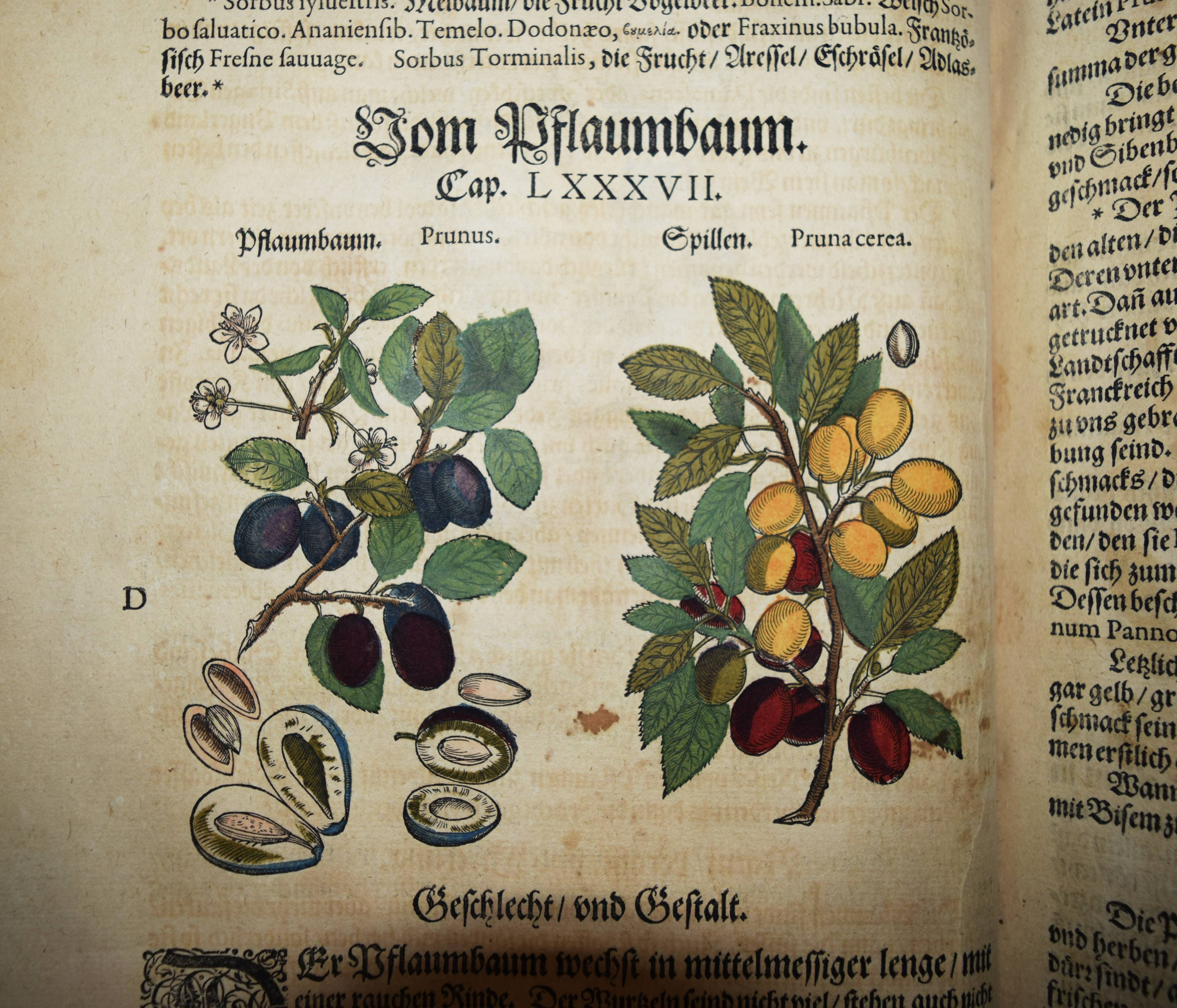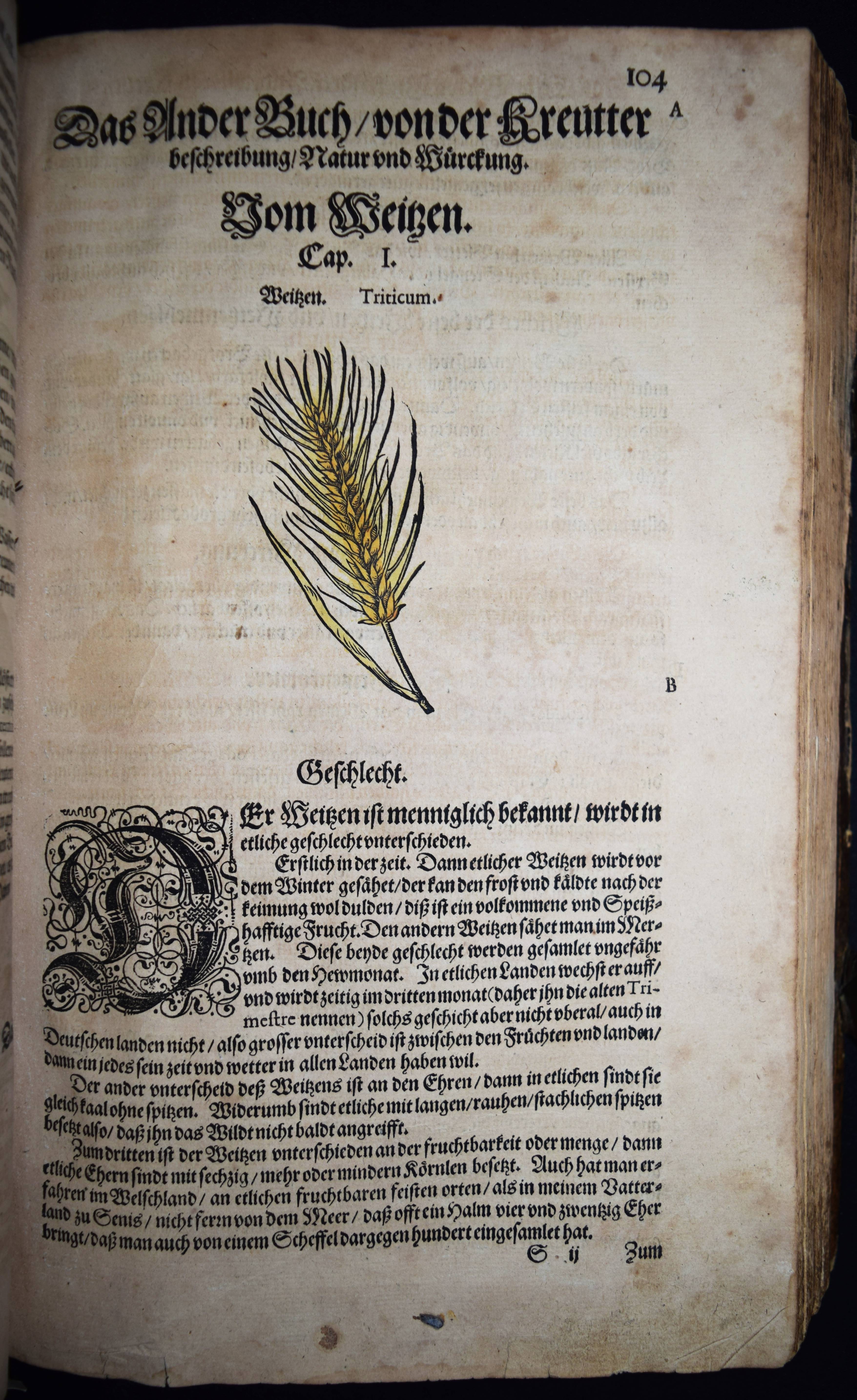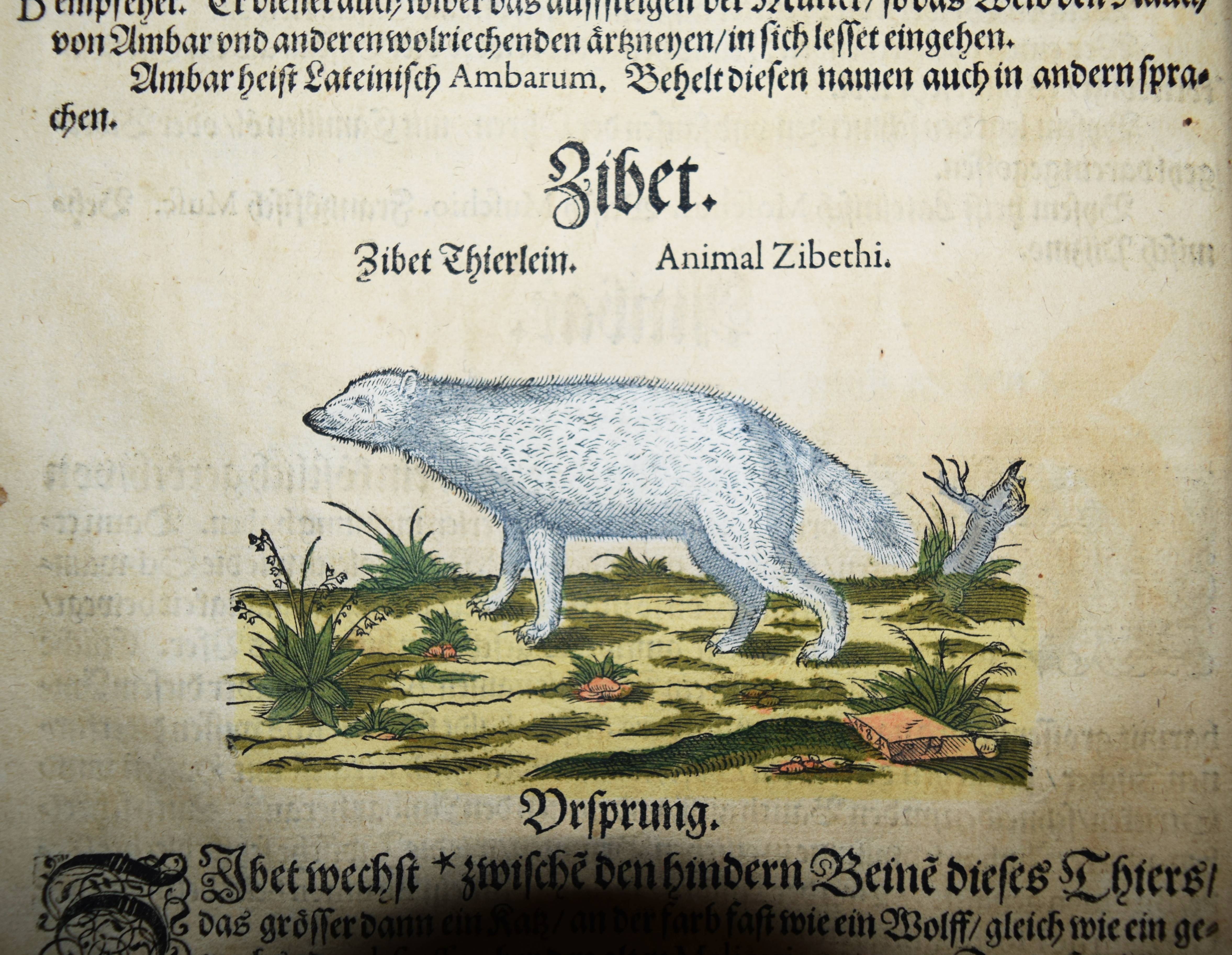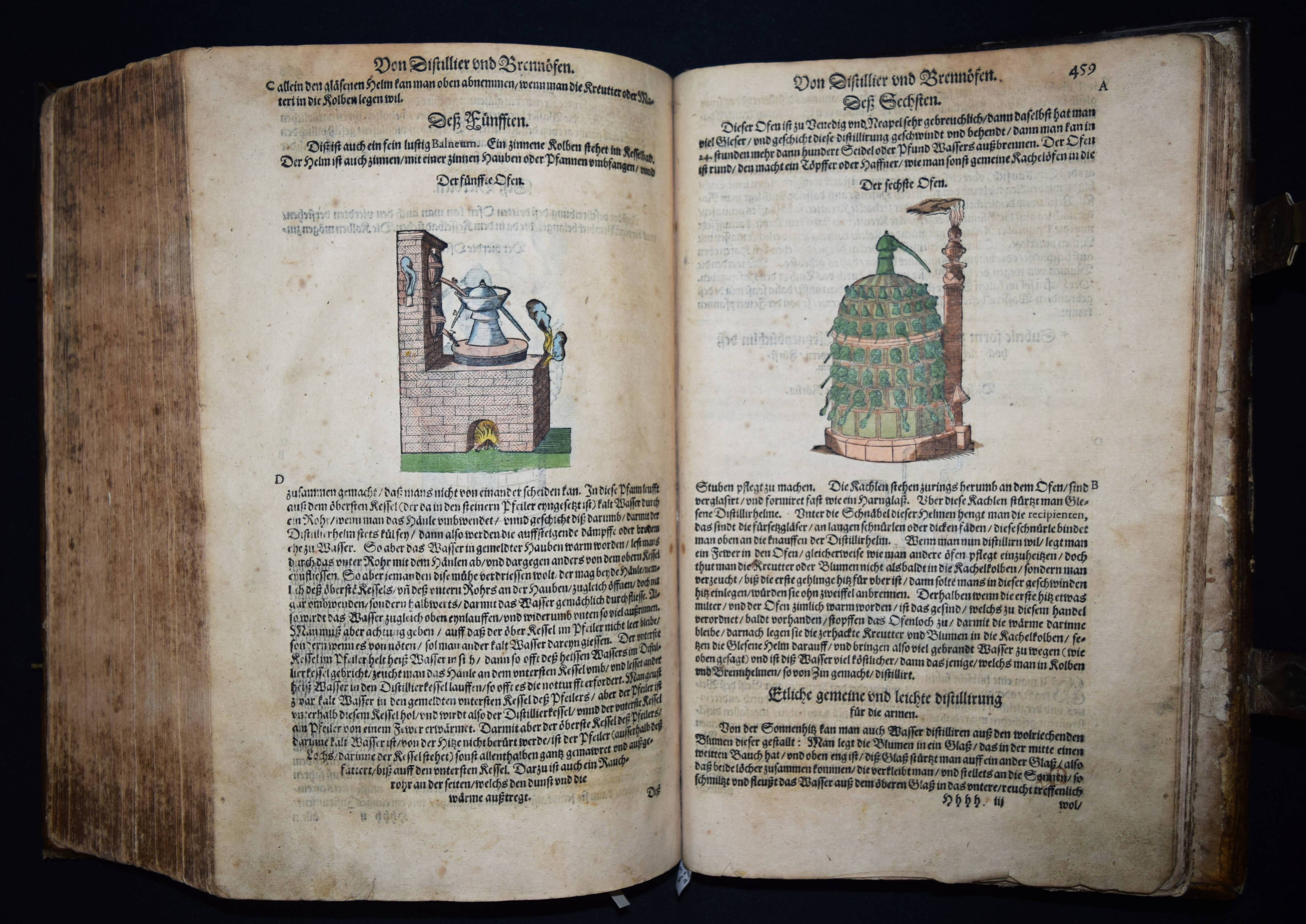 Matthioli (auch Mattioli), Petrus Andreas. Kreutterbuch. Jetzt widerunb mit viel schönen neuwen Figuren, auch nützlichen Artzneyen, und andern guten stücken, auß sonderm fleiß genlehret, und verfertigt durch Joachimum Camerarium der löblichen Reichsstatt Nürmberg Medicum, Doct. Sampt dreyen wolgeordneten nützlichen Registern, der Kreutter Lateinische und Teutsche Namen, und dann die Artzeneyen, darzu dieselbigen zu gebrauchen, innhaltendt. (Übersetzt von Georg Handsch). Frankfurt am Main, Sigmund Feyerabend, Jacob Fischer und Heinrich Dacken 1586. Folio (37,5 x 24 cm.). [8] Bl., 460 Bl., [37] Bl. mit handkol. illustr. Titel und ca. 800 handkol. Holzschnitten u. handkol. Druckermarke. Blindgepr. Schweinslederband der Zeit über Holzdeckeln mit 2 (statt 4) Eckbeschlägen und 2 Messing-Schließen. Hunt 210. Krivatsy 7576. Nissen, BBI 1311. VD16 M 1614 (verz. auch eine Variante aus demselben Jahr „Artzeneyen … Medicum, D.“, ZV 15556). Schmid, Ueber alte Kräuterbücher 40, 52, 57, 61 f. – Zweite von Joachim Camerarius bearbeitete Ausgabe, die erstmals 1563 erschienen war. „Der von Camerarius besorgten Ausgabe liegt die Prager Übersetzung durch Georg Handsch zugrunde. Die Abbildungen stammen aus dem Nachlaß Conrad Geßners, den Camerarius erworben hatte“ (Nissen, Kräuterbucher, S. 68). Neben Geßners Holzschnitten wurden auch Holzschnitte der Valgrisi-Ausgabe verwendet. – Mit zahlreichen interessanten Textpassagen über die Herkunftländer wichtiger Pflanzen und deren Einführung in Europa: „Occidentales indios“ (Bl. 5 verso), „Indianer“ und „Insel S. Dominici“ (Bl. 54), „Ebenus ist ein Baum, … Diß Holtz wirde zu uns gebracht auß India. Die Spanier bringen es auß den newen erfunden Inseln…“ (Bl. 53 verso u. 54 verso), „Die Muscaten Nüß wachsen in grosser menge in der Insel Badan…“ (Bl. 97 verso), Mais, „Vom Türckischen Korn. … es wechst nicht in Asia in der Türckey, sondern in India, so gegen Mitternacht ligt… Die Indianer nennen diß Korn in ihrer sprachen Mehiz, oder Maiz …“ (Bl. 114 verso u. 115), „Von Indianischem, oder Calecutischem Pfeffer“ (Bl. 181), „Der gemeine Pfeffer wechst auch in India, … Die histori haben wir von Spaniern und Portugalesern, welche uber Meer schiffen gegen Mittag unnd Morgen auff Calceuth, Taprobana, Java, und andere Inseln …“ (Bl. 181 verso), „Diese edel Wurtzel Rhabarbarum …“ (Bl. 211 verso), „Stachlicht Aloe … „Umb Moxico wechst es gar viel …“ (Bl. 231 verso), „Flos Solis Peruuianus (Sonnenblume). Vor etlichen Jaren hat man dieses gewechs auß America und Peru, … zu uns gebracht, …“ (Bl. 261 verso), „Tabacum sive Petum. … Dieses gewechs ist erstlich auß America in Franckreich gebracht worden, wechst sonderlich viel in einer Insel, die wie das Kraut Tabacco heisset, …“ (Bl. 373 verso) u.v.m. Außerdem findet sich im Nachwort ein interessanter Hinweis zur erfolgreichen Editionsgeschichte des Werks „… unnd von dem ersten druck an biß auff diese zeit uber die zwey und dreyssig tausendt Exemplar verhandelt sind worden …“ – Einband etwas berieben, Titel und das letzte Bl. mit der Druckermarke mit Knickspuren und alt restaurierten Einrissen, ein Textblatt (Bl. 256) mit halbseitigem Abriss (liegt als Farbkopie bei), wenige Blätter im Register mit alt restaurierten Eckabrissen (teils geringer Textverlust), durchgehend gleichmäßig gebräunt und im unteren Blattrand teils etwas fingerfleckig, noch sehr gutes Exemplar der seltenen altkolorierten Ausgabe in einem dekorativen zeitgenössischen Einband.