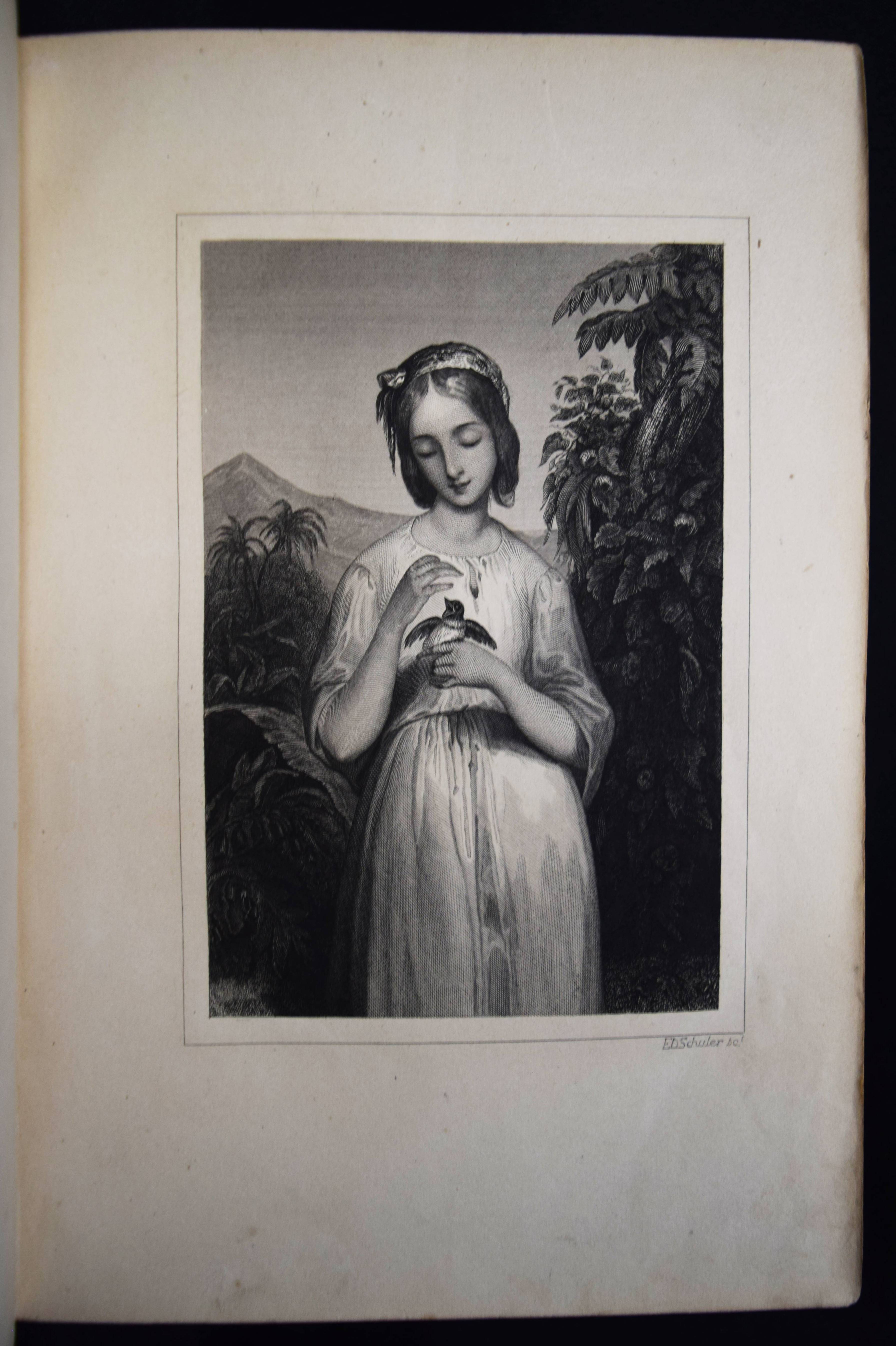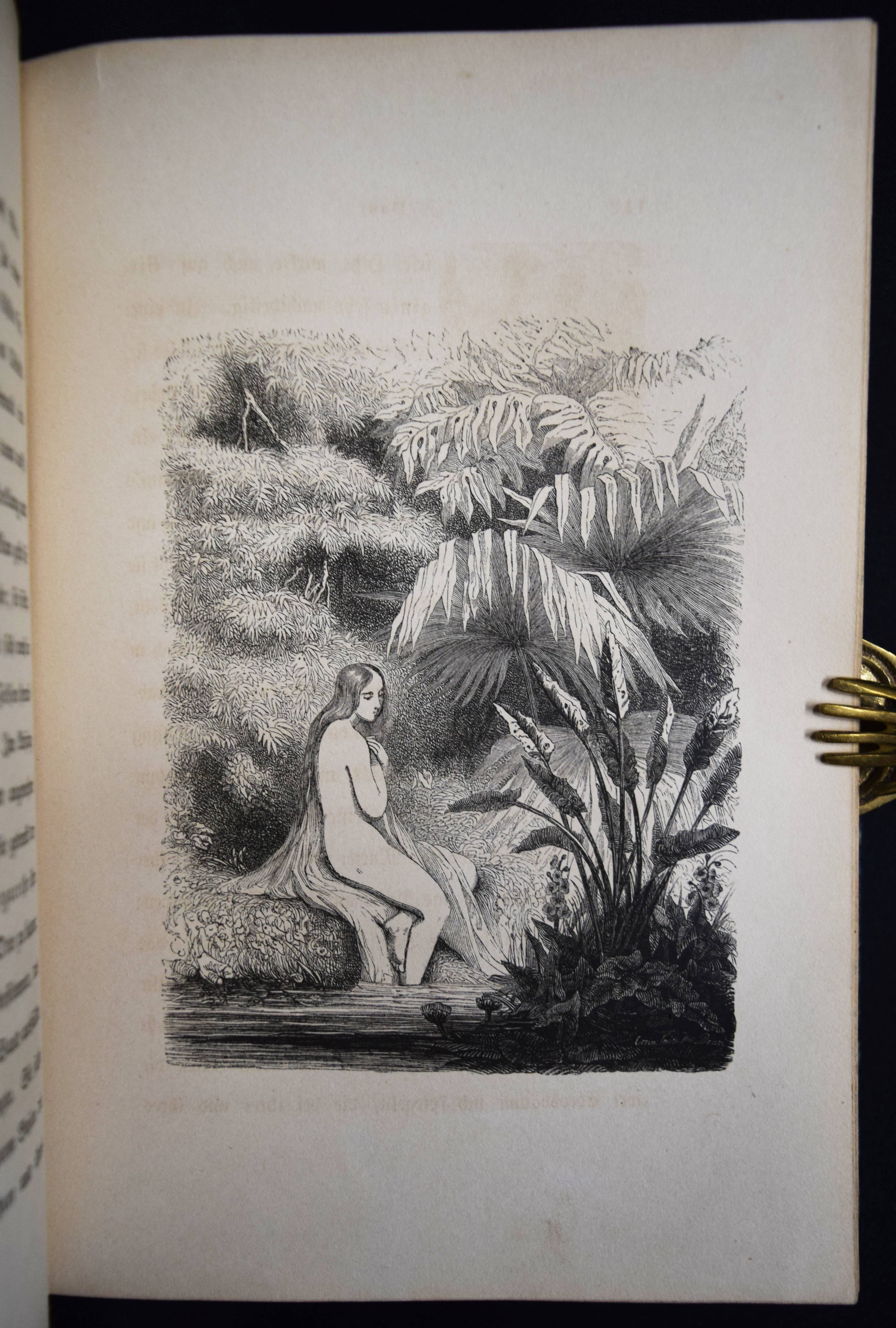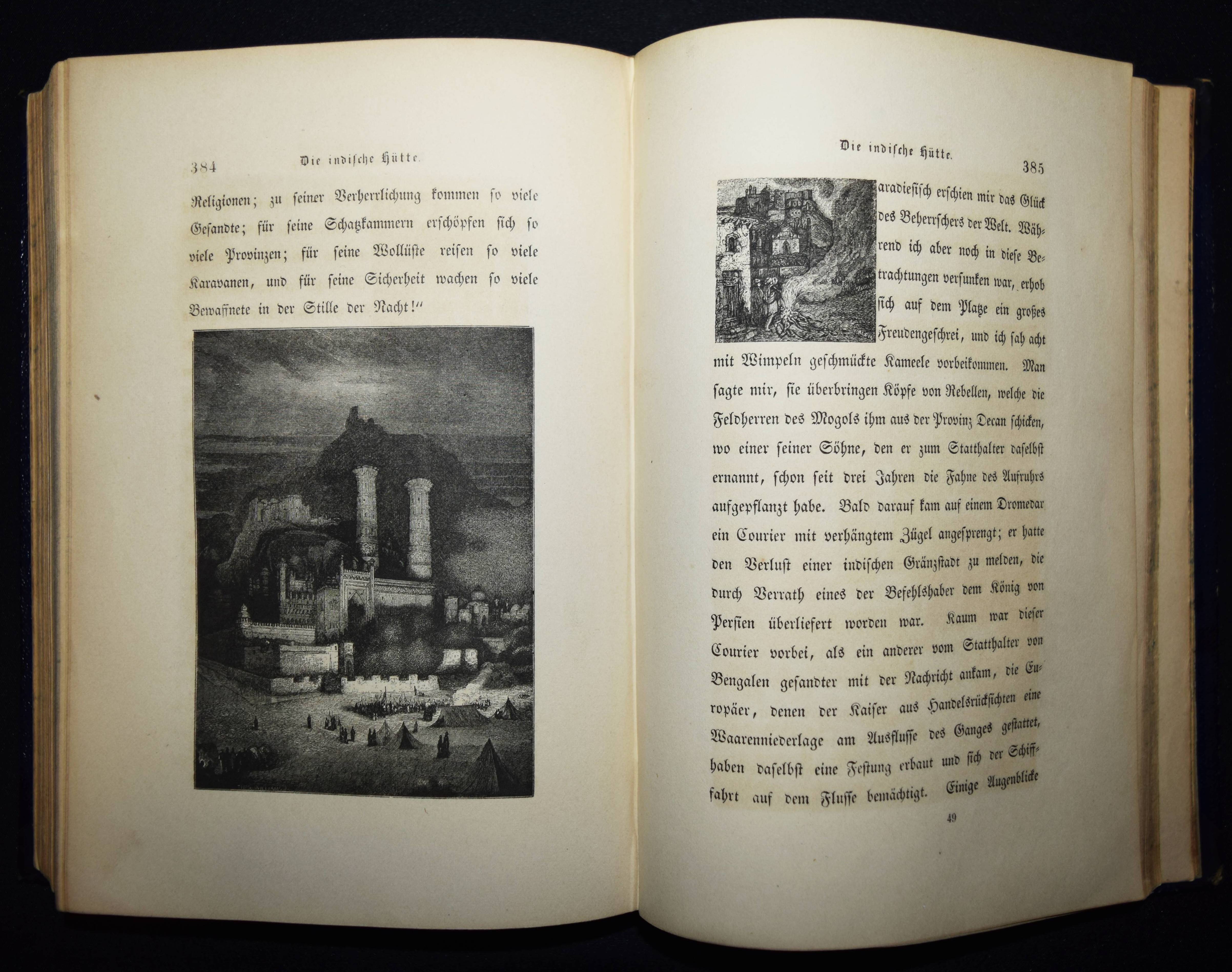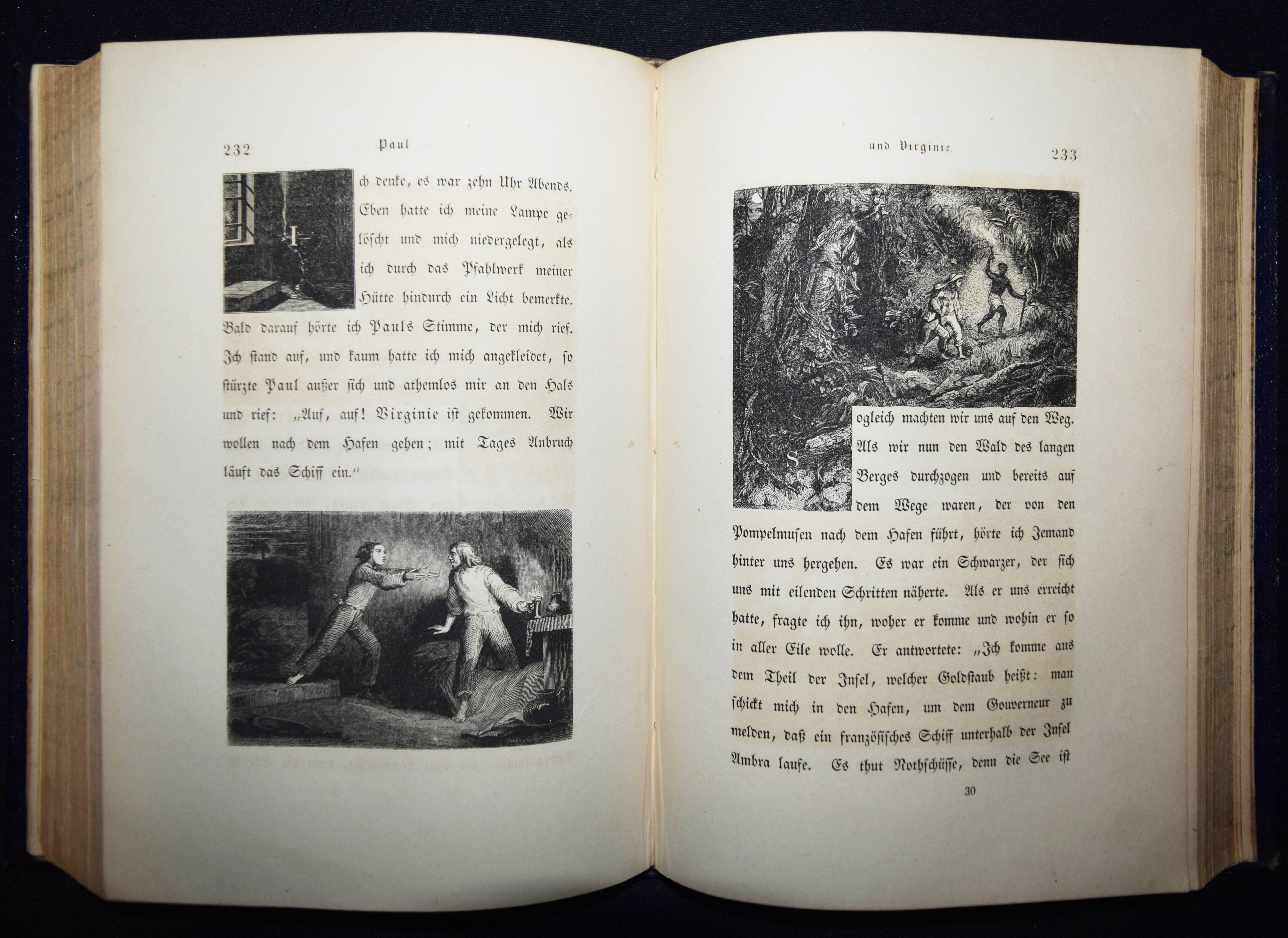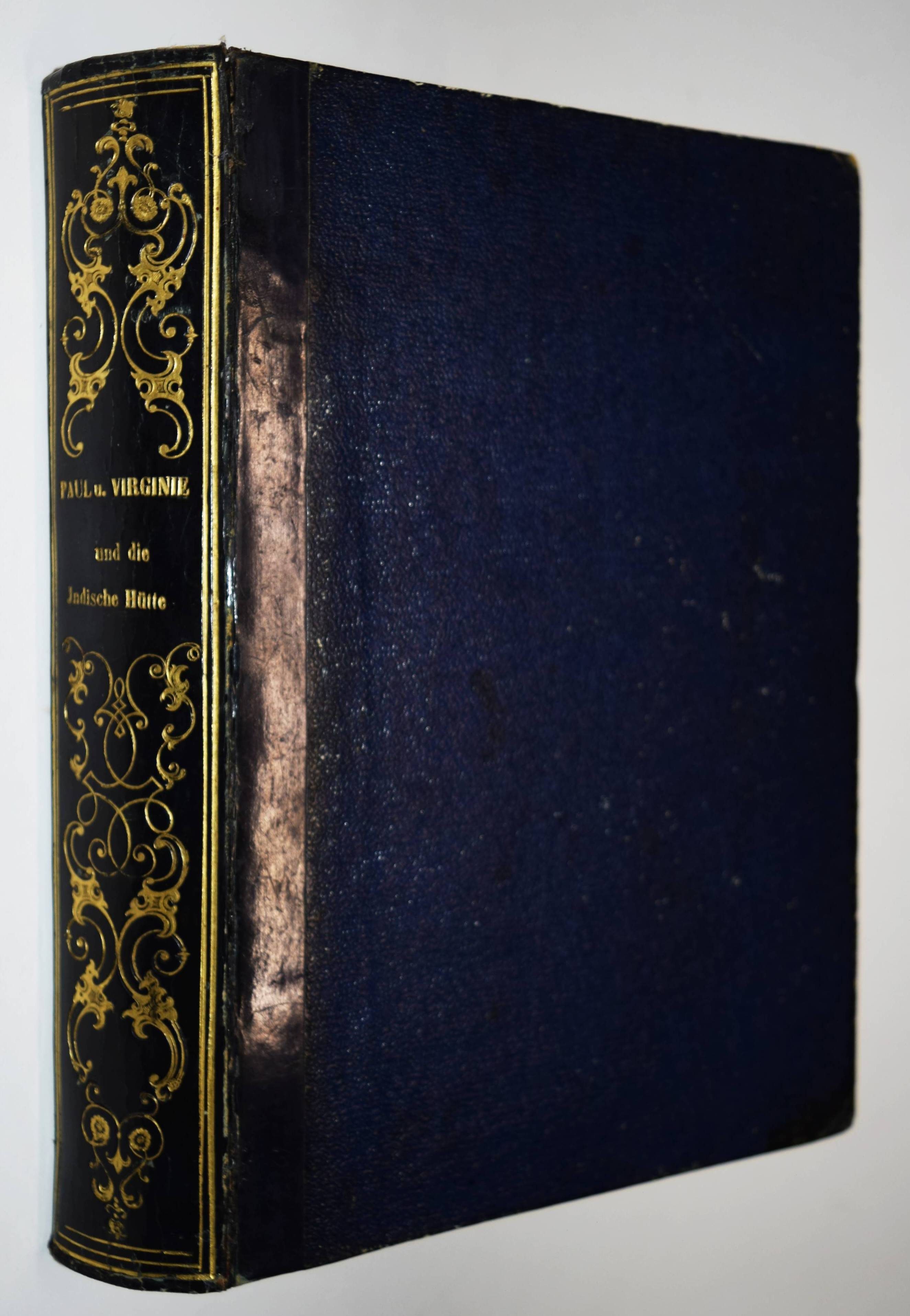 Robinsonade – Bernardin de Saint-Pierre, J(acques) H(enri). Paul und Virginie und die indische Hütte. Neue Uebertragung durch G(ottlob) Fink. Pforzheim, Denning, Fink & Co. 1840. Gr.-8°. XXXII, 458 S., 1 Bl. mit illustr. Titel, 3 Stahlstich-Porträts, 447 (28 ganzs.) Holzstich-Illustrationen u. 1 lithogr. Karte. Schwarzer Maroquin-Halblederband der Zeit mit goldgepr. Rückentitel und dekorativer Romantikervergoldung. Fromm 23176. Klotz 6115/6. LKJ III, 248. Rümann 130. Sander 605. Wegehaupt I,1837. – Erste Ausgabe dieser Übersetzung. – Die Illustrationen wurden aus der franz. Ausgabe übernommen und stammen u.a. von Johannot, Francais, Huet, Isabey, Marville und Meissonier. – „Die minuziösen und anschaulichen Schilderungen der subtropischen Natur – Bernardin de Saint-Pierre hielt sich von 1768 bis 1770 auf der Ile de France (heute Mauritius) als technischer Offizier auf – machen den Roman zum ersten Dokument des ‚exotisme‘ in Frankreich“ (KNLL II,582 ff.). – „Die Erzählung von ‚Paul et Virginie‘ wurde ein internationaler Erfolg. … ‚Paul et Virginie‘ fand in veränderten Fassungen und Übersetzungen schon bald Eingang in die Jugendliteratur. Vor allem die unter dem Titel ‚Paul et Virginie et la chaumièr indienne‘ 1838 herausgekommene Ausgabe wurde zum Modell für zahlreiche Jugendausgaben“ (LKJ). – St.u.N.a.T., stellenweise etwas gebräunt, sehr gutes sauberes und dekorativ gebundenes Exemplar.