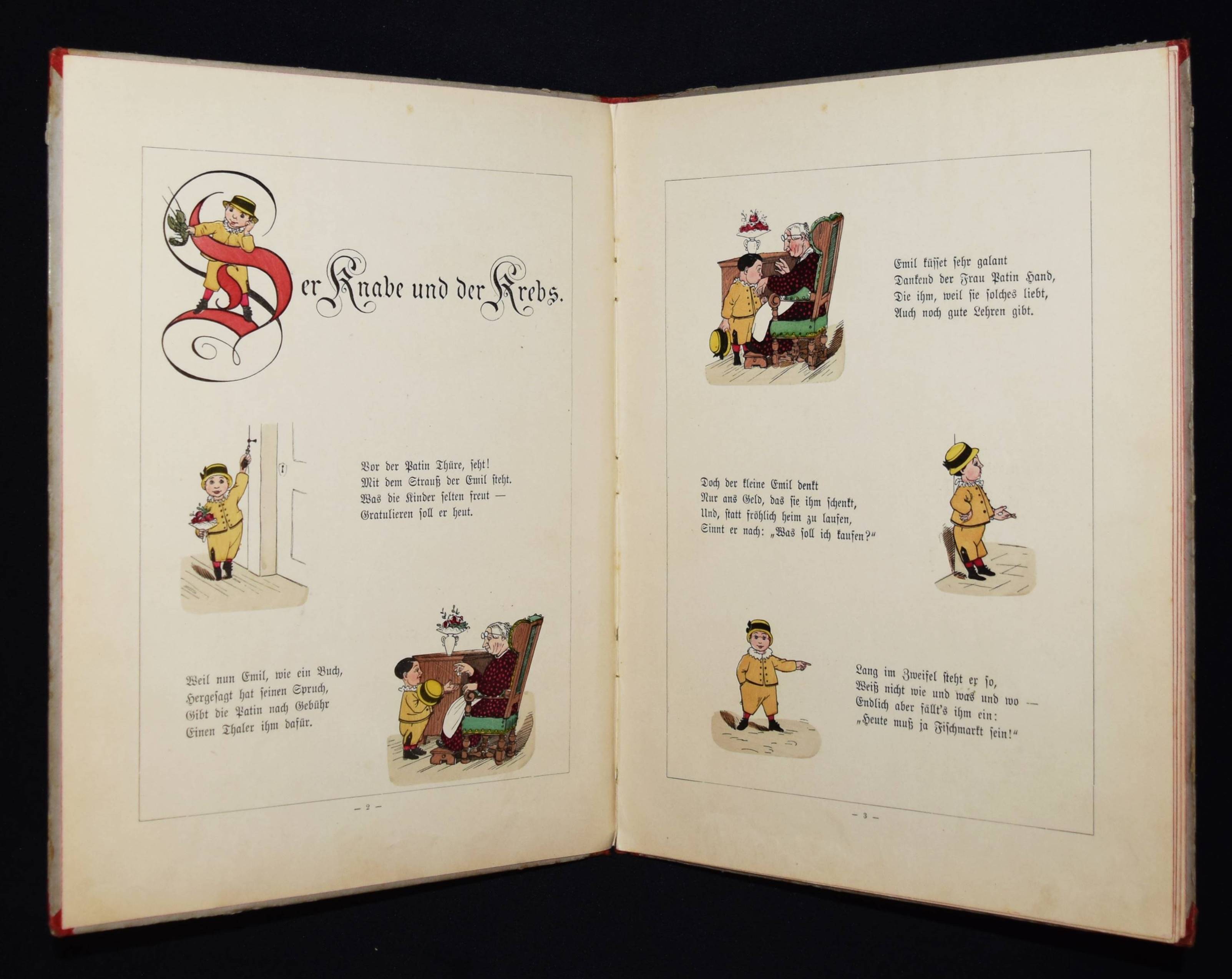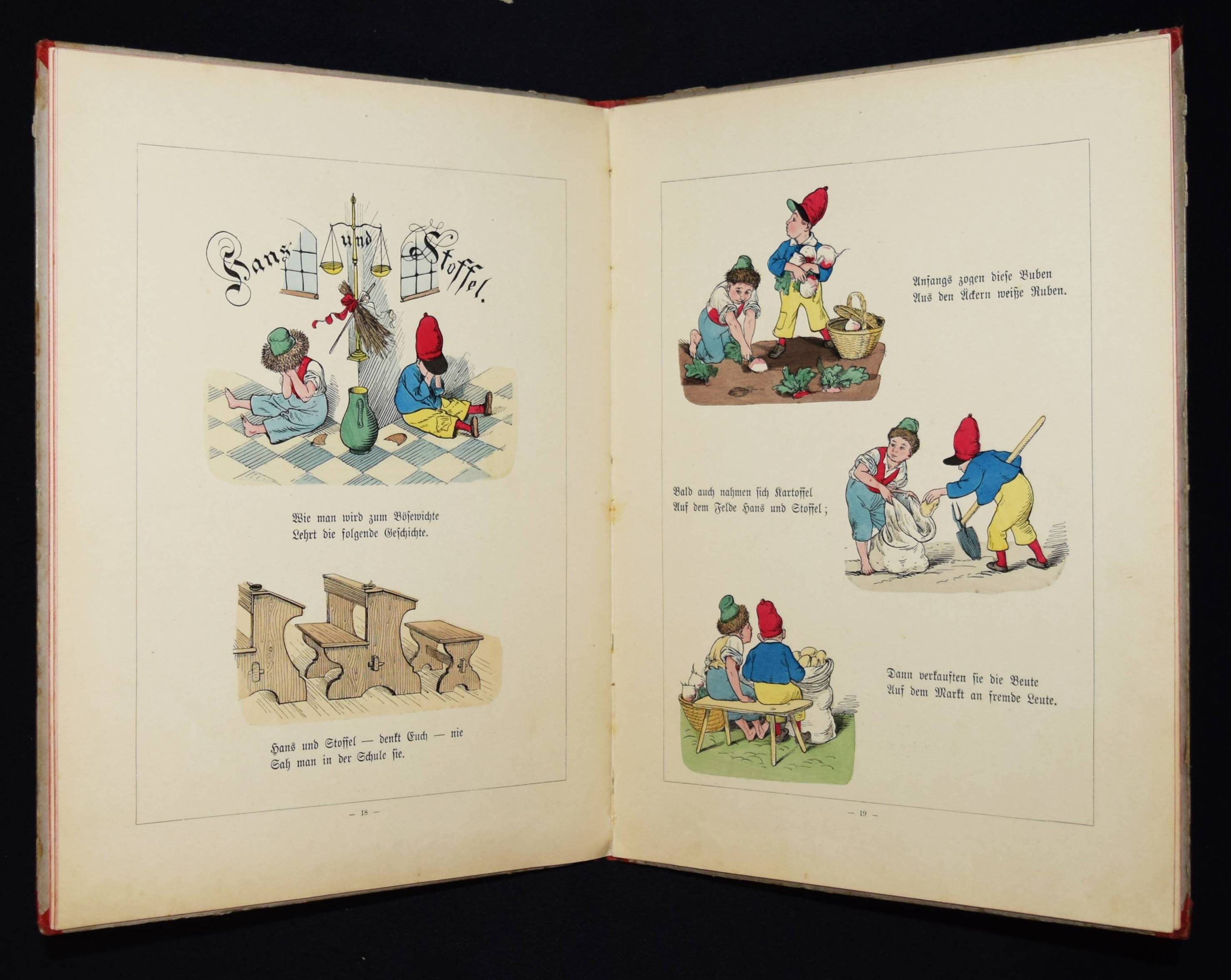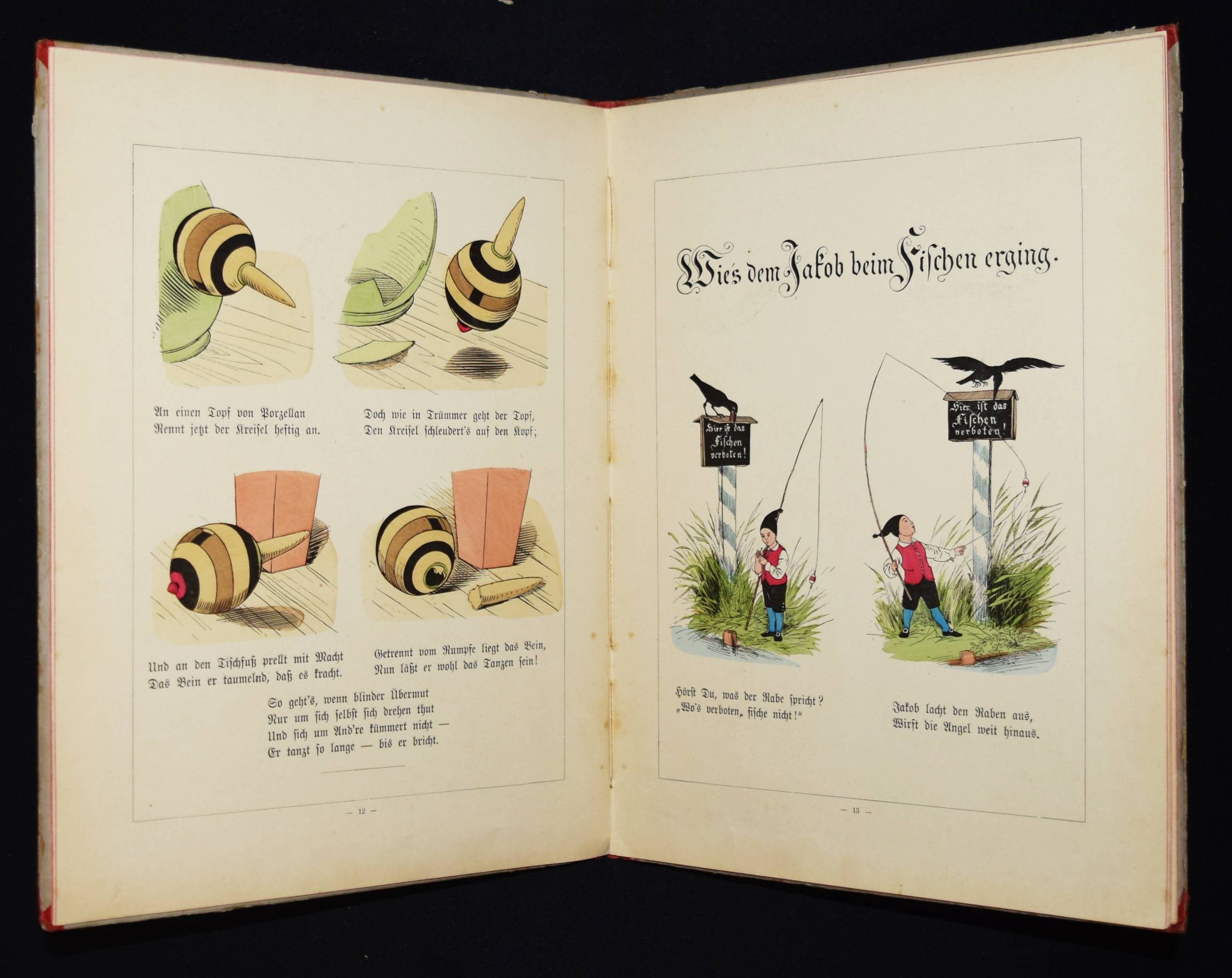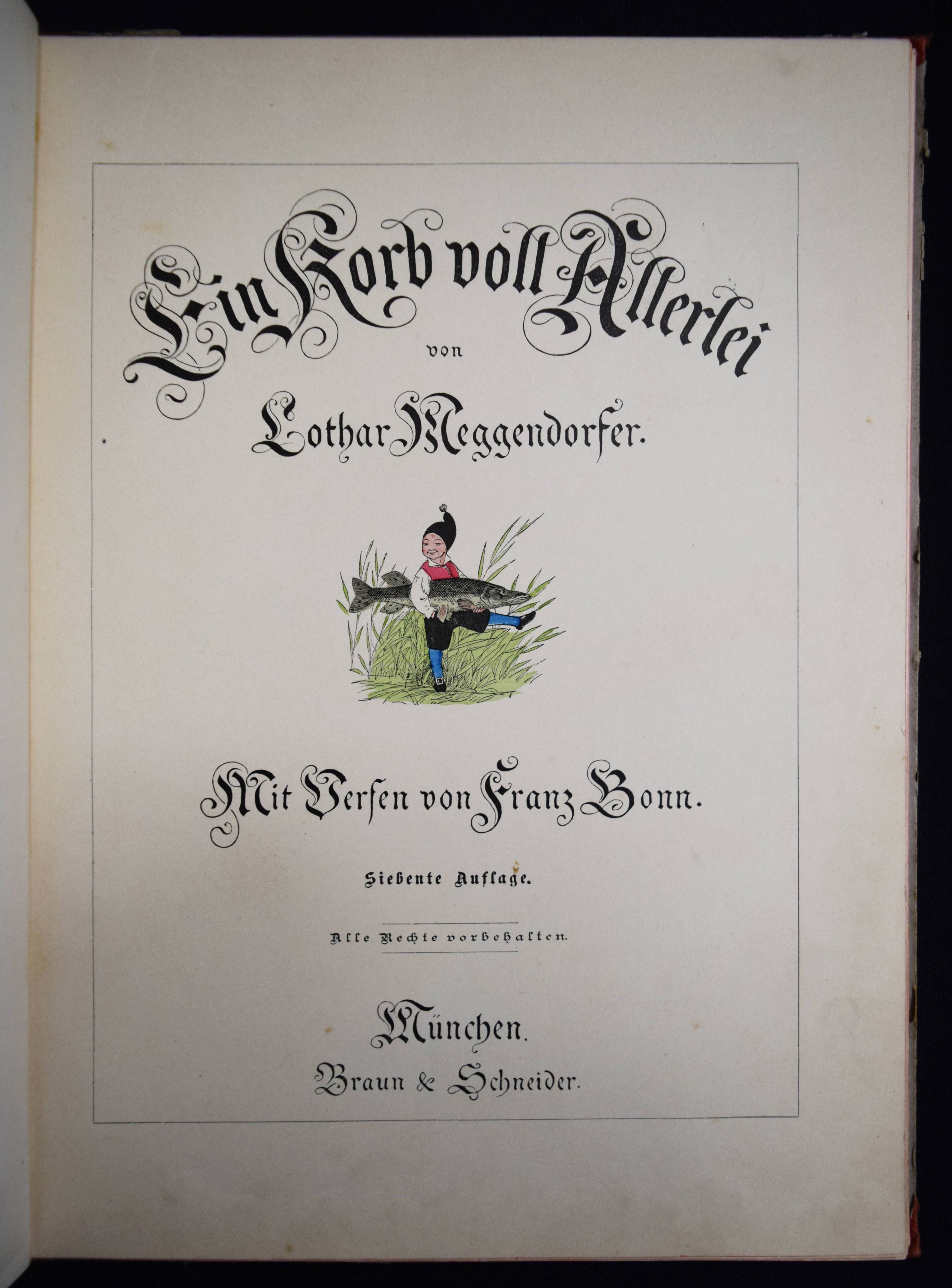 Bonn, Franz. Ein Korb voll Allerlei. (Und): Neuer Korb voll Allerlei. Mit Versen. (Mit Bildern) von Lothar Meggendorfer. 7. Aufl. u. 11. Aufl. 2 Bände. München, Braun & Schneider o. J. (1889) u. (um 1895). 4°. 32 S.; 23, (1) S. mit zahlr. handkol. Illustrationen in Holzschnitt von Lothar Meggendorfer. OHln. mit handkol. Deckelbild u. farbig illustr. OKart. mit Leinenrücken. Klotz 592/26 u. 27. Ries 710, 7 u. 15. Vgl. Bilderwelt 439. Krahé 75 u. 104. LKJ II, 460. Wegehaupt II, 2166. – Zuerst 1880 und 1882 erschienenes Bilderbuch mit zusammen 12 Bildgeschichten. – Einbände angestaubt und etwas fleckig, vorderes Innengelenk von Band I im unteren Drittel etwas angeplatzt, vorderes Innengelenk von Band II geplatzt, vereinzelt im Blattrand etwas braunfleckig, sonst gut erhalten.