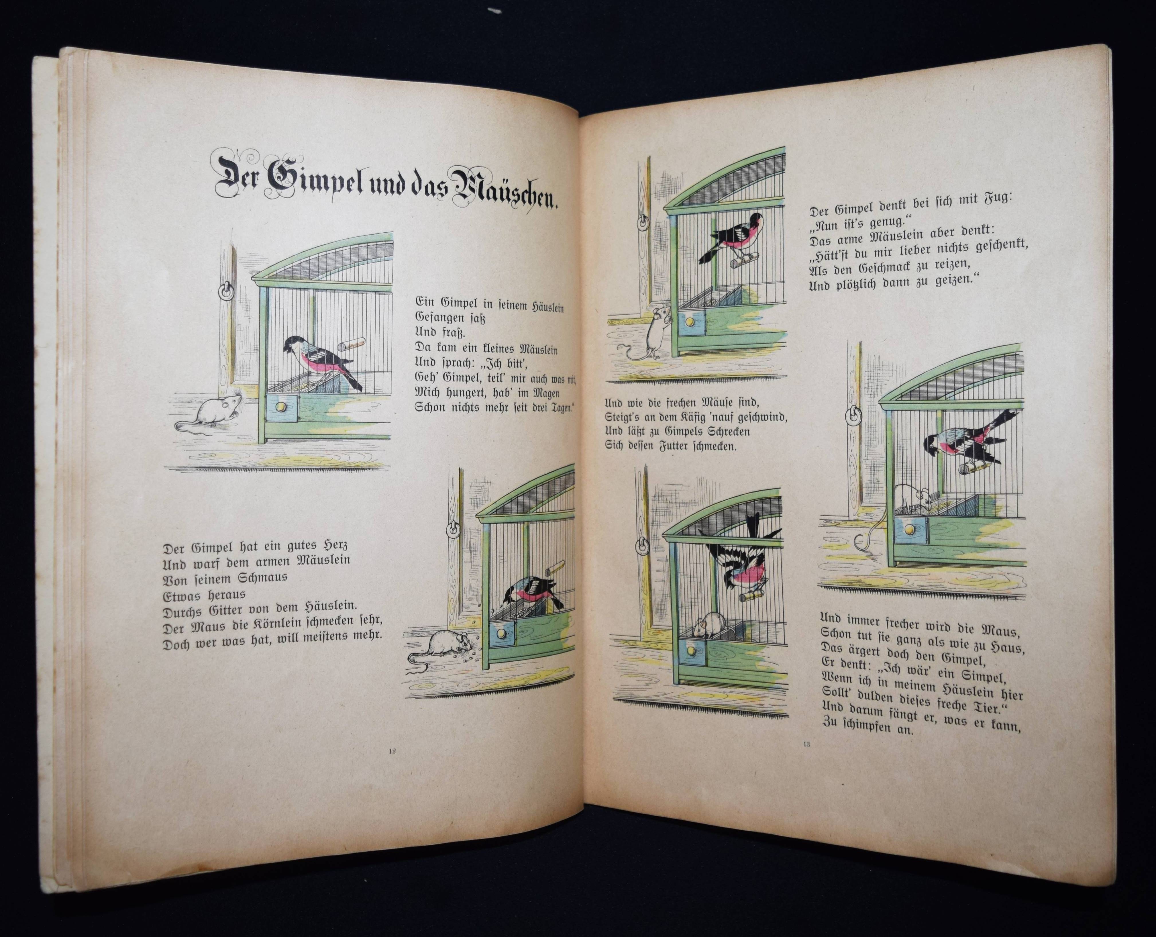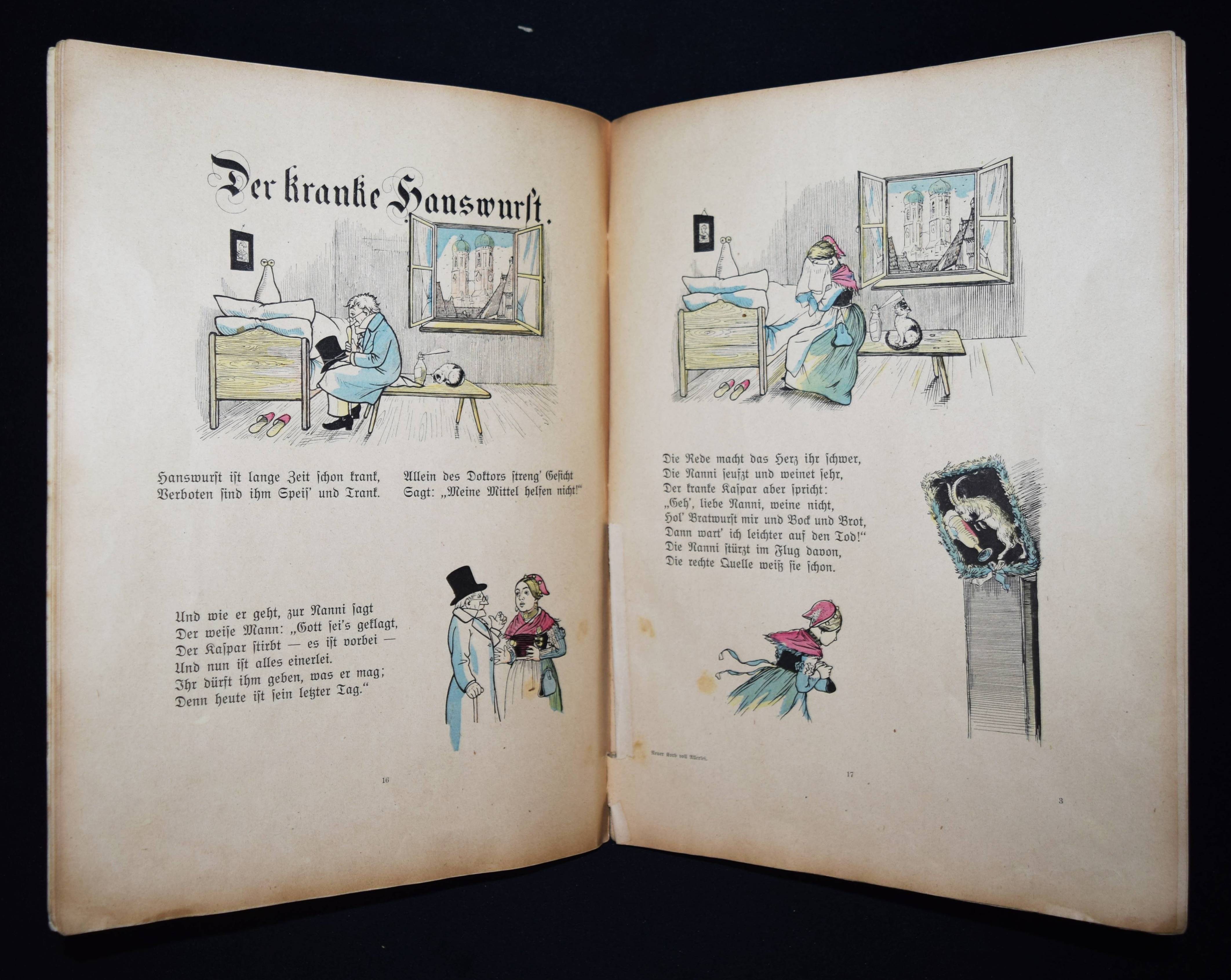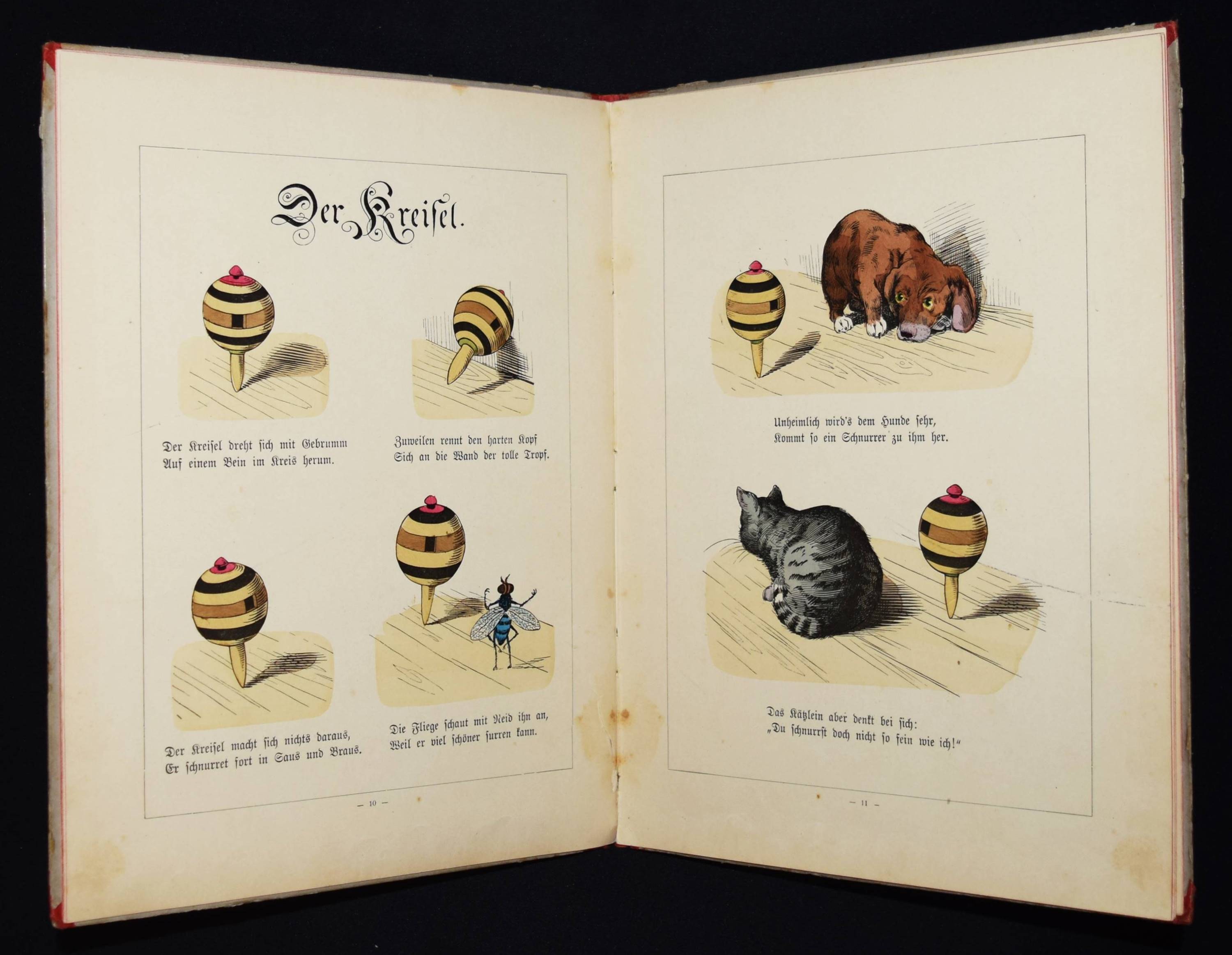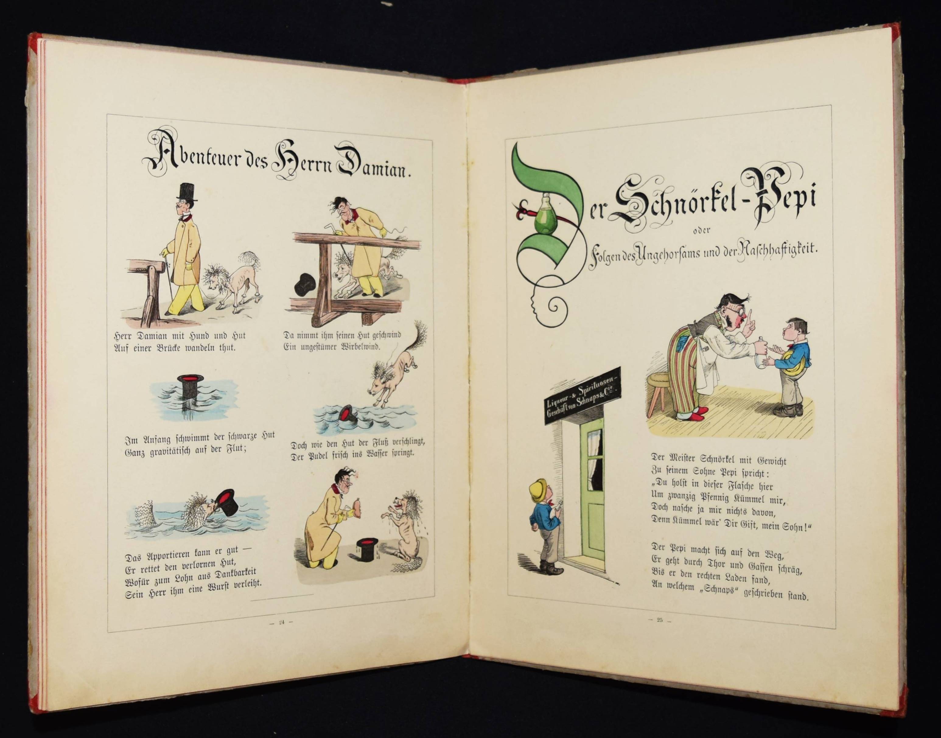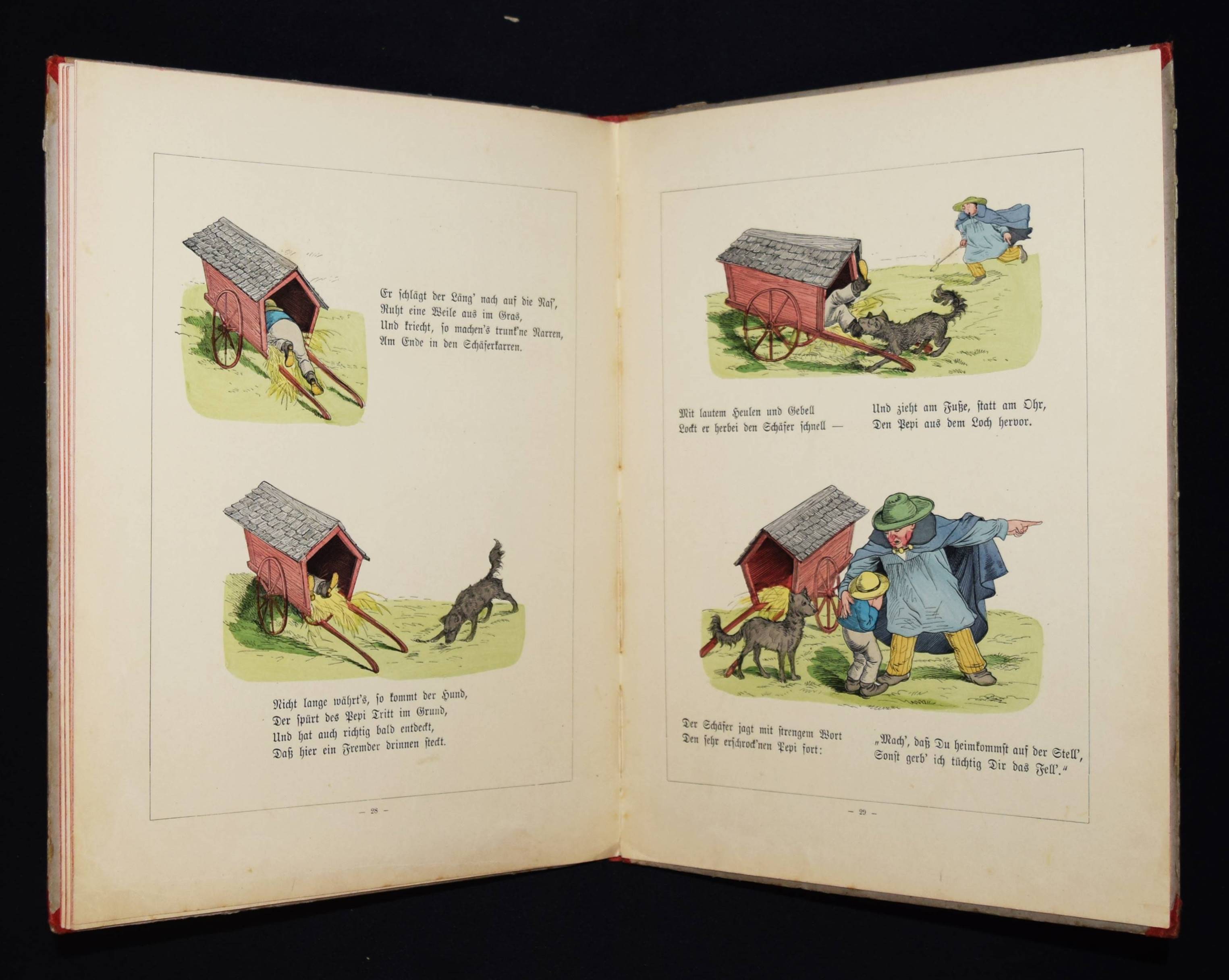 Bonn, Franz. Ein Korb voll Allerlei. (Und): Neuer Korb voll Allerlei. Mit Versen. (Mit Bildern) von Lothar Meggendorfer. 7. Aufl. u. 11. Aufl. 2 Bände. München, Braun & Schneider o. J. (1889) u. (um 1895). 4°. 32 S.; 23, (1) S. mit zahlr. handkol. Illustrationen in Holzschnitt von Lothar Meggendorfer. OHln. mit handkol. Deckelbild u. farbig illustr. OKart. mit Leinenrücken. Klotz 592/26 u. 27. Ries 710, 7 u. 15. Vgl. Bilderwelt 439. Krahé 75 u. 104. LKJ II, 460. Wegehaupt II, 2166. – Zuerst 1880 und 1882 erschienenes Bilderbuch mit zusammen 12 Bildgeschichten. – Einbände angestaubt und etwas fleckig, vorderes Innengelenk von Band I im unteren Drittel etwas angeplatzt, vorderes Innengelenk von Band II geplatzt, vereinzelt im Blattrand etwas braunfleckig, sonst gut erhalten.