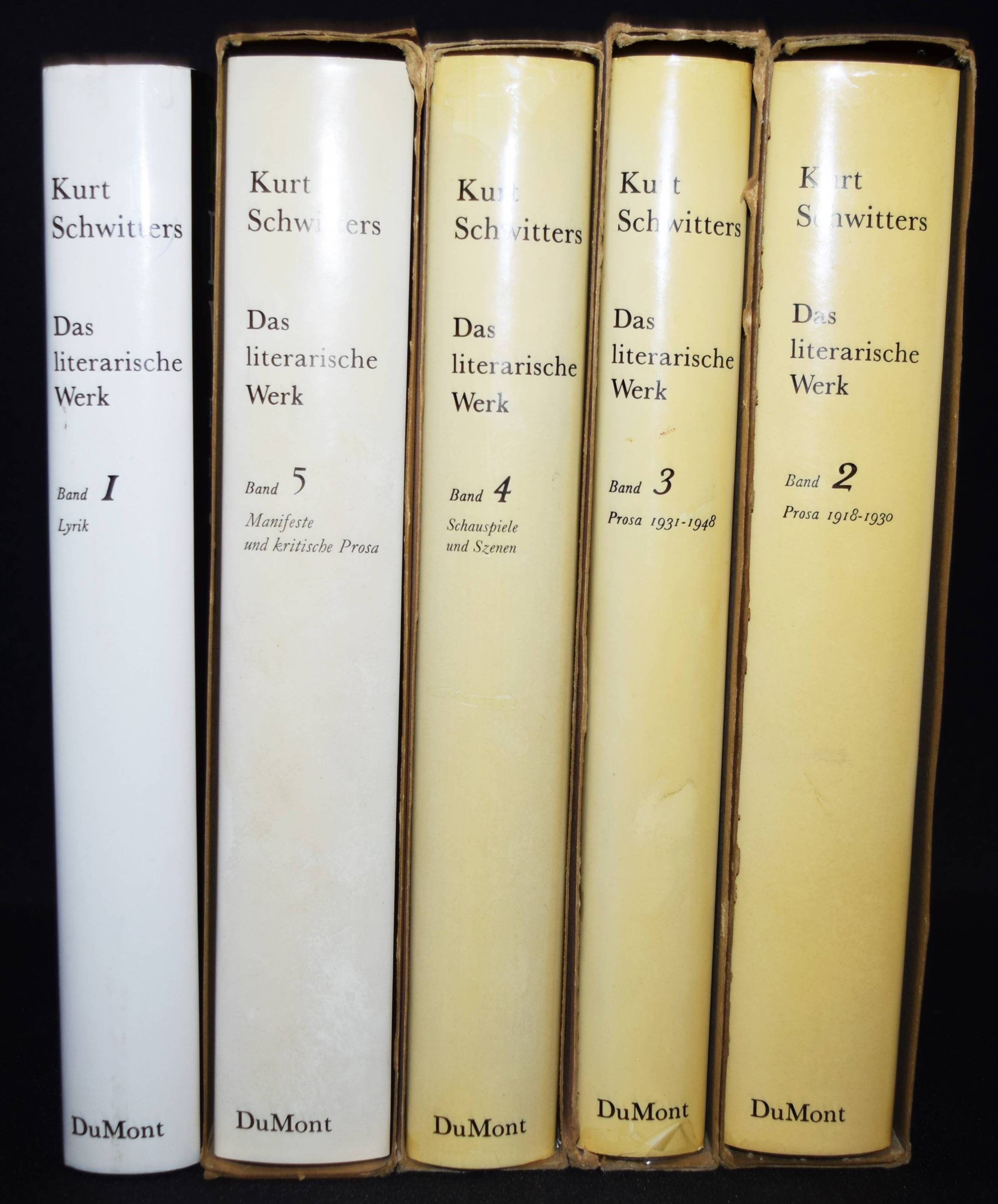 Schwitters, Kurt. Das literarische Werk. Herausgegeben von Friedhelm Lach. 5 Bände. Köln, DuMont 1973-1988. Gr.-8°. 319 S.; 438 S.; 338 S.; 371 S.; 462 S. OLn. mit illustr. OU. u. Orig.-Pappschuber (außer Band I). W.-G. ² 14. – Erste Ausgabe. – I. Lyrik. – II. Prosa 1918-1930. – III. Prosa 1931-1948. – IV. Schauspiele und Szenen. – V. Manifeste und Kritische Prosa, Nachträge, Gesamtregister. – Schuber von Band I fehlt, Rücken von Band 2, 3 und 4 etwas gebräunt, St.a.T. (Band II-V), gutes Exemplar.
