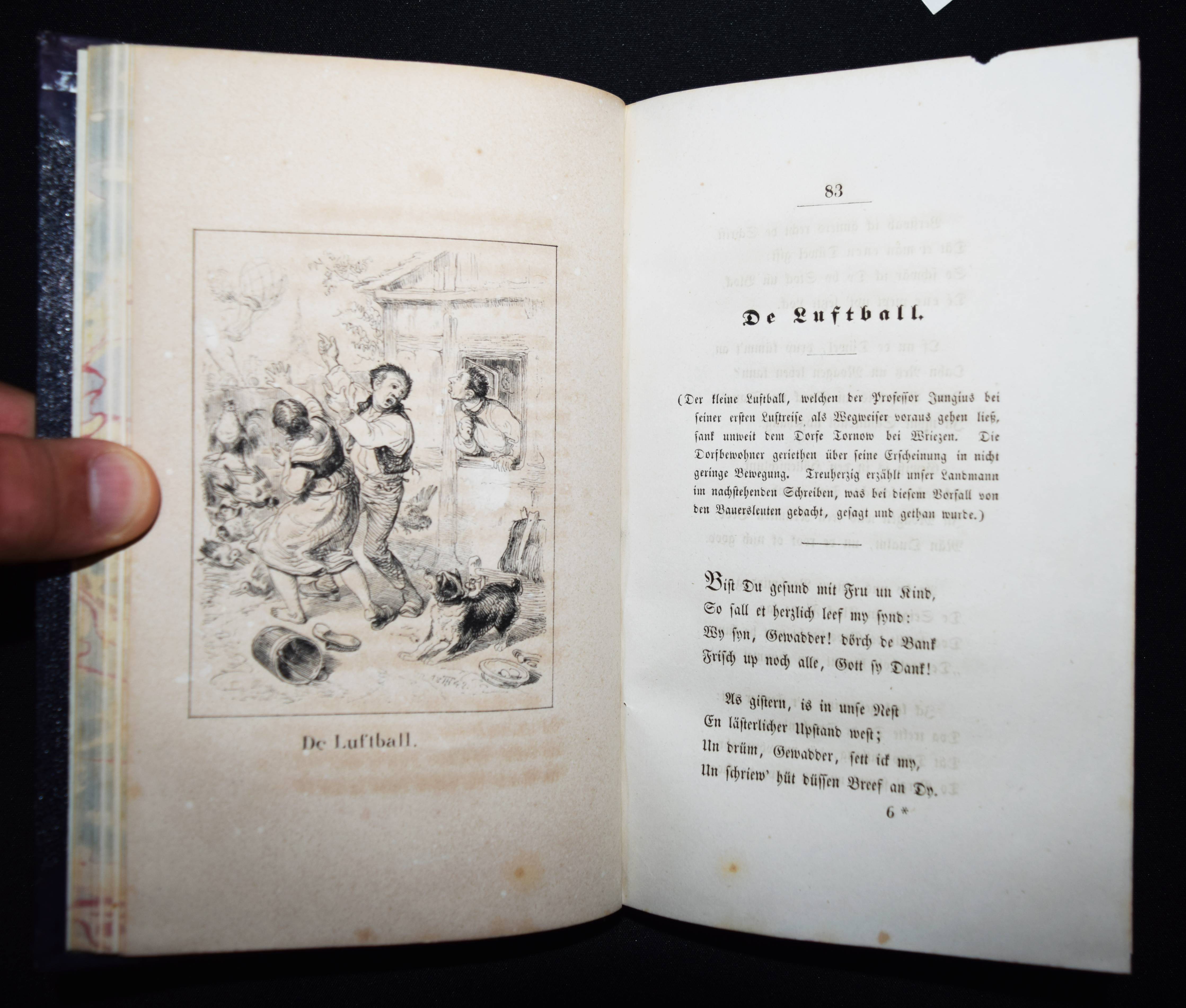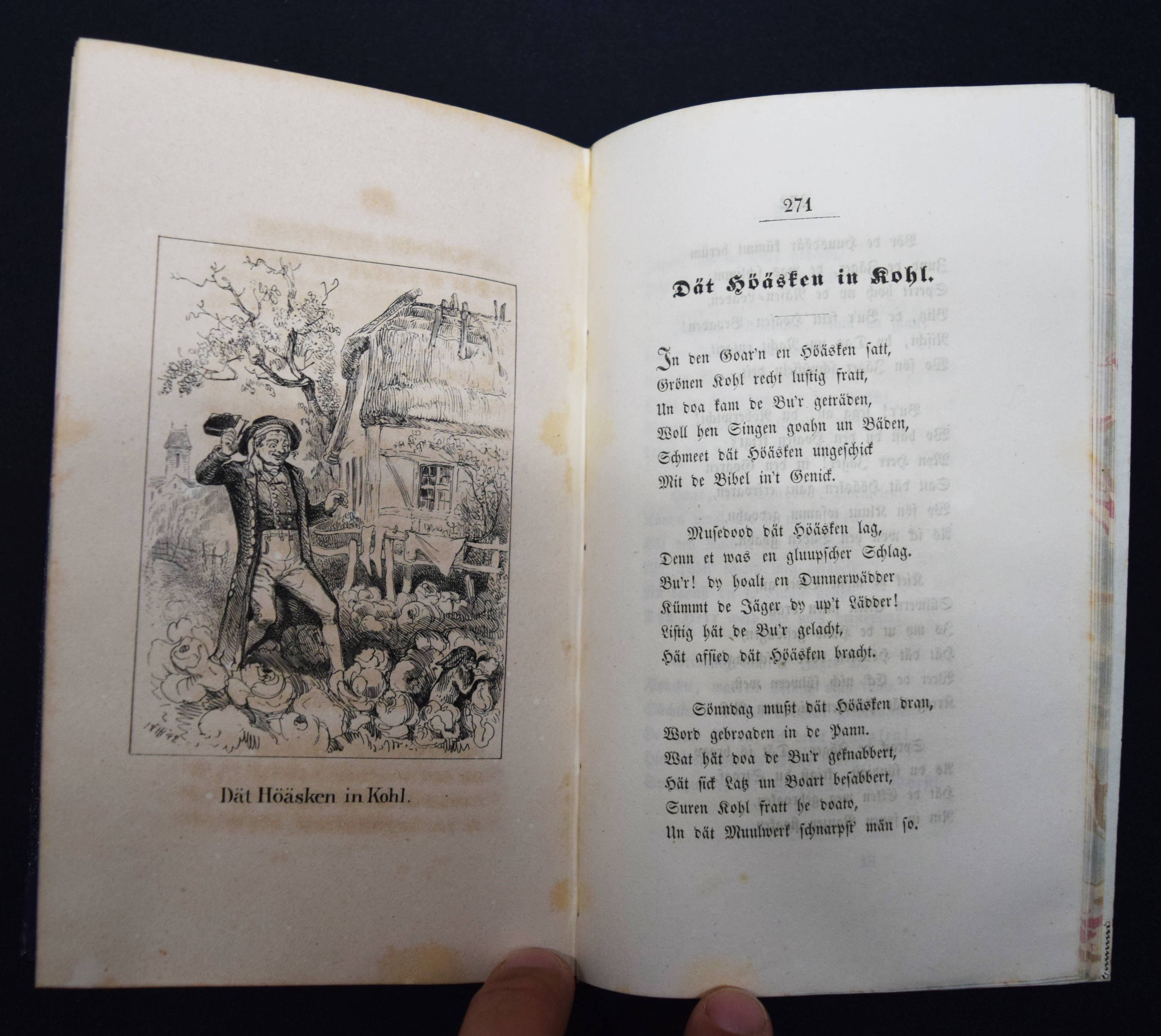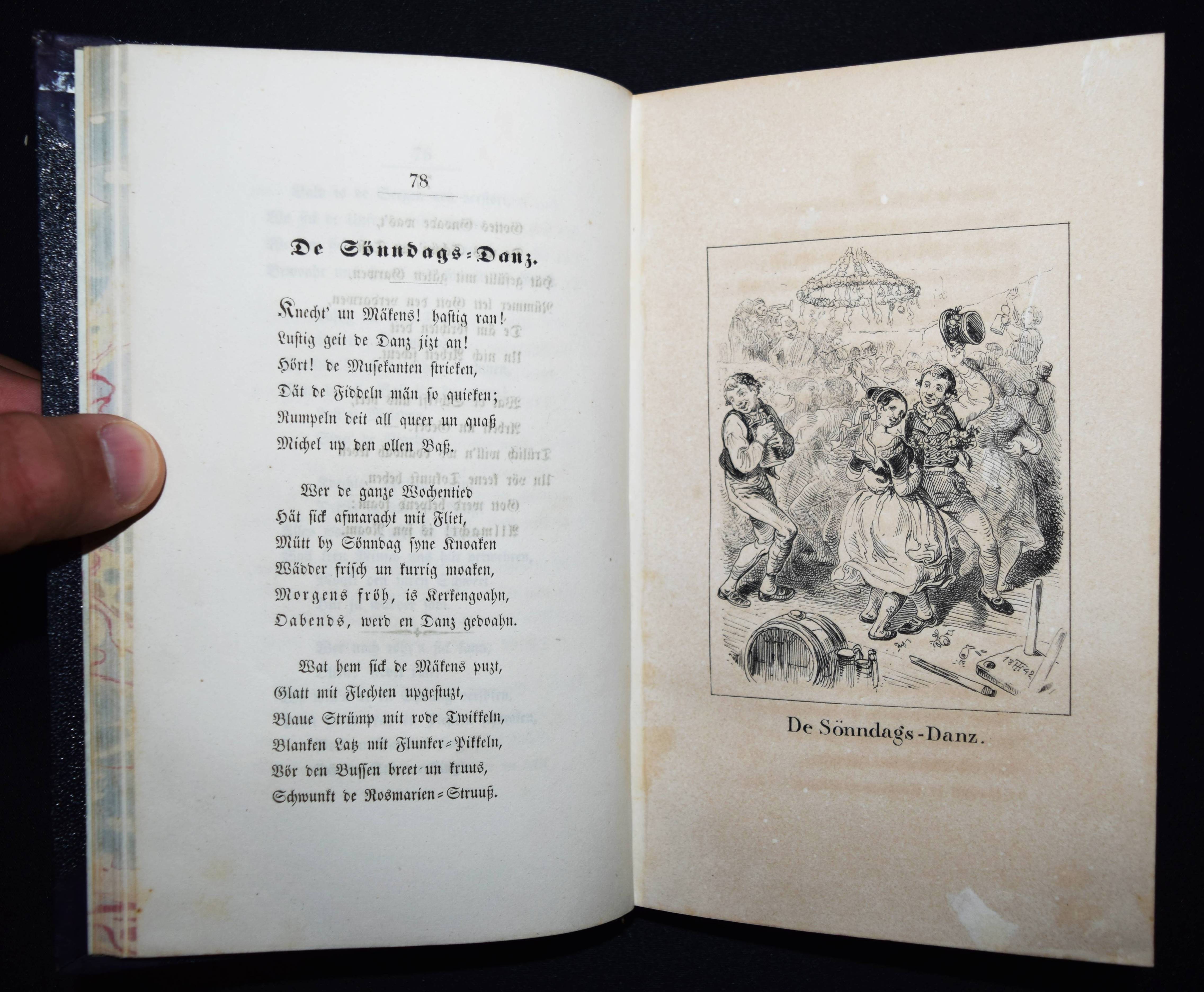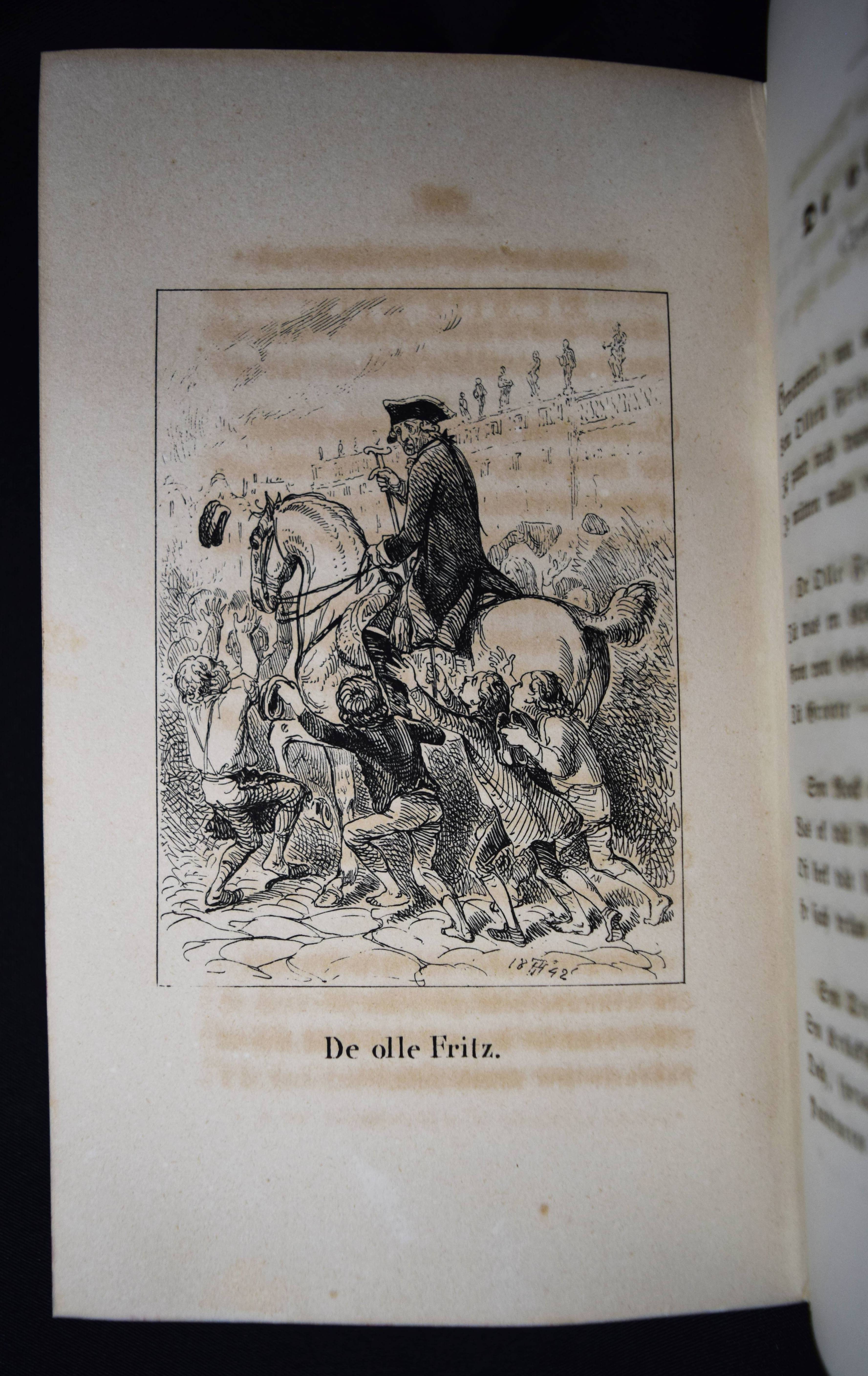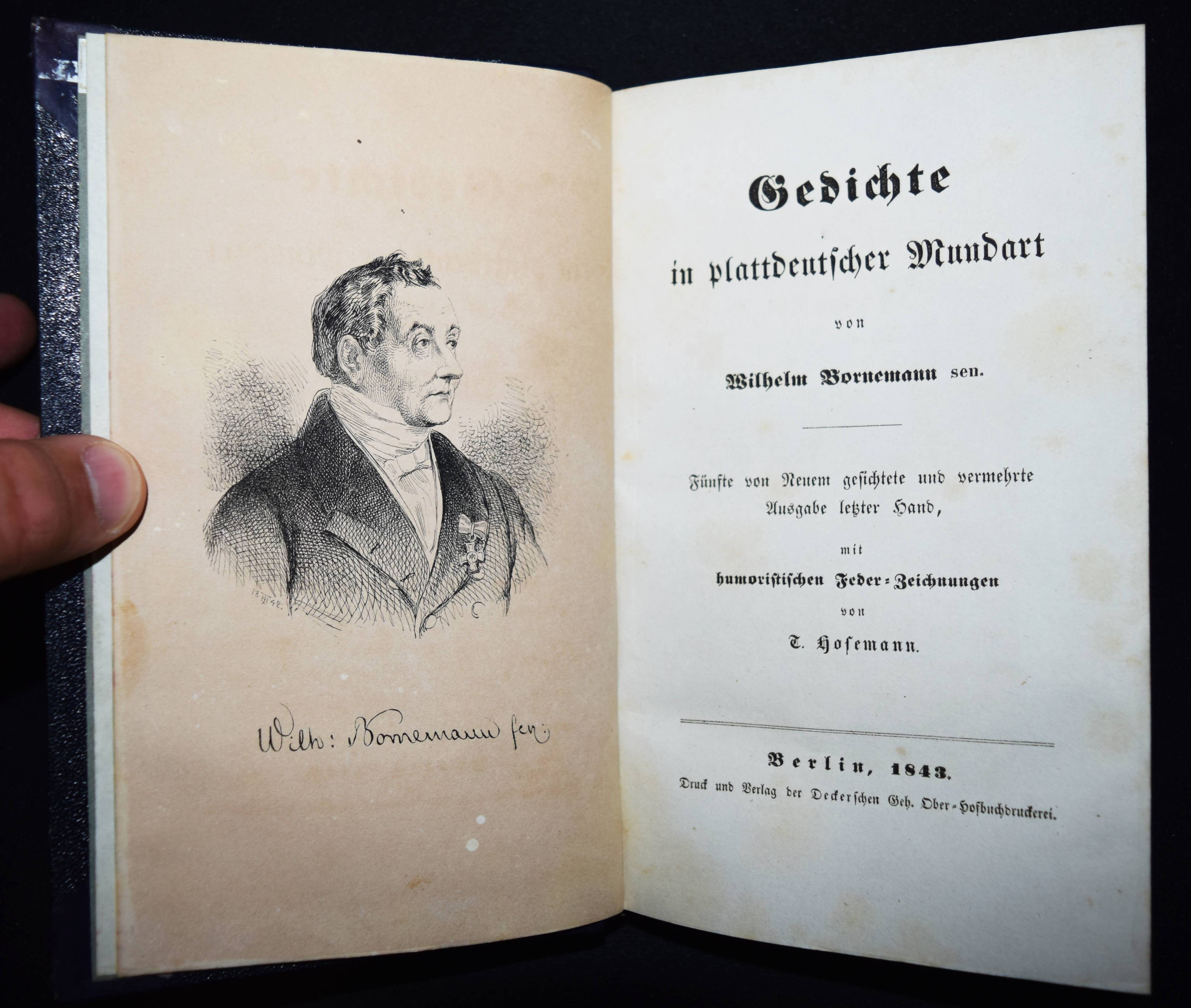 Bornemann, (Johann) Wilhelm (Jacob). Gedichte in plattdeutscher Mundart. Mit humoristischen Feder-Zeichnungen von T(heodor) Hosemann. 5. von Neuem gesichtete und vermehrte Ausgabe letzter Hand. Berlin, Decker 1843. 8°. XII, 356 S. mit Porträt u. 13 ganzs. lithogr. Illustrationen. Schwarzer Halb-Maroquinlederband der Zeit mit goldgepr. Rückentitel und Romantikervergoldung. Brieger 225. Goed. VII 563, 100. Hobrecker 99. Rümann 719. – Erste von Hosemann illustr. Ausgabe. – Der ehemalige Generaldirektor der Preußischen Staatslotterie J. W. J. Bornemann (1766-1851) ist vor allem durch seine Mundartgedichte bekannt geworden von seinen hochdeutschen Versen wurde „Im Wald und auf der Heide“ zum Volkslied. – Nur vereinzelt minimal fleckig, die Tafeln wie immer etwas gebräunt, sehr gutes dekorativ gebundenes Exemplar.