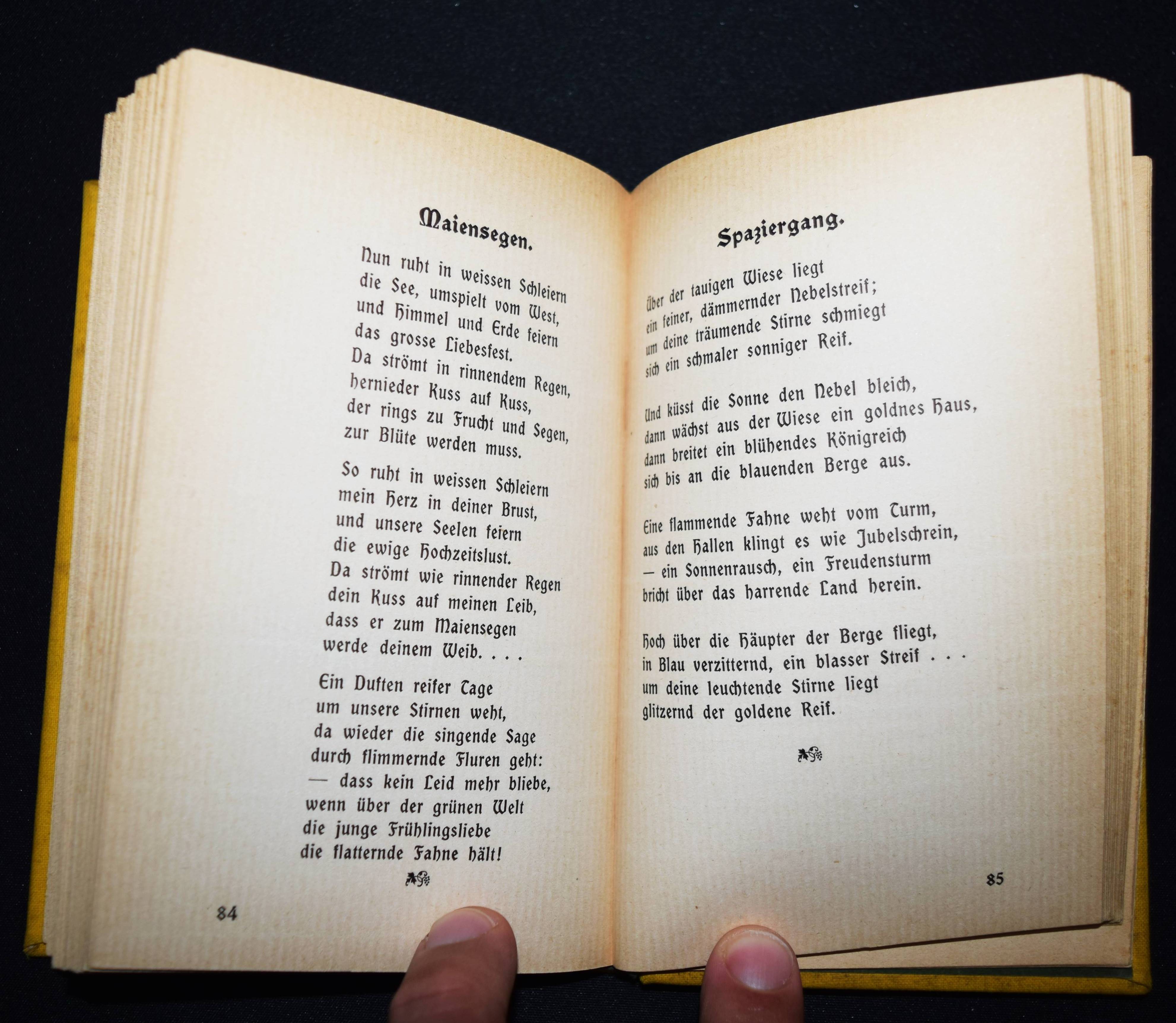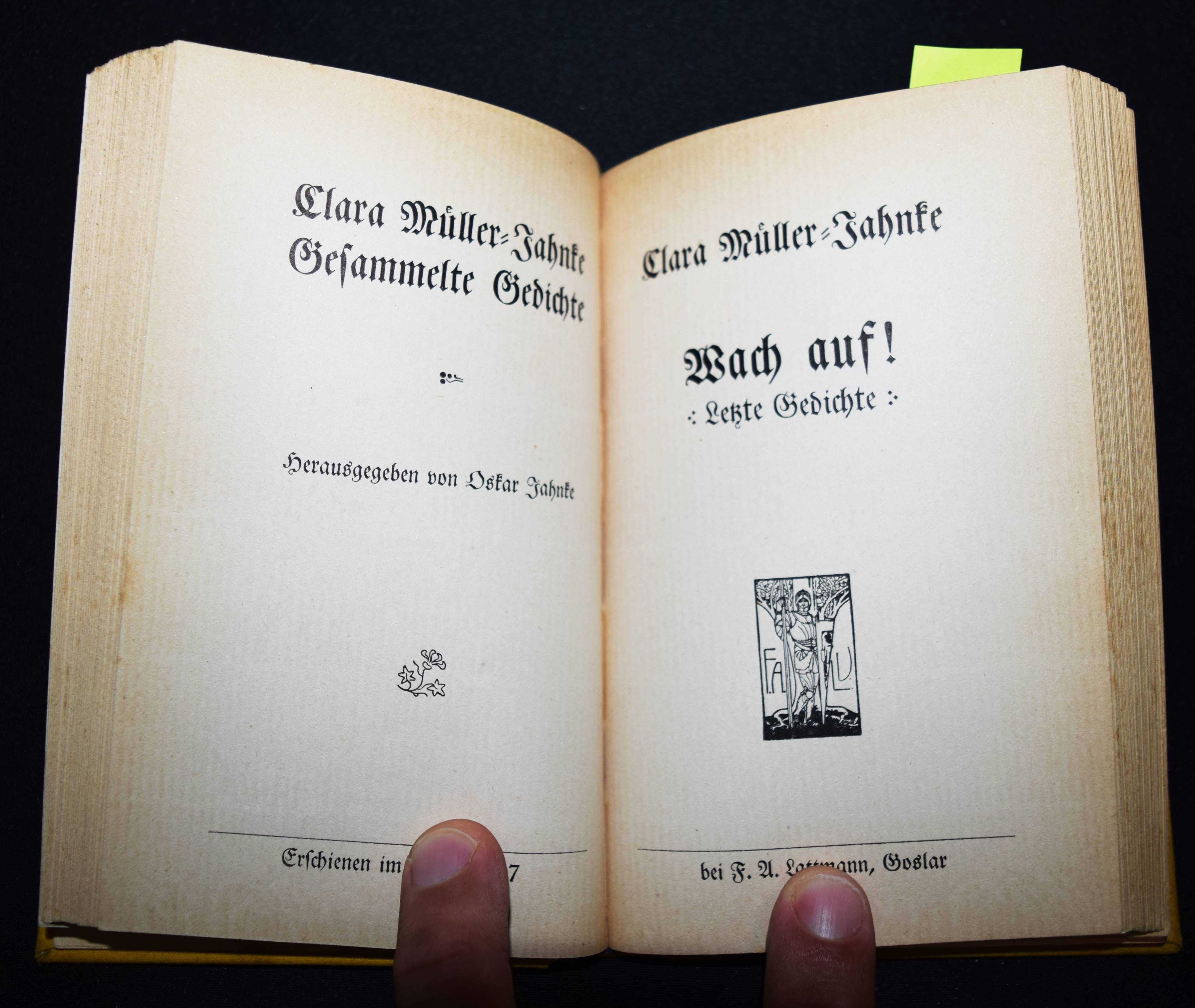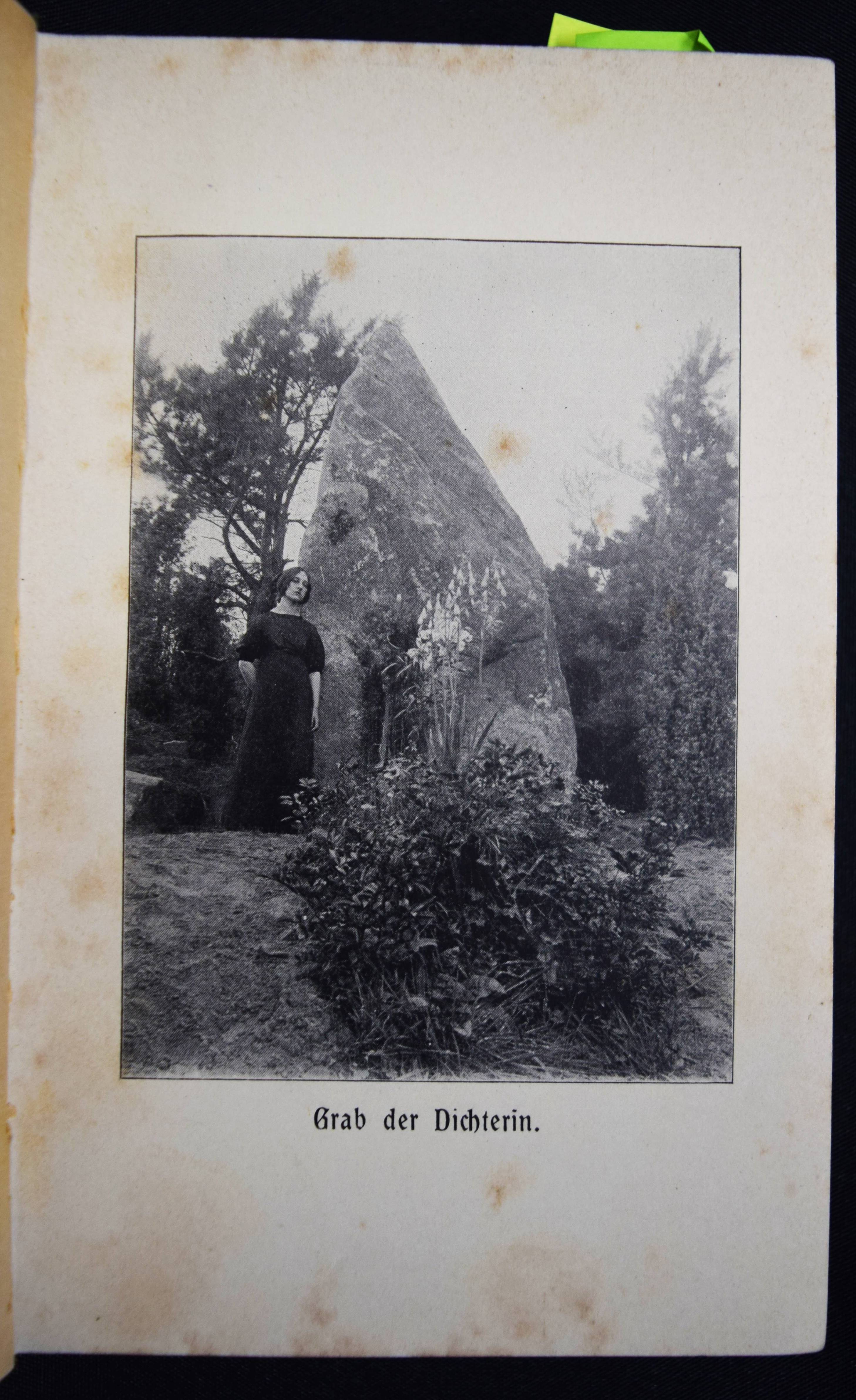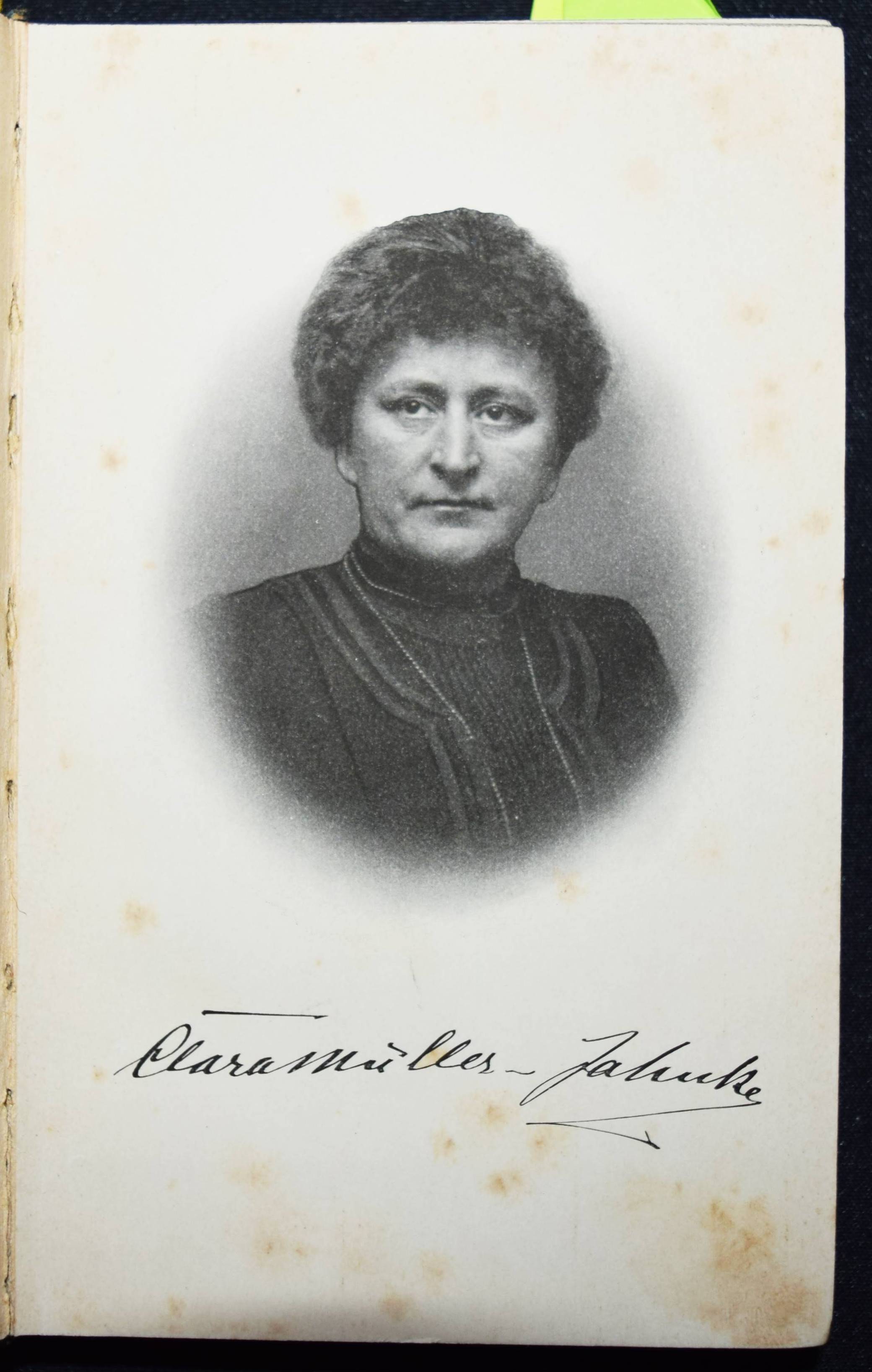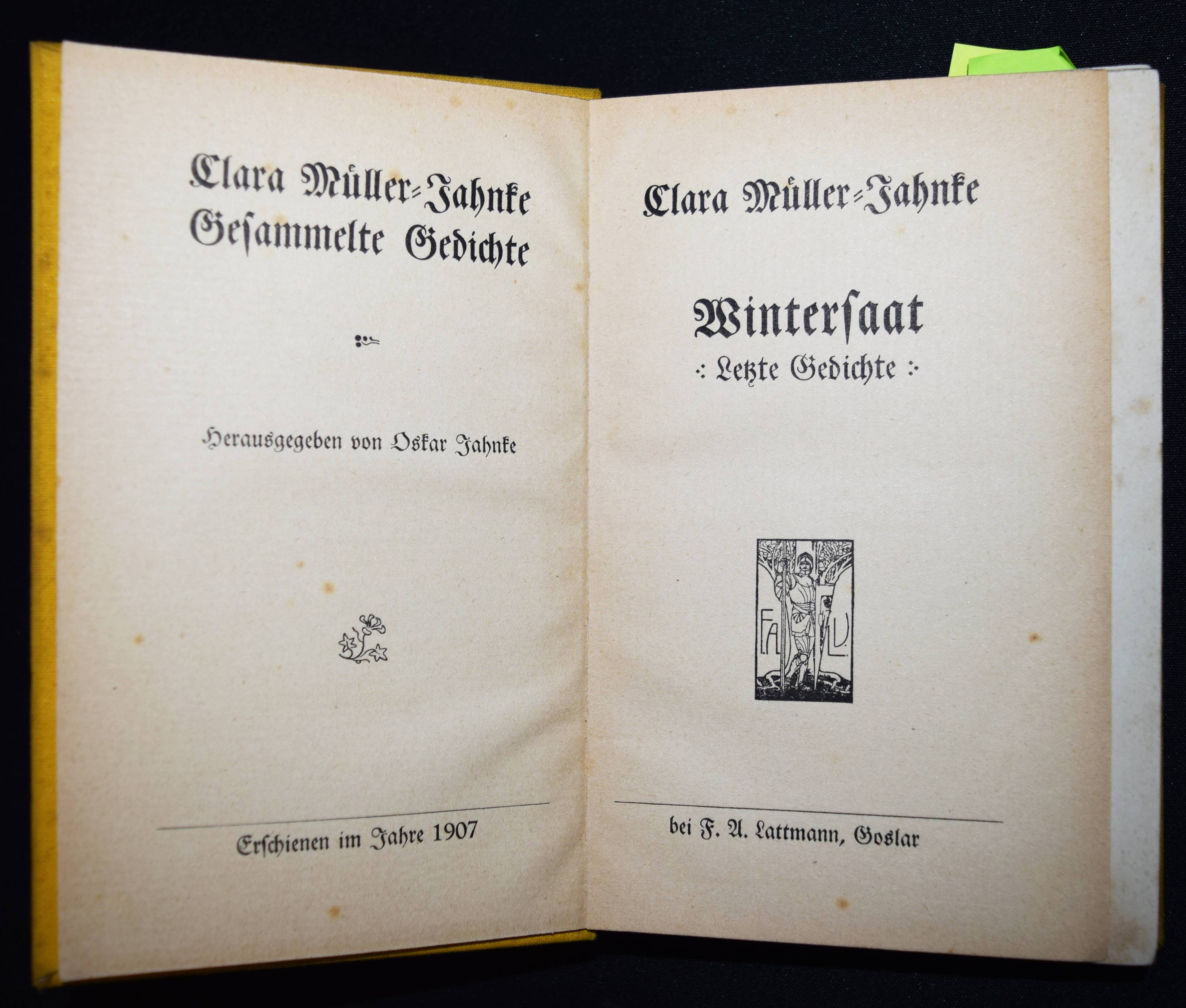 Müller-Jahnke, Clara. Gesammelte Gedichte. Herausgegeben von Oskar Jahnke. (Einleitung von Julius Hart). 3 Teile in 1 Band. Goslar, F. A. Lattmann 1907. Kl.-8°. V, [1] Bl., 142, IV S. mit 2 Tafeln. Gelber OLn. mit Jugendstil-Illustration. Erste Gesamtausgabe der Gedicht-Sammlung der bedeutenden Dichterin, Journalistin und Frauenrechtlerin Clara Müller-Jahnke (1860-1905). – I. Wintersaat – Letzte Gedichte. – II. Wach auf! – Letzte Gedichte. – III. Das Weib. – C. Müller-Jahnke „galt als führende sozialistische Dichterin ihrer Zeit und machte insbesondere mit ihren agitatorischen Arbeitergedichten auf die Lage der Arbeiter und der Frauen aufmerksam. … Durch eine Erbschaft konnte sie seit 1900 als freie Schriftstellerin leben. Im Dezember 1899 war ihre Mutter verstorben. Fortan begab sich Clara Müller auf Reisen. In Italien lernte sie den Orientmaler Oskar Jahnke kennen. 1902 heirateten die beiden auf Capri. Oskar Jahnke arbeitete auch in Berlin, unter anderem als Architekt für das Bezirksamt Zehlendorf. Clara Müller-Jahnke und ihr Mann waren mit dem Friedrichshagener Dichterkreis bekannt. Julius Hart schrieb später die Einführung zu Müller-Jahnkes Gedichtbänden. Im Jahre 1904 erschien Clara Müller-Jahnkes autobiographische Prosa „Ich bekenne“. Darin verarbeitet sie ihre bitteren Fabrik-Erlebnisse und Demütigungen durch die uneheliche Mutterschaft. Es ist aber auch ein Buch von Liebe, eine Beschwörung innerer Freiheit. Das Leben in ihrem Haus im Berliner Vorort Wilhelmshagen – in der heutigen Lassallestraße 67 – währte nur kurz. Clara Müller-Jahnke starb am 4. November 1905 an einer Influenza. Oskar Jahnke schuf seiner Frau an einem Hang des evangelischen Friedhofs Wilhelmshagen mit einem zehn Tonnen schweren Findling ein beeindruckendes Grabmal (ist auf der zweiten Tafel abgebildet). Es ist noch heute zu besichtigen, auch Jahnkes Wohnhaus ist noch gut erhalten“ (Wikipedia). – Einband etwas angestaubt, die Tafeln im w. Rand etwas braunfleckig, gutes Exemplar.