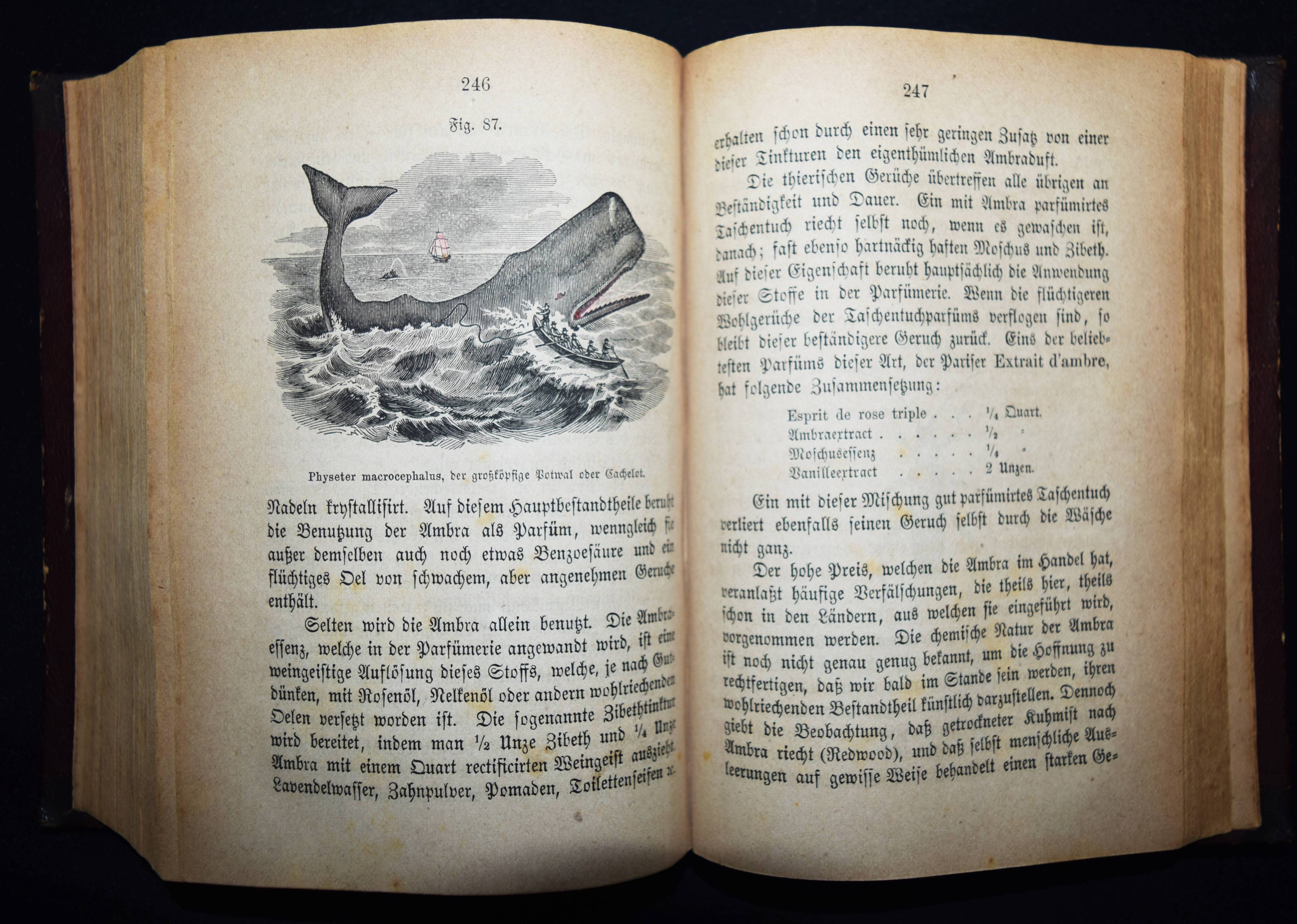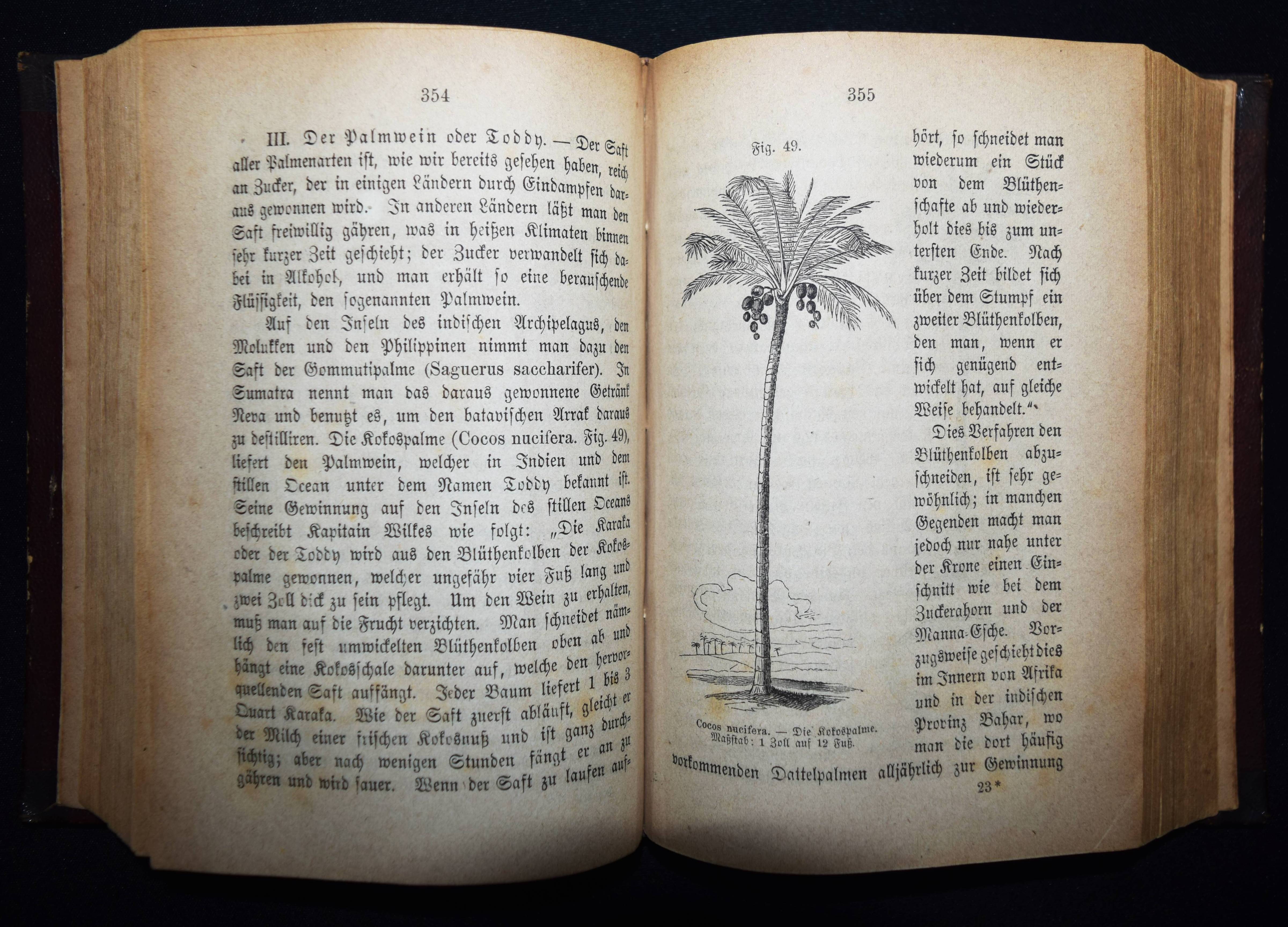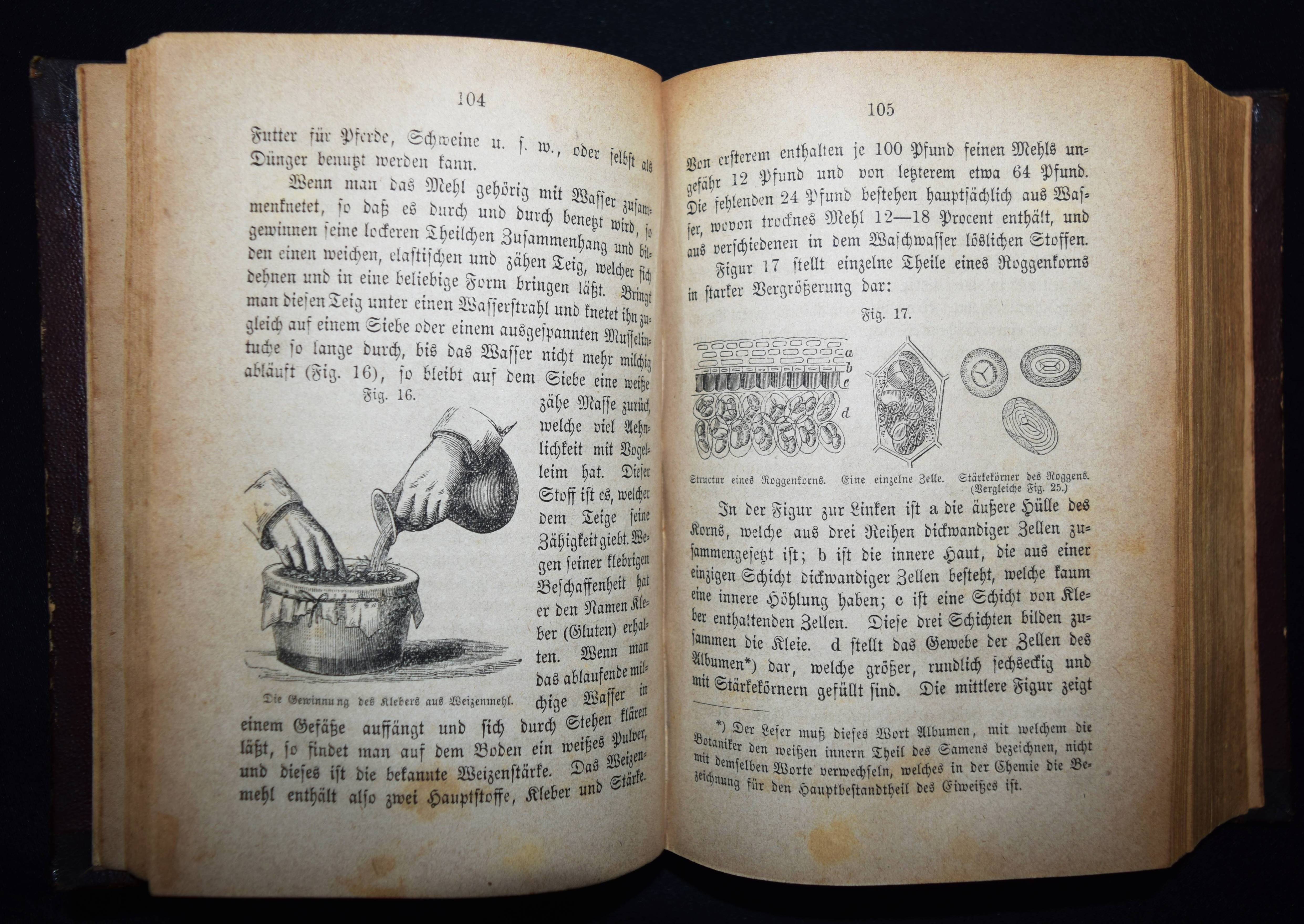 Johnston, James F(inlay) W(eir). Die Chemie des täglichen Lebens. Neu durchgesehene und verbesserte Auflage. 2 Teile in 1 Band. Berlin, Franz Duncker 1869. Kl.-8°. IV, 384 S.; VI, 412 S. mit zahlr. Holzstich-Abb. im Text. Hldr. der Zeit. Weiss 1784. – Zweite deutsche Ausgabe; die engl. Originalausgabe erschien 1854 in London mit dem Titel „Chemistry of common life“. – Behandelt Luft, Wasser, Boden und vor allem die Lebensmittelchemie mit Kapitel über Tee, Kaffee (vgl. Mueller 112 f.), Bier, Weine, Tabak, Rauschmittel wie Opium, Hanf, Betel, Coca u.a. – Deckel etwas berieben, Rückentitel und Linienvergoldung ausgebleicht, papierbedingt durchgehend gebräunt, gutes Exemplar.