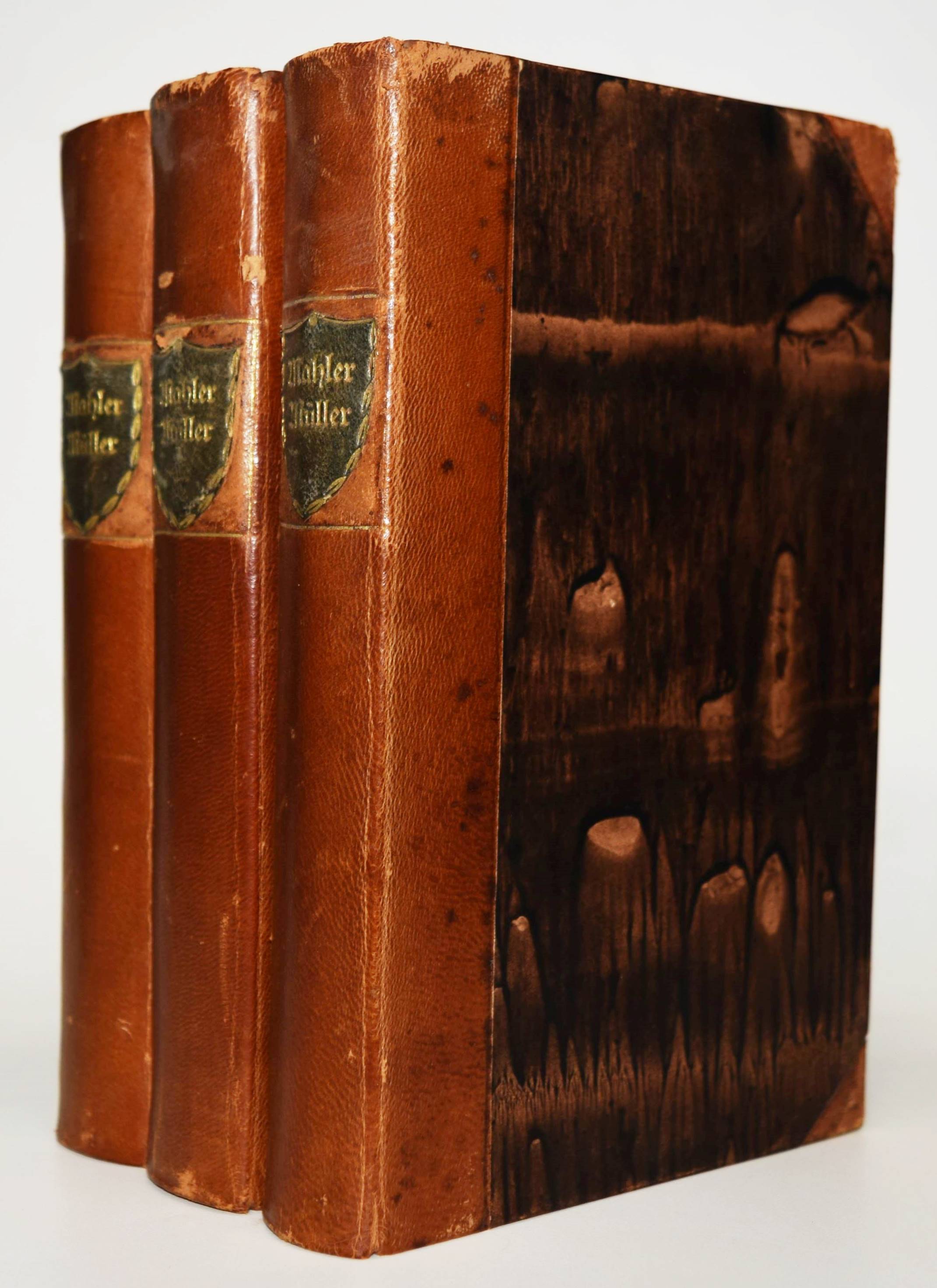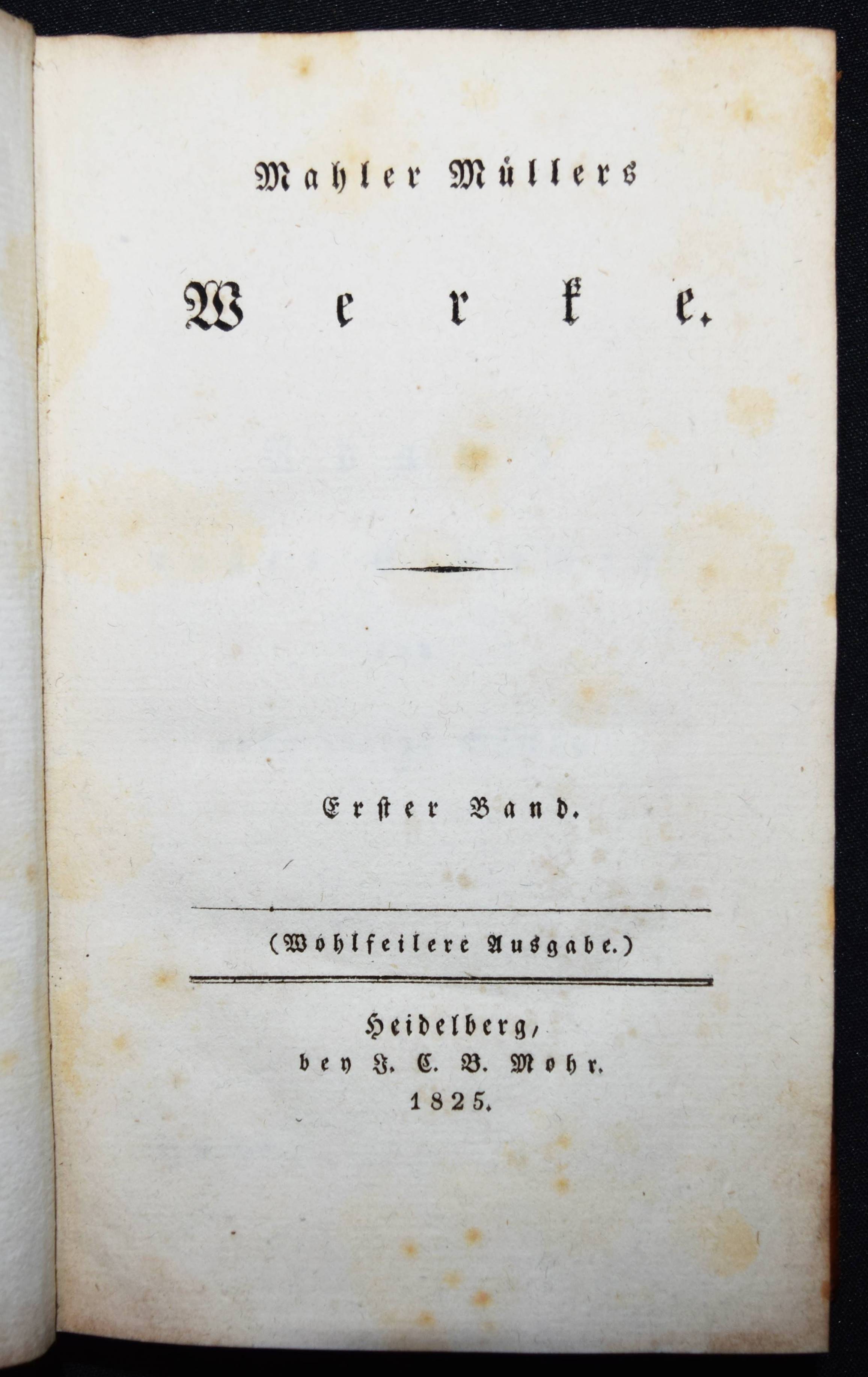 (Müller, Friedrich, gen.:) Mahler Müller. Werke. Wohlfeilere Ausgabe. 3 Bände. Heidelberg, J. C. B. Mohr 1825. Kl.-8°. [3] Bl., 374 S., [1] Bl.; [3] Bl., 410 S., [1] Bl.; [1] Bl., 420 S., [1] Bl. Hldr. im Stil der Zeit mit goldgepr. Rückensch. Goed. IV/1, 900, 19 b. Meyer 119-121. Schulte-Strathaus 235, 10 b. – Zweite Gesamtausgabe der Werke des bedeutenden Vertreters des Sturm und Drang. Erschien zuerst 1811. – „Diese Sammelausgabe wurde angeregt von Ludwig Tieck, besorgt von Friedrich Blatt, den Tieck und der reformierte Prediger Le Pique unterstützten. Müller sah die Manuskripte und frühen Drucke durch, seine Veränderungen wurden jedoch vom Verleger kaum berücksichtigt“ (Schulte-Strathaus). – Seine Ausbildung zum Maler, gegonnen beim Hofmaler Daniel Hien, setzte F. Müller (1749-1825) „1770 mit Studien bei Peter Anton Verschaffelt in Mannheim fort, wohin er 1775 übersiedelte. Im kulturell reichen Leben der südwestdeutschen Metropole entwickelte sich M.s zweite, seine literarische Begabung: Vermittelt durch den Zweibrücker Freund Johann Friedrich Hahn und etwas überarbeitet von Klopstock, erschien M.s „Lied eines bluttrunknen Wodanadlers“ im „Göttinger Musenalmanach“ 1774, dem für die junge Geniebewegung des Sturm und Drang zentralen Jahrgang. Damit war M. über Nacht als Dichter bekannt. Durch den selbstgewählten Namenszusatz „Mahler“ beugte er Verwechslungen vor und wies zugleich die anderen Stürmer und Dränger, allesamt bürgerliche Studenten, auf sein professionelles Künstlertum hin“ (U. Leuschner in NDB XVIII, 374). – Wohl in der ersten Hälfte des 20. Jahrhunderts neu gebunden unter der Verwendung der Orig.-Rückenschilder, stellenweise etwas braunfleckig, gutes vollständiges Exemplar mit allen „Erata“-Blättern.