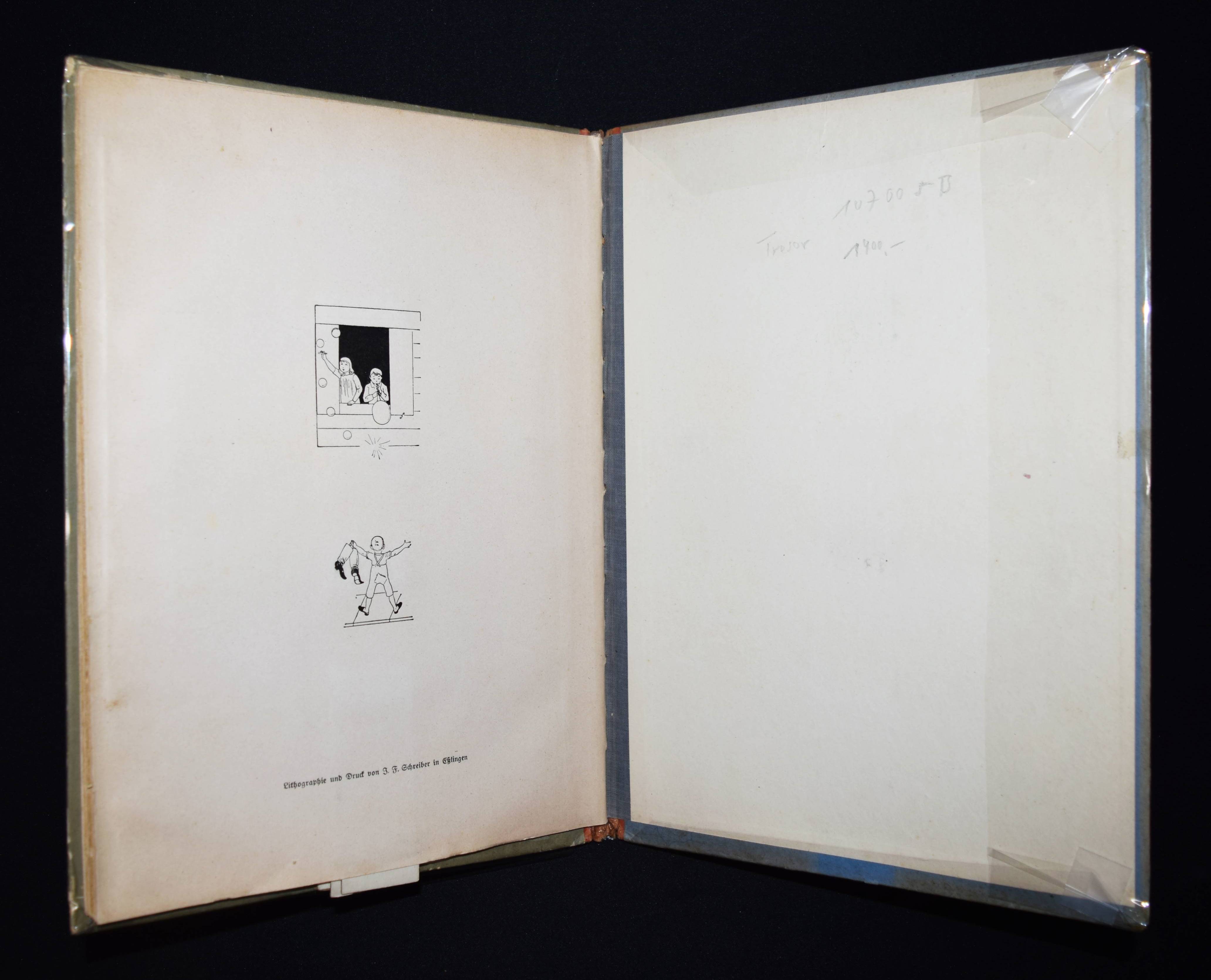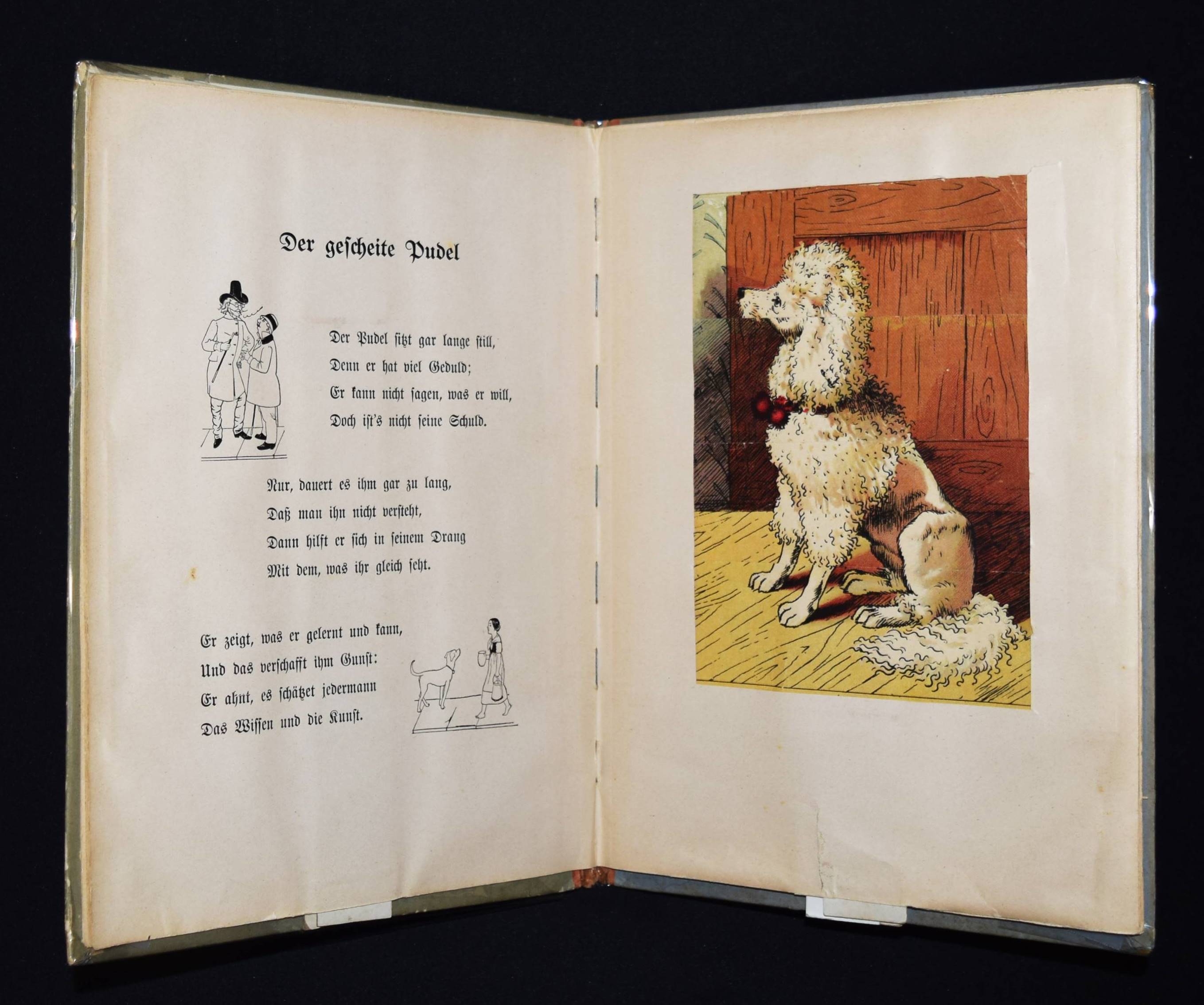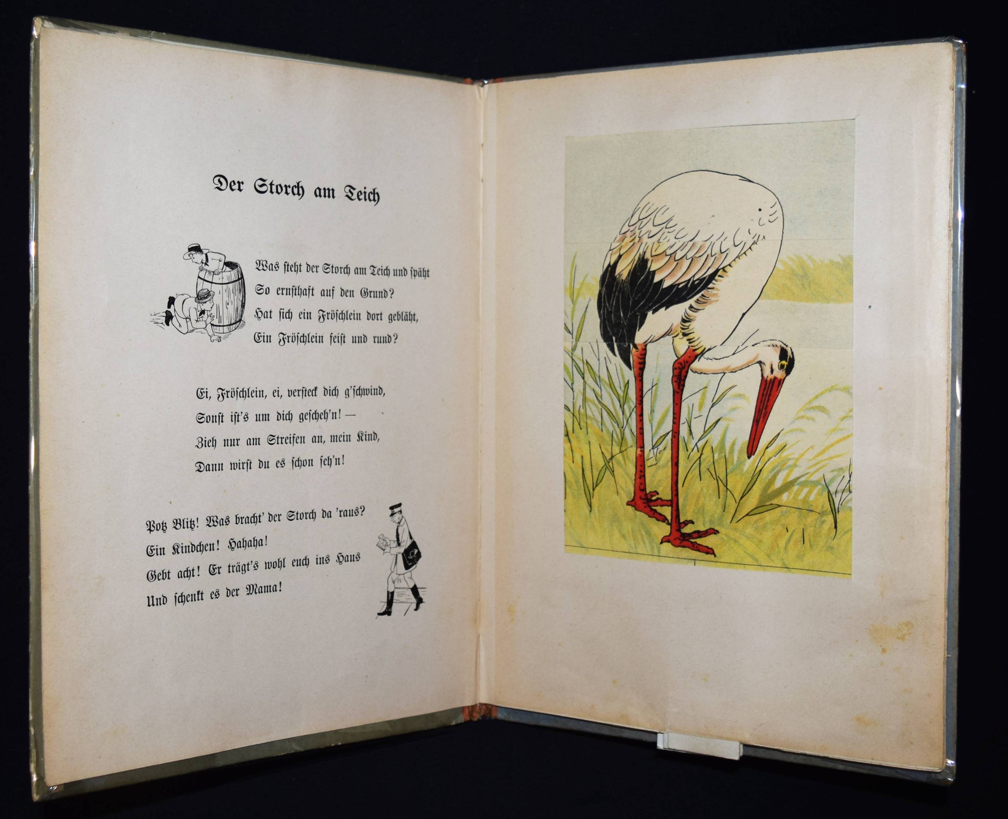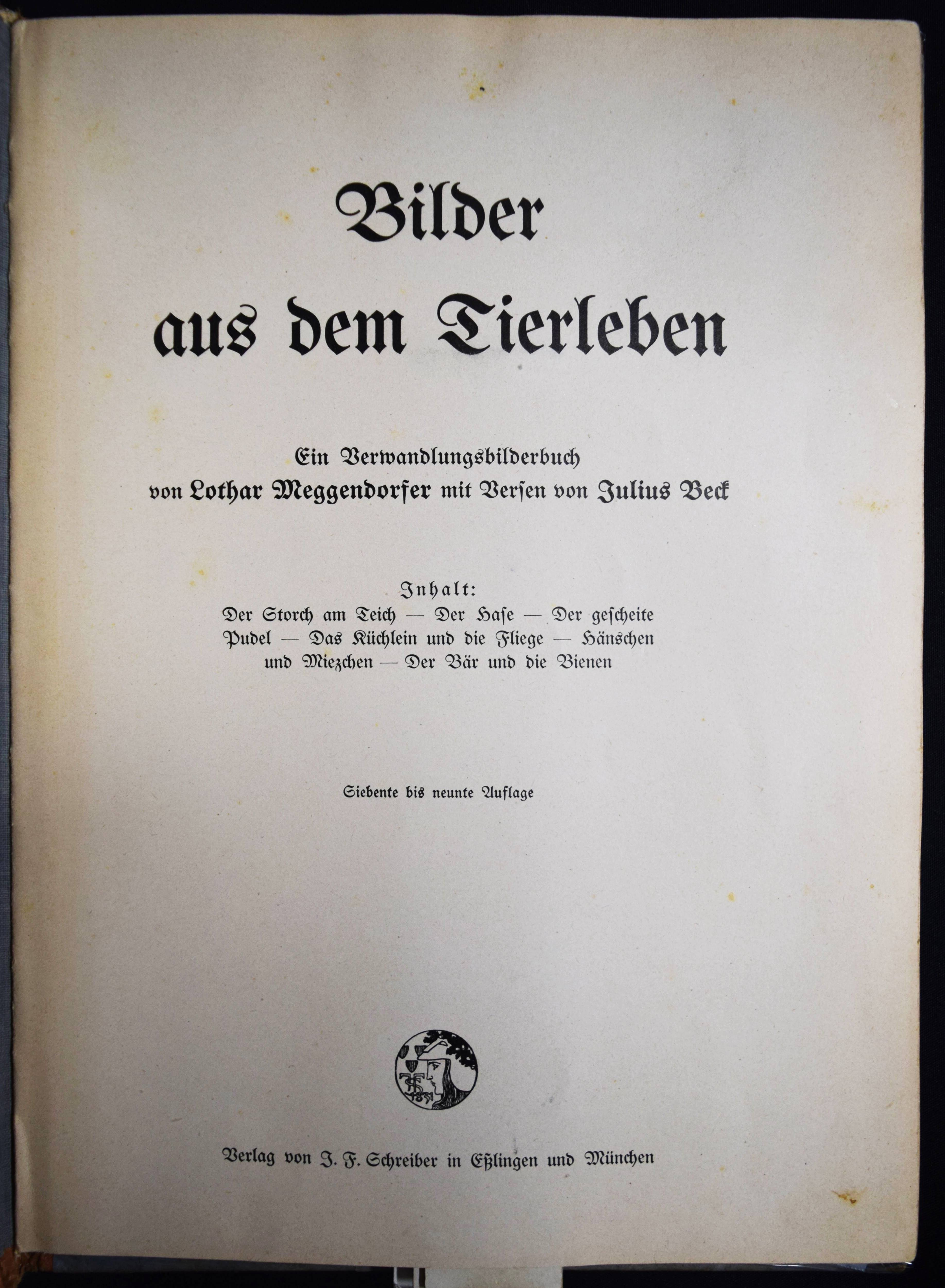 Beck, Julius. Bilder aus dem Tierleben. Ein Verwandlungsbilderbuch von Lothar Meggendorfer. 7.-9. Aufl. Esslingen und München, Schreiber o. J. (1925). 4°. 7 Bl. mit 6 chromolithogr. Tafeln (jede dreimal quer durchgeschnitten und von 6 weiteren Tafeln jalousieartig unterlegt) mit Ziehmechanismus u. Illustrationen im Text. Farbig illustr. OHln. (Verlags-Nr. 138). Klotz 316/1. Krahé 19 (mit Abb. S. 140). Krahé, Puppentheatermuseum 21 u. S. 33 (mit Abb.). Ries 713, 96 u. S. 56. Robinson u. Struwwelpeter 239. Schiller, Meggendorfer 8 u. Sotheby’s Catalogue of the Meggendorfer Archive 76 u. 77 (Originalvorlagen u. Probedrucke mit Abb.). Stuck-Villa I, 432. Wegehaupt II, 2157 (diese Aufl., mit farb. Abb.). – Krahé, Ries u. Wegehaupt dat. die 1.-9. Aufl. 1895. J. Schiller erwähnt jedoch handschriftliche Jahresangaben auf Textprobedrucken (5. Aufl.: 1913 u. 7.-9. Aufl. 1925). – „Die Darstellungen sind sehr überraschend, und führen die Tiere, sobald man an einem Papierstreifen zieht, sehr nette Dinge aus. So legt plötzlich ein Hase Ostereier, trägt ein Storch unversehens ein kleines Kind, macht ein gebildeter Pudel Kunststücke, und dergleichen mehr“ (Aus der Verlagswerbung v. 1895). – „Der Künstler hatte unverkennbar eine Vorliebe dafür, Tiere zu beleben. Ganz offenbar hat er sie geliebt und mit Anteilnahme beobachtet… Man kommt nicht los von Meggendorfers Tieren…“ (M. Sendak). – „Als frühester Beleg für die Jalousietechnik ist ein englischer Titel von 1862 nachgewiesen“ (H. Ries S. 56). – Im Blattrand teils geringfügig fingerfleckig, sehr gutes voll funktionsfähiges Exemplar dieses originellen Spielbilderbuchs. – Krahé, Ries and Wegehaupt dated the 1st-9th editions 1895. However, J. Schiller mentions handwritten dates on proofs of the text (5th edition: 1913 and 7th-9th editions 1925). – “The illustrations are very surprising, and the animals do very nice things as soon as you pull on a strip of paper. Thus a rabbit suddenly lays Easter eggs, a stork suddenly carries a small child, an educated poodle performs tricks, and the like” (from the publisher’s advertisement of 1895). – “The artist had an unmistakable predilection for animating animals. He obviously loved them and observed them with sympathy… One cannot get away from Meggendorfer’s animals…” (M. Sendak). – “The earliest evidence of the Venetian blind technique is an English title from 1862” (H. Ries p. 56). – Some minor fingerstaining in the margins, a very good, fully functional copy of this unusual picture book.
