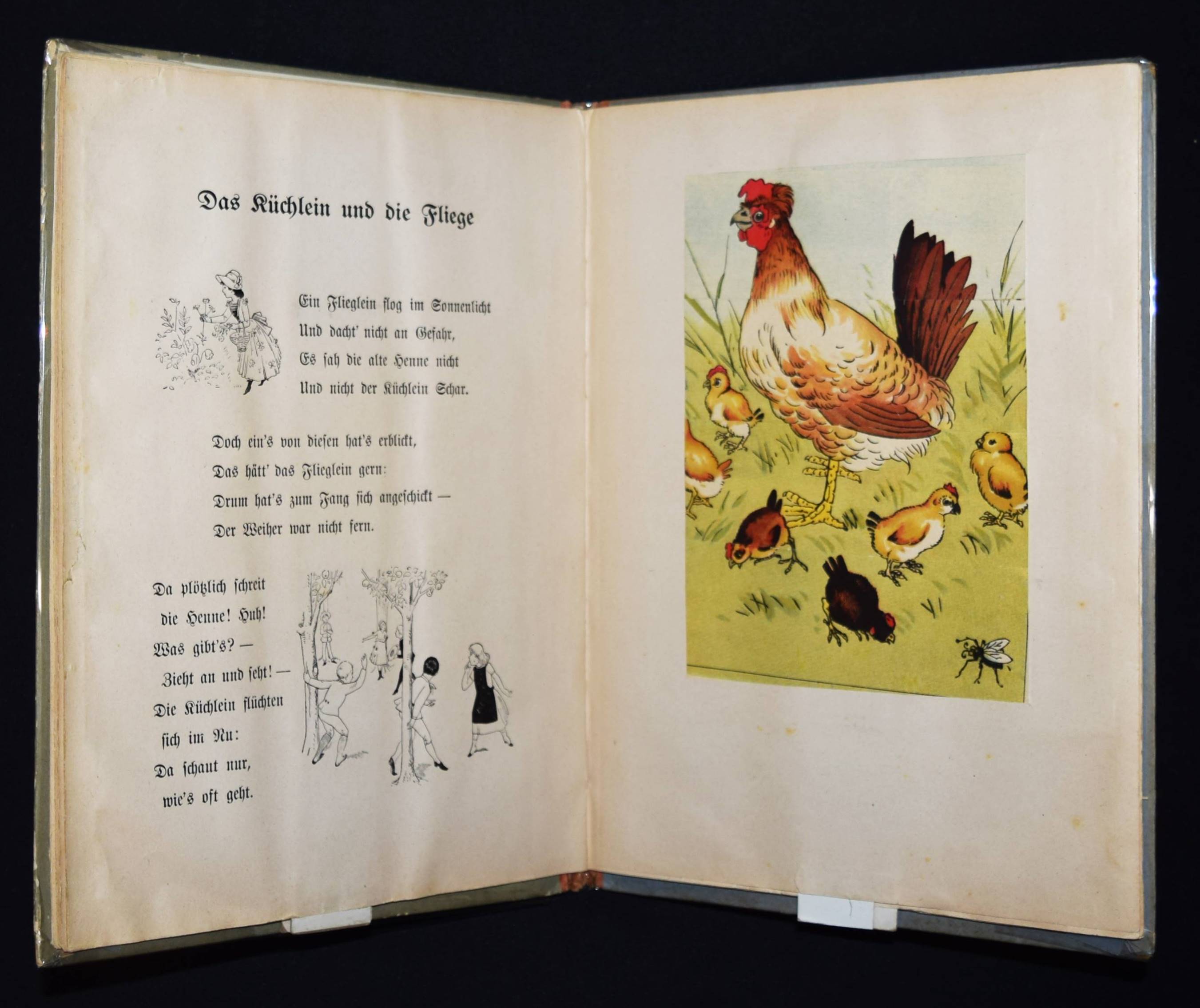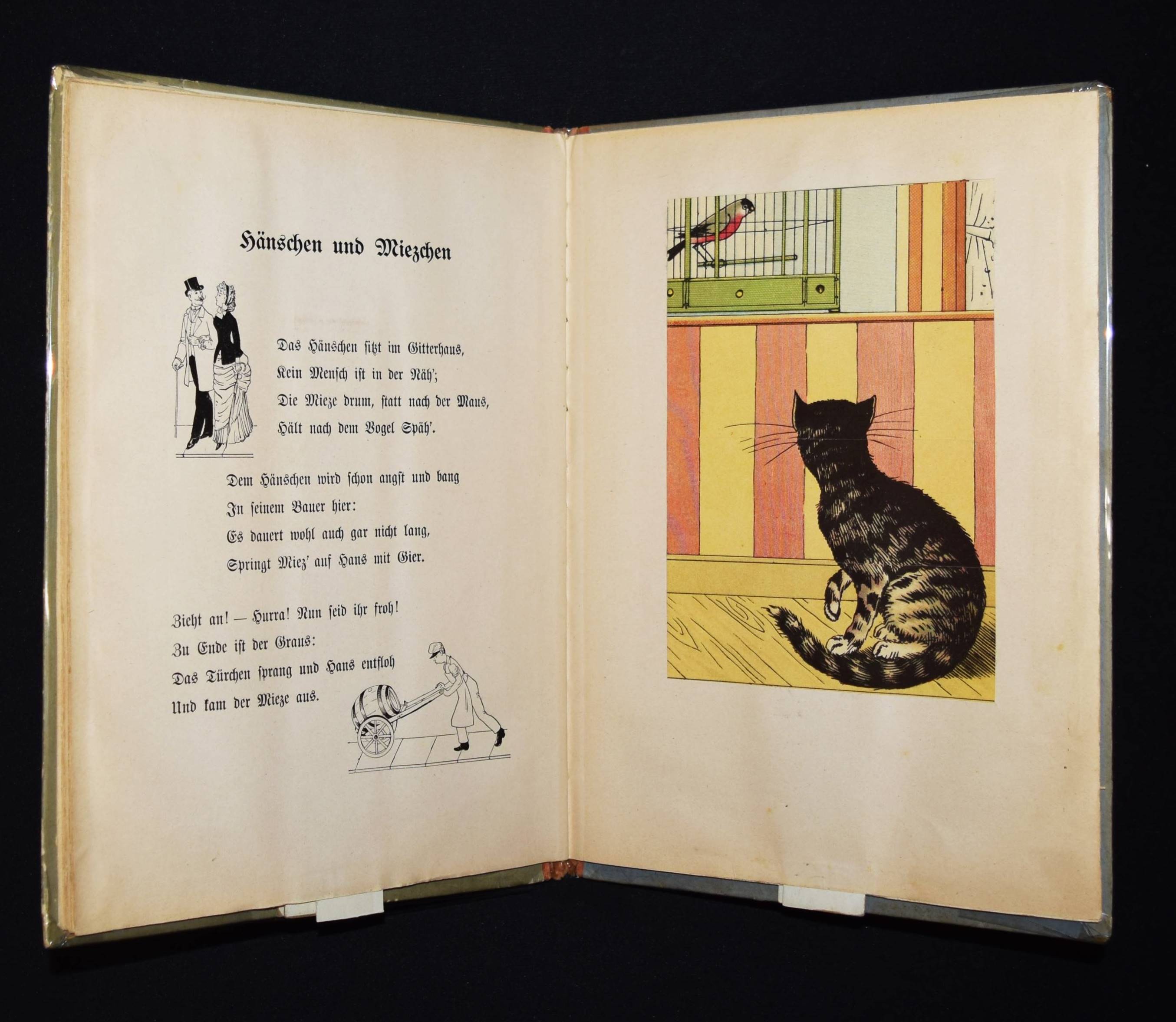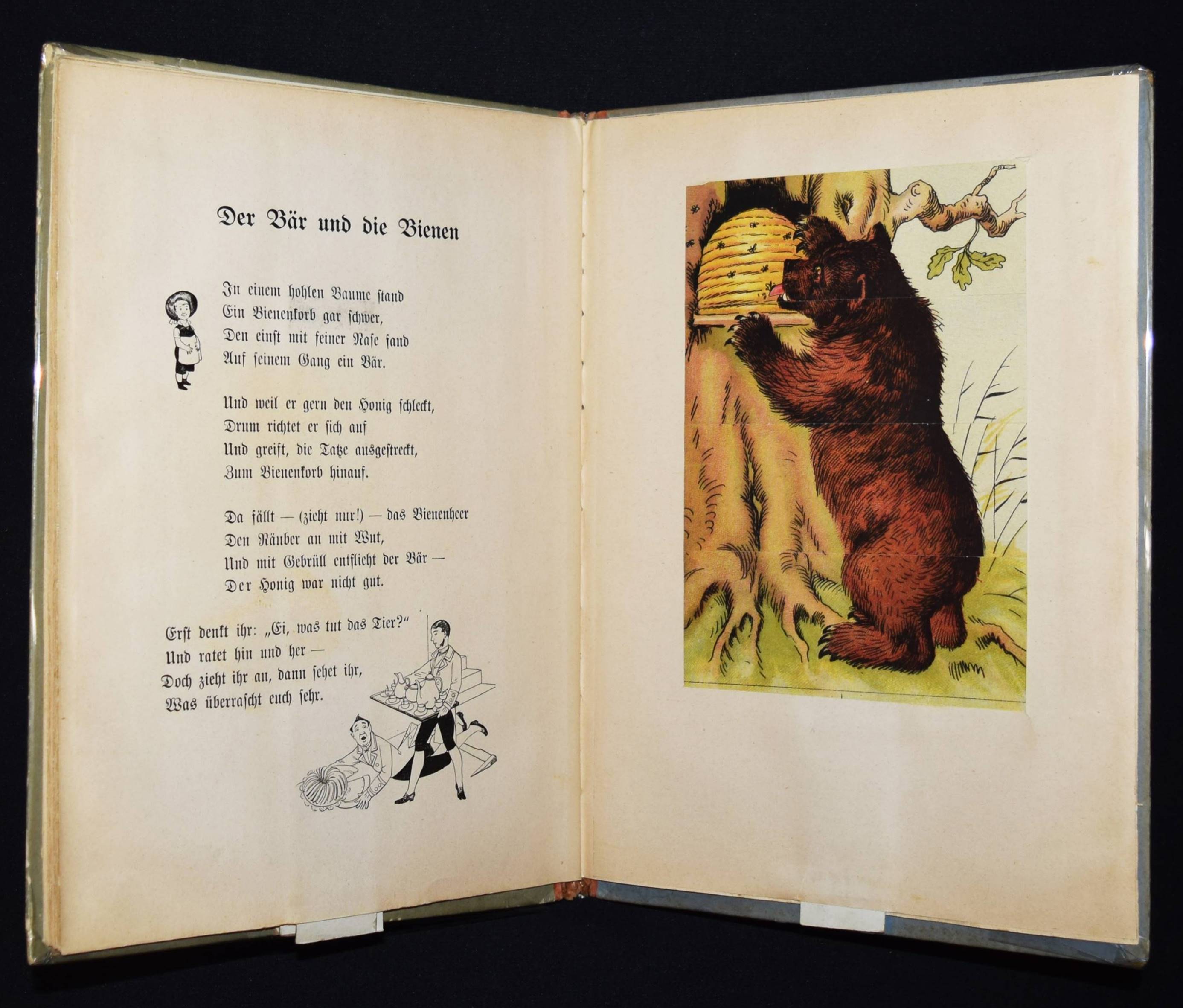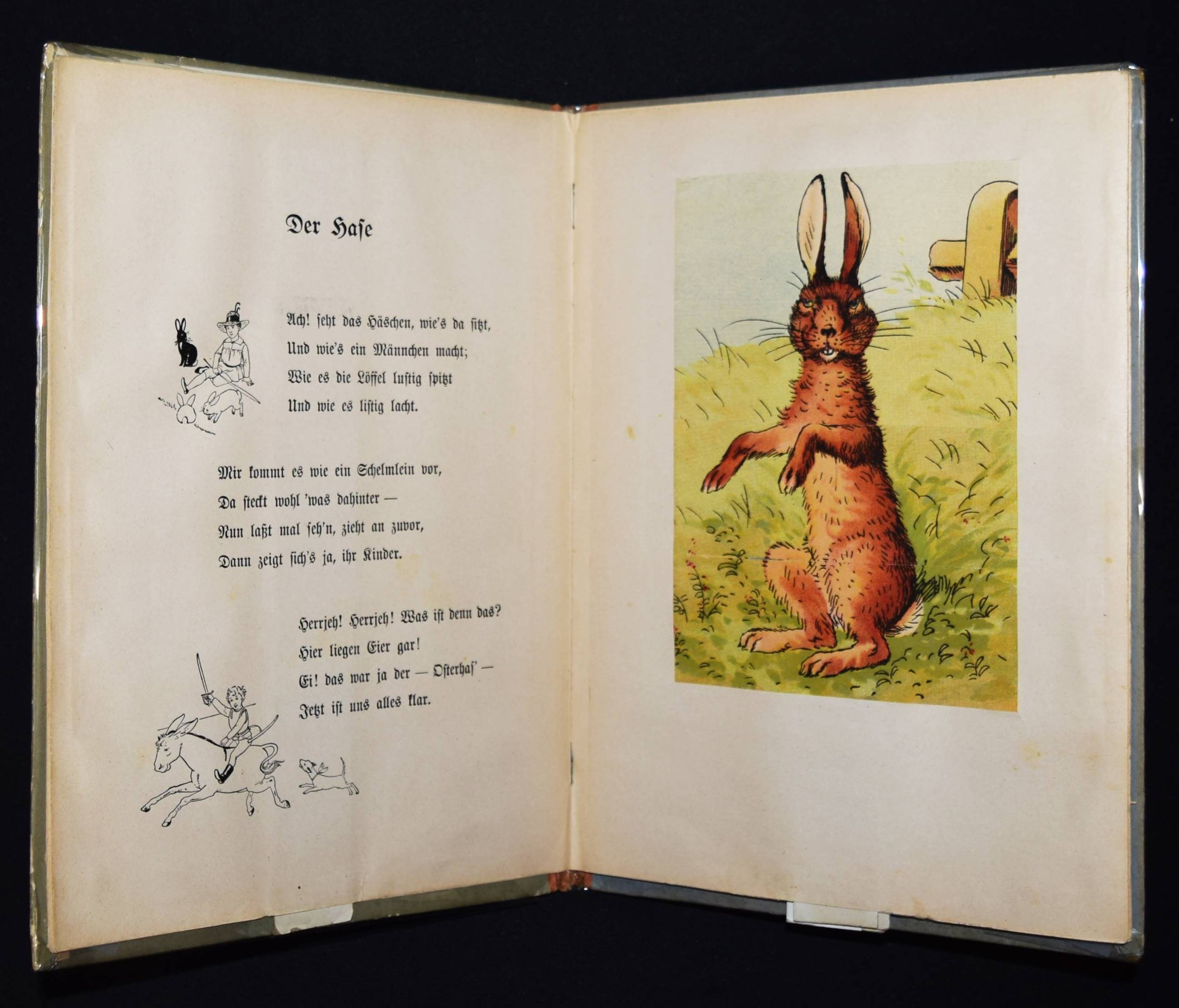 Beck, Julius. Bilder aus dem Tierleben. Ein Verwandlungsbilderbuch von Lothar Meggendorfer. 7.-9. Aufl. Esslingen und München, Schreiber o. J. (1925). 4°. 7 Bl. mit 6 chromolithogr. Tafeln (jede dreimal quer durchgeschnitten und von 6 weiteren Tafeln jalousieartig unterlegt) mit Ziehmechanismus u. Illustrationen im Text. Farbig illustr. OHln. (Verlags-Nr. 138). Klotz 316/1. Krahé 19 (mit Abb. S. 140). Krahé, Puppentheatermuseum 21 u. S. 33 (mit Abb.). Ries 713, 96 u. S. 56. Robinson u. Struwwelpeter 239. Schiller, Meggendorfer 8 u. Sotheby’s Catalogue of the Meggendorfer Archive 76 u. 77 (Originalvorlagen u. Probedrucke mit Abb.). Stuck-Villa I, 432. Wegehaupt II, 2157 (diese Aufl., mit farb. Abb.). – Krahé, Ries u. Wegehaupt dat. die 1.-9. Aufl. 1895. J. Schiller erwähnt jedoch handschriftliche Jahresangaben auf Textprobedrucken (5. Aufl.: 1913 u. 7.-9. Aufl. 1925). – „Die Darstellungen sind sehr überraschend, und führen die Tiere, sobald man an einem Papierstreifen zieht, sehr nette Dinge aus. So legt plötzlich ein Hase Ostereier, trägt ein Storch unversehens ein kleines Kind, macht ein gebildeter Pudel Kunststücke, und dergleichen mehr“ (Aus der Verlagswerbung v. 1895). – „Der Künstler hatte unverkennbar eine Vorliebe dafür, Tiere zu beleben. Ganz offenbar hat er sie geliebt und mit Anteilnahme beobachtet… Man kommt nicht los von Meggendorfers Tieren…“ (M. Sendak). – „Als frühester Beleg für die Jalousietechnik ist ein englischer Titel von 1862 nachgewiesen“ (H. Ries S. 56). – Im Blattrand teils geringfügig fingerfleckig, sehr gutes voll funktionsfähiges Exemplar dieses originellen Spielbilderbuchs. – Krahé, Ries and Wegehaupt dated the 1st-9th editions 1895. However, J. Schiller mentions handwritten dates on proofs of the text (5th edition: 1913 and 7th-9th editions 1925). – “The illustrations are very surprising, and the animals do very nice things as soon as you pull on a strip of paper. Thus a rabbit suddenly lays Easter eggs, a stork suddenly carries a small child, an educated poodle performs tricks, and the like” (from the publisher’s advertisement of 1895). – “The artist had an unmistakable predilection for animating animals. He obviously loved them and observed them with sympathy… One cannot get away from Meggendorfer’s animals…” (M. Sendak). – “The earliest evidence of the Venetian blind technique is an English title from 1862” (H. Ries p. 56). – Some minor fingerstaining in the margins, a very good, fully functional copy of this unusual picture book.