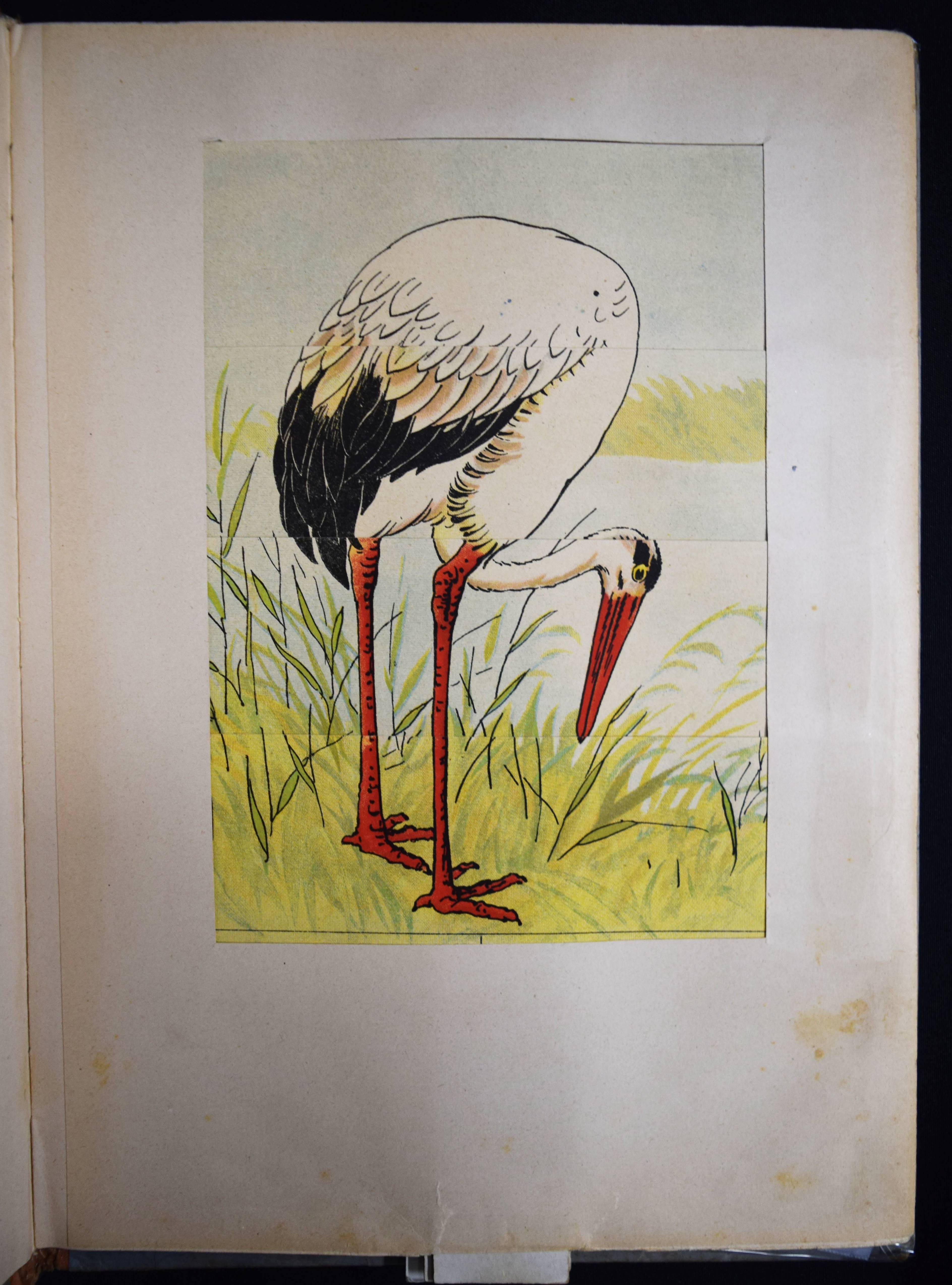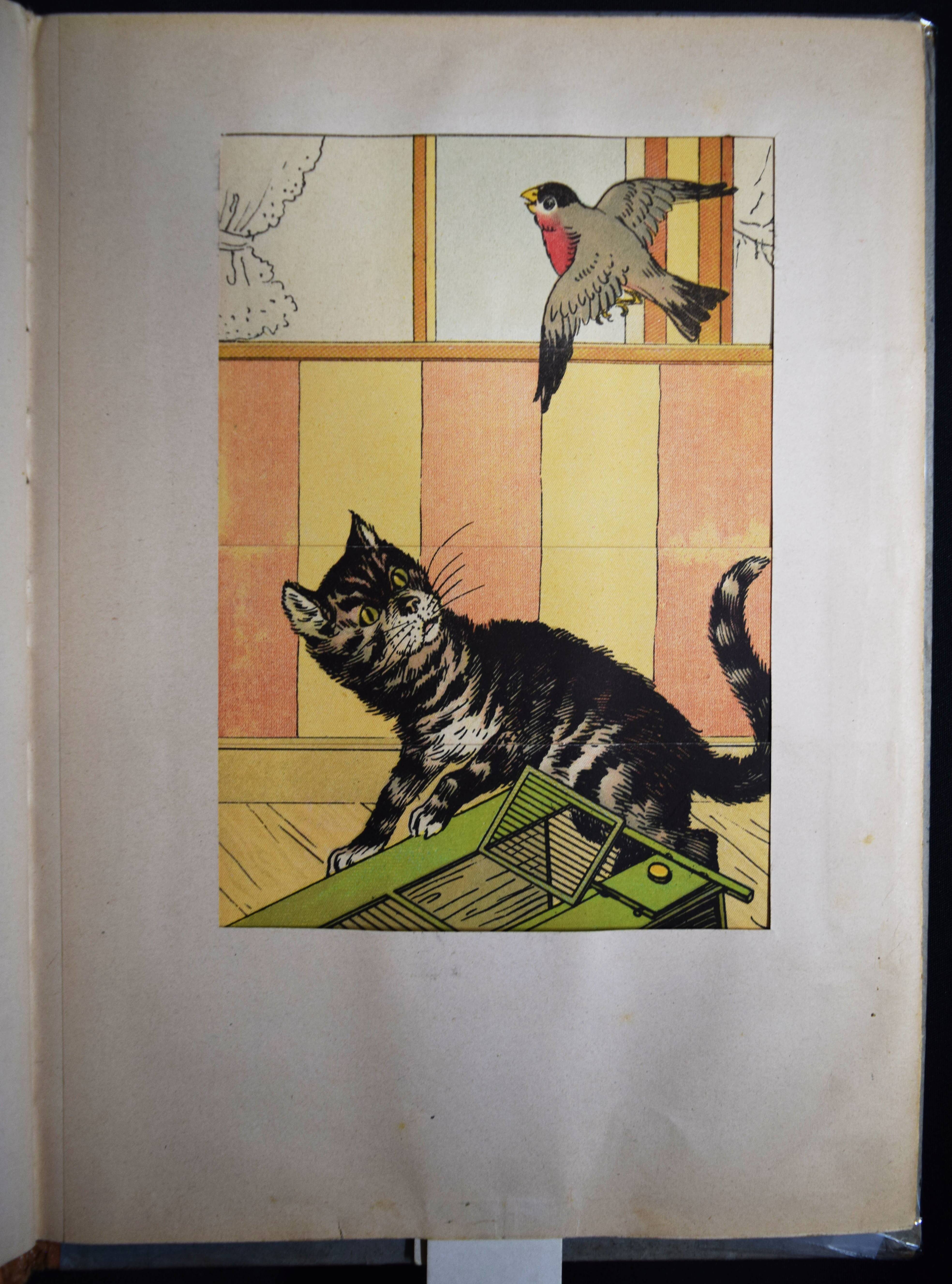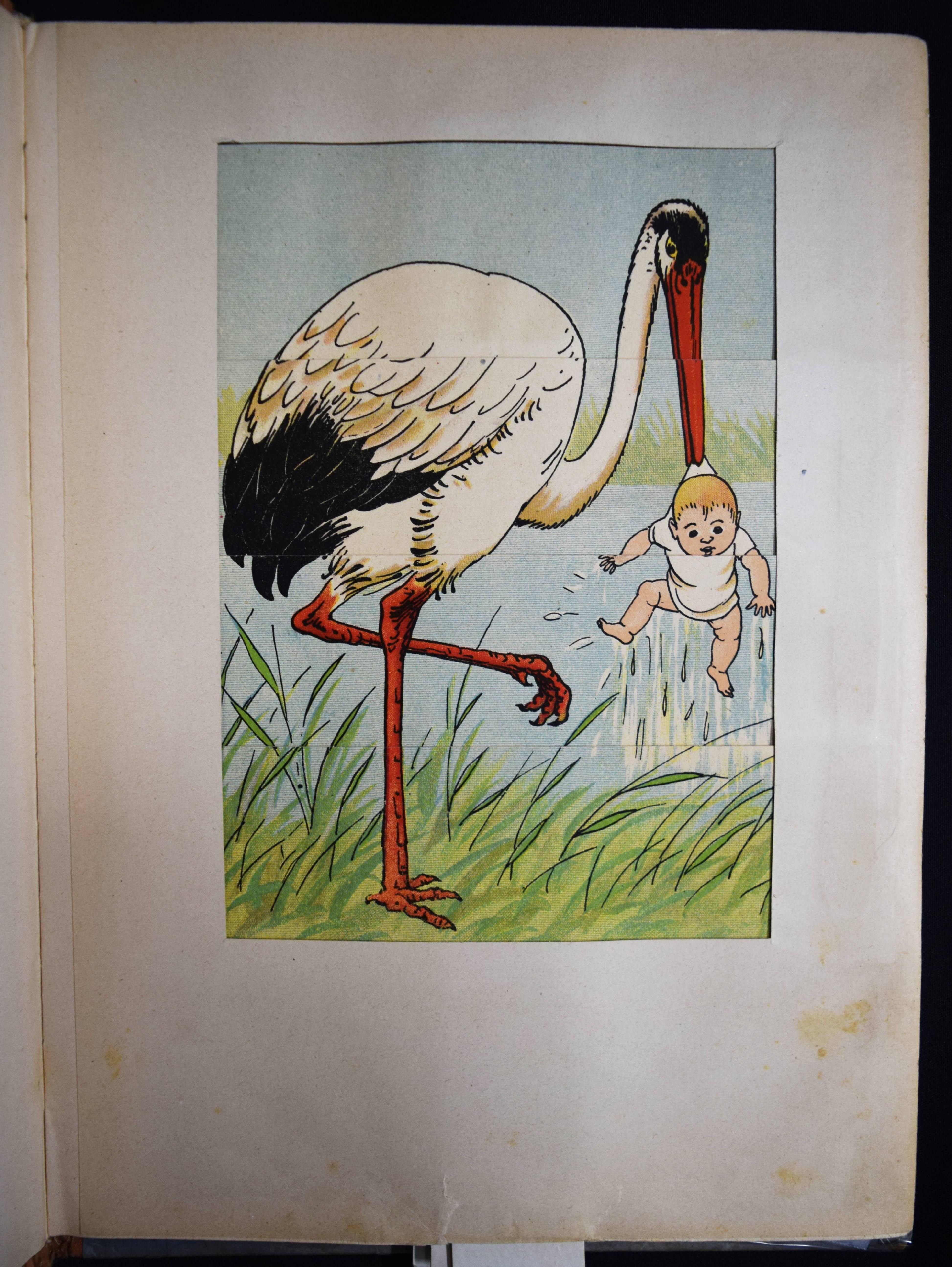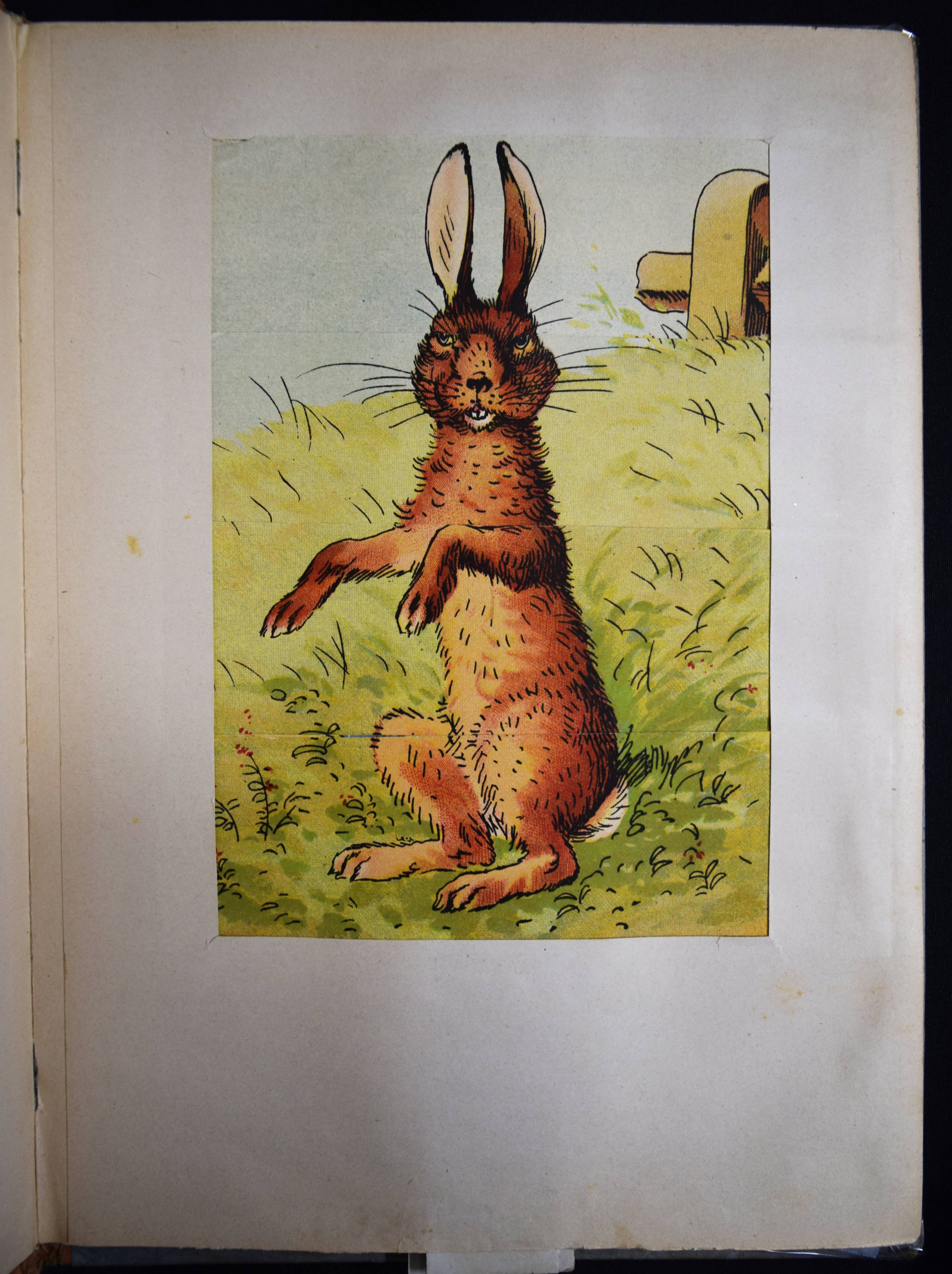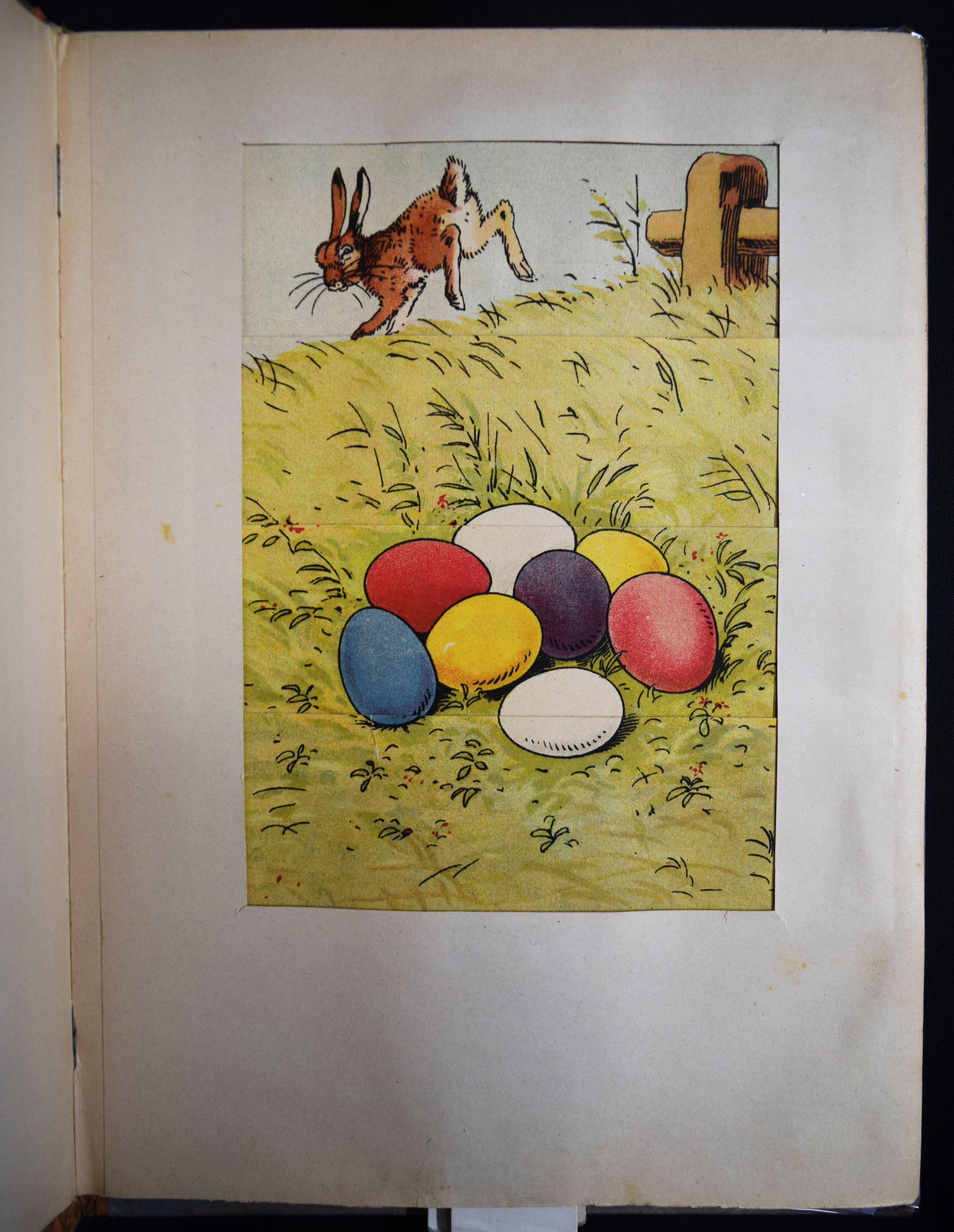 Beck, Julius. Bilder aus dem Tierleben. Ein Verwandlungsbilderbuch von Lothar Meggendorfer. 7.-9. Aufl. Esslingen und München, Schreiber o. J. (1925). 4°. 7 Bl. mit 6 chromolithogr. Tafeln (jede dreimal quer durchgeschnitten und von 6 weiteren Tafeln jalousieartig unterlegt) mit Ziehmechanismus u. Illustrationen im Text. Farbig illustr. OHln. (Verlags-Nr. 138). Klotz 316/1. Krahé 19 (mit Abb. S. 140). Krahé, Puppentheatermuseum 21 u. S. 33 (mit Abb.). Ries 713, 96 u. S. 56. Robinson u. Struwwelpeter 239. Schiller, Meggendorfer 8 u. Sotheby’s Catalogue of the Meggendorfer Archive 76 u. 77 (Originalvorlagen u. Probedrucke mit Abb.). Stuck-Villa I, 432. Wegehaupt II, 2157 (diese Aufl., mit farb. Abb.). – Krahé, Ries u. Wegehaupt dat. die 1.-9. Aufl. 1895. J. Schiller erwähnt jedoch handschriftliche Jahresangaben auf Textprobedrucken (5. Aufl.: 1913 u. 7.-9. Aufl. 1925). – „Die Darstellungen sind sehr überraschend, und führen die Tiere, sobald man an einem Papierstreifen zieht, sehr nette Dinge aus. So legt plötzlich ein Hase Ostereier, trägt ein Storch unversehens ein kleines Kind, macht ein gebildeter Pudel Kunststücke, und dergleichen mehr“ (Aus der Verlagswerbung v. 1895). – „Der Künstler hatte unverkennbar eine Vorliebe dafür, Tiere zu beleben. Ganz offenbar hat er sie geliebt und mit Anteilnahme beobachtet… Man kommt nicht los von Meggendorfers Tieren…“ (M. Sendak). – „Als frühester Beleg für die Jalousietechnik ist ein englischer Titel von 1862 nachgewiesen“ (H. Ries S. 56). – Im Blattrand teils geringfügig fingerfleckig, sehr gutes voll funktionsfähiges Exemplar dieses originellen Spielbilderbuchs. – Krahé, Ries and Wegehaupt dated the 1st-9th editions 1895. However, J. Schiller mentions handwritten dates on proofs of the text (5th edition: 1913 and 7th-9th editions 1925). – “The illustrations are very surprising, and the animals do very nice things as soon as you pull on a strip of paper. Thus a rabbit suddenly lays Easter eggs, a stork suddenly carries a small child, an educated poodle performs tricks, and the like” (from the publisher’s advertisement of 1895). – “The artist had an unmistakable predilection for animating animals. He obviously loved them and observed them with sympathy… One cannot get away from Meggendorfer’s animals…” (M. Sendak). – “The earliest evidence of the Venetian blind technique is an English title from 1862” (H. Ries p. 56). – Some minor fingerstaining in the margins, a very good, fully functional copy of this unusual picture book.